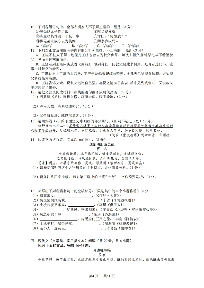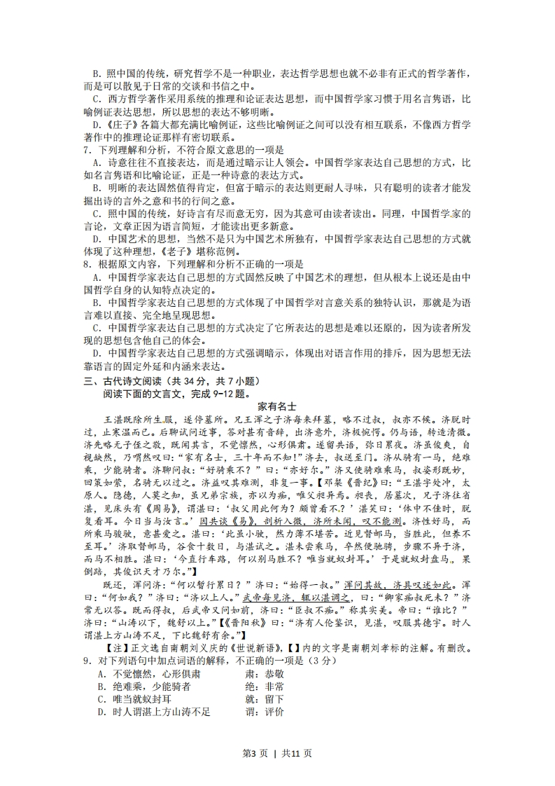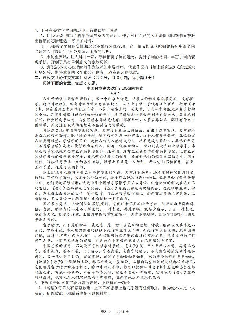 绝密★启用前试卷类型:B2012年普通高等学校招生全国统一考试(湖北卷)语文(B卷)本试卷共六大题,8页。总分150分,考试用时150分钟。注意事项:1.答卷前,考生务必用2B铅笔在“考生号”处填涂考生号。用黑色字迹的签字笔将自己的姓名和考号填写在答题卡上。用B铅笔将试卷类型(B)填涂在答题卡相应位置上。将条形码横贴在答题卡右上角“条形码粘贴处”。2.选择题每小题选出答案后,用2B铅笔把答题卡上对应题目选项的答案信息点涂黑如需改动,用橡皮擦干净后,再选涂其他答案。答案不能答在试卷上。3.非选择题必须用0.5毫米黑色字迹的签字笔作答,答案必须写在答题卡各题目指定区域内的相应位置上:如需改动,先划掉原来的答案,然后再写上新的答案;不准使用铅笔和涂改液。不按以上要求作答的答案无效。4.作答选做题时,请先用2B铅笔填涂选做题的题组号对应的信息点,再作答。漏涂、错涂、多涂的,答案无效。5.考生必须保持答题卡的整洁。考试结束后,将试卷和答题卡一并交回。一、语文基础知识(共15分,共5小题,每小题3分)1.下列各组词语中加点的字,读音全都相同的一组是A.灵秀磷光玲珑剔透聆听教诲B.诞生旦角淡泊明志担当重任C.宿营诉说夙兴夜寐素昧平生D.咨询滋生芝兰之室孜孜不倦2.下列各组词语中,没有错别字的一组是A.羞涩袅娜歌声缈茫荷塘薄雾B.霜天廖廓峥嵘岁月浪遏飞舟C.细腻箫索落蕊残叶秋蝉嘶叫D.嫩黄葱茏婆娑起舞繁茂苍翠3.依次填入下列横线处的词语,最恰当的一组是说到底,世上风景闲流水,端的还是要人慢下来。中国这如许的城市中,最是江城得了个中,且将它地挥洒出来。这江城街头巷尾、湖畔公园里数不胜数的茶馆、茶镭,一个人在清晨里不慌不忙的起来,到茶馆里,一坐就是一天,那一个悠闲!A.趣味痛痛快快当是遛B.滋味淋漓尽致便是走C.意味兴致勃勃自是逛D.韵味尽情尽兴恰是晃4.下列各项中,没有语病的一项是A.坐上画舫游清江,如行画卷之中,江水清澈,绿树菊郁,自然与人,和谐相依,随风生长,好一派如诗如画的风光!B.游览三峡大瀑布时,我们从倾泻而下的水帘中狂奔而过,尖叫声、嬉笑声响成一片,那真是充满刺激的难忘体验!C.当今己经很少有人会像以前那样的闲情逸致,拿出一本小说,从头到尾地阅读一遍,欣赏其委婉动人的故事。D.现代文明不仅带来了理性化、工业化、市场化、都市化、民主化和法制化这些美好的社会制度,而且创造了前所未有的物质财富。第1页|共11页5.下列有关文学常识的表述,有错误的一项是A.《孔乙己》描写了科举考试失意者的命运。作者对孔乙己的穷因潦倒和因窃书而被赶出鲁镇的悲惨遭遇,寄予了同情。B.己知杀父娶母的实情却迟迟不采取复仇行动,这一情节构成《哈姆莱特》中著名的“延宕”,体现了主人公复杂、矛盾的心理。C.宋词至苏轼,让人耳目一新,苏轼拓宽了词的题材,提升了词的格调,丰富了词的表现手法,开创了具有革新意义的豪放词派。D.意识流小说以心理时间作为叙述的主要时序,代表作品有《墙上的斑点》《追忆逝水年华》等。斯特林堡的《半张纸》也有一点意识流的味道。二、现代文(论述类文本)阅读(共9分,共3小题,每小题3分)阅读下面的文章,完成68题。中国哲学家表达自己思想的方式冯友兰人们开始读中国哲学著作时,第一个印象也许是,这些言论和文章都很简短,没有联系。打开《论语》,你会看到每章只有寥寥数语,而且上下章几乎没有任何联系。打开《老子》,你会看到全书只约有五千宇,不长于杂志上的一篇文章。可是从中却能见到老子哲学的全体。习惯于精密推理和详细论证的学生,要了解这些中国哲学到底在说什么,简直感到茫然。他会倾向于认为,这些思想本身就是没有内部联系吧。如果当真如此,那还有什么中国哲学。因为没有联系的思想是不值得名为哲学的。可以这么说:中国哲学家的言论、文章没有表面上的联系,是由于这些言论、文章都不是正式的哲学著作。照中国的传统,研究哲学不是一种职业。每个人都要学哲学,正像西方人都要进教堂。学哲学的目的,是使人作为人能够成为人,而不是成为某种人。其他的学习(不是学哲学)是使人能够成为某种人,即有一定职业的人。所以过去没有职业哲学家:非职业哲学家也就不必有正式的哲学著作。在中国,没有正式的哲学著作的哲学家,比有正式的哲学著作的哲学家多得多。若想研究这些人的哲学,只有看他们的语录或写给学生、朋友的信。这些信写于他一生的各个时期,语录也不只是一人所记。所以它们不相联系,甚至互相矛盾,这是可以预料的。以上所说可以解释为什么有些哲学家的言论、文章没有联系:还不能解释它们为什么简短。有些哲学著作,像孟子的和荀子的,还是有系统的推理和论证。但是与西方哲学著作相比,它们还是不够明晰。这是由于中国哲学家惯于用名言隽语、比喻例证的形式表达自己的思想。《老子》全书都是名言隽语,《庄子》各篇大都充满比喻例证。这是很明显的。但是,甚至在上面提到的孟子、荀子著作,与西方哲学著作相比,还是有过多的名言隽语、比喻例证。名言隽语一定很简短:比喻例证一定无联系。因而名言隽语、比喻例证就不够明晰。它们明晰不足而暗示有余,前者从后者得到补偿。当然,明晰与暗示是不可得兼的。一种表达,越是明晰,就越少暗示:正如一种表