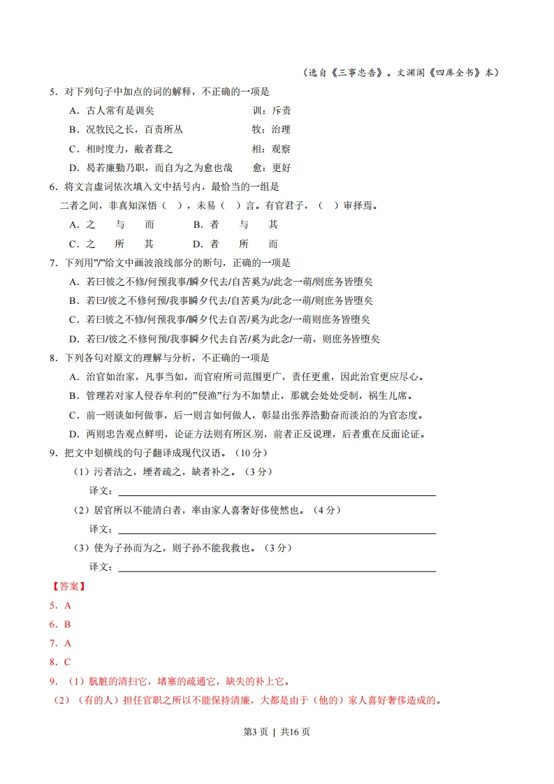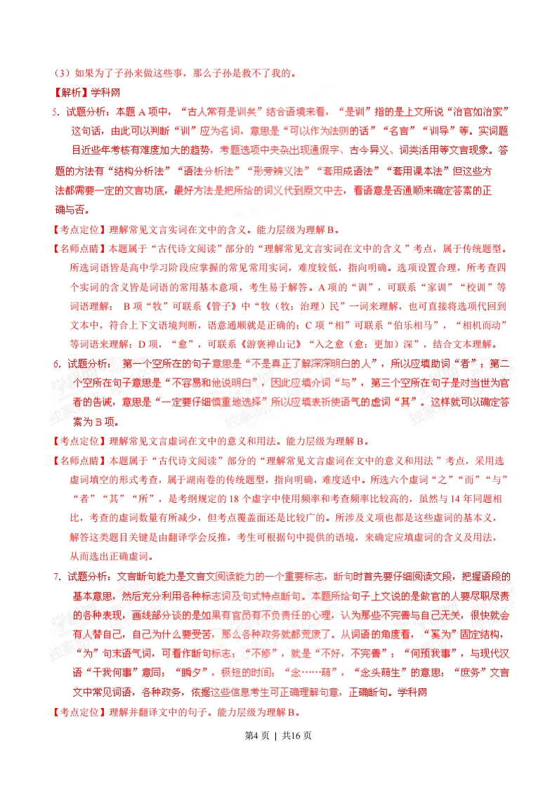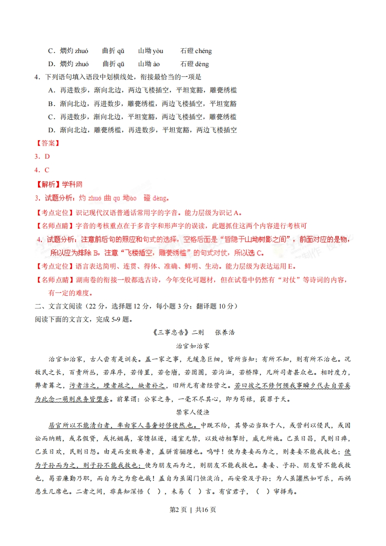 2015年高考湖南卷语文试题一、语言文字运用(12分。每小题3分)梦想是一个民族保持生机、激发活力的源泉。没有梦想的民族是可悲的,对美好梦想没有」和志不渝精神的民族同样没有前途。,坚韧不拔是中华民族固有的精神基因。回望历史,面对列强的坚船利炮,中华民族奋起抗争:面对新中国成立之初的一,中国人民:面对现代化征程中的困难与挑战,中华儿女怀揣中国梦。一路高歌前行。梦想的太阳,已经在东方地平线上喷薄而出,灿烂的朝霞正在光耀在我们的眼前…1.下列成语依次填入语段中划横线处,最恰当的一组是A.坚贞不屈自强不息百废俱兴奋起直追B.坚定不移自强不总百废待兴奋发图强C.坚贞不屈生生不息百废待兴奋发图强D.坚定不移生生不息百废俱兴奋起直追2.下列选项对语段主要运用的修辞手法的判断,正确的一组是A.比喻排比B.对偶比喻C.排比夸张D.夸张对偶【答案】1.B2.A【解析】学科网0071,试题分析:这是一道根据文意填写成语的题目,成语的意思都很好理解,关键注意上下文,第一个空注意前面的“梦想”,“只能用坚定不移”,第二个空后面是“精神”,只能用“自强不息”,第三个空前面是“成立之初”,所以用“百废待兴”,最后一空后面是“困难和挑战”只能用“奋发图强”。【考点定位】正确使用词语(包括熟语)。能力层级为表达运用E。2.试题分析:比喻“梦想是一个民族保持生机、激发活力的源泉”暗喻,排此“面对…面对…面对”。【考点定位】正确运用常用的修辞方法。能力层级为表达运用E。【名师点睛】这是一道考核辨析修辞的题目,注意各种修辞之间的区别,是湖南较有特色的题目,但难度不是很大。说着,进入石洞来,只见佳木芜葱,奇花烟灼,一带清流,从花木深处曲折泻于石隙之下。,皆隐于山坳树影之间。俯而视之,则清溪泻雪,石磴穿云,白石为栏,环抱为沿,石桥三港,兽面衔吐。桥上有亭。3.语段中加点的字,读音全都正确的一组是A.烟灼shuo曲折qi山坳ao石磴chengB.嫻灼shuo曲折qd山坳yòu石磴deng第1页|共16页C.烟灼zhuo曲折qǔ山坳yòu石磴chengD.熌灼huo曲折q0山蚴ao石磴deng4.下列语句填入语段中划横线处,衔接最恰当的一项是A.再进数步,渐向北边,两边飞楼插空,平坦宽豁,雕甍绣槛B.渐向北边,再进数步,雕甍绣槛,两边飞楼插空,平坦宽豁C.再进数步,渐向北边,平坦宽豁,两边飞楼插空,雕甍绣槛D.渐向北边,雕甍绣槛,再进数步,平坦宽豁,两边飞楼插空【答案】3.D4.C【解析】学科网3.试题分析:灼zhu6曲q0坳o磴deng。【考点定位】识记现代汉语普通话常用字的字音。能力层级为识记A。【名师点睛】字音的考核重点在于多音字和形声字的误读,此题抓住这两个内容进行考核可4.试题分析:注意前后句的照应和句式的选择,空格后面是“皆隐于山坳树影之间”,前面对应的是物,所以应为排除B,注意“飞楼插空,雕甍绣槛”的句式对仗,所以选C。【考点定位】语言表达简明、连贯、得体、准确、鲜明、生动。能力层级为表达运用E。【名师点睛】湖南卷的衔接一般都选古诗,今年变化可题材,但在试卷中仍然有“对仗”等诗词的内容,有一定的难度。二、文言文阅读(22分,选择题12分,每小题3分:翻译题10分)阅读下面的文言文,完成5-9题。《三事忠告》二则张养浩治官如治家治官如治家,古人尝有是训矣。盖一家之事,无缓急巨细,皆所当知:有所不知,则有所不治也。况牧民之长,百责所丛,若痒序,若传置,若仓庐,若图圆,若沟洫,若桥障,凡所司者甚众也。相时度力,弊者葺之,污者洁之,堙者疏之,缺者补之,旧所无有者经营之。若旦彼之不修何预我事避夕代去自苦奚为此念一萌则庶务皆堕矣。前辈谓:公家之务,一毫不尽其心,即为苟禄,获罪于天。禁家人侵渔居官所以不能清白者,率由家人喜奢好侈使然也。中既不给,其势必当取于人,或营利以侵民,或因讼而纳贿,或名假货,或托烟属,宴馈征逐,通室无禁,以致动相掣肘,威无所施。己虽日昌,民则日瘁,己虽日欢,民则日怨。由是而坐败辱者,盖骈首骊踵也。鸣呼!使为妻妾而为之,则妻妾不能我救也:使为子孙而为之,则子孙不能我救也:使为朋友而为之,则朋友不能我救也。妻妾、子孙、朋友皆不能我救也,曷若廉勤乃职,而自为之为愈也哉!盖自为虽国门恒淡泊,而安荣及子孙:为人虽讙然如可乐,而祸患生几席也。二者之间,非真知深悟(),未易()言。有官君子,()审择焉。第2页共16页(选自《三事忠告》。文渊阁《四库全书》本)5.对下列句子中加点的词的解释,不正确的一项是A.古人常有是训矣训:斥责B.况牧民之长,百责所丛牧:治理C.相时度力,敝者茸之相:观察D.曷若廉勤乃职,而自为之为愈也哉愈:更好6.将文言虚词依次填入文中括号内,最恰当的一组是二者之间,非真知深悟(),未易()言。有官君子,()审择焉。A.之与而B.者与其C.之所其D.者所而7.下列用”给文中画波浪线部分的断句,正确的一项是A.若曰彼之不修/何预我事/瞬夕代去/自苦奚为此念一萌侧庶务皆堕矣B.若曰/彼之不修何预/我事瞬夕代去/自苦奚为此念一萌/则庶务皆堕矣C.若曰彼之不修/何预我事/瞬夕代去自苦/奚为此念/一萌则庶务皆堕矣D.若曰/彼之不修何预/我事瞬夕代去自苦/奚为此念/一萌,则庶务皆堕矣8.下列各句对原文的理解与分析,不正确的一项是A.治官如治家,凡事当如,而官府所司范围更广,责任更重,因此治官更应尽心。B.管理若对家人侵吞牟利的”侵渔”行