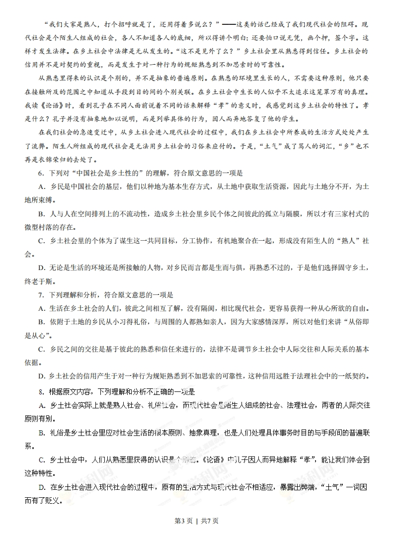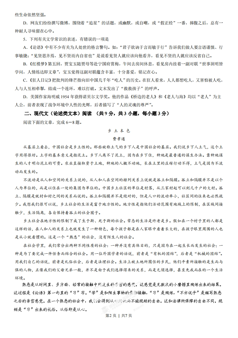 2013年高考湖北省语文原卷(精编版)本试题卷共8页,六大题23小题。全卷满分150分。考试用时150分钟。注意事项:1.答卷前,考生务必将自己的姓名、准考证号填写在试题卷和答题卡上,并将准考证号条形码粘贴在答题卡上的指定位置。用统一提供的2B铅笔将答题卡上试卷类型A后的方框涂黑。2.选择题的作答每小题选出答案后,用统一提供的2B铅笔把答题卡上对应题目的答案标号涂黑。如需改动,用橡皮擦干净后,再选涂其它答案标号。答在试题卷、草稿纸上无效。3.非选择题的作答:用统一提供的签字笔直接答在答题卡上对应的答题区域内。答在试题卷、草稿纸上无效。4.考生必须保持答题卡的整洁。考试结束后,请将本试题卷和答题卡一并上交。一、语文基础知识(共15分,共5小题,每小题3分)1.下列各组词语中,加点字的注音全都正确的一组是()A.瑞(chuai)水竞(jing)赛蘸(zhan)酒擂(lei)鼓助威B.跋涉(she)陡(dou)峭攀登(dng)餐霜饮雪(xě)C.善(shan)良谦逊(sdn)璞(pi)玉不事雕琢(zhuo)D.荆棘(ji)飘泊(b6)青苔(tai)红漆(qT)雕花2.下列各组词语中,没有错别字的一组是A.彷徨愁怨寂寥静默凄婉惆伥B.顾盼精捍步履稳健风神潇洒C.容智禀赋崇高品质趋善避恶D.辩难商榷典藉满架旁稽博采3.依次填入下列横线处的词语,最恰当的一组是①宋人画雪常不用铅粉,把背景用墨衬黑,一层层一,留出山头的白,树梢的白,甚至花蕾上的白,虚实映衬,意境悠远。②因为睡不着,打开窗帘,遥望夜空,_满天,斜月晶莹,薄雾似轻纱漫卷,。我思念那个小山村,那个让我魂牵梦绕的地方!A.而是点染星汉如梦如幻B.总是浸染星云如诗如画C.却是绘染星光诗意盎然D.只是渲染星斗诗意朦胧4.下列各项中,没有语病的一项是A.《美丽中国》以歌舞为主,融入京剧演唱、茶艺表演、少林武术等元素,加上奇幻的灯光,震撼的音响,一幅美丽中国的大写意,声光舞影流溢着浓郁的中国情。B.梦在前方,路在脚下,青年要坚定信念,珍惜韶华,在追求中国梦的道路上放飞青春,以青春之我建设“青春之国家”!C.从汶川到芦山,地震确实有能量剥夺太多本该鲜活滋润的生命,但地震却没有能量剥夺站立在废墟上的那第1页|共7页些生命依然坚强。D.网友们纷纷撰写微博,围绕着“追星”的话题,或幽默,或自嘲,或“假正经”一番,捧腹之后,总有一种耐人寻味留在心中。5.下列有关文学常识的表述,有错误的一项是A.《论语》中有不少有关为人处世的格言警句。如:“君子欲讷于言而敏于行”告诉我们做人要言语谨慎、行事敏捷:“见贤思齐焉,见不贤而内自省也”是说看见贤人就应该向他看齐,看见不贤的人就应该反省自己。B.《红楼梦》第五回,贾宝玉随贾母等赴宁国府赏梅,午间去房间休总,看见房内挂着一副对联“世事洞明皆学问,人情练达即文章”,宝玉觉得这副对联蕴含丰富,十分喜爱,铭记在心。C.《狂人日记》把批判的锋芒指向旧中国几千年“吃人”的历史。在狂人看来,人人都想吃人,又害怕被人吃,人与人互相牵掣,结成一个连环,难以打破。文末发出了“救救孩子”的呼声。D.美国作家海明威1954年获得诺贝尔文学奖。他的作品《桥边的老人》和《老人与海》均以“老人”为主人公,前者表现了战争环境中人性的光辉,后者描写了“人的灵魂的尊严”。二、现代文(论述类文本)阅读(共9分,共3小题,每小题3分)阅读下面的文章,完成6一8题。乡土本色费孝通从基层上看去,中国社会是乡土性的。那些被称土气的乡下人是中国社会的基层。我们说乡下人土气,这个土字用得很好。土字的基本意义是指泥土。乡下人离不了泥土,因为在乡下住,种地是最普通的谋生办法。靠种地谋生的人才明白泥土的可贵。农业直接取资于土地,种地的人搬不动地,长在土里的庄稼行动不得,土气是因为不流动而发生的。不流动是从人和空间的关系上说的,从人和人在空间的排列关系上说就是弧立和隔膜。弧立和隔膜并不是以个人为单位的,而是以住在一处的集团为单位的。中国乡土社区的单位是村落,从三家村起可以到几千户的大村。孤立、隔膜是就村和村之间的关系而说的。弧立和隔膜并不是绝对的,但是人口的流动率小,社区间的往来也必然疏少。我想我们很可以说,乡土社会的生活是富于地方性的。地方性是指他们活动范围有地域上的限制,在区域间接触少,生活隔离,各自保持着弧立的社会圈子。乡土社会在地方性的限制下成了生于斯、死于斯的社会。常态的生活是终老是乡。假如在一个村子里的人都是这样的话,在人和人的关系上也就发生了一种特色,每个孩子都是在人家眼中看着长大的,在孩子眼里周围的人也是从小就看惯的。这是一个“熟悉”的社会,没有陌生人的社会。在社会学里,我们常分出两种不同性质的社会:一种并没有具体目的,只是因为在一起生长而发生的社会:一种是为了要完成一件任务而结合的社会。用一位外国学者的话说,前者是“有机的团结”,后者是“机械的团结”。用我们自己的话说,前者是礼俗社会,后者是法理社会。生活上被土地所固住的乡民,他们平素所接触的是生而与俱的人物,正像我们的父母兄弟一般,并不是由于我们选择得来的关系,而是无须选择,甚至先我而在的一个生活环境。熟悉是从时间里、多方面、经常的接触中所发生的亲密的感觉。这感觉是无数次的小磨擦里陶炼出来的结果。这过程是《论语》第一句里的