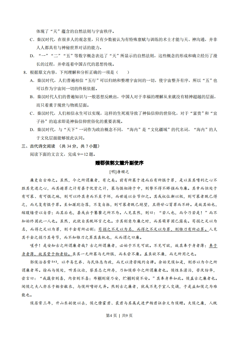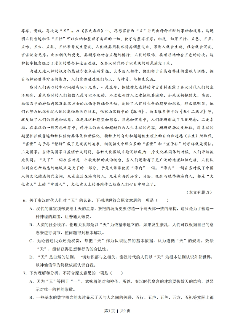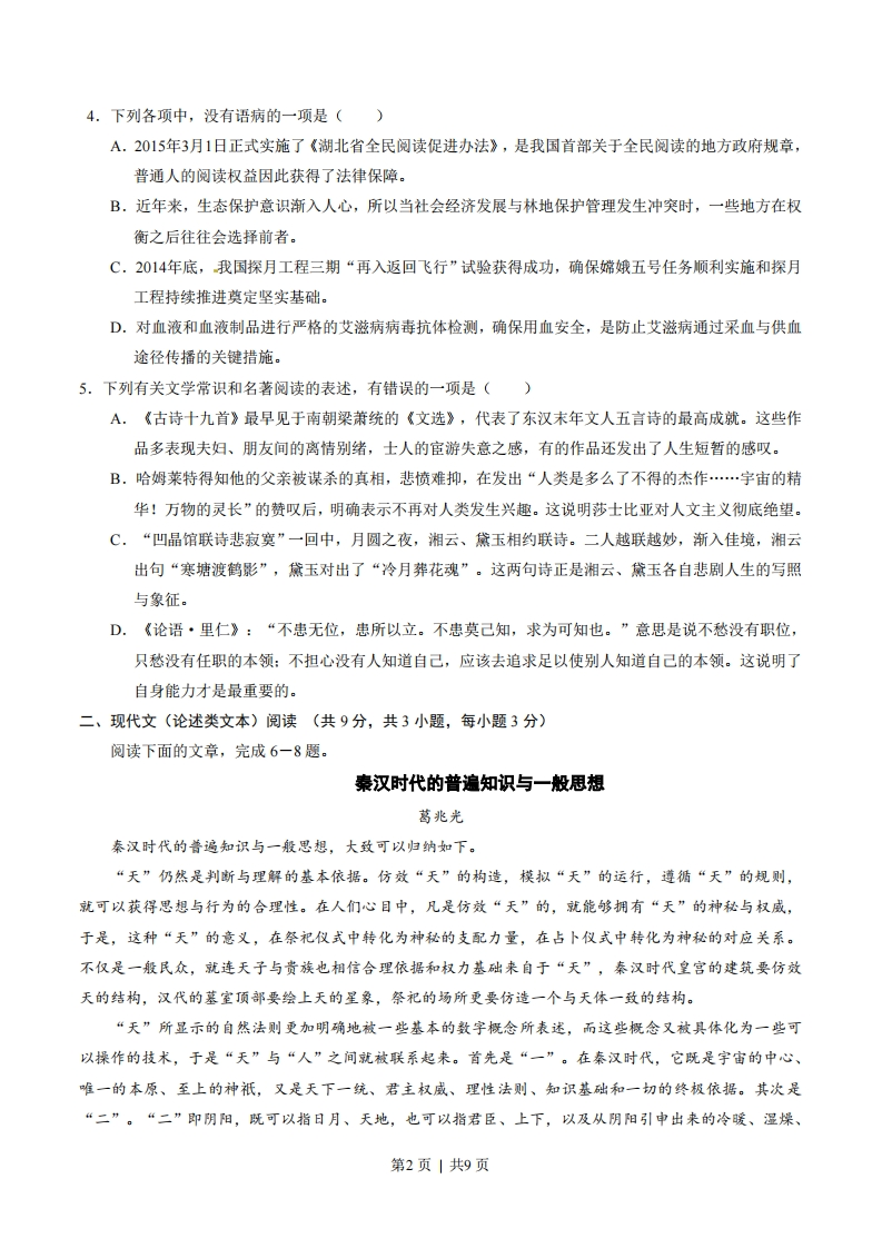 绝密★启用前2015年普通高等学校招生全国统一考试(湖北卷)语文本试题卷共8页,六大题23小题。全卷满分150分。考试用时150分钟。★祝考试顺利★注意事项:1.答卷前,先将自己的姓名、准考证号填写在试题卷和答题卡上,并将准考证号条形码粘贴在答题卡上的指定位置。用2B铅笔将答题卡上试卷类型A后的方框涂黑。2.选择题的作答:每小题选出答案后,用2B铅笔把答题卡上对应题目的答案标号涂黑。写在试题卷、草稿纸和答题卡上的非答题区域均无效。3.非选择题的作答:用签字笔直接答在答题卡上对应的答题区域内。写在试题卷、草稿纸和答题卡上的非答题区域均无效。4.考试结束后,请将本试题卷和答题卡一并上交。一、语文基础知识(共15分,共5小题,每小题3分)1.下列各组词语中,加点字的注音全都正确的一组是()A.缜(shen)密感喟(kui)紫蔷薇(wei)暗香盈(ying)袖B.镶(xiang)嵌驰骋(cheng)栀(h)子花逸兴遄(chun)飞C.热忧(chen)别(bie)扭康乃馨(xin)积微成著(zhù)D.菜肴(yo)酣(hdn)畅蒲(pú)公英春风拂(ǒ)面2.下列各组词语中,没有错别字的一组是()A.商埠绰约扣人心弦扶老携幼B.博奕翘楚以逸待劳固若金汤C.笃信聪慧日臻成熟灸手可热D.溃乏矫情所向披靡汗流浃背3.依次填入下列横线处的词语,最恰当的一组是()研究伊始,该团队选取了华北、西北地区生产的几十种马铃薯进行分析一,从营养成分、一硬度等方面多次试验,确定了适合加工马铃薯面条的两个品种。随后,又从诸多面粉种类中试验选取了的小麦粉加以调试。A.鉴别色泽终于适量B.鉴别色彩终于适当C.甄别色泽最终适当D.甄别色彩最终适量第1页|共9页4.下列各项中,没有语病的一项是()A.2015年3月1日正式实施了《湖北省全民阅读促进办法》,是我国首部关于全民阅读的地方政府规章,普通人的阅读权益因此获得了法律保障。B.近年来,生态保护意识渐入人心,所以当社会经济发展与林地保护管理发生冲突时,一些地方在权衡之后往往会选择前者。C.2014年底,我国探月工程三期“再入返回飞行”试验获得成功,确保嫦娥五号任务顺利实施和探月工程持续推进奠定坚实基础。D.对血液和血液制品进行严格的艾滋病病毒抗体检测,确保用血安全,是防止艾滋病通过采血与供血途径传播的关键措施。5.下列有关文学常识和名著阅读的表述,有错误的一项是()A.《古诗十九首》最早见于南朝梁萧统的《文选》,代表了东汉末年文人五言诗的最高成就。这些作品多表现夫妇、朋友间的离情别绪,士人的宦游失意之感,有的作品还发出了人生短暂的感叹。B.哈姆莱特得知他的父亲被谋杀的真相,悲愤难抑,在发出“人类是多么了不得的杰作…宇宙的精华!万物的灵长”的赞叹后,明确表示不再对人类发生兴趣。这说明莎士比亚对人文主义彻底绝望。C.“凹晶馆联诗悲寂寞”一回中,月圆之夜,湘云、黛玉相约联诗。二人越联越妙,渐入佳境,湘云出句“寒塘渡鹤影”,黛玉对出了“冷月葬花魂”。这两句诗正是湘云、黛玉各自悲剧人生的写照与象征。D.《论语·里仁》:“不患无位,患所以立。不患莫己知,求为可知也。”意思是说不愁没有职位,只愁没有任职的本领:不担心没有人知道自己,应该去追求足以使别人知道自己的本领。这说明了自身能力才是最重要的。二、现代文(论述类文本)阅读(共9分,共3小题,每小题3分)阅读下面的文章,完成6一8题。秦汉时代的普遍知识与一般思想葛兆光秦汉时代的普遍知识与一般思想,大致可以归纳如下。“天”仍然是判断与理解的基本依据。仿效“天”的构造,模拟“天”的运行,遵循“天”的规则,就可以获得思想与行为的合理性。在人们心目中,凡是仿效“天”的,就能够拥有“天”的神秘与权威,于是,这种“天”的意义,在祭祀仪式中转化为神秘的支配力量,在占卜仪式中转化为神秘的对应关系。不仅是一般民众,就连天子与贵族也相信合理依据和权力基础来自于“天”,秦汉时代皇宫的建筑要仿效天的结构,汉代的墓室顶部要绘上天的星象,祭祀的场所更要仿造一个与天体一致的结构。“天”所显示的自然法则更加明确地被一些基本的数字概念所表述,而这些概念又被具体化为一些可以操作的技术,于是“天”与“人”之间就被联系起来。首先是“一”。在秦汉时代,它既是字宙的中心、唯一的本原、至上的神祇,又是天下一统、君主权威、理性法则、知识基础和一切的终极依据。其次是“二”。“二”即阴阳,既可以指日月、天地,也可以指君臣、上下,以及从阴阳引申出来的冷暖、湿燥、第2页共9页尊卑、贵贱。再次是“五”。在《吕氏春秋》中,思想家曾为“五”并列出种种匹配的事物和现象。这说明人们普遍相信“五行”可以归纳和整理宇宙间的一切,使宇宙整齐有序。相反,如果五行、五色、五声、五味、五方、五脏、五祀等等发生素乱,人们就要用技术将其调整过来,否则人就会生病,社会就会混乱,宇宙就会无序。比如朝代的变更,要顺序地吻合五德的排行:人们的服饰,要顺序地吻合五色的轮次。这种数字概念经历了漫长的整合和论证过程,在秦汉时代终于以系统的形式固定下来。沟通天地人神的权力仍然被少数术士所掌提。大多数人相信,他们由于有某些特殊的禀赋与训练,拥有与神秘世界对话的能力,人们需要通过他们与天、与神灵、与祖先交流。当时人们关心的中心问题有以下几类。一是