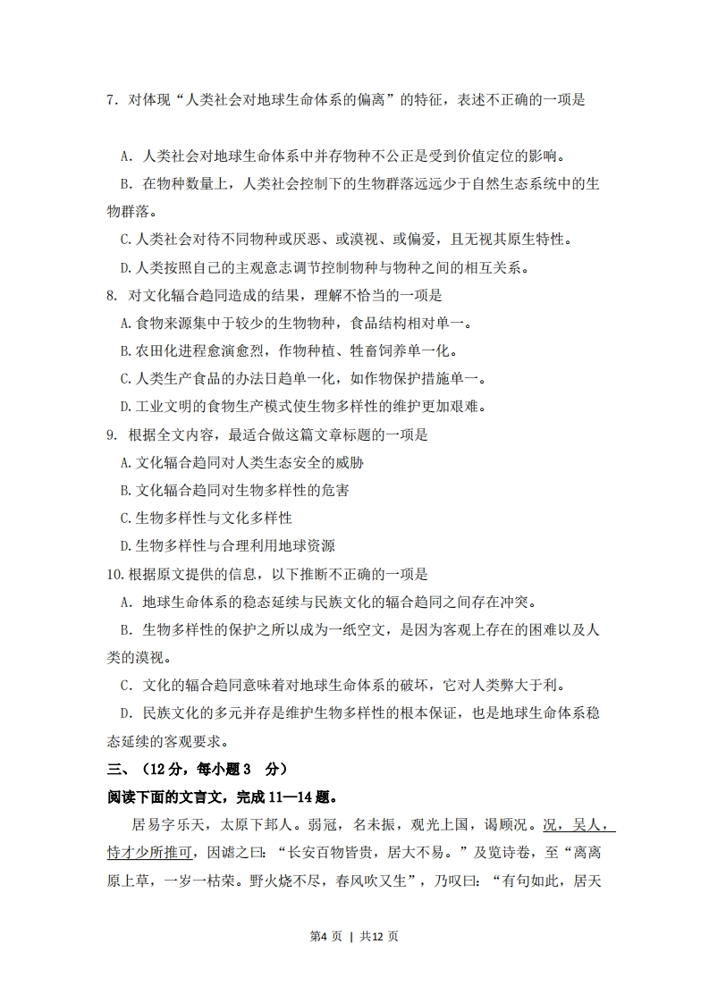 2008年普通高考浙江卷语文试题第1卷(共42分)一、(18分,每小题3分)1.下列词语中加点字的读音,完全相同的一组是A.删除膻味籼米潸然泪下B.信笺歼灭缄默间不容发C.飙升鱼鳔剽悍彪炳青史D.血缘戏谑噱头空穴来风2.下列各句中,没有错别字的一项是A.书刊要装帧,门面要装潢,居室要装修,营造一个舒适温馨而又口味高雅的家可以说是工薪阶层中许多人的梦想。B.舞台上,弟弟的朗颂声情并茂,姐姐的伴奏锦上添花母亲心中的那丝担忧很快便烟消云散了。C.2008年1月以来,中国居民物价指数CPI出现了明显的涨幅,不少低收入家庭倍感通货膨涨的压力。D.在骄阳的曝晒下,牵牛花堰旗息鼓,美人蕉慵倦无力,矜持的牡丹也耷拉下了高贵的头颅,失去了先前的神采。3.下列各句中,加点词语能被括号中的词语替换且不改变句意的一项是A.中国高等教育用不到十年的时间实现了从精英教育到大众教育的跨越,但大发展过程中,难免会泥沙俱下,出现各种各样的问题。(鱼龙混杂)B.她不属于学院派,自然少受那些清规戒律的约束,其创作往往天马行空,充满神奇瑰丽的想象。(金科玉律)C.最近,浙江手机上网资费全面下调,广大用户对此额手称庆。专家预测,未来通过手机收看体育赛事或许会成为一种潮流。(弹冠相庆)D.BA季后赛中,由于缺少了主力姚明,火箭队内线空虚,在防守上往往顾此失彼,实力明显削弱。(捉襟见肘)4.下列各句中,没有语病的一句是A.5月8日,俄罗斯国家杜马以压倒性票数批准新任总统梅德韦杰夫对俄前任总统普京的总理提名,梅德韦杰夫于当日签署了任命书。第1页|共12页B.这种无纺布环保袋经过工艺处理后,具备了防水、易清洗、容量大、满足消费者对环保袋的客观需求的优势。C.在交融与冲突并存的文化环境中,能否用东方雕塑语言来表达这个精神,恰恰是中国当带雕塑所欠缺的。D.奥运圣火登顶珠峰的瞬间,无论是参与登顶的勇士,还是全世界观看这一壮举的人们,无不毫无例外地感受到了心灵的震撼。5.下列各句中,所引诗词最符合语境的一项是A.“明月别枝惊鹊,清风半夜鸣蝉。”夏夜的西湖边,热闹的不仅是那些可爱的小生灵,更有璀璨的华灯和络绎的游人。B.“疏影横斜水清浅,暗香浮动月黄昏。”到现在我才知道,原来桂花的风骨,在于他的孤傲:桂花的品格,在于它的清幽。C.“女娲炼石补天处,石破天惊逗秋雨。”高亢的乐声响彻苍穹,回荡在黄沙漫漫的高原上,也打动了他那颗布满伤痕的心。D.“云中谁寄锦书来?雁字回时,月满西楼。”在异乡忙于追梦的游子,又怎能体会到母亲在故乡牵挂和守望呢?6.下列有关文学常识的表述,不正确的一项是A.加西亚·马尔克斯是魔幻现实主义最杰出的代表作家、诺贝尔文学奖获得者,他的《百年孤独》被誉为“再现拉丁美洲历史社会图景的鸿篇巨制”。B.中国古代戏曲主要指元杂剧和明清传奇。关汉卿的《窦娥冤》和王实甫的《西厢记》代表了元杂剧的最高成就,汤显祖的《牡丹亭》则是清传奇的代表作。C.“家国之思”是中国古典文学作品中常见主题之一,唐代杜甫的《春望》和南唐后主的《虞美人》(春花秋月何时了)都抒发了国破家亡的之痛。D.诗人经营意象往往匠心独运,徐志摩用“凉风”下的“水莲花”比喻姑娘的娇羞,而舒婷则用“林棉”“红硕的花朵”象征现代女性的独立。二、(12分,每小题3分)阅读下面的文字,完成7一10题。众所周知,生物多样性是地球生命体系稳态延续的基本前提。但人类社会的活动由于受到价值定位的影响,总会对某些生物物种过分偏爱,而对另一些生物物种漠然视之,甚至对某些物种厌恶有加,因而在地球生命体系中并存的生物物第2页|共12页种,在人类社会中总会受到各不相同的待遇。这种不公正性,首先表现为人类社会控制下的生物群落,在物种数量上比自然生态系统中要少得多:其次表现为不同物种受到的待遇也互有区别,而且无视其原生特性再次表现为相互间的关系得按照人类的意志加以调控。这些特征体现了人类社会对地球生命体系的偏离。这样的偏离积累扩大后,最终都会影响到地球生命体系的生物多样性。不同文化对生物物种的价值定位,完全屈从于相关民族文化稳态运行的需要,而这样的需要又具有多重性,因而不同民族文化对生物的价值定位并不具有通约性。比较不同民族文化对生物物种的价值定位,其间也无规律可言。目前愈演愈烈的农田化进程和作物种植、牲畜饲养的单一化,恰好是全球范围内文化辐合趋同演替的自然结果。要消除这些威胁,更好地维护生物多样性,出路只有一个,那就是人类的食品结构必须尽可能多样化,尽可能从更多的生物物种中获取食物来源。而做到这一点的根本保证,也只能是民族文化的多元并存。在文化辐合趋同演替的背景下,人类生产食品的办法也会日趋单一化。目前,在全球范围内,最为通行的作物保护措施就是化学农药的使用。但任何化学农药都会不加区别的消灭一切除作物和家养动物以外的物种,这对生物多样性的破坏是不言而喻的事实。然而,随着文化的辐合趋同,人类无法找到一种更好的化学农药的替代品,以至于生物多样的保护成了一纸空文。生物多样性维护的另一个重要的威胁是化肥的滥用。人类在使用化肥时关注的仅是作物本身,对使用化肥的负面效应即使了解,也往往是不加理会。化肥的使用对于土壤微生物的存