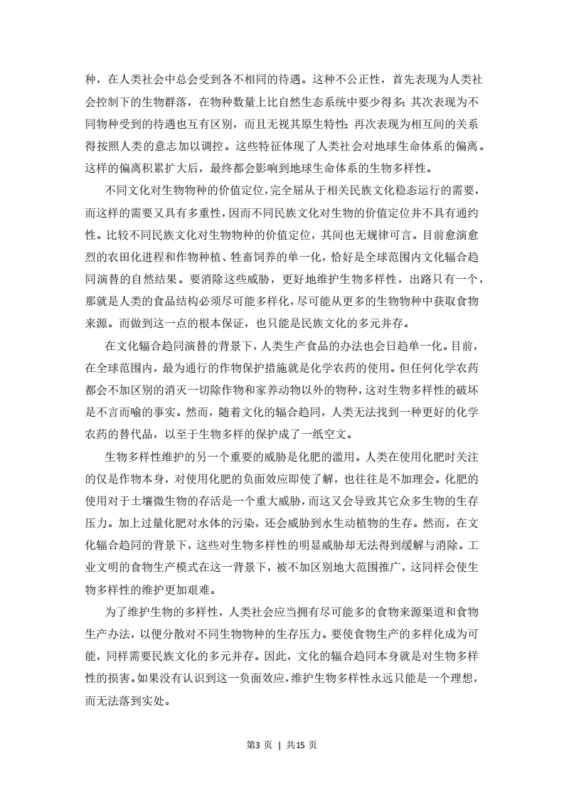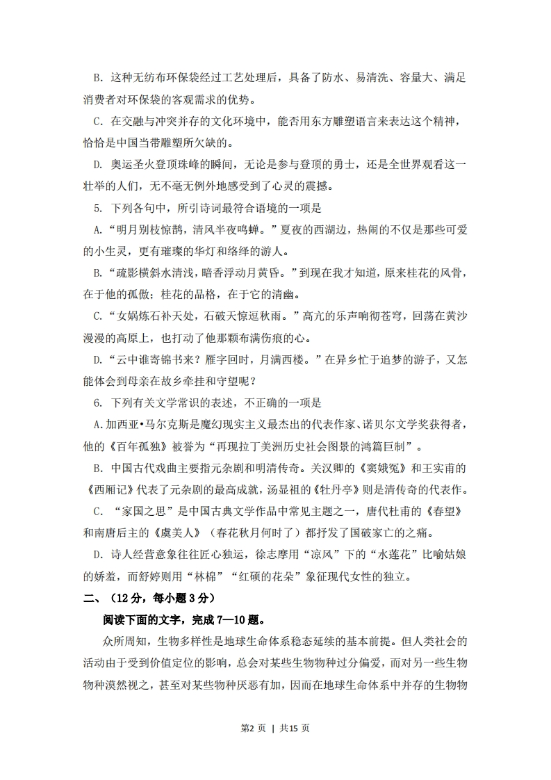 2008年普通高考浙江卷语文试题第1卷(共42分)一、(18分,每小题3分)1.下列词语中加点字的读音,完全相同的一组是A.删除膻味籼米潸然泪下B.信笺歼灭缄默间不容发C.飙升鱼鳔剽悍彪炳青史D.血缘戏谑噱头空穴来风2.下列各句中,没有错别字的一项是A.书刊要装帧,门面要装潢,居室要装修,营造一个舒适温馨而又口味高雅的家可以说是工薪阶层中许多人的梦想。B.舞台上,弟弟的朗颂声情并茂,姐姐的伴奏锦上添花母亲心中的那丝担忧很快便烟消云散了。C.2008年1月以来,中国居民物价指数CPI出现了明显的涨幅,不少低收入家庭倍感通货膨涨的压力。D.在骄阳的曝晒下,牵牛花堰旗息鼓,美人蕉慵倦无力,矜持的牡丹也耷拉下了高贵的头颅,失去了先前的神采。3.下列各句中,加点词语能被括号中的词语替换且不改变句意的一项是A.中国高等教育用不到十年的时间实现了从精英教育到大众教育的跨越,但大发展过程中,难免会泥沙俱下,出现各种各样的问题。(鱼龙混杂)B.她不属于学院派,自然少受那些清规戒律的约束,其创作往往天马行空,充满神奇瑰丽的想象。(金科玉律)C.最近,浙江手机上网资费全面下调,广大用户对此额手称庆。专家预测,未来通过手机收看体育赛事或许会成为一种潮流。(弹冠相庆)D.BA季后赛中,由于缺少了主力姚明,火箭队内线空虚,在防守上往往顾此失彼,实力明显削弱。(捉襟见肘)4.下列各句中,没有语病的一句是A.5月8日,俄罗斯国家杜马以压倒性票数批准新任总统梅德韦杰夫对俄前任总统普京的总理提名,梅德韦杰夫于当日签署了任命书。第1页|共15页B.这种无纺布环保袋经过工艺处理后,具备了防水、易清洗、容量大、满足消费者对环保袋的客观需求的优势。C.在交融与冲突并存的文化环境中,能否用东方雕塑语言来表达这个精神,恰恰是中国当带雕塑所欠缺的。D.奥运圣火登顶珠峰的瞬间,无论是参与登顶的勇士,还是全世界观看这一壮举的人们,无不毫无例外地感受到了心灵的震撼。5.下列各句中,所引诗词最符合语境的一项是A.“明月别枝惊鹊,清风半夜鸣蝉。”夏夜的西湖边,热闹的不仅是那些可爱的小生灵,更有璀璨的华灯和络绎的游人。B.“疏影横斜水清浅,暗香浮动月黄昏。”到现在我才知道,原来桂花的风骨,在于他的孤傲:桂花的品格,在于它的清幽。C.“女娲炼石补天处,石破天惊逗秋雨。”高亢的乐声响彻苍穹,回荡在黄沙漫漫的高原上,也打动了他那颗布满伤痕的心。D.“云中谁寄锦书来?雁字回时,月满西楼。”在异乡忙于追梦的游子,又怎能体会到母亲在故乡牵挂和守望呢?6.下列有关文学常识的表述,不正确的一项是A.加西亚·马尔克斯是魔幻现实主义最杰出的代表作家、诺贝尔文学奖获得者,他的《百年孤独》被誉为“再现拉丁美洲历史社会图景的鸿篇巨制”。B.中国古代戏曲主要指元杂剧和明清传奇。关汉卿的《窦娥冤》和王实甫的《西厢记》代表了元杂剧的最高成就,汤显祖的《牡丹亭》则是清传奇的代表作。C.“家国之思”是中国古典文学作品中常见主题之一,唐代杜甫的《春望》和南唐后主的《虞美人》(春花秋月何时了)都抒发了国破家亡的之痛。D.诗人经营意象往往匠心独运,徐志摩用“凉风”下的“水莲花”比喻姑娘的娇羞,而舒婷则用“林棉”“红硕的花朵”象征现代女性的独立。二、(12分,每小题3分)阅读下面的文字,完成7一10题。众所周知,生物多样性是地球生命体系稳态延续的基本前提。但人类社会的活动由于受到价值定位的影响,总会对某些生物物种过分偏爱,而对另一些生物物种漠然视之,甚至对某些物种厌恶有加,因而在地球生命体系中并存的生物物第2页|共15页种,在人类社会中总会受到各不相同的待遇。这种不公正性,首先表现为人类社会控制下的生物群落,在物种数量上比自然生态系统中要少得多:其次表现为不同物种受到的待遇也互有区别,而且无视其原生特性再次表现为相互间的关系得按照人类的意志加以调控。这些特征体现了人类社会对地球生命体系的偏离。这样的偏离积累扩大后,最终都会影响到地球生命体系的生物多样性。不同文化对生物物种的价值定位,完全屈从于相关民族文化稳态运行的需要,而这样的需要又具有多重性,因而不同民族文化对生物的价值定位并不具有通约性。比较不同民族文化对生物物种的价值定位,其间也无规律可言。目前愈演愈烈的农田化进程和作物种植、牲畜饲养的单一化,恰好是全球范围内文化辐合趋同演替的自然结果。要消除这些威胁,更好地维护生物多样性,出路只有一个,那就是人类的食品结构必须尽可能多样化,尽可能从更多的生物物种中获取食物来源。而做到这一点的根本保证,也只能是民族文化的多元并存。在文化辐合趋同演替的背景下,人类生产食品的办法也会日趋单一化。目前,在全球范围内,最为通行的作物保护措施就是化学农药的使用。但任何化学农药都会不加区别的消灭一切除作物和家养动物以外的物种,这对生物多样性的破坏是不言而喻的事实。然而,随着文化的辐合趋同,人类无法找到一种更好的化学农药的替代品,以至于生物多样的保护成了一纸空文。生物多样性维护的另一个重要的威胁是化肥的滥用。人类在使用化肥时关注的仅是作物本身,对使用化肥的负面效应即使了解,也往往是不加理会。化肥的使用对于土壤微生物的存