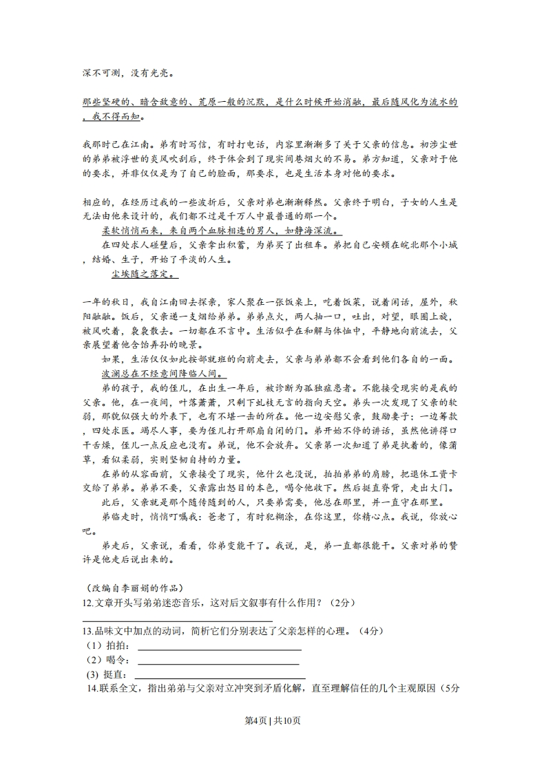 2010年普通高等学校招生全国统一考试(浙江卷)语文一、语言文字运用(共24分,其中选择题每小题3分)1.下列词语中加点的字,注音全都正确的一组是A.澄澈(cheng)轻佻(tiao)豁免权(huo)舆论哗然(hua)B.甄别(zhn)市侩(kuai)软着陆(zhao)温柔敦厚(dǖn)C.苍穹(qiong)未遂(sui)扁桃腺(xian)拈轻怕重(zhan)D.跛脚(bo)菁华(Gjng)撂挑子(liao)大雨滂沱(pang)2.下列各句中,没有错别字的一项是A.季羡林先生是一位有原则的知识分子,对许多重大问题,他都提出过自己的意见,只不过他很少采取金刚怒目的方式,而是绵里藏针,微言大意。B.我坐在暖烘烘的沙滩上,跳望浩渺的大海,观看为了一块面包而聒燥的海鸥,打量那些在海滩上寻找斑斓贝壳的孩童,尽量不去想那些不愉快的事。C.初春,周围的一切在闪烁,在融化,大地蒸腾起热气,云雀安详地鸣啭着呼吸着凛例、砭骨的空气,融雪炫目的反光使我不由自主地眯起眼睛、D.世人仅以沧海一粟之身,却能精鹜八级,心游万仞,领略茫茫宇宙与纷烦人世的壮丽之美,这是何等的境界!3.下列各句中,加点的词语运用错误的一项是A.她到任不久便发现这个部门人浮于事:多数人在完成任务后,以各种无聊的事情来打发时间,让别人看起来自己很忙而不被说三道四。B.在演讲比赛中,他口若悬河,滔滔不绝,但所讲内容与事先定下的主旨并不相关,显得小题大做,榜上无名也就理所当然了。C.象棋人机大战凸显了计算机思维与人类思想的差别,观战的内行觉得计算机的走法其实也很普通,但我这个象棋方面的半瓶醋却对个中奥妙困惑不己。D.他性格内向,不善与陌生人打交道,刚见到她的时候,脸都涨红了,期期艾艾了好一会儿,也不知在说些什么。4.下列各句中,没有语病的一项是A.栖息地的缩减以及遍布亚洲的偷猎行为,使得野生虎的数量急剧减少,将来老虎能否在大自然中继续生存取决于人类的实际行动。B.解决地沟油回流餐桌的根本在于加快地方立法,一方面制定强制统一收购餐厨垃圾的方法,另一方面通过立法协调环保、城管、工商等部门对餐厨废油的管理力度。C.近来,有些地方发生了利用短信诈骗银行卡持卡人的案件,且欺诈手法多样,出现了借口中奖、催款、退税等为名的新型欺诈。D.有专家认为,保护圆明园遗址的首要任务绝不是复建,哪怕是“部分”复建,而是研究、发掘后她展现出的遗存或废墟的价值。5.概括下面这段文字的主要内容。(不超过25字)(3分)对于五四时期的新文学阵营而言,所谓“新”,代表着晚近的先进的事物,代表着现在和未来的发展方向,而“旧”则是落后的腐朽的事物,是应该抛弃和埋葬的。可是在旧文学阵营的眼中,所谓“新”,只是新潮的、还未经过时间考验的东西,往往昙花一现,其中有大多数需要去掉的夸饰和虚伪,而“旧”则是经过历史检验的真理,是过去的精华所在第1页|共10页口口口口口▣口▣口口口口口口口口口口▣口口口口口口6.余光中先生说:一个方块字是一个天地,美丽的中文不老。许多汉字自身的构成就能诠释含义、激发联想。请仿照示例拆拼汉字,并用富有文采的语言描述它。要求:至少运用一种修辞方法。(4分)【例1】墨:大地滋养出一个黑色的精灵,在古朴的宣纸上潮潮起舞。【例2】鸿:江边盘旋的那只弧独的鸟啊,每一声哀鸣都在诉说游子的心曲。(1)尘:(2)舒:7,某校学生会为使更多的同学体验“低碳”生活,接受“低碳”理念,决定组织同学参观世博园“零碳馆”。请根据所提供的材料,拟写一份海报。要求:只写海报的宣传鼓动内容:语言表达简明流畅,生动得体。(100字左右)15分)“零碳馆”利用阳光和导热采暖、黄浦江水控温、废木头发电,完全摒除了煤、石油等不可再生能源。利用温压和风压,“零碳馆”能保持建筑内部空气流通,环境舒爽。墙体表面附着的特殊荧光涂料能将吸收的太阳能在夜间转换为荧光释放,使展馆成为“会发光的房子”。游客在“零碳餐厅”看到的餐具都是由前晚多余的有机饼干处理而成,使用后将会用于发电和发热,最终剩余品又再加工成生物肥,真正实现变废为…这些创意试图让游客在日常生活体验中,逐渐养成“零碳”的新生活态度。最特别的是,游客将在“零碳馆”领取专属的“二氧化碳身份码”,然后在”太富翁碳册游戏”中回答50个互动问题,这些问题涉及每个人的出行方式、里程数,使用的燃气种类,每月的水电煤费用等,最后游客将得到一张电脑计算出的”碳诊断书”,记录个人一年的“碳排放总量”。口口口口口口口口口口口口口口口口口口口口口口口口口口口口口口口口口口口口口口口日日日日口口口日日日日口口口日日日日口口口日日日日日口口口日二、现代文阅读(共32分,其中进择题每小题3分)(一)阅读下面的文字,完成8一11题,(12分”中国山水画起源的一个重要原因,就是那些士大夫艺术家试图把山水自然搬入自己的居室。来赏,来游,他们要使自己的精种走入这图画里。王维有一句诗“枕上见千里”,谋求的就是这种卧身在榻而尽观大千世界的境界,所以中国山水画论里就有一个“卧游”的术语。后来中国艺术中出现了园林和盆景,都是这种艺术理念的进一步发展与具体实现。说到底,就是将无限大的自然山水缩小到人的感官所能够把握的状态,这也决定了中国山水画的一个基本特征是人与自然的结合,天人合一,物我同一。历代的山书画家都试图在自然山水与人之