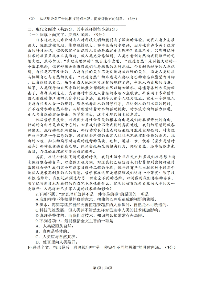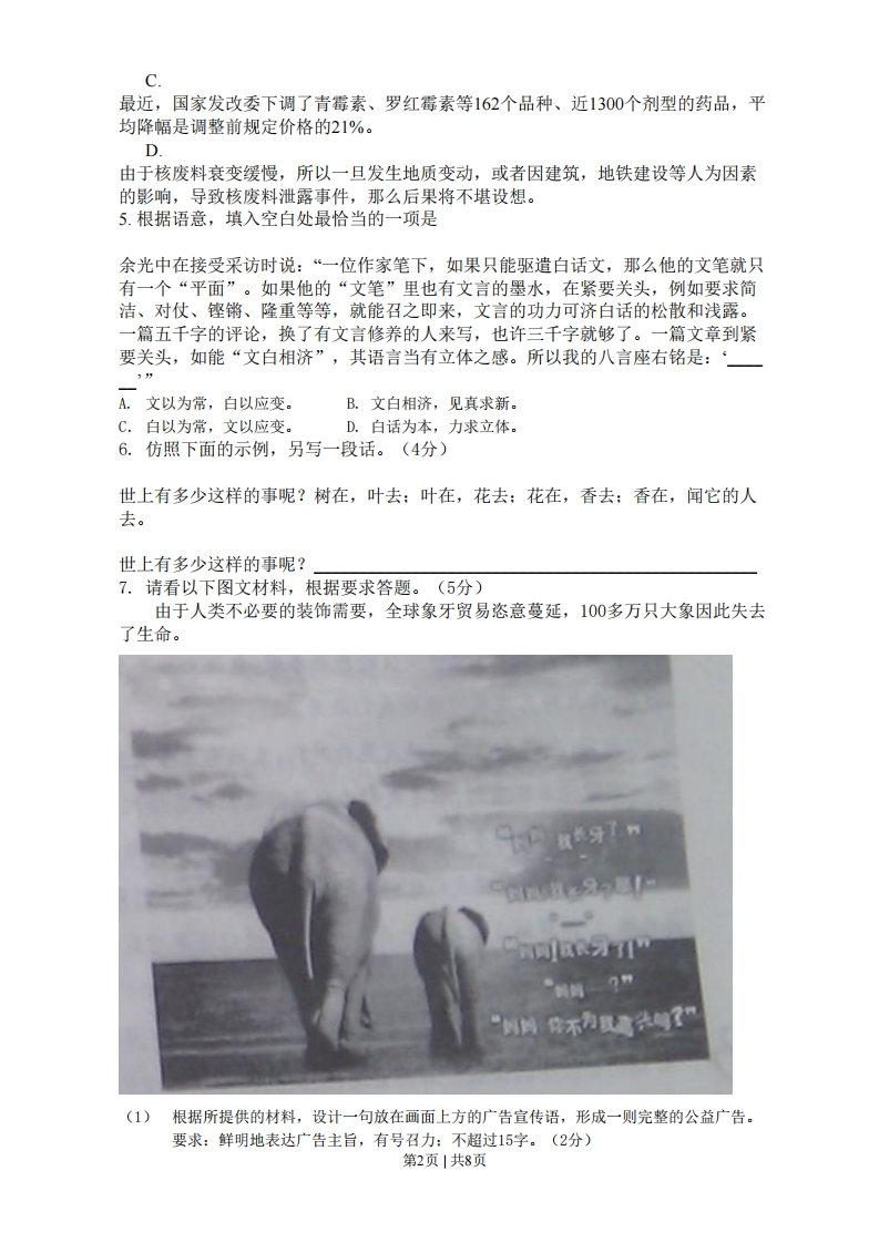 2011年普通高等学校招生全国统一考试(浙江卷)语文一、语言文学运用(共24分,其中选择题每小题3分)1、下列词语中加点的字,注音有错误的一组是A.给(ji)子毛坯(pi)强劲(jing)人心惶(huang)惶B.山崖(ya)霎(sha)时掳掠(1e)沁人心脾(pi)C.馄饨(tun)不屑(xiè)嫉(ji)妒令人咋(zha)舌D.神甫(fǔ)订(ding)正烙(lao)印摄人心魂(hin)2、下列各项中,没有错别字的一组是A、笔法闲熟,感情真挚。文章如流水账,缺乏细腻的描写。融感情于琐碎的细节中不作直接抒情,情却自然溢出。(摘自作文评语)B、贷款金额为叁拾肆万元,月底结算。暂收定金伍佰元,余额货到验收合格后十日内付清。(摘自单据合同)C、我们都是虫,可我是萤火虫。苦难是化了装的幸福。不是忙到脚不沾地,是忙到脚没空儿粘地。(摘自教室板报)D、一期售罄,二期将出,敬请期待。领衔浙江,独占整头。创意至上,虚位以待,欢迎报名。(摘自招牌广告)3、下列各句中,加点的词语运用错误的一项是A、竹叶和阳光彼此恋慕所闪出的光,使人坠入了无我境地:口令不闪光,竹叶自身或浅黄、或翠绿的色彩,不也令人陶醉吗?B、老校区遗留着一中旧时的氛围,参天的古木,平滑的石道,随处可见的老旧建筑..一切浓重得无需装饰就可做电影的背景。C、日常交往中,平等是人与人之间投桃报李、礼尚往来的前提,高高在上、盛气凌人只会使人与人彼此疏离、产生隔阂。D、班长在征文比赛中得了第二名,大家都夸她是才女,她却求全责备,谦虚地说年级里水平比她高的同学有很多,自己的文章还存在很多不足。4.下列各句中,没有语病的一项是A在网络时代到来以后,争鸣性质的学术文章,更强调要得到作者本人认可的文本为学术争论的起点。B中国正在经历一场从吃饱”向“吃好”、“吃健康”的转变,在这一历史进程中,能否保证公众的食品安全,取决于政府的执政水平,事关老百姓的切身利益。第1页|共8页C最近,国家发改委下调了青霉素、罗红霉素等162个品种、近1300个剂型的药品,平均降幅是调整前规定价格的21%。D由于核废料衰变缓慢,所以一旦发生地质变动,或者因建筑,地铁建设等人为因素的影响,导致核废料泄露事件,那么后果将不堪设想。5.根据语意,填入空白处最恰当的一项是余光中在接受采访时说:“一位作家笔下,如果只能驱遣白话文,那么他的文笔就只有一个“平面”。如果他的“文笔”里也有文言的墨水,在紧要关头,例如要求简洁、对仗、铿锵、隆重等等,就能召之即来,文言的功力可济白话的松散和浅露。一篇五千字的评论,换了有文言修养的人来写,也许三千字就够了。一篇文章到紧要关头,如能“文白相济”,其语言当有立体之感。所以我的八言座右铭是:‘A.文以为常,白以应变。B.文白相济,见真求新。C.白以为常,文以应变。D.白话为本,力求立体。6.仿照下面的示例,另写一段话。(4分)世上有多少这样的事呢?树在,叶去:叶在,花去:花在,香去:香在,闻它的人去。世上有多少这样的事呢?7.请看以下图文材料,根据要求答题。(5分)由于人类不必要的装饰需要,全球象牙贸易恣意蔓延,100多万只大象因此失去了生命。9可报长分1nmm8是I行可小a身“间”“问件不为段高时?”(1)根据所提供的材料,设计一句放在画面上方的广告宣传语,形成一则完整的公益广告。要求:鲜明地表达广告主旨,有号召力:不超过15字。(2分)第2页|共8页(2)从这则公益广告的图文特点出发,简要评价它的创意。(3分)二、现代文阅读(共29分,其中选择题每小题3分)(一)阅读下面文字,完成8-10题。(9分)日本这次大灾难让所有人对科技文明的脆弱有了深刻的体验。现代人看上去很强大,他能建核电站,能建规模很大、功率很高的水电站,因为他有许多关于这方面的科技知识,但仅仅这些知识对人类的存在就是真理吗?显然不是,只有当这种技术的后果呈现在人类面前,被人类充分意识到,人类才看到自然向我们敞开的完整真理,黑格尔说:“真理是整体的”就有这个意思。“改造自然”是科技文明的一个基本观念,但它却蕴含着摧毁我们生存根基的各种危机。今天越来越多的人意识到,自然是不可改造的,人与自然的关系不是改造与被改造的关系,而是人类适应与协调自己与自然的关系。“改造自然”的本质是人要以自己的意志和愿望为目标,让自然服从自己,而不是在天地间不可逆转的规律之内,争取人与自然的共济。结果,人类强行向自然索取的地盘全部都被自然以诸如洪水、海啸等各种方式抢回去了。每每谈到这点,我都要对中国先人曾经的睿智心生敬意。早在两千多年前中国人创造的都江堰四六分水的治水法,直到今天都令人叹为观止。它是一个体现人类与自然天人合一的规则。堰意味着对水的因势利导,在达到人的引水目的同时,并不违背水的自然本性。而坝则意味着对水的强硬抗衡,对水流方向的强力阻過,是人与自然的迎面撞击。哲学家指出,这才是现代技术的本质。但从哲学角度看,对我们生存性命攸关的根本自由是我们对真理开放的自由,行动的自由乃是后发于它的。如果我们看不清我们的真实处境,我们的思想还被各种偏见、流行的概念所蒙蔽,那行动对我们造成的后果就可能是灾难性的。对真理开放并不是一件容易的事。我们这些所谓的正常人往往也不能摆脱怪癖的意志、扭曲的心理、知识的局限所造成的视野的偏狭,也许,退后一步,放弃(至少是暂时放弃)那种