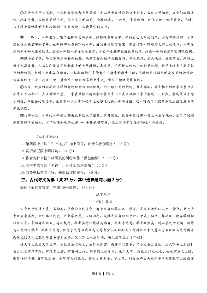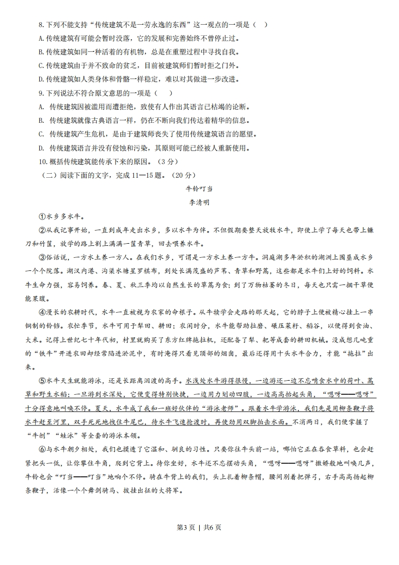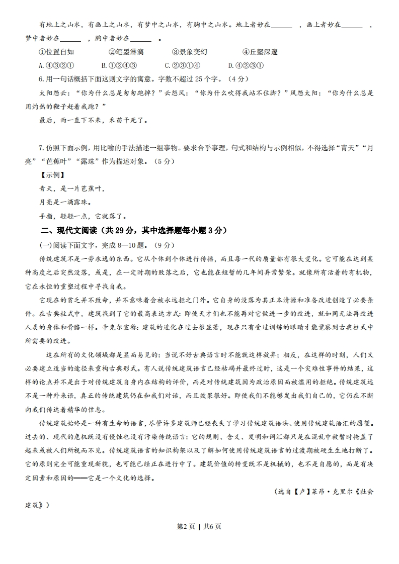 2013高考浙江卷语文原卷(精编版)一、语言文字运用(共24分,其中选择题每小题3分)1.下列词语中加点的字,注音全都正确的一项是()A.漩(xudn)涡按捺(ndi)蜜饯(jian)稍纵即(j1)逝B.桑梓(z1)鬈(qun)发昭(zhao)示图穷匕(6I)见C.混(hùn)搭盘桓(hun)喷(pen)香扛(kng)鼎之作D.潜(qin)伏佝偻(16u)拙(zhuo)见戛(jiá)然而止2.下列各句中,没有错别字的一项是(A.辩论双方唇枪舌箭,针锋相对,相持不下,后来正方二辩出其不意地抛出三个有力论据,令反方措手不及,只好甘拜下风。B.这位专家关于城镇化建设要防止落入“五大陷井”的说法得到了与会人员的认同,不少人对他的真知灼见竖起了大拇指。C.在“中国情结”绘画大奖赛中,作品《瑞雪兆丰年》创造性地融入了民族文化元素,让人产生强烈的共鸣,最终拔得头筹。D.每次登陆电子邮箱、微博或使用银行卡、会员卡时都须输入密码,而不同的密码容易混淆,这给人们平添了许多烦恼。3.下列各句中,加点的词语运用正确的一项是(A.倒金字塔形的“421”家庭结构使得居家养老陷入困境,社会养老服务体系又不够完善,以至中国养老问题日趋严重。B.有人多次为芦山灾区慷慨解囊,倾尽全部积蓄:也有人声明自己将细大不捐,以抗议某些慈善机构运作缺乏透明度。C.面对河水严重污染的现状,大学生自愿组成暑期社会实践小分队,满怀热诚地进行生态环境调查,积极宣传环保理念。D.随着出版业的市场化和多元化,类型多样、题材丰富的作品大量涌现,其中也有一些作品粗制滥造,令人不忍卒读。4.下列各句中,没有语病的一项是(A.这部由第六代导演执导的青春片带有鲜明的时代印记,表现了主人公拒绝平庸、坚守梦想的成长故事,具有极强的感染力,深深地打动了观众。B.瑞典和芬兰研究人员最近发现某些癌症存在“基因开关”,这一成果有助于未来的癌症防治,但距离相应药物的问世还需要很多年的深入研究。C.近年来,我国在海外开展了形式多样的汉语教学、汉语推广等文化交流活动,促进了汉语国际传播,在世界主要国家和城市越来越受欢迎。D.作为“第三次工业革命重要标志之一”的3D打印技术,目前被各国艺术家用于复杂的中小型雕塑作品创作和按原比例缩小的概念模型制作。5.依次填入下面空格处,最恰当的一项是()第1页|共6页有地上之山水,有画上之山水,有梦中之山水,有胸中之山水。地上者妙在一,画上者妙在梦中者妙在,胸中者妙在①位置自如②笔墨淋漓③景象变幻④丘壑深邃A.④③②①B.①②④③C.②③①④D.④②③①6.用一句话概括下面这则文字的寓意。字数不超过25个字。(4分)太阳怨云:“你为什么总是匆匆跑掉?”云怨风:“你为什么吹得我站不住脚?”风怨太阳:“你为什么总是用灼热的鞭子赶着我跑?”最后,雨一直下不来,禾苗干死了。7.仿照下面示例,用比喻的手法描述一组事物。要求合乎事理,句式和结构与示例相似,不得选择“青天”“月亮”“芭蕉叶”“露珠”作为描述对象。(5分)【示例】青天,是一片芭蕉叶,月亮是一滴露珠。手指,轻轻一点,它就落了。二、现代文阅读(共29分,其中选择题每小题3分)(一)阅读下面文字,完成8一10题。(9分)传统建筑不是一劳永逸的东西。它从个体到个体进行传播,而且每一代的质量都有很大变化。它可能在达到某种高度之后突然没落,或是,在一定时期的败落之后,它也能在短暂的几年间异常繁荣。就像所有活着的有机物,它在永恒的重塑过程中寻找自我。它现在的贫乏并不致命,并不意味着会被永远拒之门外。它自身的没落为其正本清源和准备改进创造了必要条件。在古典柱式中,建筑找到了它的最高表达方式:即使天才们也不能再对它做进一步的改进,就如同无法再改进人类的身体和骨骼一样。辛克尔宣称:建筑的进化在过去很显著,现在只有受过训练的眼睛才能觉察到古典柱式中所需要的改进。这在所有的文化领域都是显而易见的:当说不好古典语言时不能就这样放弃:相反,在这样的时刻,人们又必要建立适当的途径来重构古典形式。有人说传统建筑语言已经枯竭并最终过时,这是一个灾难性事件的结果,这样的论点并不是出于对传统建筑自身内在结枸的评价,而是对传统建筑因为政治原因而被滥用的拒绝。传统建筑远不是一种外来语,真正的传统建筑仍在和我们对话,而且效果很好。即使我们不能够发出我们自己的,它仍在不断向我们传达着精华的信息。传统建筑始终是一种有生命的语言,尽管许多建筑师已经丧失了学习传统建筑语法、使用传统建筑语汇的愿望。过去的、现代的危机既没有侵蚀也没有污染传统语言:它的规则、含义、发明和词汇都只是在混乱中被暂时掩盖了起来或被人们所视而不见。传统建筑语言的知识构架以及了解如何使用传统建筑语言的过渡期被硬生生地打断了。它的原则完全可能重现新貌,也可能已经正在进行中了。建筑价值的转变既不是机械的,也不是自愿的,而是有决定因素和原因的一它是一个文化的选择。(选自【户】莱昂·克里尔《社会建筑》)第2页|共6页8.下列不能支持“传统建筑不是一劳永逸的东西”这一观点的一项是()A.传统建筑有可能会暂时没落,它的发展和完善始终不曾停止过。B.传统建筑如同一种活着的有机物,总是在重塑过程中寻找自我。C.传统建筑由于并不致命的贫乏,目前被建筑师们暂时拒之门外。D.传统建筑如人类身体和骨骼一样稳定