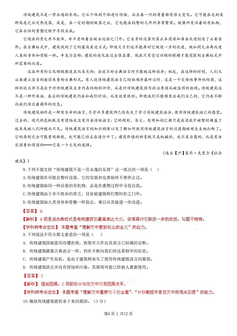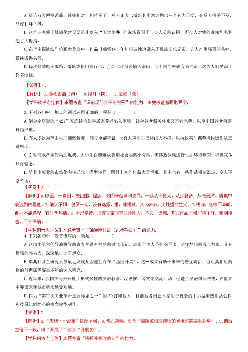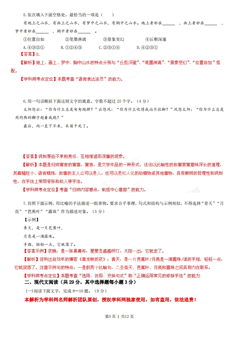 2013高考浙江卷语文解析(精编版)【学科网试卷总评】浙江是新课改较早的省份,因此试卷命题成熟稳定。总体呈现以下特点:一是设题灵活。如古诗鉴赏和《论语》解读,均以填空的形式考查内容理解和知识迁移能力,看似平常,却见匠心,激活了“静止”的语文知识,实现了能力“互通”。尽管这种“填空”的结果呈现仍是“朱门酒肉臭,路有冻死骨”“恶衣恶食”等样式,但命题着陆点并非识记,而是理解和迁移,跟通常的“背诵默写”形似实非。此类题型,对中学语文教学提出了新的要求。二是选材典范。如第5题的《幽梦影》、实用类文本《社会建筑》和文学类文本《牛铃叮当》,均系名家手笔。而文言文《送丁琰序》为“唐宋八大家”之一曾巩的佳作,古诗《秦中吟·歌舞》则是唐代大诗人白居易的讽刺诗名篇。这些阅读材料,也是崇尚经典的积极尝试,为语文命题提供了有益借鉴。三是对学生结合语境辨析的要求进一步提高。如第2题中“登陆”的“陆”是否该写为“录”,仅仅盯着“登陆电子邮箱”很可能产生莫衷一是的感觉,结合“使用银行卡、会员卡时都需输入密码”来辨析,正确答案才能水落石出。四是写作考题继续采用“新材料作文”模式。以三位中外作家的话语为材料,从而引出“童真泯早”“拯救童真”等跟考生“零距离”,又非常“生活化”的话题,让考生容易“发声”,可写性很强。而审题应该较去年稍难。虽一作家国籍有误,但不影响考生根据三作家的话写作答题。2013年浙江高考语文卷命题稳中有变,变化中透露的新鲜信息值得关注:与去年相比,语言运用板块有三题更新,分别是第5题词语排序、第6题寓意概括、第7题诗句仿写。这不是简单的考点轮换,对考生来说,第5题可能从未模拟,第7题即便大量的模拟也于事无补,该题仿写示例由青天、芭蕉叶、露珠等意象构成一个有诗意的整体,这为形象思维能力强、语言表现力丰富的考生提供了大展身手的舞台。仿得好就是一首诗,假如只会机械模仿句子形式,充其量可得基本分。写作考题继续采用“新材料作文”模式,以三位中外作家的话语为材料,从而引出“童真泯早”“拯救童真”等跟考生“零距离”,又非常“生活化”的话题,让考生容易“发声”,可写性很强。审题应该较去年稍难。一、语言文字运用(共24分,其中选择题每小题3分)本解析为学科网名师解析团队原创,授权学科网独家使用,如有盗用,依法追责!1.下列词语中加点的字,注音全都正确的一项是()A.漩(xudn)涡按捺(ndi)蜜饯(jian)稍纵即(51)逝B.桑梓(z1)鬈(qun)发昭(zhao)示图穷匕(6)见C.混(hdn)搭盘桓(hudn)喷(pen)香扛(kng)鼎之作D.潜(qin)伏佝偻(1ou)拙(zhuo)见戛(jiá)然而止【答案】B【解析】A.按捺(n)C.扛(gng)鼎之作D.拙(zhuo)见【学科网考点定位】本题考查“识记现代汉语普通话的字音”的能力,主要考查形声字和多音多义字的读音。2.下列各句中,没有错别字的一项是()第1页|共12页A.辩论双方唇枪舌箭,针锋相对,相持不下,后来正方二辩出其不意地抛出三个有力论据,令反方措手不及,只好甘拜下风。B.这位专家关于城镇化建设要防止落入“五大陷井”的说法得到了与会人员的认同,不少人对他的真知灼见竖起了大拇指。C.在“中国情结”绘画大奖赛中,作品《瑞雪兆丰年》创造性地融入了民族文化元素,让人产生强烈的共鸣,最终拔得头筹。D.每次登陆电子邮箱、微博或使用银行卡、会员卡时都须输入密码,而不同的密码容易混淆,这给人们平添了许多烦恼。【答案】c.【解析】A.唇枪舌箭(剑)B.陷井(阱)D.登陆(录)【学科网考点定位】本题考查“识记现代汉字的字形”的能力,主要考查音同形异字。3.下列各句中,加点的词语运用正确的一项是()A.倒金字塔形的“421”家庭结构使得居家养老陷入困境,社会养老服务体系又不够完善,以至中国养老问题日趋严重。B.有人多次为芦山灾区慷慨解囊,倾尽全部积蓄也有人声明自己将细大不捐,以抗议某些慈善机构运作缺乏透明度。C.面对河水严重污染的现状,大学生自愿组成暑期社会实践小分队,满怀热诚地进行生态环境调查,积极宣传环保理念。D.随着出版业的市场化和多元化,类型多样、题材丰富的作品大量涌现,其中也有一些作品粗制滥造,令人不忍卒读。【答案】A.【解析】A以至:一直到,表范围、程度、时间等延伸和发展,一般从小到大,从少到多,从浅到深。语境中表达到的程度。B.细大不捐:包罗一切,没有选择。捐,非捐献,实为舍弃。此处望文生义。C.热诚:热情而真诚。此处不能搭配,宜改为热情。D.不忍卒读:形容文章内容悲惨动人,不忍心读完。并非作品写得写得不好,粗制滥造。不合语境。)【学科网考点定位】本题考查“正确使用词语(包括熟语)”的能力。4.下列各句中,没有语病的一项是(A.这部由第六代导演执导的青春片带有鲜明的时代印记,表现了主人公拒绝平庸、坚守梦想的成长故事,具有极强的感染力,深深地打动了观众。B.瑞典和芬兰研究人员最近发现某些癌症存在“基因开关”,这一成果有助于未来的癌症防治,但距离相应药物的问世还需要很多年的深入研究。C.近年来,我国在海外开展了形式多样的汉语教学、汉语推广等文化交流活动,促进了汉语国际传播,在世界主要国家和城市越来越受欢迎。D.作为“第三次工业革命重要标志之一”的3D打印技术,目前被各国艺术家用于复杂的中