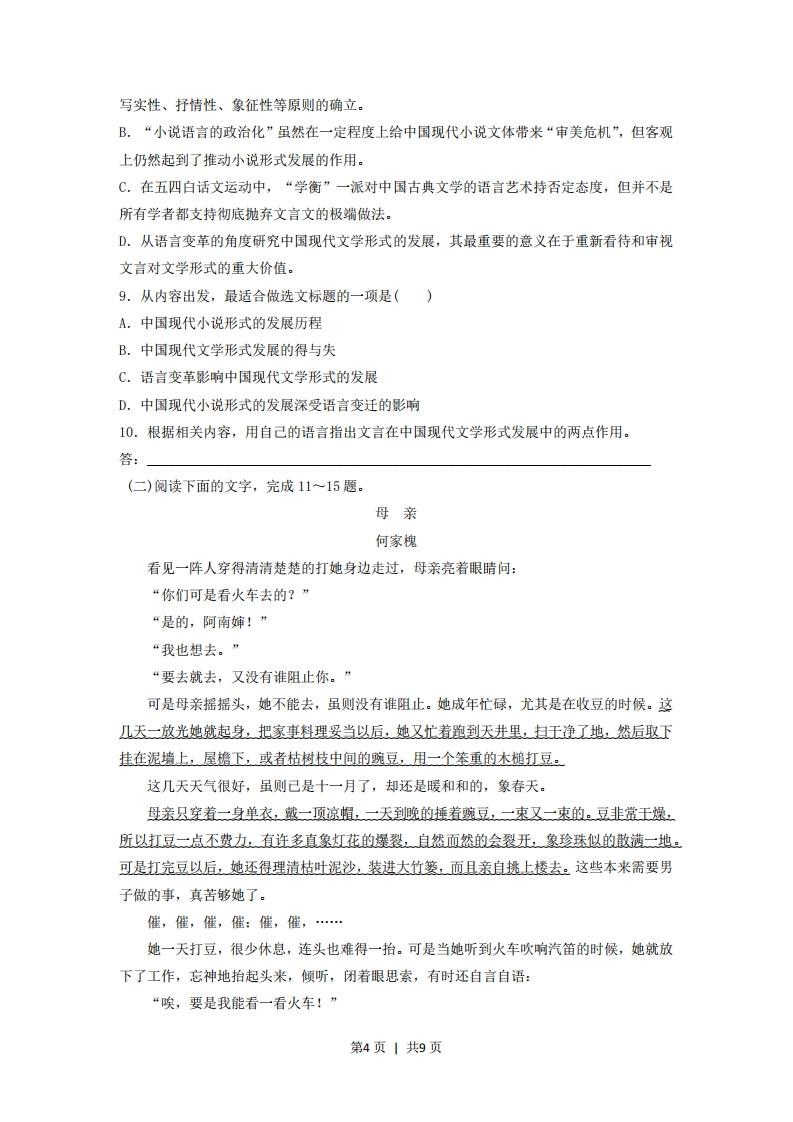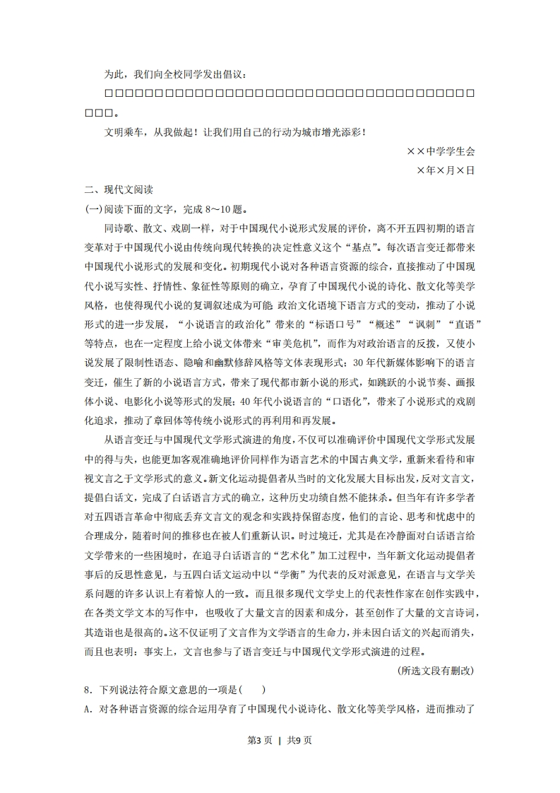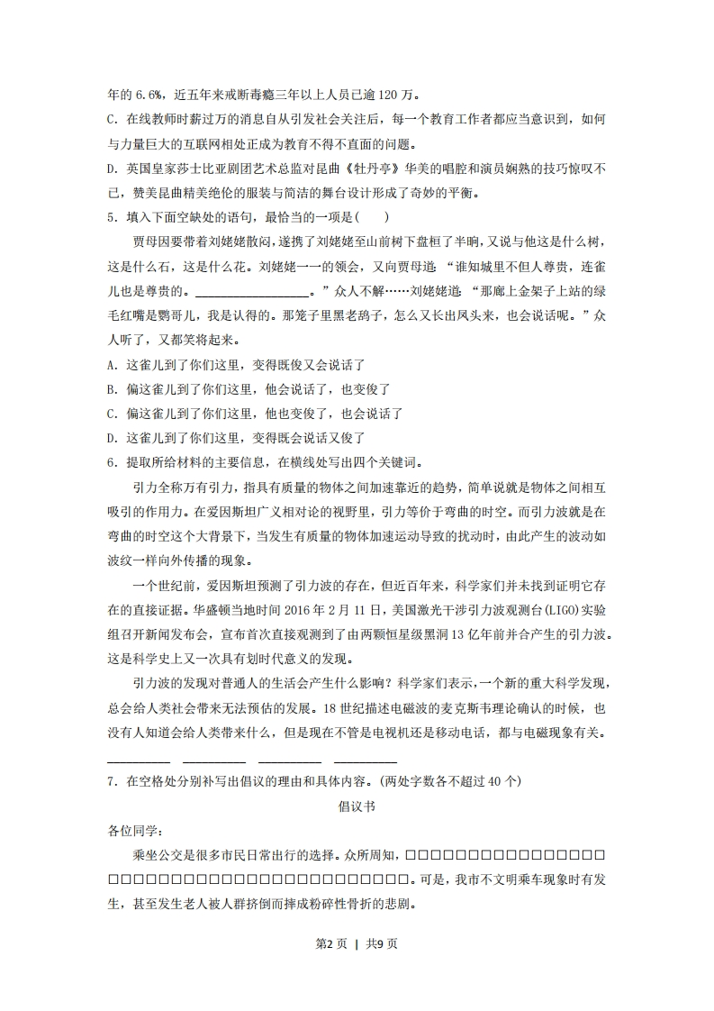 2016年普通高等学校全国统一考试(浙江卷)一、语言文字运用1.下列词语中,加点字的注音全都正确的一项是()A.煲汤(bāo)恫吓(dong)脐带血(j1)整齐划一(hud)B.古刹(cha)衣钵(60)挑大梁(tiǎo)言为心声(wèi)C.掣肘(che)卤味(1)处女座(chǔ)寅吃卯粮(y1n)D.笃定(dǔ)痤座疮(cuo)病恹恹(yang)血气方刚(xue)2.下列各句中,没有错别字的一项是(A.当前,文艺创作最突出的问题是浮燥,急功近利,粗制滥造,不仅是对文艺的一种伤害,也是对社会精神生活的一种伤害。B.电视剧播出前,剧组为聚人气而做密集宣传,虽无可厚非,也应把握尺度:低俗的噱头或许能暂时搏得关注,但终究不会提升电视剧本身的价值。C.史铁生、霍金或许抱怨过不公的命运,却并不曾在这个飞扬拔扈的对手面前认输,他们拼尽全力与对手掰手腕,直至打败对手,取得胜利。D.影片《荒野猎人》中,“小李子”扮演的不再是西装革履、风度翩翩的潇洒绅士,而是蓬头垢面、茹毛饮血,与自然鏖战的拓荒英雄。3.下列各句中,加点的词语运用不正确的一项是()A.他爱好广泛,喜欢安静的棋类运动,对热闹的纸牌游戏也来者不拒:欣赏通俗感性的流行歌曲,对庄重恢宏的交响乐也甘之如饴。B.荧屏上,他沉着大方,点评时事亦庄亦谐,精辟的见解让人折服:镜头外,他开朗乐观、热心助人,是邻居、朋友心中的活雷锋。C.虽然最初并不相信自己涉嫌犯罪,但由于电话那头的骗子言之凿凿,加上所谓最高检的“全国通缉公告”,信息闭塞的受害人最终成了骗子的猎物。D.在媒体的长枪短炮前,明星们也许悟出了言多必失的道理,鲜有人会在聚光灯前竹筒倒豆子,少说、不说成了他们自我保护的明智选择。4.下列各句中,没有语病的一项是()A.面对电商领域投诉激增的现状,政府管理部门和电商平台应及时联手,打击侵权和制售假冒伪劣商品,保护消费者的合法权益。B.自开展禁毒斗争以米,我国每年新发现的吸食海洛因人员增幅从2008年的13.7%降至2013第1页1共9页年的6.6%,近五年来戒断毒瘾三年以上人员己逾120万。C.在线教师时薪过万的消息自从引发社会关注后,每一个教育工作者都应当意识到,如何与力量巨大的互联网相处正成为教育不得不直面的问题。D.英国皇家莎士比亚剧团艺术总监对昆曲《牡丹亭》华美的唱腔和演员娴熟的技巧惊叹不己,赞美昆曲精美绝伦的服装与简洁的舞台设计形成了奇妙的平衡。5.填入下面空缺处的语句,最恰当的一项是()贾母因要带着刘姥姥散闷,遂携了刘姥姥至山前树下盘桓了半响,又说与他这是什么树,这是什么石,这是什么花。刘姥姥一一的领会,又向贾母道“谁知城里不但人尊贵,连雀儿也是尊贵的。。”众人不解…刘姥姥道“那廊上金架子上站的绿毛红嘴是鹦哥儿,我是认得的。那笼子里黑老鸹子,怎么又长出凤头来,也会说话呢。”众人听了,又都笑将起来。A.这雀儿到了你们这里,变得既俊又会说话了B.偏这雀儿到了你们这里,他会说话了,也变俊了C.偏这雀儿到了你们这里,他也变俊了,也会说话了D.这雀儿到了你们这里,变得既会说话又俊了6.提取所给材料的主要信息,在横线处写出四个关键词。引力全称万有引力,指具有质量的物体之间加速靠近的趋势,简单说就是物体之间相互吸引的作用力。在爱因斯坦广义相对论的视野里,引力等价于弯曲的时空。而引力波就是在弯曲的时空这个大背景下,当发生有质量的物体加速运动导致的扰动时,由此产生的波动如波纹一样向外传播的现象。一个世纪前,爱因斯坦预测了引力波的存在,但近百年来,科学家们并未找到证明它存在的直接证据。华盛顿当地时间2016年2月11日,美国激光干涉引力波观测台(LIG0)实验组召开新闻发布会,宣布首次直接观测到了由两颗恒星级黑洞13亿年前并合产生的引力波。这是科学史上又一次具有划时代意义的发现。引力波的发现对普通人的生活会产生什么影响?科学家们表示,一个新的重大科学发现,总会给人类社会带来无法预估的发展。18世纪描述电磁波的麦克斯韦理论确认的时候,也没有人知道会给人类带来什么,但是现在不管是电视机还是移动电话,都与电磁现象有关。7.在空格处分别补写出倡议的理由和具体内容。(两处字数各不超过40个)倡议书各位同学:乘坐公交是很多市民日常出行的选择。众所周知,口口口口口口口口口口口口口口口口口口口口口口口口口口口口口口口口口口口口口口口口。可是,我市不文明乘车现象时有发生,甚至发生老人被人群挤倒而摔成粉碎性骨折的悲剧。第2页1共9页为此,我们向全校同学发出倡议:▣口▣口▣口▣口口口口口口▣口口口▣口口口▣口口▣口口口▣口口口▣口口▣▣口口口。文明乘车,从我做起!让我们用自己的行动为城市增光添彩!××中学学生会×年×月×日二、现代文阅读(一)阅读下面的文字,完成8~10题。同诗歌、散文、戏剧一样,对于中国现代小说形式发展的评价,离不开五四初期的语言变革对于中国现代小说由传统向现代转换的决定性意义这个“基点”。每次语言变迁都带来中国现代小说形式的发展和变化。初期现代小说对各种语言资源的综合,直接推动了中国现代小说写实性、抒情性、象征性等原则的确立,孕育了中国现代小说的诗化、散文化等美学风格,也使得现代小说的复调叙述成为可能政治文化语境下语言方式的变动,推动了小说形式的进一步发展,“小说语言的政治化”带来的“标