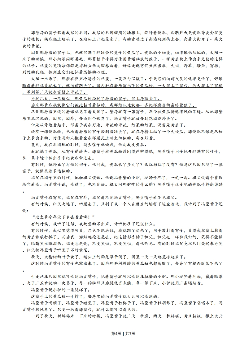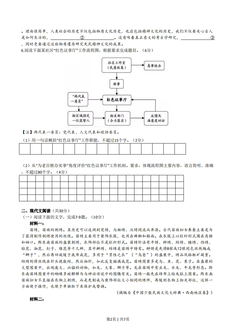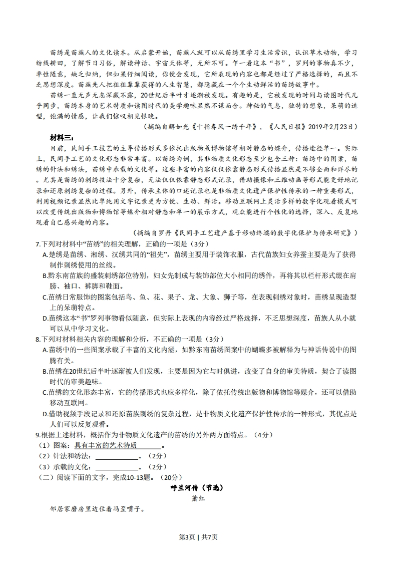 绝密★启用前2019年普通高等学校招生全国统一考试(浙江卷)语文一、语言文字运用(共20分)1.下列各句中,没有错别字且加点字的注音全都正确的一项是(3分)A.不甘庸碌,不墨守成规,不畏挫(cu心)折,以全部精力和才情奔向既定目标,赴汤蹈火,不达目的决不罢休,这与激荡在他内心的狷(juan)介不羁之气是多么一致。B.“雪地里踏着碎琼乱玉,迤逦背着北风而行w彤(dan)云密布,朔(shu心)风渐起,却早纷纷扬扬卷下一天大雪来”也许,《水浒传》中最美丽传情的文字就是雪了。C.“历史”并非噱(xué)头,而是“历史文化名城”的依托,一旦历史印记被急功近利的行为粗暴抹(mǒ)去,“文化”气息将荡然无存,“名城”必然岌岌可危。D.如果一个人能够用爱心拥抱世界,那么整个世界的灿烂和澄(cheng)净都会永驻心中,即便身形羸(ei)弱,也会因内心的丰盈而精神焕发、神采熠熠.阅读下面的文字,完成2-3题。(5分)近两年,中央电视台综艺频道播出的文化类综艺节目《国家宝藏》可谓亮点突出。该节目以博物馆为主题,以文物为线索,每件文物绑定一位与之气质相符的嘉宾,他们或娓娓道来地讲述文物的历史,或扮成古人演绎国宝故事,串联起国宝的前世今生。近两年来,该节目收获了大量粉丝。许多观众表示,从《国家宝藏》中看到了文化自信。【甲】近期发布的《中国文化综艺白皮书》显示,在关于“文化综艺节目的什么要素最吸引你”的调查里,“精神内涵”“价值异向”成为堂访者的首选,选择“节目创新性”的比例也接近六成。【乙】自皮书还显示,相比娱乐综艺,观众对本土原创的文化类综艺节目的满意度更高,据此,不少业内人士认为,文化类综艺迎来了最好的时代。【丙】有导演认为:文化类综艺节目传达“硬知识”并不需要站在娱乐节目的对立面,而是需要借鉴娱乐节目,找到大众喜闻乐见的形式,把“硬知识”软化。确保节目的文化表达流畅而轻快。2.文段中的加点词语,运用不正确的一项是(3分)A.娓妮道来B.演绎C而是D.喜闻乐见3.文段中画线的甲、乙、丙句,标点有误的一项是(2分)A.甲B.乙C.丙4.下列各句中,没有语病的一项是(3分)A当人体免疫力大幅受损的情况下,“超级真菌”会乘虚而入,使病情雪上加霜,加速病人死亡,因此它被贴上了“高致死率”的标签,使人闻之色变。B近年来,《战狼Ⅱ》《流浪地球》等一批精良艺术品质和积极价值取向的文艺作品受到观众广泛认可,这充分证明过硬品质是新时代文艺实现文化引领的基本条件。C中国的哲学蕴含于人伦日用之中,中国建筑处处体现着人伦秩序与和而不同的东方智慧,五千年前的中华文明正是良渚大量建筑遗址的见证者。D.当前,以芬太尼类物质为代表的新型毒品来势凶猛,己在一些国家引发严重的社会问题:将芬太尼类物质整类列入管制,是中国政府处理毒品问题的创新性举措。5.在下面一段文字横线处补写恰当的语句,使整段文字语意完整连贯,内容贴切,逻辑严密。每处不超过15个字。(3分)考古学是利用古人遗迹遗物重建古代历史的学科,尽管先民的物质遗存作为古史研究的直接史料有益于重建古代物质文化的历史,但仅满足于人类物质文化历史的建设,①0第1页|共7页。理由很简单,人类社会的历史不仅包括物质文化历史,也应包括精神文化的历史,我们不仅要关心古人是如何生活的,②。这意味着真正意义的考古学研究,③,同时更要通过这些物质遗存研究先民精神文化的成果。6.阅读下面某社区“红色议事厅工作流程图,根据要求完成题目。(6分)社区工作室(民意收集)易事快办难“两代表一委员”红色议事厅按区域指定相关部门反馈及一位监督人(合力落实)满意度回访【注】两代表一委员:党代表、人大代表和政协委员。(1)用一句话概括“红色议事厅”工作职能,不超过15个字。(2分)(2)从“为老百姓办实事”角度评价“红色议事厅”工作机制。要求:体现流程图主要内容,语言简明、准确不超过80个字。(4分)二、现代文阅读(共30分)(一)阅读下面的文字,完成7-9题。(10分)材料一:苗绣,苗族的刺绣。其历史可以追溯到楚绣,与湘绣、汉绣同流而异源。古代苗族妇女养蚕主要是为了获得制作刺绣使用的丝线。苗绣主要用于装饰衣服,也用在裤脚和鞋面。在衣服上以栏杆形式围在肩膀和袖口。黔东南苗族的盛装刺绣,衣饰部位不是栏杆形式。苗绣针法有平绣、辩绣、结绣、缠绣、绉绣、贴花、抽花、打子、推花等十几种,其中辨绣、结绣是苗绣中特有。辩绣是先将8根或12根同色丝线编成“辫子”,然后再回旋缓于底布成花,多用于“男性之衣”(“乌爸”)的盛装中,绣品风格粗矿凝重。结绣则将丝线在针头挽数结,然后抽针,如此反复插满成花。苗绣图案多是鸟、鱼、花、果子。在盛装的大型图案中,出现庞大、凶猛的动物,如龙、大象、狮子等。龙在苗绣中有虫龙、水龙、牛龙等形态。黔东南苗绣图案中的蝴蝶多被解释为与神话传说中的图腾有关。苗绣一般先在绣布上绘或贴上图案。黔东南苗族妇女不直接在衣物上刺绣,而是先制成与装饰部位大小相同的绣件,再缓到衣物上相关部位,这样一方面便于操作,也便于单独取下来保护或替换。(摘编自《中国少数民族文化大辞典·西南地区卷》)材料二:第2页1共7页苗绣是苗族人的文化读本。从启蒙开始,苗族人就可以从苗绣里学习生活常识,认识草木动物,学习纺线耕田,了解节