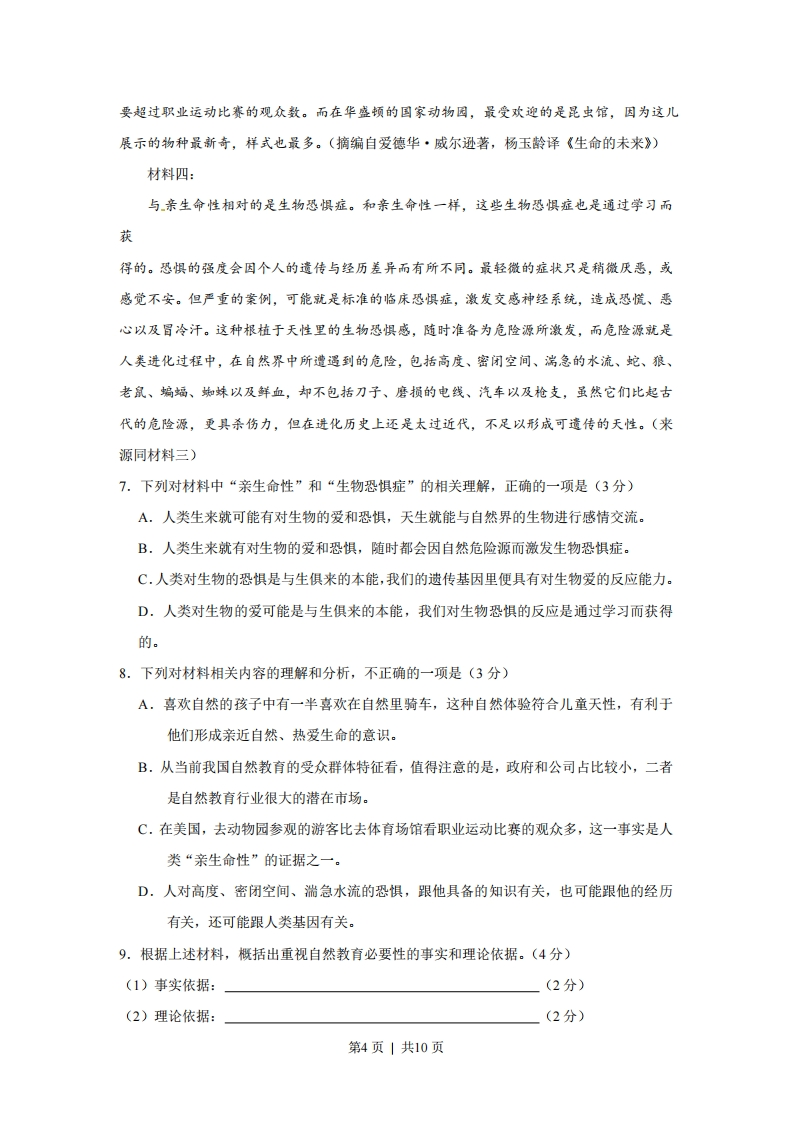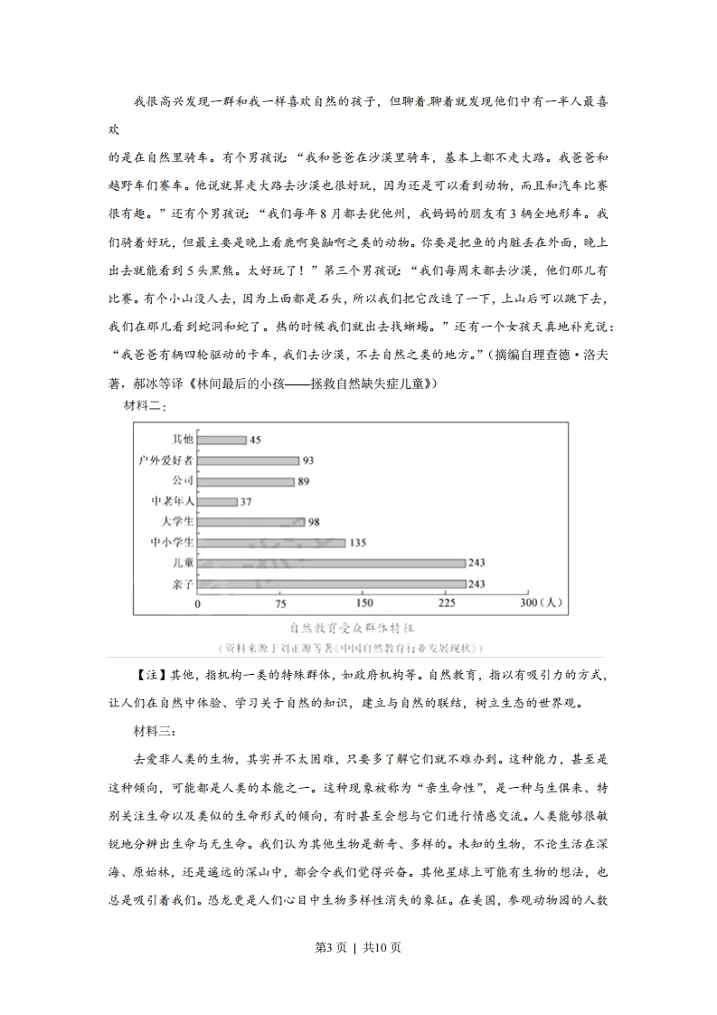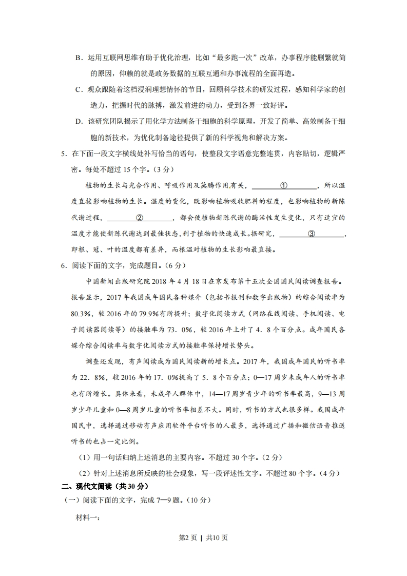 2018年普通高等学校招生全国统一考试(浙江卷)语文一、语言文字运用(共20分)1.下列各句中,没有错别字且加点字的注音全都正确的一项是(3分)A.从懵(měg)懂的幼儿到朝气蓬勃的少年,从踌躇满志的青年到成熟的中年,最后步入两鬓(bing)斑白的老年:有序变化是生命亘古不变的主题。B.虽然语言系统有自我净化能力,随着时间的推移,会分层过滤,淘尽渣滓(z),淬(cu)炼真金,但是当下网络语言带来的一些负面影响仍不容小觑。C.江上一个个漩涡,似乎在仰首倾听清晨雁鸣:那些雄堞(dié)、战车,均己废驰:鸟鸣声穿过山风烟霭,落满了山峦:遍野麦浪,渐成燎(1o)原之势。D,对于那些枉顾道德与法律铤而走险的电商平台,有关部门必须给子相应的惩(cheng)罚,否则难以制止种种薅(hao)顾客羊毛的恶劣行为.阅读下面的文字,完成2一3题。(5分)在第55届博洛尼亚国际儿童书展上,中国插画展现场的观众络绎不绝,显示出各界对中国插画现状与发展的关切。【甲】什么是插画?插画就是出版物中的插图:一本书如果以插画为主,以文字为辅,就被称为绘本,顾名思义就是画出来的书。一本优秀的绘本,可以让不认字的孩子“读”出其中蕴涵的深意。【乙]在各色画笔下,蝴蝶、花朵、叶子、大树等跃然纸上,孩子可以对色彩、实物进行认知学习。在学校里阅读的绘本,父母在家里也可以和孩子一起阅读。如此一来,孩子在幼儿园抑或在家里,都拥有一个语言互通的环境。【丙】“绘本在儿童早期教育中的作用已被越来越多的人认识,但绘本的发展还需加快步伐。”书展上多家出版社的负责人都持类似观点。当然,关于绘本创作者,需要观照的,不仅有儿童心灵成长的需求,还有成年读者的精神世界。2.文段中的加点词,运用不正确的一项是(3分)A.络绎不绝B.跃然纸上C.关于D.观照3.文段中画线的甲、乙、丙句,标点有误的一项是(2分)A.甲B.乙C.丙4.下列各句中,没有语病的一项是(3分)A.出版社除了将本身的品牌作为吸引受众的内容进行推广,利用直播、短视频等形式传播外,图书营销还有在社交平台做线上活动这个必选项。第1页|共10页B.运用互联网思维有助于优化治理,比如“最多跑一次”改革,办事程序能删繁就简的原因,仰赖的就是政务数据的互联互通和办事流程的全面再造。C.观众跟随着这档浸润理想情怀的节目,回顾科学技术的研发过程,感知科学家的创造力,把握时代的脉搏,激发前进的动力,受到各界一致好评。D.该研究团队揭示了用化学方法制备干细胞的科学原理,开发了简单、高效制备干细胞的新技术,为优化制备途径提供了新的科学视角和解决方案。5.在下面一段文字横线处补写恰当的语句,使整段文字语意完整连贯,内容贴切,逻辑严密。每处不超过15个字。(3分)植物的生长与光合作用、呼吸作用及蒸腾作用有关,①,所以温度直接影响植物的生长。温度的变化,既影响植物吸收肥料的程度,也影响植物的新陈代谢过程,②,都会使植物新陈代谢的酶活性发生变化,只有造宜的温度才能使新陈代谢达到最佳状态,利于植物的快速成长。据研究,③即根、冠、叶的温度都有差异,而根温对植物的生长影响最直接。6.阅读下面的文字,完成题目。(6分)中国新闻出版研究院2018年4月18日在京发布第十五次全国国民阅读调查报告。报告显示,2017年我国成年国民各种蝶介(包括书报刊和数字出版物)的综合阅读率为80.3%,较2016年的79.9%有所提升:数字化阅读方式(网络在线阅读、手机阅读、电子阅读器阅读等)的接触率为73.0%,较2016年上升了4.8个百分点。成年国民各蝶介综合阅读率与数字化阅读方式的接触率保持增长势头。调查还发现,有声阅读成为国民阅读新的增长点。2017年,我国成年国民的听书率为22.8%,较2016年的17.0%提高了5.8个百分点:0一17周岁未成年人的听书率也有所增长。具体来看,未成年人群体中,14一17周岁青少年的听书率最高,9一13周岁少年儿童和0一8周岁儿童的听书率相差不大。同时,听书的方式也很多样。我国成年国民中,选择通过移动有声应用软件平台听书的人最多,选择通过广播和微信语音推送听书的也占一定比例。(1)用一句话归纳上述消息的主要内容。不超过30个字。(2分)(2)针对上述消息所反映的社会现象,写一段评述性文字。不超过80个字。(4分)二、现代文阅读(共30分)(一)阅读下面的文字,完成7一9题。(10分)材料一:第2页|共10页我很高兴发现一群和我一样喜欢自然的孩子,但聊着聊着就发现他们中有一半人最喜欢的是在自然里骑车。有个男孩说:“我和爸爸在沙漠里骑车,基本上都不走大路。我爸爸和越野车们赛车。他说就算走大路去沙漠也很好玩,因为还是可以看到动物,而且和汽车比赛很有趣。”还有个男孩说:“我们每年8月都去犹他州,我妈妈的朋友有3辆全地形车。我们骑着好玩,但最主要是晚上看鹿啊臭鼬啊之类的动物。你要是把鱼的内脏丢在外面,晚上出去就能看到5头黑熊。太好玩了!”第三个男孩说:“我们每周末都去沙漠,他们那儿有比赛。有个小山没人去,因为上面都是石头,所以我们把它改造了一下,上山后可以跳下去,我们在那儿看到蛇洞和蛇了。热的时候我们就出去找蜥蜴。”还有一个女孩天真地补充说:“我爸爸有辆四轮驱动的卡车,我们去沙漠,不去自然之类的地方。”(摘编自理查德·洛夫著,郝冰等译《林间最后的小孩一拯救自然缺失症儿童》)材料二:其他☐45户外爱