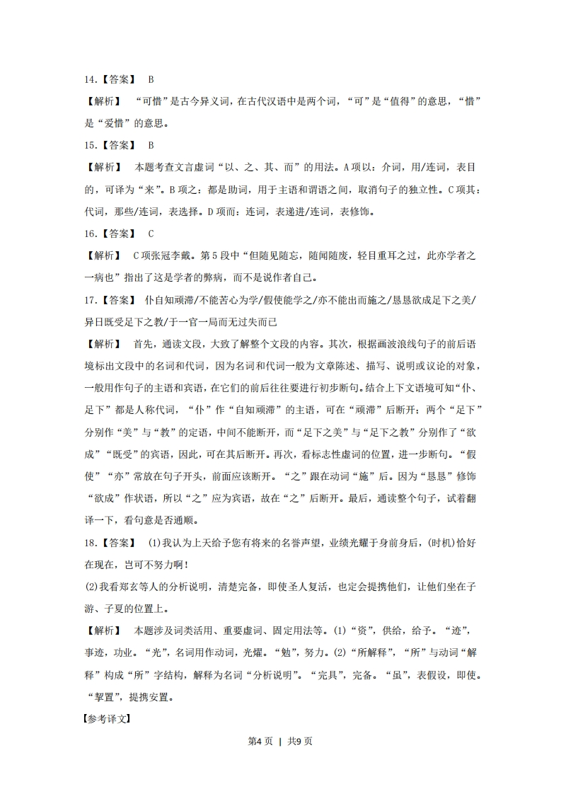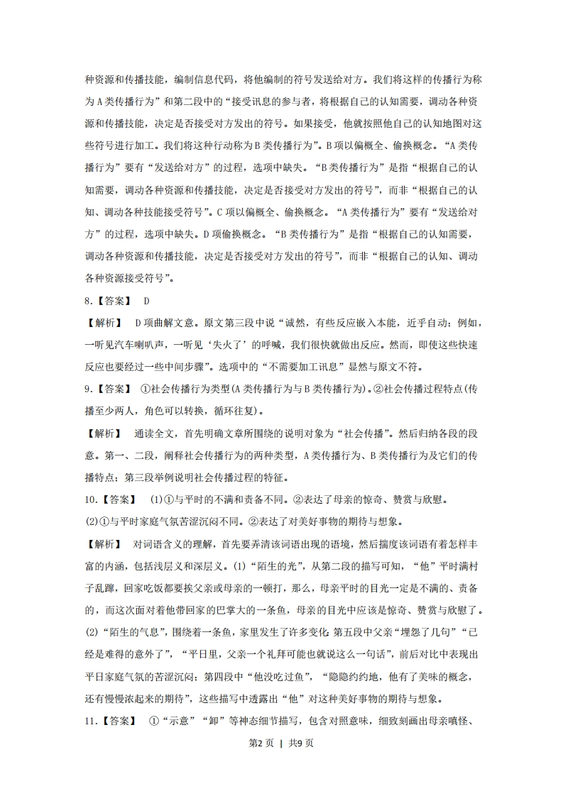 【参考答案】1.【答案】D【解析】A项“靡”读m1。B项密一秘。C项“禁”读jin,钉一订。2.【答案】B【解析】“付与”指交给、付给,使用对象多为钱、物、时光等。赋子:交给(重大任务、使命等),对象多是重大任务、命令、权利等名词性词语,语气庄重。与语境中“我们的使命”这一对象搭配的应是“赋子”。3.【答案】B【解析】本题考查顿号、逗号、引号等的使用。“想象与思考”和“理性与善良”属句内同一层次的并列短语,其间应使用顿号。4.【答案】C【解析】本题从搭配不当、不合逻辑、成分残缺等角度设误。A项搭配不当。“大型客机”与“标志性工程”不搭配。可在“大型客机”后加“的研制”。B项不合逻辑。“留学生吟诵社”不属于“朗诵爱好者”。可在“留学生吟诵社”后加“的成员”。D项成分残缺。“按照”后缺少宾语中心语。应在“生态乡”后加“的目标”。5.【答案】(示例)如果语言是生产工具,能够生产出物质资料,那么夸夸其谈的人就可以是百万富翁了。【解析】解答时首先要结合例句,明确归谬法的表述特点。即先摆出要反对的观点,假设其是正确的,然后进行推理,得出错误的结论。仿写时必须要符合例句的形式,采用以“如果…那么”为关联词语的假设复句的形式。6.【答案】(示例)沿着小路,他拾级而上。坐在十八级台阶上,四顾茫然,未来的路在哪里?成人仪式后,他的心空荡荡的,没了着落。月色溶溶,树影婆娑。他瞥见一排蚂蚊慢慢往上爬,俯下身,细细数着这些负重前行的“勇士”,久违的感奋漫过全身,他仿佛又回到了多梦的童年。【解析】此题从扩展语句的角度进行考查。首先要结合题干揣摩诗句的意境和人物的心理,或空寂,或清冷或落寞,或感奋。然后再展开想象,运用第三人称对诗句描绘的意境和人物心理进行添枝加叶的细致刻画,尽量突出人物心理的变化过程。描写时要灵活运用比喻、拟人等修辞手法,力求使句子表达形象生动。7.【答案】A【解析】本题对应的原文分别为第一段中的“参与者总是要根据自己的认知需要,调动各第1页1共9页种资源和传播技能,编制信息代码,将他编制的符号发送给对方。我们将这样的传播行为称为A类传播行为”和第二段中的“接受讯息的参与者,将根据自己的认知需要,调动各种资源和传播技能,决定是否接受对方发出的符号。如果接受,他就按照他自己的认知地图对这些符号进行加工。我们将这种行动称为B类传播行为”。B项以偏概全、偷换概念。“A类传播行为”要有“发送给对方”的过程,选项中缺失。“B类传播行为”是指“根据自己的认知需要,调动各种资源和传播技能,决定是否接受对方发出的符号”,而非“根据自己的认知、调动各种技能接受符号”。C项以偏概全、偷换概念。“A类传播行为”要有“发送给对方”的过程,选项中缺失。D项偷换概念。“B类传播行为”是指“根据自己的认知需要,调动各种资源和传播技能,决定是否接受对方发出的符号”,而非“根据自己的认知、调动各种资源接受符号”。8.【答案】D【解析】D项曲解文意。原文第三段中说“诚然,有些反应嵌入本能,近乎自动:例如,一听见汽车喇叭声,一听见‘失火了’的呼喊,我们很快就做出反应。然而,即使这些快速反应也要经过一些中间步骤”。选项中的“不需要加工讯息”显然与原文不符。9.【答案】①社会传播行为类型(A类传播行为与B类传播行为)。②社会传播过程特点(传播至少两人,角色可以转换,循环往复)。【解析】通读全文,首先明确文章所围绕的说明对象为“社会传播”。然后归纳各段的段意。第一、二段,阐释社会传播行为的两种类型,A类传播行为、B类传播行为及它们的传播特点:第三段举例说明社会传播过程的特征。10.【答案】(1)①与平时的不满和责备不同。②表达了母亲的惊奇、赞赏与欣慰.(2)①与平时家庭气氛苦涩沉闷不同。②表达了对美好事物的期待与想象。【解析】对词语含义的理解,首先要弄清该词语出现的语境,然后揣度该词语有着怎样丰富的内涵,包括浅层义和深层义。(1)“陌生的光”,从第二段的描写可知,“他”平时满村子乱蹿,回家吃饭都要挨父亲或母亲的一顿打,那么,母亲平时的目光一定是不满的、责备的,而这次面对着他带回家的巴掌大的一条鱼,母亲的目光中应该是惊奇、赞赏与欣慰了。(2)“陌生的气息”,围绕着一条鱼,家里发生了许多变化第五段中父亲“埋怨了几句”“己经是难得的意外了”,“平日里,父亲一个礼拜可能也就说这么一句话”,前后对比中表现出平日家庭气氛的苦涩沉闷:第四段中“他没吃过鱼”,“隐隐约约地,他有了美味的概念,还有慢慢浓起米的期待”,这些描写中透露出“他”对这种美好事物的期待与想象。11.【答案】①“示意”“卸”等神态细节描写,包含对照意味,细致刻画出母亲嗔怪、第2页1共9页不安、沉重等微妙的心理变化。②“出神”两次出现,强调了母亲沉浸在茫然、忧心和无奈的心理状态中。③“黑糊糊的夜空”,是实景的描写,也是母亲心境的形象写照一一为未来生活负担加重而忧虑,因儿子不能均享读书机会而愧疚。【解析】画线句子着重刻画了母亲面对儿子们的反应时的动作和心理。面对家庭的困窘,母亲忧心而无奈,“示意”表现了母亲对父亲口不择言的埋怨,“卸”字表现出母亲经过短暂喜