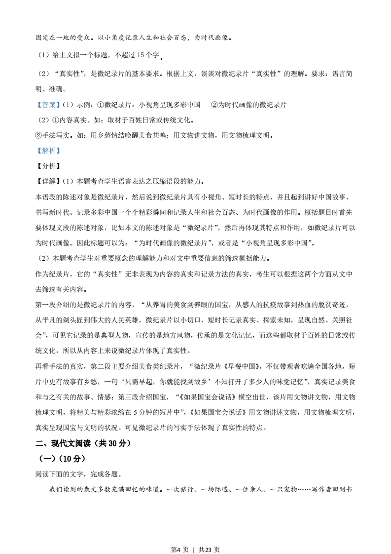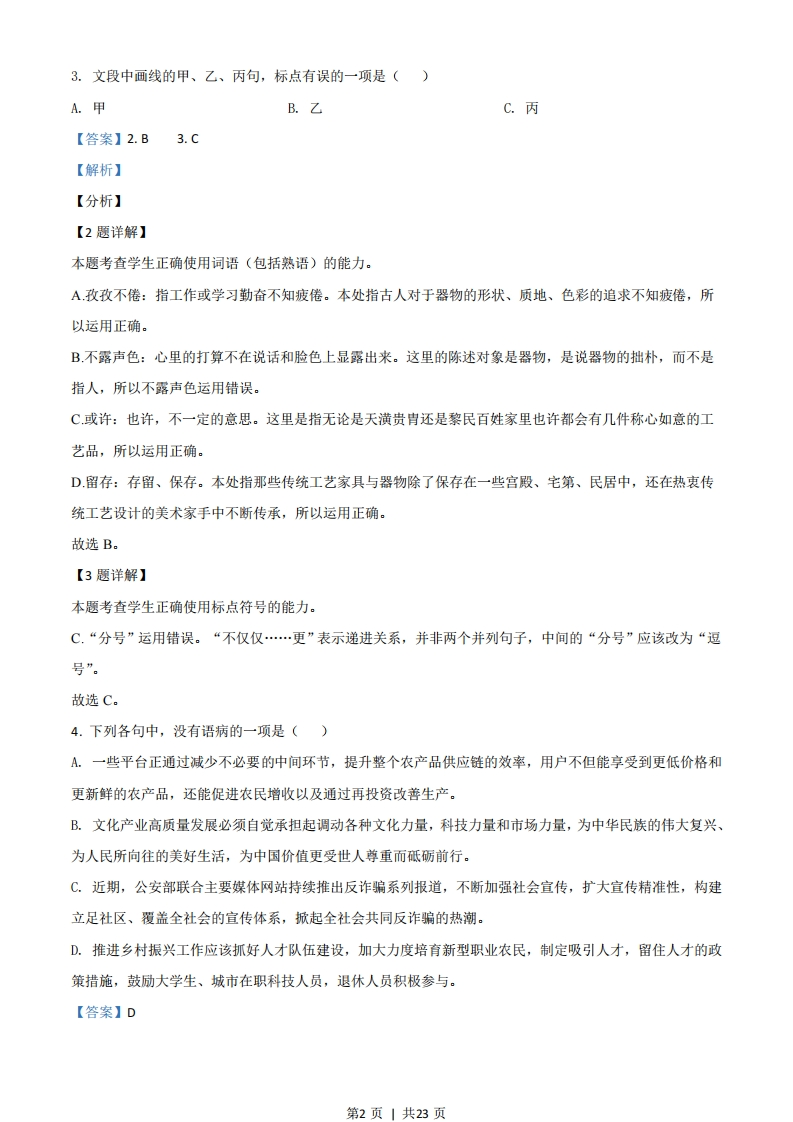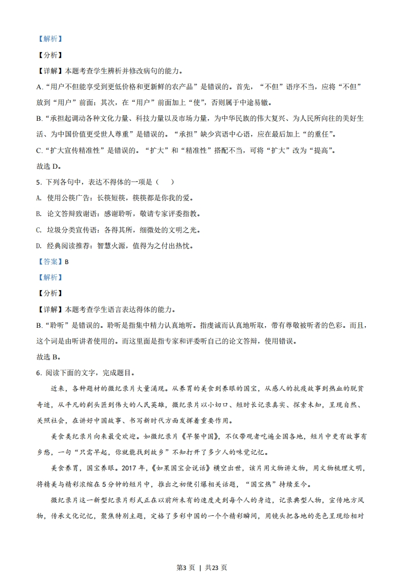 2021浙江高考语文真题及参考答案语文试题一、语言文字运用(共20分)1.下列各句中,没有错别字且加点字的注音全都正确的一项是()A.各种春菜在田间地垄悄然探出头,娇弱的身子轻轻摇曳(y),而稚嫩的豌豆尖更是惹人喜爱,叶子清澈通透如翡翠薄片,茎上嫩须迎风轻颤(chan),引逗着人们去采撷。B.创新型国家建设不是一蹴(c心)而就的,需要科技工作者心无旁骛,摒(big)弃拜金主义,以甘为人梯,奖掖后学的精神,帮助青少年成为科学研究和技术攻坚的人才。C.《典籍里的中国》用追根溯源、旁证博引的方式驰骋(chěng)上下五千年,从文明的起源讲到现代传承,让观众眼界大开,堪称当下文化节目的扛(gang)鼎之作。D.那些或坐落于安静的小镇古街、或藏身在喧嚣的商业密林的个性实体书店,在充满竞争的时代执拗(iù)生长,规模不大却洋溢着审美情趣,足以让灵魂片刻栖(q)身。【答案】D【解析】【分析】【详解】本题考查学生识记现代汉语常用字字音、字形的能力。A.“摇曳”的“曳”读音错误,应为“y心”:B.“摒弃”的“摒”读音错误,应为“bing”:C.“旁证博引”的“证”字形错误,应为“征”。故选D。阅读下面的文字,完成下面小题。【甲】中国传统工艺设计注重“材美”“工巧”“器雅”,古人对于器物的形状、质地、色彩的追求可谓孜孜不倦。一件器物,可以拙朴到浑然天成,不露声色,也可以繁复,精美到无以复加。【乙】“过去的生活,一切都很慢”,因此无论是天潢贵胄,还是黎民百姓,家里或许都会有几件称心如意的工艺品,点缀他们的“慢生活”。在经济高速发展的今天,那些与生活息息相关、具有温度的传统工艺家具与器物,除了留存在一些宫殿、宅第、民居中,还在热衷传统工艺设计的美术家手中不断传承。【西】家具、器物、雅玩里不仅仅蕴藏着中国传统工艺源远流长且不断革新的丰富技法:更折射出中国人对幸福生活的皮诚态度。2.文段中的加点词语,运用不正确的一项是()A.孜孜不倦B.不露声色C.或许D.留存第1页1共23页3.文段中画线的甲、乙、丙句,标点有误的一项是()A.甲B.乙C.丙【答案】2.B3.C【解析】【分析】【2题详解】本题考查学生正确使用词语(包括熟语)的能力。A孜孜不倦:指工作或学习勤奋不知疲倦。本处指古人对于器物的形状、质地、色彩的追求不知疲倦,所以运用正确。B.不露声色:心里的打算不在说话和脸色上显露出来。这里的陈述对象是器物,是说器物的拙朴,而不是指人,所以不露声色运用错误。C或许:也许,不一定的意思。这里是指无论是天潢贵胄还是黎民百姓家里也许都会有几件称心如意的工艺品,所以运用正确。D.留存:存留、保存。本处指那些传统工艺家具与器物除了保存在一些宫殿、宅第、民居中,还在热衷传统工艺设计的美术家手中不断传承,所以运用正确。故选B。【3题详解】本题考查学生正确使用标点符号的能力。C.“分号”运用错误。“不仅仅…更”表示递进关系,并非两个并列句子,中间的“分号”应该改为“逗号”。故选C。4.下列各句中,没有语病的一项是()A.一些平台正通过减少不必要的中间环节,提升整个农产品供应链的效率,用户不但能享受到更低价格和更新鲜的农产品,还能促进农民增收以及通过再投资改善生产。B.文化产业高质量发展必须自觉承担起调动各种文化力量,科技力量和市场力量,为中华民族的伟大复兴、为人民所向往的美好生活,为中国价值更受世人尊重而砥砺前行。C.近期,公安部联合主要媒体网站持续推出反诈骗系列报道,不断加强社会宣传,扩大宣传精准性,构建立足社区、覆盖全社会的宣传体系,掀起全社会共同反诈骗的热潮。D.推进乡村振兴工作应该抓好人才队伍建设,加大力度培育新型职业农民,制定吸引人才,留住人才的政策措施,鼓励大学生、城市在职科技人员,退休人员积极参与。【答案】D第2页1共23页【解析】【分析】【详解】本题考查学生辨析并修改病句的能力。A.“用户不但能享受到更低价格和更新鲜的农产品”是错误的。首先,“不但”语序不当,应将“不但”放到“用户”前面:其次,在“用户”前面加上“使”,否则属于中途易辙。B.“承担起调动各种文化力量、科技力量以及市场力量,为中华民族的伟大复兴、为人民所向往的美好生活、为中国价值更受世人尊重”是错误的。“承担”缺少宾语中心语,应在最后加上“的重任”。C.“扩大宣传精准性”是错误的。“扩大”和“精准性”搭配不当,可将“扩大”改为“提高”。故选D。5.下列各句中,表达不得体的一项是()A.使用公筷广告:长筷短筷,筷筷都是你我的爱。B.论文答辩致谢语:感谢聆听,敬请专家评委指教。C.垃圾分类宣传语:各得其所,细微处的文明之光。D.经典阅读推荐:智慧火源,值得为之付出热忱。【答案】B【解析】【分析】【详解】本题考查学生语言表达得体的能力。B.“聆听”是错误的。聆听是指集中精力认真地听。指虔诚而认真地听取,带有尊敬被听者的色彩。而且,这个词是由听讲者使用的。而这里面是指专家和评委听自己的论文答辩,使用错误。故选B。6.阅读下面的文字,完成题目。近来,各种题材的微纪录片大量浦现。从养胃的美食到养眼的国宝,从感人的抗疫故事到热血的脱贫奇迹,从平凡的制头匠到伟大的人民英雄,微纪录片以小切口、短时长记录真实、探索未知,呈现自然、关照社会,在