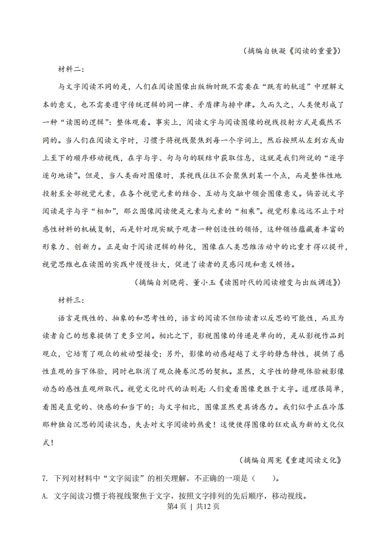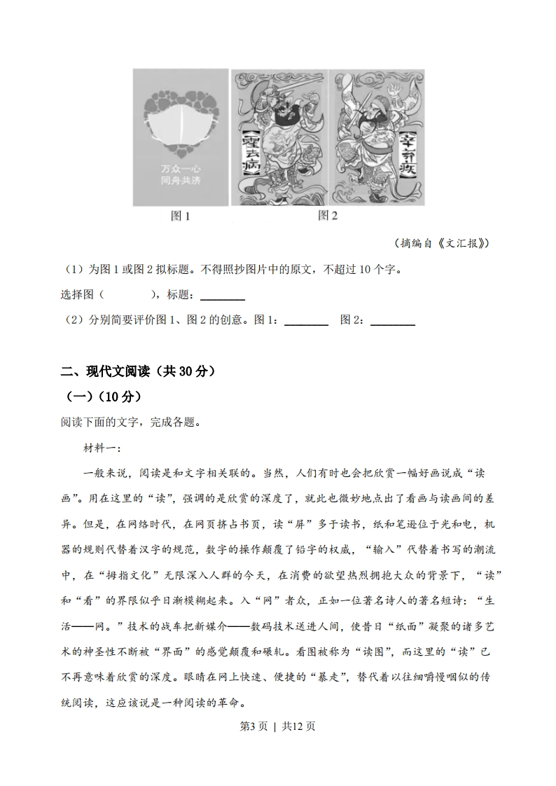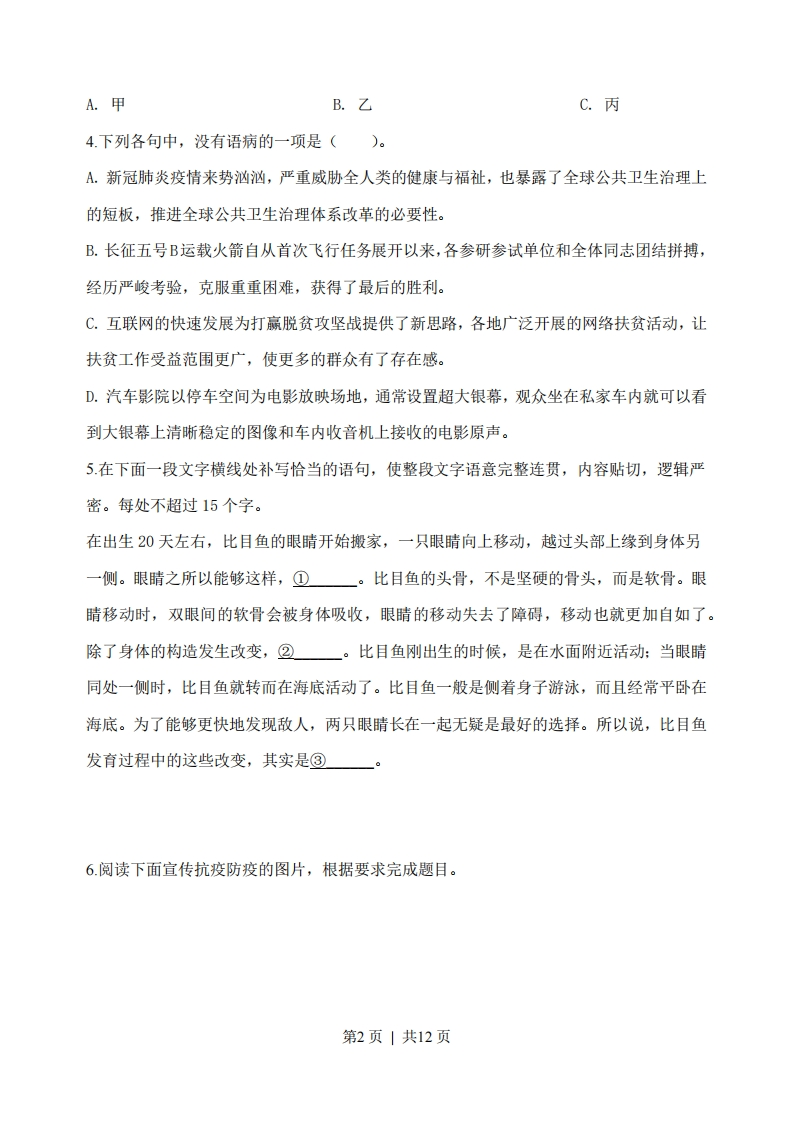 浙江省2020年高考语文试题一、语言文字运用(共20分)1.下列各句中,没有错别字且加点字的注音全都正确的一项是()。A.浙江诗路文化带以诗词文化为主线,结合水系古道,将各地旖(y)旎风光串联成富有诗情画意的山水旅游线路,让游客徜(tng)徉在江南美景中。B.历经千年沧桑,觥(gong)筹交错的场面早已湮(yan)没于历史深处,但留存至今的一件件青铜器足以让人们浮想联篇,去回味那个钟鸣鼎食的时代。C.生态文学应更多创作体现绿色发展理念讴(ōu)歌美好生活的作品,致力于鞭挞(dá)滥杀野生动物、肆意破坏环境的恶劣行为,提高全社会的生态文明素养。D.北方的季节泾(Gjg)渭分明,春季的风一寸寸吹向大地,为山川褪去寒衣,一点点着(zhuo)上春色,东风过处,整个原野为之一振,草木葳蕤,生机勃勃。阅读下面的文字,完成各题。屏幕中的剧情风生水起,扣人心弦。屏幕上方一行又一行的字符络绎不绝,争先恐后。某些字符甚至悬浮于屏幕中央,仿佛不忍退场。【甲】“弹幕”是这些字符获得的形象称谓一那些字符如同密集射击的炮弹在夜空展开了眼花缭乱的一幕。弹幕通常是对屏幕中剧情的即时评论,短小精悍。【乙】评论内容五花八门,常拜、感叹、剧透、调侃、吐槽,也包含了“前方高能反应”“美爆了”“劝你善良”…等弹幕文化的常用语。【丙】弹幕文化显示出既丰富又单调的双重特征:一方面群情踊跃,图文并茂:另二方面彼此重复,似曾相识。不必否认弹幕文化的狂欢气氛,若千小创意甚至让人耳目一新。然而,也不必否认众声喧哗主要不是来自思想的真正激荡,是来自互联网新型文化套餐的事先设计。2.文段中的加点词语,运用不正确的一项是()。A.风生水起B.短小精悍C.然而D.激荡3.文段中画线的甲、乙、丙句,标点有误的一项是()。第1页共12页A.甲B.乙C.丙4.下列各句中,没有语病的一项是()。A.新冠肺炎疫情来势汹汹,严重威胁全人类的健康与福祉,也暴露了全球公共卫生治理上的短板,推进全球公共卫生治理体系改革的必要性。B.长征五号B运载火箭自从首次飞行任务展开以来,各参研参试单位和全体同志团结拼搏,经历严峻考验,克服重重困难,获得了最后的胜利。C.互联网的快速发展为打赢脱贫攻坚战提供了新思路,各地广泛开展的网络扶贫活动,让扶贫工作受益范围更广,使更多的群众有了存在感。D.汽车影院以停车空间为电影放映场地,通常设置超大银幕,观众坐在私家车内就可以看到大银幕上清晰稳定的图像和车内收音机上接收的电影原声。5.在下面一段文字横线处补写恰当的语句,使整段文字语意完整连贯,内容贴切,逻辑严密。每处不超过15个字。在出生20天左右,比目鱼的眼睛开始搬家,一只眼睛向上移动,越过头部上缘到身体另一侧。眼睛之所以能够这样,①。比目鱼的头骨,不是坚硬的骨头,而是软骨。眼睛移动时,双眼间的软骨会被身体吸收,眼睛的移动失去了障碍,移动也就更加自如了。除了身体的构造发生改变,②。比目鱼刚出生的时候,是在水面附近活动:当眼睛同处一侧时,比目鱼就转而在海底活动了。比目鱼一般是侧着身子游泳,而且经常平卧在海底。为了能够更快地发现敌人,两只眼睛长在一起无疑是最好的选择。所以说,比目鱼发育过程中的这些改变,其实是③6.阅读下面宣传抗疫防疫的图片,根据要求完成题目。第2页|共12页万众一心同舟共济图1图2(摘编自《文汇报》)(1)为图1或图2拟标题。不得照抄图片中的原文,不超过10个字。选择图(),标题:(2)分别简要评价图1、图2的创意。图1:图2:二、现代文阅读(共30分)(一)(10分)阅读下面的文字,完成各题。材料一:一般来说,阅读是和文字相关联的。当然,人们有时也会把欣赏一幅好画说成“读画”。用在这里的“读”,强调的是欣赏的深度了,就此也微妙地点出了看画与读画间的差异。但是,在网络时代,在网页挤占书页,读“屏”多于读书,纸和笔逊位于光和电,机器的规则代替着汉字的规范,数字的操作颠覆了铅字的权威,“输入”代替着书写的潮流中,在“拇指文化”无限深入人群的今天,在消费的欲望热烈拥抱大众的背景下,“读”和“看”的界限似乎日渐模糊起来。入“网”者众,正如一位著名诗人的著名短诗:“生活一网。”技术的战车把新媒介一数码技术送进人间,使昔日“纸面”凝聚的诸多艺术的神圣性不断被“界面”的感觉颠覆和碾轧。看图被称为“读图”,而这里的“读”已不再意味着欣赏的深度。眼睛在网上快速、便捷的“暴走”,替代着以往细嚼慢咽似的传统阅读,这应该说是一种阅读的革命。第3页|共12页