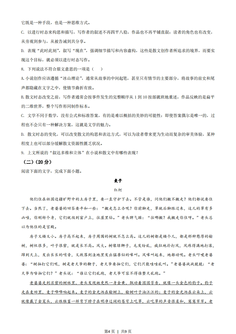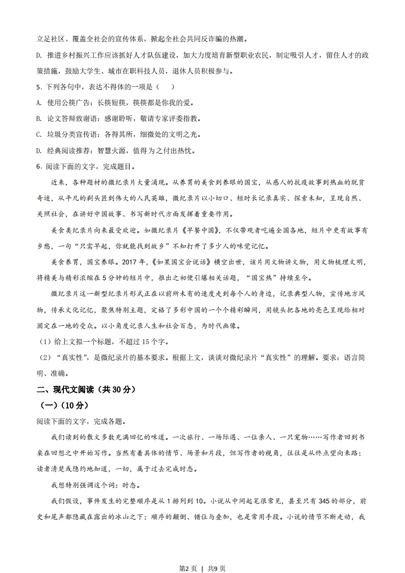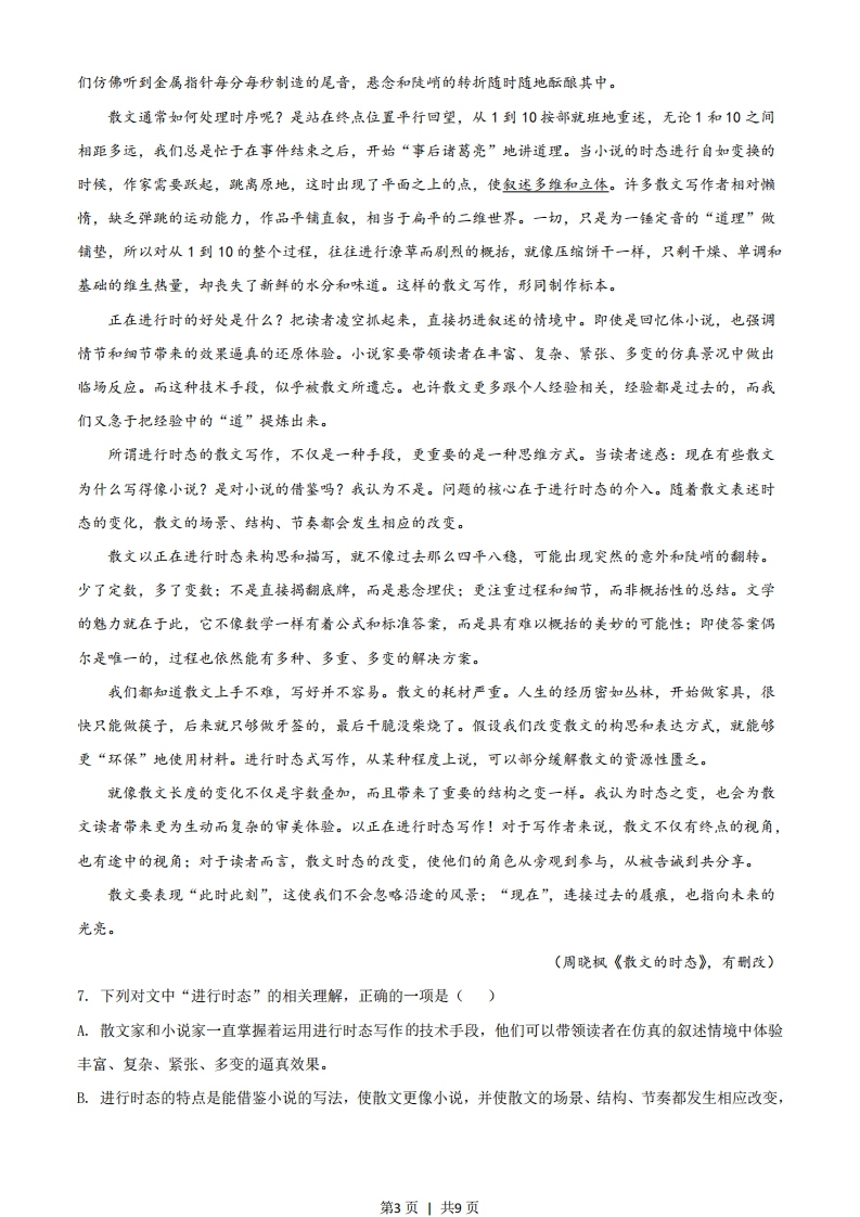 2021浙江高考语文真题及参考答案语文试题一、语言文字运用(共20分)1.下列各句中,没有错别字且加点字的注音全都正确的一项是()A.各种春菜在田间地垄悄然探出头,娇弱的身子轻轻摇曳(y),而稚嫩的豌豆尖更是惹人喜爱,叶子清澈通透如翡翠薄片,茎上嫩须迎风轻颤(chàn),引逗着人们去采撷:B.创新型国家建设不是一蹴(c心)而就的,需要科技工作者心无旁骛,摒(big)弃拜金主义,以甘为人梯,奖掖后学的精神,帮助青少年成为科学研究和技术攻坚的人才。C.《典籍里的中国》用追根溯源、旁证博引的方式驰骋(chěng)上下五千年,从文明的起源讲到现代传承,让观众眼界大开,堪称当下文化节目的扛(gang)鼎之作。D.那些或坐落于安静的小镇古街、或藏身在喧嚣的商业密林的个性实体书店,在充满竞争的时代执拗(iù)生长,规模不大却洋溢着审美情趣,足以让灵魂片刻栖(q)身。阅读下面的文字,完成下面小题。【甲】中国传统工艺设计注重“材美”“工巧”“器雅”、古人对于器物的形状、质地、色彩的追求可诅孜孜不倦。一件器物,可以拙朴到浑然天成,不露声色,也可以繁复,精美到无以复加。【乙】“过去的生活,一切都很慢”,因此无论是天潢贵胄,还是黎民百姓,家里或许都会有几件称心如意的工艺品,点毁他们的“慢生活”。在经济高速发展的今天,那些与生活息息相关、具有温度的传统工艺家具与器物,除了留存在一些宫殿、宅第、民居中,还在热衷传统工艺设计的美术家手中不断传承。【丙】家具、器物、雅玩里不仅仅蕴藏着中国传统工艺源远流长且不断革新的丰富技法:更折射出中国人对幸福生活的废诚态度。2.文段中的加点词语,运用不正确的一项是()A.孜孜不倦B.不露声色C.或许D.留存3.文段中画线的甲、乙、丙句,标点有误的一项是()A.甲B.乙C.丙4.下列各句中,没有语病的一项是()A.一些平台正通过减少不必要的中间环节,提升整个农产品供应链的效率,用户不但能享受到更低价格和更新鲜的农产品,还能促进农民增收以及通过再投资改善生产。B.文化产业高质量发展必须自觉承担起调动各种文化力量,科技力量和市场力量,为中华民族的伟大复兴、为人民所向往的美好生活,为中国价值更受世人尊重而砥砺前行。C.近期,公安部联合主要媒体网站持续推出反诈骗系列报道,不新加强社会宣传,扩大宣传精准性,构建第1页1共9页立足社区、覆盖全社会的宣传体系,掀起全社会共同反诈骗的热潮。D.推进乡村振兴工作应该抓好人才队伍建设,加大力度培育新型职业农民,制定吸引人才,留住人才的政策措施,鼓励大学生、城市在职科技人员,退休人员积极参与。5.下列各句中,表达不得体的一项是()A.使用公筷广告:长筷短筷,筷筷都是你我的爱。B.论文答辩致谢语:感谢聆听,敬请专家评委指教。C.垃圾分类宣传语:各得其所,细微处的文明之光.D.经典阅读推荐:智慧火源,值得为之付出热忱。6.阅读下面的文字,完成题目。近来,各种题材的微纪录片大量涌现。从养胃的美食到养眼的国宝,从感人的抗疫故事到热血的脱贫奇迹,从平凡的制头匠到伟大的人民英雄,微纪录片以小切口、短时长记录真实、探索未知,呈现自然、关照社会,在讲好中国故事、书写新时代方面发挥着重要作用。美食类纪录片向来最受欢迎。如微纪录片《早餐中国》,不仅带观者吃遍全国各地,短片中更有故事有乡愁,一句“只需早起,你就能找到故乡”不知打开了多少人的味觉记忆。美食养胃,国宝养眼。2017年,《如果国宝会说话》横空出世,该片用文物讲文物,用文物梳理文明,将精美与精彩浓缩在5分钟的短片中,推出之初便引爆相关话题,“国宝热”持续至今。微纪录片这一新型纪录片形式正在以前所未有的速度走到每个人的身边,记录典型人物,宣传地方风物,传承文化记忆,聚焦特别主题,定格了多彩中国的一个个精彩瞬间,用镜头把各地的亮色呈现给相对固定在一地的受众。以小角度记录人生和社会百态,为时代画像。(1)给上文拟一个标题,不超过15个字。(2)“真实性”,是微纪录片的基本要求。根据上文,谈谈对微纪录片“真实性”的理解。要求:语言简明、准确。二、现代文阅读(共30分)(一)(10分)阅读下面的文字,完成各题。我们读到的散文多数充满回忆的味道。一次旅行、一场际遥、一位亲人、一只宠物…写作者回到书桌在回想之中开始写作。当然有着具体的情节、场景和片段,但写作者的视角,往往是从终点望向来路:读者清楚或隐约地知道,一切,属于过去完成时态。我想特别强调这个词:时态。我们假设,事件发生的完整顺序是从1排列到10。小说从中间起笔很常见,甚至只有345的部分,前史和尾声都隐藏在露出的冰山之下:顺序的颠倒、错位与叠加,也是常用手段。小说的情节不断走动,我第2页1共9页们仿佛听到金属指针每分每秒制造的尾音,悬念和陡峭的转折随时随地酝酿其中。散文通常如何处理时序呢?是站在终,点位置平行回望,从1到10按部就班地重述,无论1和10之间相距多远,我们总是忙于在事件结束之后,开始“事后诸葛亮”地讲道理。当小说的时态进行自如变换的时候,作家需要跃起,跳离原地,这时出现了平面之上的点,使叙述多维和立体。许多散文写作者相对懒惰,缺乏弹跳的运动能力,作品平铺直叙,相当于扁平的二维世界。一切,只是为一经定音的“道理”做镭垫,所以对从1到10的整个过程,往往