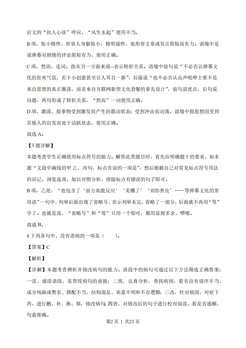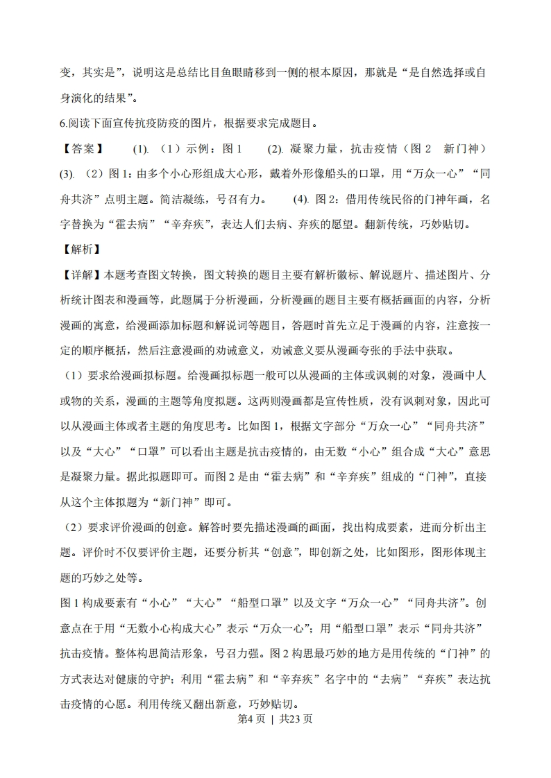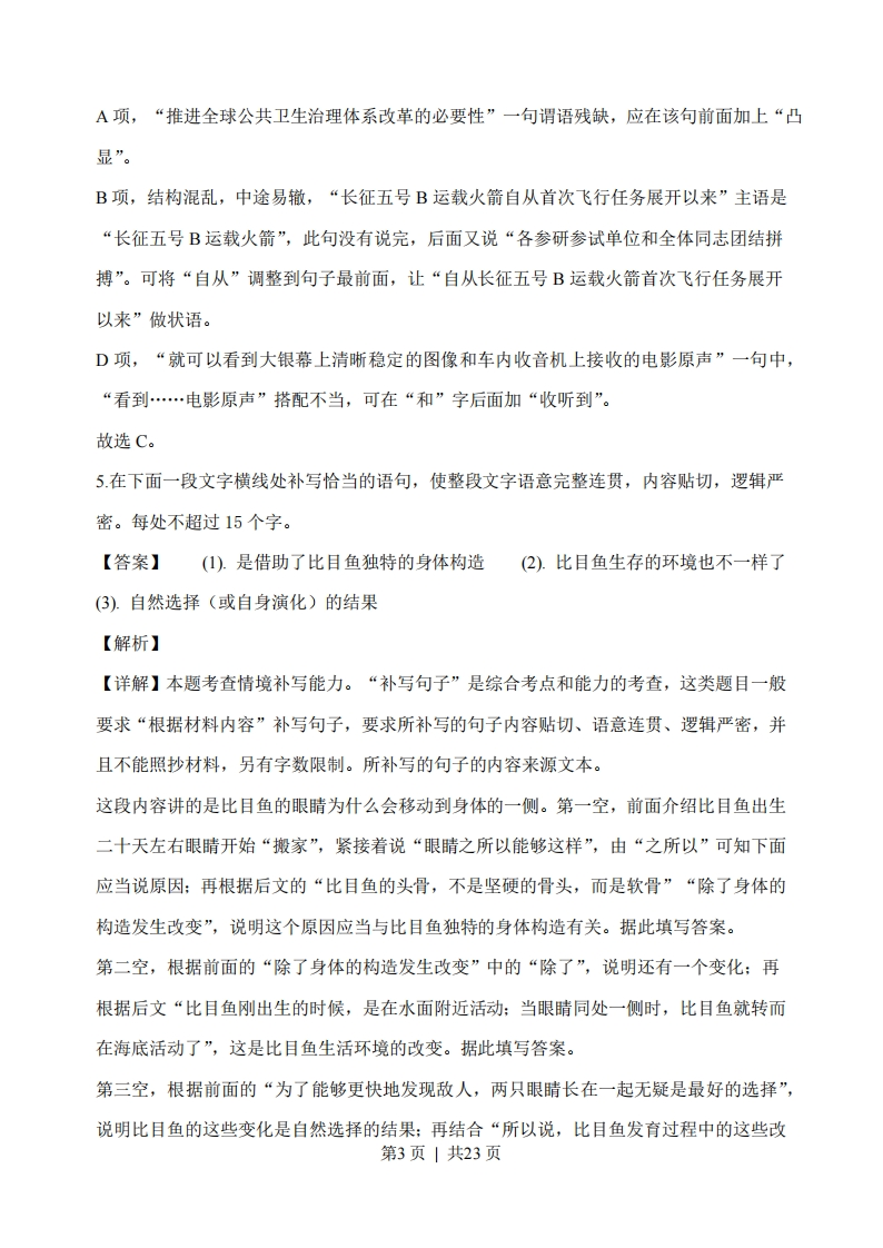 浙江省2020年高考语文试题一、语言文字运用(共20分)1.下列各句中,没有错别字且加点字的注音全都正确的一项是()。【答案】D【解析】【详解】本题考查考生识记现代汉语字音、字形的能力。此类试题解答时,字音重点考核多音字、形声字、形似字、音近字、方言、生僻字等,多音字注意据义定音,要找规律,结合词义、词性、运用场合等记忆。辨析字形当然要从字音和字义上下功夫。形近字虽然字形相近,但却有细微的区别,这细微处就是辨析的关键。A项,“徜(tang)徉”读音错,应为“chang”。徜徉,1.犹徘徊,盘旋往返。2.犹彷徨,心神不宁貌。3.安闲自得貌。B项,“浮想联篇”字形错,应为“浮想联翩”。浮想联翩,联翩:鸟飞的样子,比喻连续不断。指许许多多的想象不断涌现出来。C项,“鞭挞(da)”读音错,应为“ta”。鞭挞,原指鞭打,现多形容无情地指责披露。故选D。阅读下面的文字,完成各题。【答案】2.A3.B【解析】【2题详解】本题考核正确使用词语的能力。此类试题答题时,首先明确词语的意思,然后结合语境辨析正误。这类题要从三个方面综合考虑分析,即词语的基本义、感情色彩和语境意义。需要注意色彩不明、断词取义、对象误用、谦敬错位、功能混乱、不合语境、望文生义等错误使用类型。A项,风生水起,形容事情做得有生气,蓬勃兴旺。比喻事情做得特别好,一定时间里发展特别快,迅速壮大起来。语境中是说屏幕中的剧情,应当用“跌宕起伏”,这样也能与第1页|共23页后文的“扣人心弦”呼应。“风生水起”使用不当。B项,短小精悍,形容人身躯短小,精明强悍,也形容文章或发言简短而有力。语境中是说弹幕对剧情的评论简短有力,使用正确。C项,然而,连词。指从另一方面来说-表示转折关系。语境中前句说“不必否认弹幕文化的狂欢气氛,若干小创意甚至让人耳目一新”,后面说“也不必否认众声喧哗主要不是来自思想的真正激荡,而是來自互联网新型文化套餐的事先设计”,前句说优点,后句说问题,两句形成了转折关系,“然而”一词使用正确。D项,激荡,指事物受到激发而产生的震动状态:受到冲击而动荡。语境中指思想因受到其他人的启发而处于活跃状态,使用正确。故选A。【3题详解】本题考查学生正确使用标点符号的能力。解答此类题目时,首先应明确题干的要求,如本题“文段中画线的甲.乙、丙句,标点有误的一项是”,然后根据自己对常见标点符号用法的识记,浏览选项,加以对照分析,排除标点有错误的句子即可。B项,乙处,“也包含了‘前方高能反应’‘美爆了’‘劝你善良’…等弹幕文化的常用语”一句中,列举后面出现了省略号,表示列举未完,省略了一部分,后面就不再用“等”字了。也就是说,“省略号”和“等”只用一个即可,都用显得多余、啰嗦。故选B。4.下列各句中,没有语病的一项是()。【答案】C【解析】【详解】本题考查辨析并修改病句的能力。语段中的病句可通过以下方法筛选正确答案:一读,通读语段,是查找病句的前提;二找,认真分析,查找病因,看有没有语序不当、成分残缺或赘余、搭配不当、结构混乱、表意不明和不合逻辑:三改,针对病因,对症下药,进行删、补、换、移,修改病句四查,对修改后的句子进行校对阅读,看是否通顺、句意准确。第2页|共23页A项,“推进全球公共卫生治理体系改革的必要性”一句谓语残缺,应在该句前面加上“凸显”。B项,结构混乱,中途易辙,“长征五号B运载火箭自从首次飞行任务展开以来”主语是“长征五号B运载火箭”,此句没有说完,后面又说“各参研参试单位和全体同志团结拼搏”。可将“自从”调整到句子最前面,让“自从长征五号B运载火箭首次飞行任务展开以来”做状语。D项,“就可以看到大银幕上清晰稳定的图像和车内收音机上接收的电影原声”一句中,“看到…电影原声”搭配不当,可在“和”字后面加“收听到”。故选C。5.在下面一段文字横线处补写恰当的语句,使整段文字语意完整连贯,内容贴切,逻辑严密。每处不超过15个字。【答案】(1).是借助了比目鱼独特的身体构造(2).比目鱼生存的环境也不一样了(3).自然选择(或自身演化)的结果【解析】【详解】本题考查情境补写能力。“补写句子”是综合考点和能力的考查,这类题目一般要求“根据材料内容”补写句子,要求所补写的句子内容贴切、语意连贯、逻辑严密,并且不能照抄材料,另有字数限制。所补写的句子的内容来源文本。这段内容讲的是比目鱼的眼睛为什么会移动到身体的一侧。第一空,前面介绍比目鱼出生二十天左右眼睛开始“搬家”,紧接着说“眼睛之所以能够这样”,由“之所以”可知下面应当说原因:再根据后文的“比目鱼的头骨,不是坚硬的骨头,而是软骨”“除了身体的构造发生改变”,说明这个原因应当与比目鱼独特的身体构造有关。据此填写答案。第二空,根据前面的“除了身体的构造发生改变”中的“除了”,说明还有一个变化:再根据后文“比目鱼刚出生的时候,是在水面附近活动:当眼睛同处一侧时,比目鱼就转而在海底活动了”,这是比目鱼生活环境的改变。据此填写答案。第三空,根据前面的“为了能够更快地发现敌人,两只眼睛长在一起无疑是最好的选择”,说明比目鱼的这些变化是自然选择的结果:再结合“所以说,比目鱼发育过程中的这些改第3页|共23页