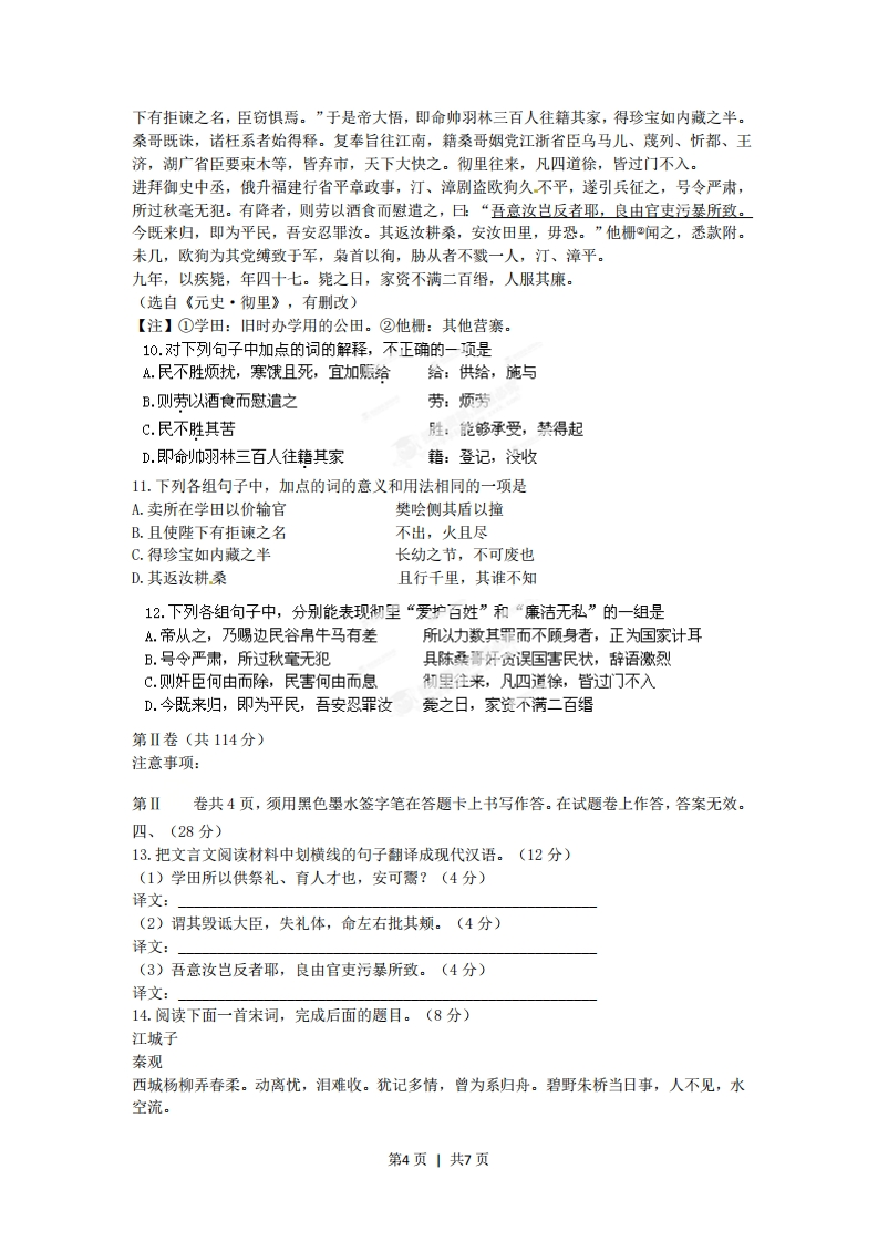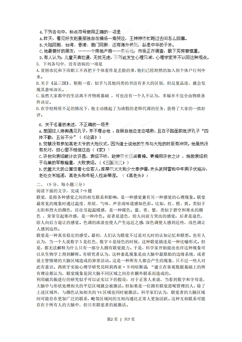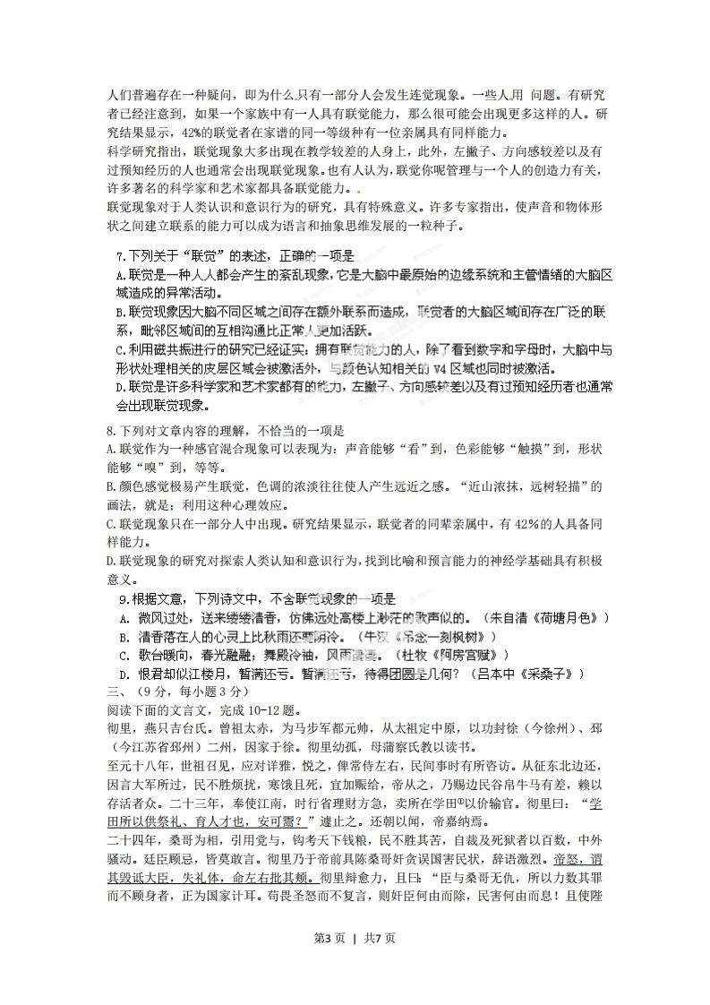 【试题总体说明】这套试题涵盖了新课标高考的基本题型,较好地体现了新课程理念。语基部分难度不大,注重了名著导读的综合考查:小阅读与去年高考题难度相当,第9小题设计新颖,既考阅读技巧,又考人文积累:古诗文难易适度,设题紧扣教材基本篇目,熟悉教材的考生容易得分,现代文大阅读考查了外国小说的欣赏,设题全面,探究题与文本结合较紧,重视从不同角度和层面发掘文学形象的深层意蕴和时代精神,作文是矛盾型的草根名言类材料作文,思辨性较强,能引导学生关现实,关照自我,反思社会,开放中有限制,辨析中见思想,要真正写好它并不容易。2012普通高等学校招生全国统一考试(江西卷)语文(学生版)本试卷分第I卷(选择题)和第II卷两部分。第一卷1至4页,第II卷5至8页,共150分。考生注意:1.答题前,考试务必将自己的准考证号、姓名填写在答题卡上。考生要认真核对答题卡上粘贴的条形码的“准考证号、姓名、考试科目”与考生本人准考证号、姓名是否一致。2.第I卷每小题选出答案后,用2B铅笔把答题卡上对应题目的答案标号涂黑,如需改动,用橡皮擦干净后,再选涂其他答案标号。第II卷用黑色墨水签字笔在答题卡书写作答。在试题卷作答,答案无效。3.考试结束,监考员将试题卷、答题卡一并收回。第I卷(选择题共36分)本卷共12小题,每小题3分,共36分。在每小题给出的四个选项中,只有一个符合题目要求。一、(18分,每小题3分)1.下列词语中,加点的字读音全都正确的一组是A.谥(shi)号提(d)防花蕊(ru1)敌(cha)血为盟B.熟稔(rěn)青荇(xing)中(zhong)肯锱(21)铢必较C.整饬(chi)优渥(wò)·尺牍(dǘ)无色无臭(xiù)D.监(jian)生执拗(niù)觊(ji)觎子(jié)然一身2.下列词语中,没有错别字的一组是A.家具赝品气概水乳交融B.菱靡帐篷更叠暴珍天物C.国粹输赢蛰伏旁证博引D.惭怍诟病九洲呕心沥血3.下列各句中,加点的词语使用恰当的一项是A.汶川县某领导在灾后重建工作总结会上,如数家珍般介绍了当地连年发生的较大地震灾害的情况。B.那位著名学者去年在北京大学所作的关于人与自然相互关系的演讲,观点鲜明,切中时弊,真可谓不刊之论啊!C.无论东方还是西方,婚丧嫁娶,对普通人家来说都不是小事,对皇家而言,就更不同凡响了。D.滚滚长江水,滔滔黄河浪,翻卷起中国历史上多少为争夺权力而相互杀戮、茹毛饮血的残酷故事。第1页1共7页4.下列各句中,标点符号使用正确的一项是A.昨天,看见好友赵曼丽独自在操场一角哭泣,王婷婷连忙跑过去问怎么回事。B.大陆同胞、台湾、香港、澳测门同胞,还有海外侨胞,都是中华的子孙。C.他最要好的朋友,一一一个房地产商一一告诉他,市场正在调查,眼下买房要慎重。D.有人认为:儿童天真烂漫,无忧无虑,不可能发生心理异常,心理学家并不认同这种观点。5.下列各句中,没有语病的一项是A.贫困市民和下岗职工不再把干个体看作是丢脸的事,他们已经坦然的加入到个体户行列中来。B.关于《品三国》,粗粗一看,似乎与其他同类的书没有多大的区别,但反复品读,就会发现其意味深长。C.虽然大家都中的生活离不开物质基础,可也没有一个人不认为,幸福并不完全由物质条件决定。D.在学校师资不足的情况下,他主动桃起了为请假的老师代课的任务,获得了大家的一致好评。6.关于名著的表述,不正确的一项是A.楚国狂人接舆遇见孔子,并不理会他,自顾自地边走边唱歌,且在子路面前批评孔子“四体不勤,五谷不分”(《论语》)B.觉慧没有参加高老太爷的大殓仪式,因为道士说他的生肖与大殓的时辰有冲突。他虽然没有反对,但心里不相信这些〔《家》℃.许攸向袁绍献计攻许昌,袁绍不听,致使许收投奔曹操。曹操用许攸之计,烧毁袁绍积于乌巢的军粮辎重,大败袁绍。(《三国演义》)D.伏盖太太的公寓住着七位客人:库蒂尔太太和少女泰伊番,老头波阿雷和中年男子伏拖冷,老处女米旭诺,高老头和年轻人拉斯蒂涅。〔《高老头》)二、(9分,每小题三分)阅读下面的文字,完成7-9题联觉,是指各种感觉之间的相互联系和影响,是一种感觉兼有另一种感觉的心理现象。联觉最常见的现象时通过温度、形状、气味、声音或味道感知色彩。比如,红、橙、黄。类以于太阳和烈火的颜色,往往引起温暖感,是一种暖色。蓝、青、紫,类似于碧空和寒水的颜色,常常引起寒冷感,是一种冷色。前者是进色,给人向前方突出的感觉:后者是退色,给人向后方退让的感觉。色调的浓淡也使人产生远近之感深色调使人感到近些,浅色调让人感到远些。联觉是一种真实稳定的感受。最初,人们认为联觉不过是对儿时的认知记忆和联想。也有人认为,当一个人说数字5是红色、数字6是绿色的时候,这种联觉描述是一种比喻形式。但是,都无法解释为什么只有一部分人拥有联觉能力。于是,科学家开始提出也许这种现象可以从生物学上得到解释。有研究者认为,这种紊乱现象是由大脑中最原始的边缘系统,或者说主管情绪的大脑区域造成的异常活动。这是一种所有人都会产生的现象,只不过一些人对此有意识。西班牙实验心理学研究员阿莉西亚·卡列哈斯说“建立在客观数据基础上的所有理论都认为,联觉现象是因大脑不同区域之间存在额外联系而造成的。利用磁共根进行的研究似乎可以证实以下的假设:对于正常人来说,当看到数字和字母是,大脑中与形状处理相关的平层区域就会被激活。但