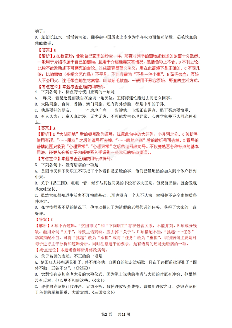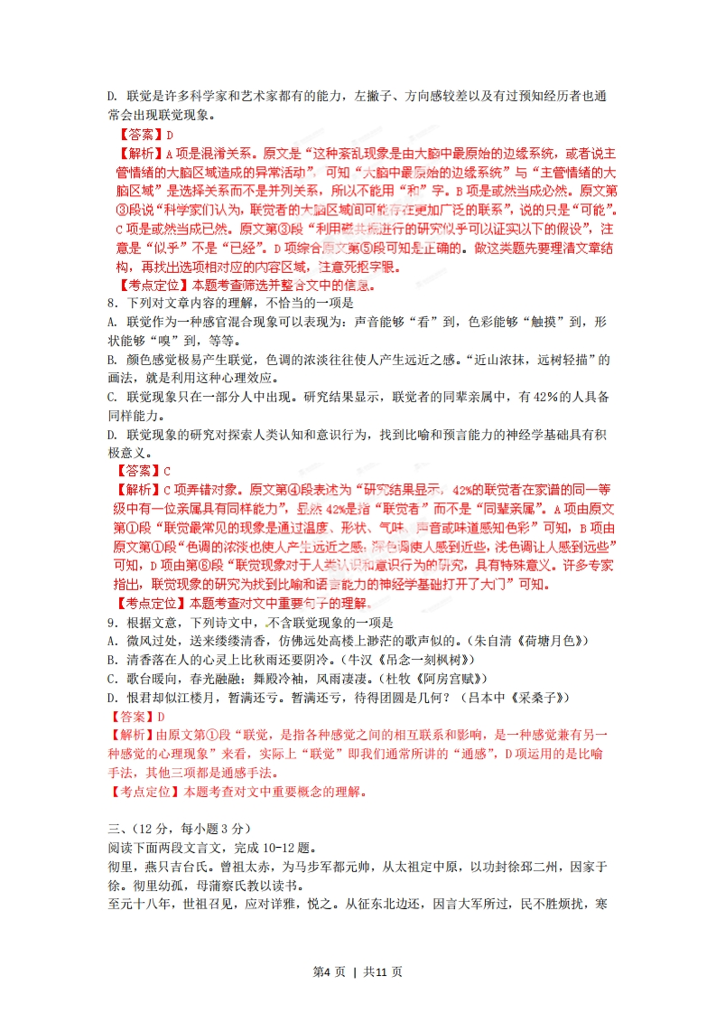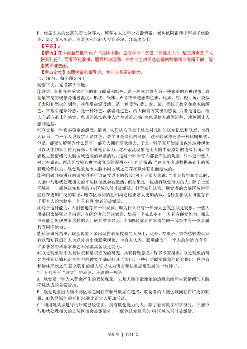 2012年普通高等学校招生全国统一考试(江西卷)语文(教师版)本试卷分第I卷(选择题)和第Ⅱ卷两部分。第I卷1至4页,第Ⅱ卷5至8页,共150分.考生注意:1.答题前,考生务必将自己的准考证号、姓名填写在答题卡上。考生要认真核对答题卡上粘贴的条形码的“准考证号、姓名、考试科目”与考生本人准考证号、姓名是否一致。2.第I卷每小题选出答案后,用2B铅笔把答题卡上对应题目的答案标号涂黑,如需改动,用橡皮擦干净后,在选涂其他答案标号。第Ⅱ卷用黑色水签字笔在答题卡上书写作答。在试题卷上作答,答案无效3.考试结束,监考员将试题卷、答题卡一并收回第I卷(选择题,共36分)一、(18分,每小题3分)1.下列词语中,加点字的读音全都正确的一项是A.谥号(shi)提防(d)花蕊(rui)歃血为盟(cha)B.熟稔(rn)青荇(xing)中肯(zhong)锱铢必较(z1)C.整伤(chi)优渥(wò)尺牍(di)无色无臭(xiù)D.监生(jian)执拗(niù)觊觎(ji)子然一身(jié)【答案】c【解析】A项“歃血为盟”读“sh”不读“cho”,形声字不能只读半边音;B项“中肯”是多音字,读第四声“zhng”,D项“监生”也是多音学,读次音“jin”,不读“jin”。所选字音大多来源于教材中的注解。用排除法容易做出,特别要注意形声字中声旁已不代表读音的字和音随义移的多音多义字。【考点定位】本题考查识记现代汉语普通话常用字的字音。2.下列词语中,没有错别字的一组是A.家具赝品气概水乳交融B.萎靡帐篷更叠暴殄天物C.国粹输赢蛰伏旁证博引D.惭怍诟病九洲呕心沥血【答案】A【解析】B更叠一更迭;B旁证博引一旁征博引:D九洲一九州。注意同音替代和形近混淆。对于同音字主要是看偏旁,对于形旁已失去表意功能的形声字可以通过分析词语的语法结构来推断。关键是据义定形:比如“更达”是“轮流更换”不是“再次叠加”,“旁征博引”的“征”是“调用”而不是“证明”的意思,“九州”是传说中的我国古代九个行政区,不是“大陆与岛屿的总称”。【考点定位】本题考查识记并正确书写现代常用规范汉字。3.下列各句中,加点的词语使用恰当的一项是A.汶川县某领导在灾后重建工作总结会上,如数家珍般介绍了当地连年发生的较大地震灾害的情况。B.那位著名学者去年在北京大学所作的关于人与自然相互关系的演讲,观点鲜明,切中时弊,真可谓不刊之论啊!C.无论东方还是西方,婚丧嫁娶,对普通人家来说都不是小事,对皇家而言,就更不同凡第1页|共11页响了。D.滚滚长江水,滔滔黄河浪,翻卷起中国历史上多少为争夺权力而相互杀戮、茹毛饮血的残酷故事。【答案】B【解析】A如数家珍:像数自己家里的珍宝一样,形容对列举的事物或叙述的故事十分熟悉。一般用于介绍不属于自己的事物,且用于介绍地震灾害情况,感情色彩上不合。B不刊之论:比喻不能改动或不可磨灭的言论。该成语容易”文生义,用在此语境下是正确的。C不同凡响:比喻事物(多指文艺作品)不平凡,不能理解为“不是一件小事”。D茹毛饮血:原始人不会用火,连毛带血地生吃离兽,叫饮茹毛饮血,一般用于形容原始、野蛮的生活方式。【考点定位】本题考查正确使用成语。4.下列各句中,标点符号使用正确的一项是A.昨天,看见赵曼丽独自在操场一角哭泣,王婷婷连忙跑过去问怎么回事。B.大陆同胞、台湾、香港、澳门同胞,还有海外侨胞,都是中华的子孙。C.他最要好的朋友,一一一个房地产商一一告诉他,市场正在调查,眼下买房要慎重。D.有人认为:儿童天真烂漫,无忧无虑,不可能发生心理异常,心理学家并不认同这种观点。【答案】A【解析】B“大陆同胞”后的顿号改为逗号,注意此句中的大并列、小并列之分。C破折号使用有误,“朋友”之后的逗号可去掉,“房地产两”后的破折号可去掉。D冒号的管辖范围只能到“心理异常”,“心理异常”之后的逗号改句号。不仅要熟悉各种标点的基本用法,还要从分析句子内部关系入手识别一些常见的标点错误。【考点定位】本题考查正确使用标点符号5.下列各句中,没有语病的一项是A.贫困市民和下岗职工不再把干个体看作是丢脸的事,他们已经坦然的加入到个体户行列中来。B.关于《品三国》,粗粗一看,似乎与其他同类的书没有多大区别,但反复品读,就会发现其意味深长。C.虽然大家都知道生活离不开物质基础,可也没有一个人不认为,幸福并不完全由物质条件决定。D.在学校师资不足的情况下,他主动挑起了为请假的老师代课的任务,获得了大家的一致好评。【答案】C【解析】A项不合逻辑。“贫困市民”和“下岗职工”存在包含关系,不能并列。B项成分残缺。滥用介词“关于”,导致主语残缺,应去掉“关于”。D项搭配不当,“挑起…任务”动宾搭配不当,可将“挑起”改为“承担”或将“任务”改为“重担”。识别病句主要是对句子进行主干分析和逻辑分析。同时注意题干的要求,是有语病的还是无语病的一项。【考点定位】本题考查辨析并修改病句:6.关于名著的表述,不正确的一项是A.楚国狂人接舆遇见孔子,并不理会他,自顾自的边走边唱歌,且在子路面前批评孔子“四体不勤,五谷不分”。(《论语》)B.觉慧没有参加高老太爷的大殓仪式,因为道士说他的生肖与大殓的时辰有冲突。他虽然没有反对,但心里不相信这些。(《家》)C.许攸向袁绍献计攻许昌,袁绍不听,致使许攸投奔曹操。曹操用许攸之计,烧毁袁绍积于乌