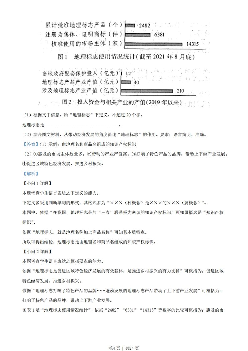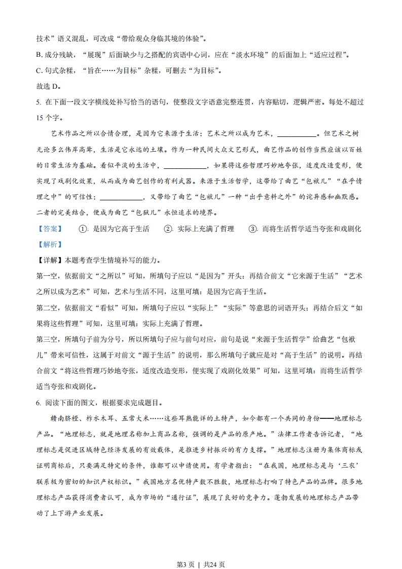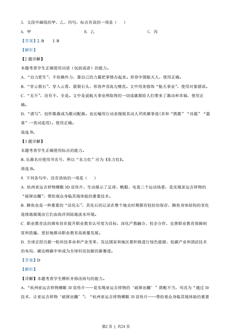 2022年高考浙江卷语文真题一、语言文字运用(共20分)1.下列各句中,没有错别字且加点字的注音全都正确的一项是()A.中国共青团始终与党同心、跟党奋斗,团结带领广大团员青年把忠诚书写在党和人民事业中,把青春播撒(sǎ)在民族复兴的征程上,把光荣镌(juan)刻在历史行进的史册里。B.作为联动不同地市、辐(0)射全省的大形文化活动,宋韵文化节将逐步成为讲好浙江故事、展现浙江精神的重要窗口,成为解读中华文明、增强文化自信的重要载(z)体。C.有些微短剧利用了模(mó)式化的内容结构,在人们的日程中炮(po)制出“空闲时间被我利用”的错觉,给用户营造了添加“工业糖精”的饕餮幻境,压缩了人们的想象空间。D.水中的精灵使出浑身解(x)数与捕鱼人捉谜藏一鱼儿转身逃之天天,虾儿躲开悄(qio)无声总,螃蟹诡谲钻进石缝,黄鳝狡猾来去无踪...但还是留下了蛛丝马迹。【答案】C【解析】【详解】本题考查学生识记现代汉语常用字字音和正确使用现代常用规范汉字的能力。A.“镌刻”的“镌”应读“juan”:B.“大形”的“形”应改为“型”:D.“捉谜藏”的“谜”应改为“迷”。故选C。阅读下面的文字,完成下面小题。【甲】翻开《精神的力量一航天精神引领中华民族探索浩瀚宇宙》一书,中国航天事业的历程一一展现,字里行间全是澎湃的热情,全是珍贵的回忆。中国航天人自力更生、艰苦奋斗,航天事业从无到有、从小到大,迅速发展壮大。【乙】我永远忘不了,从天上传来的“东方红”乐曲是那么悠扬、那样动听!改革开放以来,党中央和全国人民继续大力支持航天事业,中国航天人披荆斩棘、刻苦攻关,航天事业穿云裂石,突飞猛进地实现飞跃,大踏步赶上时代。首次载人航天飞行,神舟五号载人飞船成功升空并安全返回,获得圆满成功:神舟七号载人飞船实施宇航员空间出舱活动。这一切无不给我们带来激动和幸福!进入新时代,航天梦引领中国航天人奋力奔跑、勇敢逐梦,让航天事业奔向强国目标,自立自强地谱写着新的辉煌篇章。【丙】北斗泽沐八方、嫦娥飞天搅月,天问造访火星,天和筑梦天河…这些好消息一则接着一则地传来,很不容易,真是令人万般欣慰上2.文段中的加点词语,运用不正确的一项是()A.自力更生B.穿云裂石C.无不D.谱写第1页」共24页3.文段中画线的甲、乙、丙句,标点有误的一项是()A.甲B.乙C.丙【答案】2.B3.B【解析】【2题详解】本题考查学生正确使用词语(包括成语)的能力。A.“自力更生”,不依赖外力,靠自己的力量把事情办起来。形容中国航天人,使用正确。B.“穿云裂石”,穿入云霄,震裂石头,形容声音高亢嘹亮。文中用来修饰“航天事业”,使用对象错误。C.“无不”,没有不,全是。文中是说航天事业所取得的一切成就都给人们带来了激动和幸福,使用正确。D.“谱写”,创作歌曲或为歌词配曲。也比喻用行动表现极其动人的英雄事迹(多和“凯歌”“诗篇”“篇章”一类词连用)。使用正确。故选B。【3题详解】本题考查学生正确使用标点的能力。B.乐曲名应使用书名号,所以“东方红”应为《东方红》。故选B。4.下列各句中,没有语病的一项是()A.杭州亚运吉祥物裸眼3D宣传片,生动展示了足球、帆船、电竞三个运动场景,是实现亚运吉祥物的“破屏出圈”,带给观众身临其境体验的重要技术。B.肺鱼也是一种重要的“活化石”,其化石的记录在整个地史时期都有较好的保存,肺鱼身体结构的变化连续地展现出它们由海洋到陆地淡水环境。C.职业教育法的颁布旨在提升职业教育认可度为目标,深化产教融合、校企合作,完善职业教育保障制度和措施,更好地推动职业教育高质量发展。D.全球正经历新一轮科技革命和产业变革,发达国家和地区都积极进行绿色能源、低碳产业和清洁技术的布局,碳达峰碳中和成为全球科技创新的新赛道。【答案】D【解析】【详解】本题考查学生辨析并修改病句的能力。A.“杭州亚运吉祥物裸眼3D宣传片…是实现亚运吉祥物的‘破屏出圈’”搭配不当,可改为“通过3D技术,让亚运吉祥物‘破屏出圈’”:“杭州亚运吉祥物裸眼3D宣传片…带给观众身临其境体验的重要第2页1共24页技术”语义混乱,可改成“带给观众身临其境的体验”。B.成分残缺,“展现”后面缺少与之搭配的宾语中心词,应在“淡水环境”的后面加上“适应过程”。C.句式杂糅,“旨在…为目标”杂糅,可删去“为目标”。故选D。5.在下面一段文字横线处补写恰当的语句,使整段文字语意完整连贯,内容贴切,逻辑严密。每处不超过15个字艺术作品之所以合情合理,是因为它来源于生活:艺术之所以成为艺术,。但艺术之树无论多么伟岸高耸,生活是它永远的土壤。作为一种民间大众文艺形式,曲艺作品的创作当然应该以百姓的日常生活为基础。看似平淡的生活中,,如果将这些哲理巧妙地夸张,适度改造变形,便实现了戏刷化效果,从而成为曲艺创作的有利武器。来源于生活哲学,这带给了曲艺“包被儿”“在乎情理之中”的可信性:一,又带给了曲艺“包被儿”一种“出乎意料之外”的诧异感和幽默感。二者的完美结合,便成为曲艺“包狱儿”永恒追求的境界。【答案】①.是因为它高于生活②.实际上充满了哲理③.而将生活哲学适当夸张和戏剧化【解析】【详解】本题考查学生情境补写的能力。第一空,依据前文“之所以”可知,所填句子应以