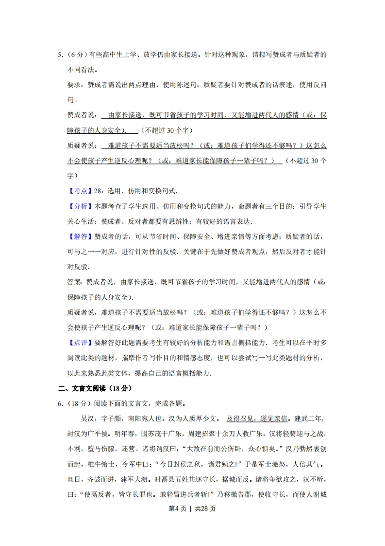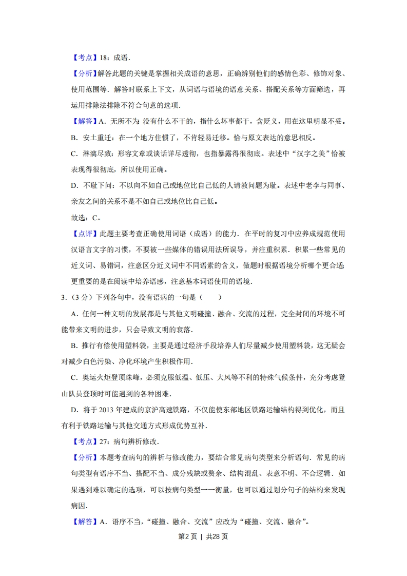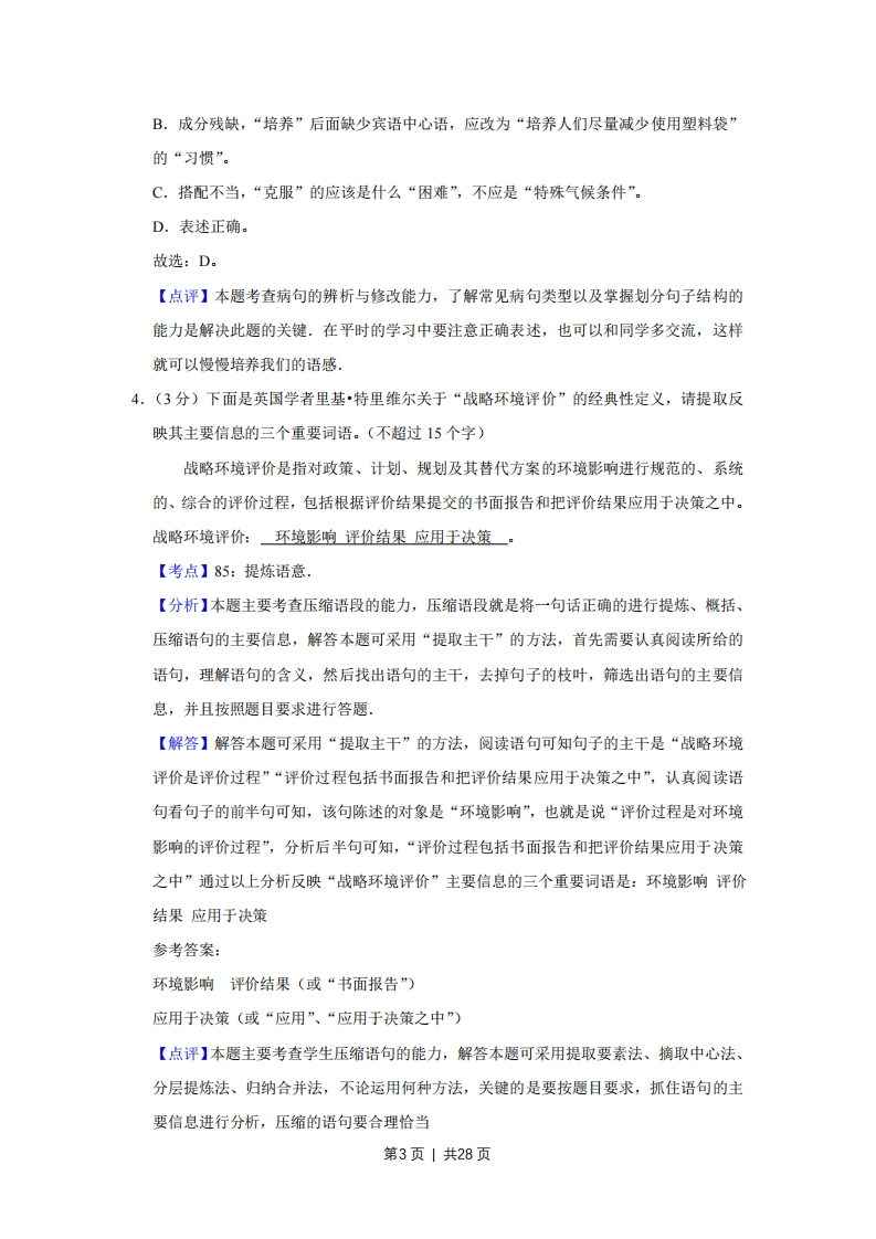 2008年江苏省高考语文试卷解析版事考答案与试题佩折一、语言文字运用(18分)1.(3分)下列词语中加点的字,每对读音都不相同的一组是()A.识别/博闻强识模仿/装模作样剥削/生吞活剥B.朝圣/朝令夕改提防/提心吊胆绿茵绿林好汉C.箴言缄默无言蠕动/耳濡目染粗犷旷日持久D.湍急/惴惴不安讳言/经天纬地勘察堪称一绝【考点】11:字音【分析】本题重点考查考生正确识记现代汉语普通话字音的能力,涉及多音字、同音异形字、形近音异字的读音.作答字音题首先需要仔细审题,明确题意,是选相同还是不同.其次联想相关词语,因义定音,排除法与认定法相结合,逐项逐字分辨.【解答】A.sh1/zhi,m6/mǘ,bo:B.chao/zhao,dI/ti,lu/lu;C.jian,r,gudng/kuang:D.tuan/zhui,hui/wei,kan故选:B。【点评】常言道:“好脑壳不如烂笔头.”遇到疑难的字音,勤翻工具书,该记的随时做笔记,这是最有效的方法.最好要有一个分类、分项的笔记本.许多基础考得好的同学都有很好的积累习惯。2.(3分)下列各句中,加点的成语使用恰当的一句是()A,为了不让下一代输在起跑线上,年轻的父母纷纷送孩子去练钢琴,学围棋,上英语兴趣班,真是费尽心思,无所不为B.随着社会经济的进一步发展,安土重迁的观念越来越深人人心,即使富庶地区的人们也乐意告别家乡,外出闯荡一番。C.书法是中国传统的艺术形式,风格各异的书法精品,或古朴,或隽秀,或雄浑,或飘逸,将汉字之美表现得淋漓尽致D.老李从小就养成了勒学好问的良好习惯,遇到问题,总是不耻下问,及时向同事、亲朋好友甚至左邻右舍请教.第1页1共28页【考点】18:成语,【分析】解答此题的关键是掌握相关成语的意思,正确辨别他们的感情色彩、修饰对象、使用范围等.解答时联系上下文,从词语与语境的语意关系、搭配关系等方面筛选,再运用排除法排除不符合句意的选项.【解答】A.无所不为没有什么不干的,指什么坏事都干,含贬义,用在这里明显不妥。B.安土重迁:在一个地方住惯了,不肯轻易迁移。恰与原文表达的意思相反。C.淋漓尽致:形容文章或谈话详尽透彻,也指暴露得很彻底。表述中“汉字之美”恰被表现得很彻底,所以使用正确。D.不耻下问:不以向不如自己或地位比自己低的人请教问题为耻。表述中老李与同事、亲友之间的关系不是不如自己或地位比自己低。故选:C。【点评】此题主要考查正确使用词语(成语)的能力.在平时的复习中应养成规范使用汉语言文字的习惯,不要被一些媒体的错误用法所误导,并注重积累.积累一些常见的近义词、易错词,注意区分近义词中不同语素的含义,做题时根据语境分析哪个更合适更重要的是在阅读中培养语感,注意基本词语使用的语境3.(3分)下列各句中,没有语病的一句是()A,任何一种文明的发展都是与其他文明碰撞、融合、交流的过程,完全封闭的环境不可能带来文明的进步,只会导致文明的衰落B.推行有偿使用塑料袋,主要是通过经济手段培养人们尽量减少使用塑料袋,这无疑会对减少白色污染、净化环境产生积极作用C.奥运火炬登顶珠峰,必须克服低温、低压、大风等不利的特殊气候条件,充分考虑登山队员登顶时可能遇到的各种困难。D.将于2013年建成的京沪高速铁路,不仅能使东部地区铁路运输结构得到优化,而且有利于铁路运输与其他交通方式形成优势互补【考点】27:病句辨析修改【分析】本题考查病句的辨析与修改能力,要结合常见病句类型来分析语句.常见的病句类型有语序不当、搭配不当、成分残缺或赘余、结构混乱、表意不明、不合逻辑,如果遇到难以确定的选项,可以按病句类型一一衡量,也可以通过划分句子的结构来发现病因【解答】A.语序不当,“碰撞、融合、交流”应改为“碰撞、交流、融合”。第2页|共28页B.成分残缺,“培养”后面缺少宾语中心语,应改为“培养人们尽量减少使用塑料袋”的“习惯”。C.搭配不当,“克服”的应该是什么“困难”,不应是“特殊气候条件”。D.表述正确。故选:D。【点评】本题考查病句的辨析与修改能力,了解常见病句类型以及掌握划分句子结构的能力是解决此题的关键.在平时的学习中要注意正确表述,也可以和同学多交流,这样就可以慢慢培养我们的语感,4.(3分)下面是英国学者里基·特里维尔关于“战略环境评价”的经典性定义,请提取反映其主要信息的三个重要词语。(不超过15个字)战略环境评价是指对政策、计划、规划及其替代方案的环境影响进行规范的、系统的、综合的评价过程,包括根据评价结果提交的书面报告和把评价结果应用于决策之中。战略环境评价:环境影响评价结果应用于决策。【考点】85:提炼语意,【分析】本题主要考查压缩语段的能力,压缩语段就是将一句话正确的进行提炼、概括、压缩语句的主要信息,解答本题可采用“提取主干”的方法,首先需要认真阅读所给的语句,理解语句的含义,然后找出语句的主干,去掉句子的枝叶,筛选出语句的主要信息,并且按照题目要求进行答题【解答】解答本题可采用“提取主干”的方法,阅读语句可知句子的主干是“战略环境评价是评价过程”“评价过程包括书面报告和把评价结果应用于决策之中”,认真阅读语句看句子的前半句可知,该句陈述的对象是“环境影响”,也就是说“评价过程是对环境影响的评价过程”,分析后半句可知,“评价过程包括书面报告和把评价结果应用于决策之中”通过
