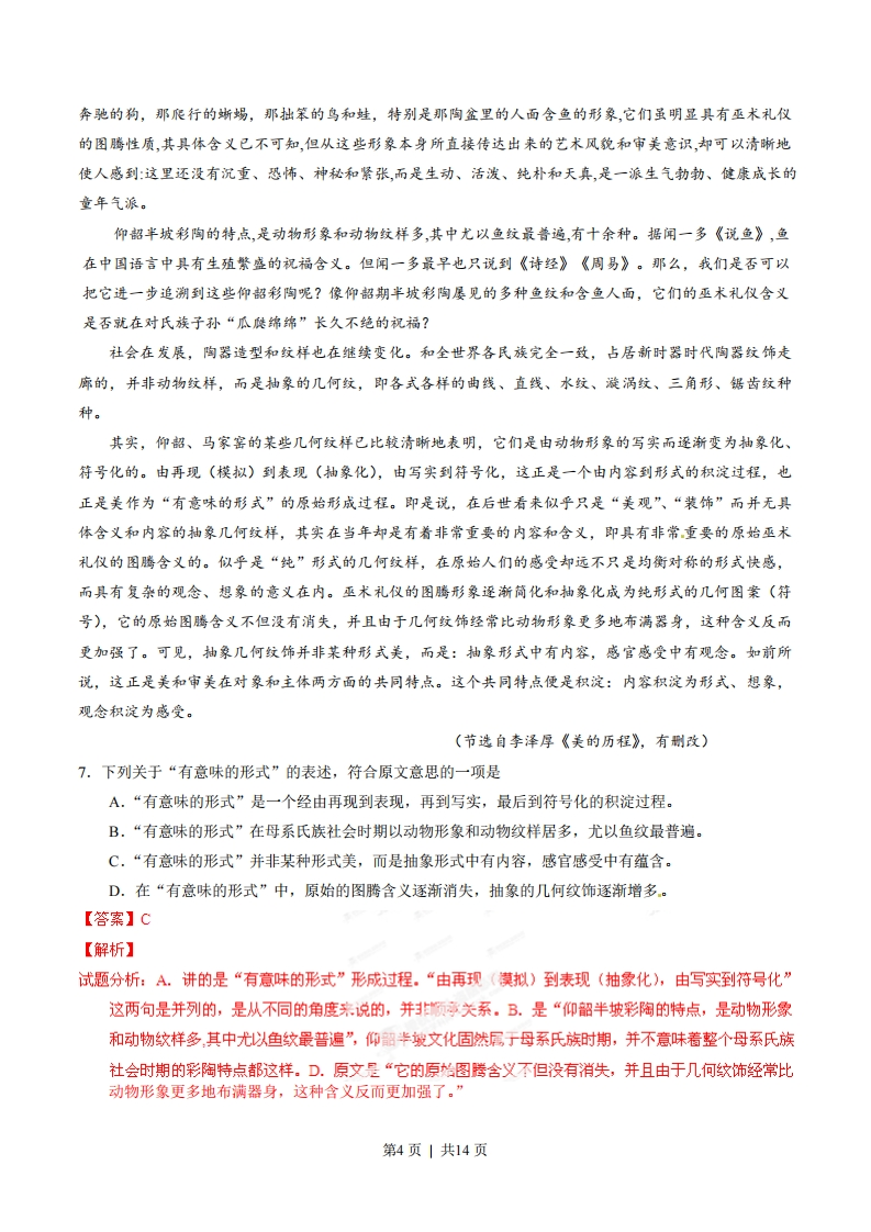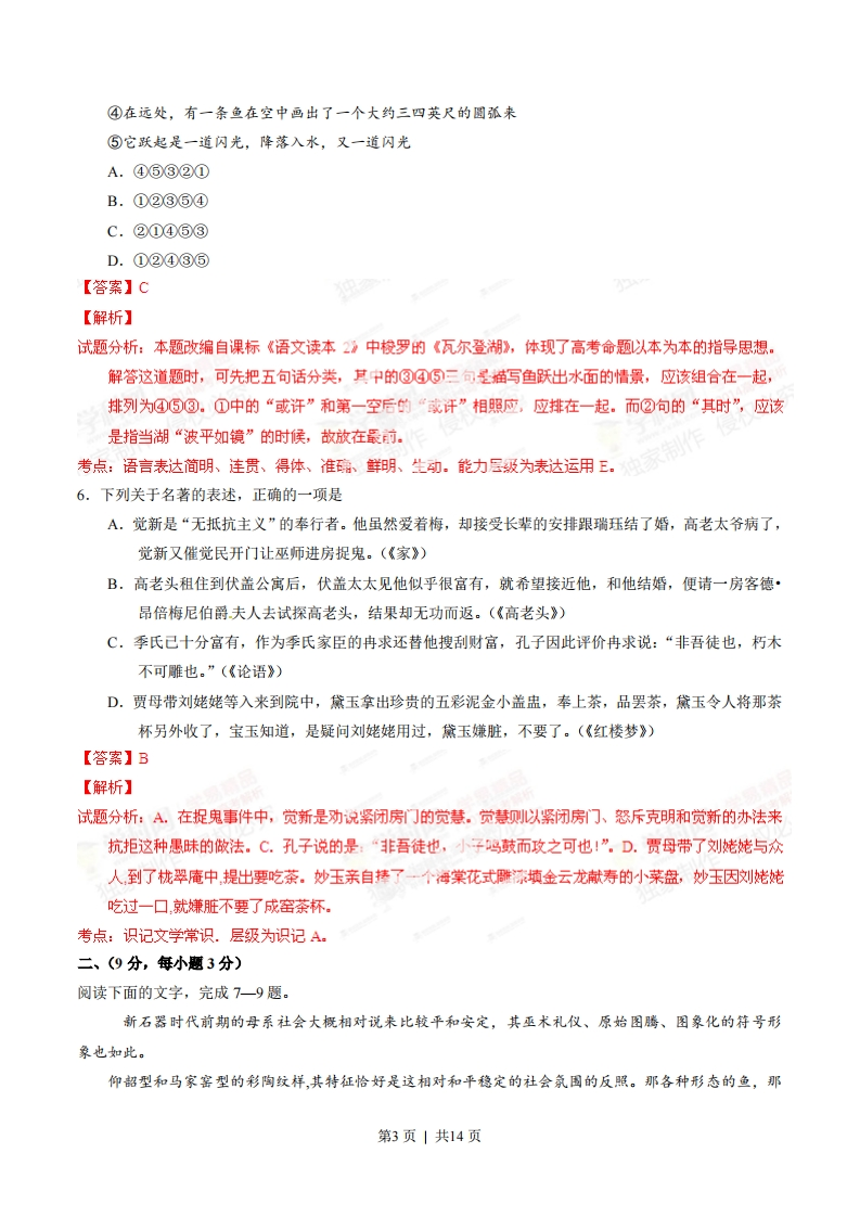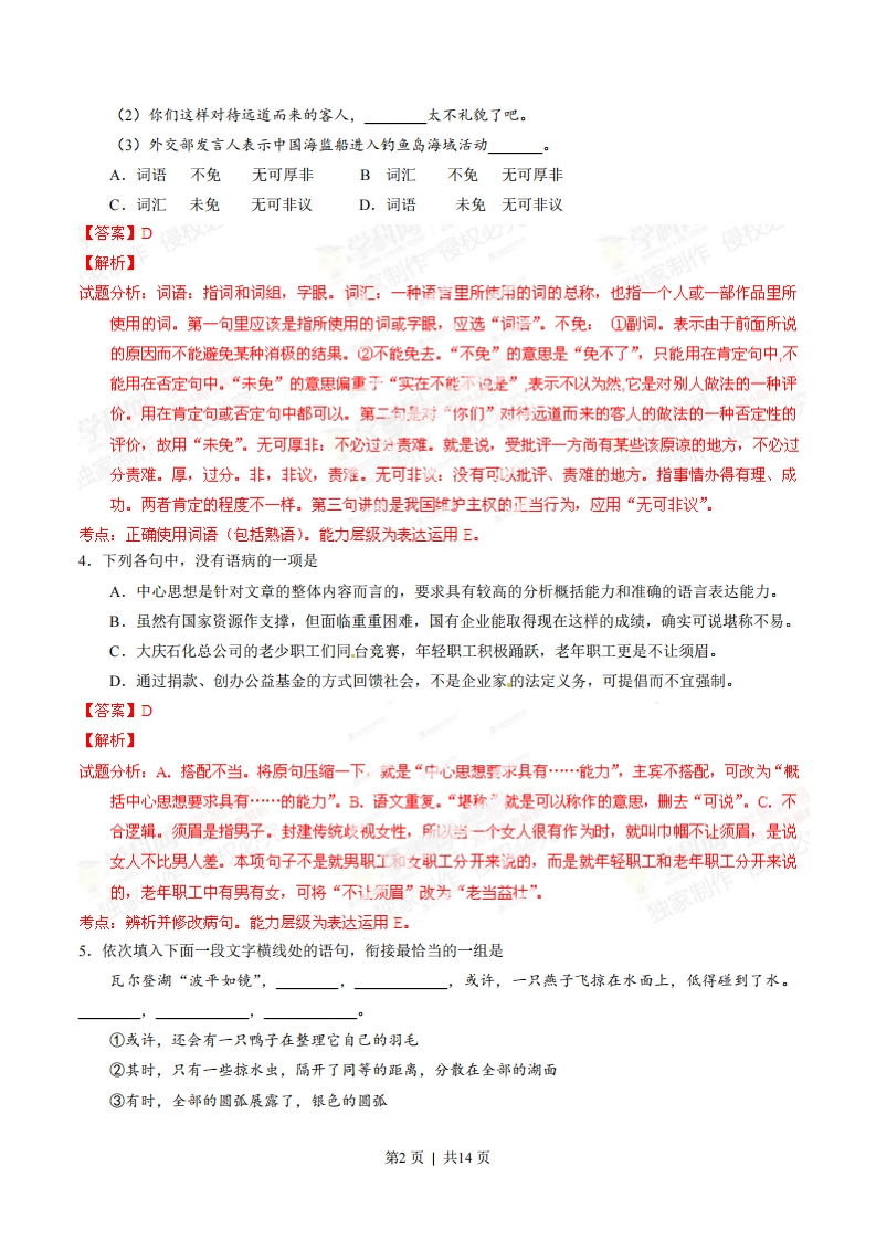 2014年普通高等学校招生全国统一考试(江西卷)语文一、(18分,每小题3分)1.下列词语中,加点的字的读音全都正确的一组是A.翌(yi)日贲(ben)张黑慧(yue)魃沆瀣(xi论)一气B.倜(ti)傥和(huo)面角(jiao)斗士莞(wan)尔一笑C.魑(chi)魅伛偻(1ǚ)入场券(quan)心广体胖(pang)D.笑靥(ye)圭桌(nie)打擂(1ei)台绿(1ù)林好汉【答案】D【解析】试题分析:A.黑魃(x)魃。B.“角在多数情况下读ji0,读ju时,可以表示竞赛角色等意思,“角斗士"中的角有竞赛、搏斗的意思,应该读ju,C.心广体胖(pn),胖,在表示安泰舒适时,要读pn,而表示人体脂肪多、肉多的意思时,则读pang:值得注意的是:一、虽然江西省2014年高考考试说明中明确了字音考查是“识记现代汉语普通话常用字的字音”,但本题中的“翌、贲、、董、倜、莞、适、偻、靥、臬”等均不在《现代汉语常用字表》(含次常用字表)中。二、易读错的多音字占了很大此例。如:贲、角、莞、偻、胖、擂、绿”等均有两音,而“和”字依《现代汉语典》则有五音。考点:识记现代汉语普通话常用字的字言。能力层织为识记A心2.下列词语中,没有错别字的一组是A.弭乱国粹泊来品入不敷出B.伺候斐声煞风景得鱼忘筌C.日晷陨落挖墙脚纵横捭图D.萦回撺掇黑黝黝入目三分【答案】C【解析】试题分析:A.舶来品:“舶”读b,意思是“航海大船”,“舶来品”原指通过航船从国外进口来的物品。旧时外国商品主要由水路用船舶载运而来,故名。B.蜚声:扬名。蜚,形旁为虫,义同“飞”。斐,f,有文采的样子,显著,如“成绩斐然”。D.入木三分:东晋时期著名书法家王藏之7岁时开始练习书法,他练字十分刻苦,经常在水池边练字,池水都染黑了。3岁时写《兰亭集序》,37岁写《黄庭经》,后来因更换写字的木板,工匠发现王羲之笔力强动,字迹已透入木板三分深。后用“入木三分”形容书法笔力遒劲,也比喻见解、议论深刻、硫切.考点:识记并正确书写现代常用规范汉字。能力层级为识记A.3.依次填入下列词句横线处的词语,最恰当的一组是(1)时下,概括中国教育病症最流行的莫过于“应试教育”。第1页|共14页(2)你们这样对待远道而来的客人,太不礼貌了吧。(3)外交部发言人表示中国海监船进入钓鱼岛海域活动A.词语不免无可厚非B词汇不免无可厚非C.词汇未免无可非议D.词语未免无可非议【答案】D【解析】试题分析:词语:指词和词组,字眼。词汇:一种语言里所使用的词的总称,也指一个人或一部作品里所使用的词。第一句里应该是指所使用的词或字眼,应选“词”。不免:①副词。表示由于前面所说的原因而不能避免某种消极的结果。②不能免去。“不免”的意思是“免不了”,只能用在肯定句中不能用在否定句中。“未免”的意思偏重于“实在不能不之是”表示不以为然,它是对别人做法的一种评价。用在肯定句或否定句中都可以。第二句是对“你们”对待远道而来的客人的做法的一种否定性的评价,故用“未免”。无可厚非:不必过分责滩。就是说,受批评一方尚有某些该原凉的地方,不必过分责难。厚,过分。非,非议,责注。无可非议:没有可以批评、责难的地方。指事情办得有理、成功。两者肯定的程度不一样。第三句讲的是我国炉主权的正当行为,应用“无可非议”。考点:正确使用词语〔包括熟语)。能力层级为表达运用E。4.下列各句中,没有语病的一项是A.中心思想是针对文章的整体内容而言的,要求具有较高的分析概括能力和准确的语言表达能力。B.虽然有国家资源作支撑,但面临重重困难,国有企业能取得现在这样的成绩,确实可说堪称不易。C.大庆石化总公司的老少职工们同台竞赛,年轻职工积极踊跃,老年职工更是不让须眉。D.通过捐款、创办公益基金的方式回馈社会,不是企业家的法定义务,可提倡而不宜强制。【答案】D【解析】试题分析:A.搭配不当。将原句压缩一下,就是“中心思想要求具有能力”,主宾不搭配,可改为“概括中心思想要求具有的能力”。B.语文重复,“堪称”就是可以称作的意思,删去“可说”。C,不合逻辑。须眉是指男子。封建传统友视女性,以当一个女人很有作为时,就叫巾帼不让须眉,是说女人不比男人差。本项句子不是就男职工和女职工分开来说的,而是就年轻职工和老年职工分开来说的,老年职工中有男有女,可将“不让须眉”改为“老当益壮”考点:辨析并修改病句。能力层级为表达运用E.5.依次填入下面一段文字横线处的语句,衔接最恰当的一组是瓦尔登湖“波平如镜”,,或许,一只燕子飞掠在水面上,低得碰到了水。①或许,还会有一只鸭子在整理它自己的羽毛②其时,只有一些掠水虫,隔开了同等的距离,分散在全部的湖面③有时,全部的圆孤展露了,银色的圆孤第2页|共14页④在远处,有一条鱼在空中画出了一个大约三四英尺的圆孤来⑤它跃起是一道闪光,降落入水,又一道闪光A.④⑤③②①B.①②③⑤④C.②①④⑤③D.①②④③⑤【答案】C【解析】试题分析:本题改编自课标《语文读本2》中棱罗的《瓦尔登湖》,体现了高考命题以本为本的指导思想。解答这道题时,可先把五句话分类,其中的③④⑤三句星写鱼跃出水面的情景,应该组合在一起,排列为④⑤③。①中的“或许”和第一空后的“或讦”相照应,应排在一起。而②句的“其时”,应该是指当湖“波平如镜”的时候,故放在最前.废点言表秋明,连贯、得体准明,,力为素林用,6.下