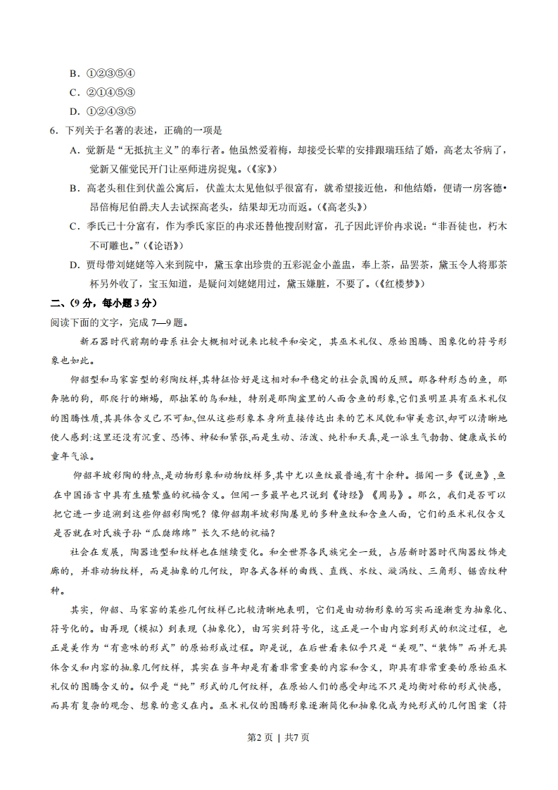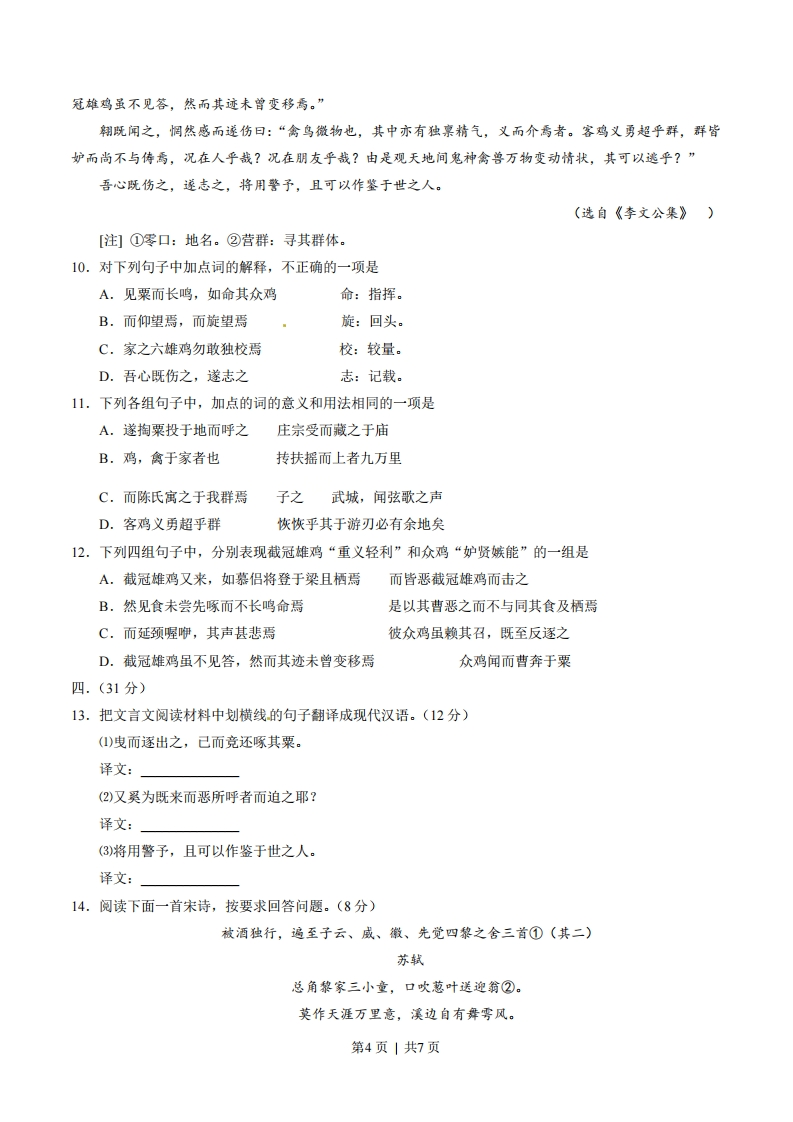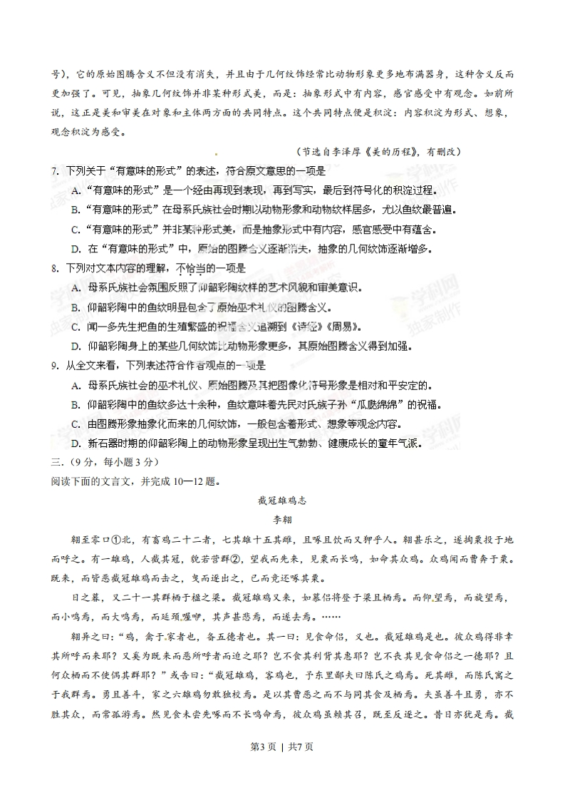 2014年普通高等学校招生全国統一考试(江西卷)语文一、(18分,每小题3分)1.下列词语中,加点的字的读音全都正确的一组是A.翌(yi)日贡(b)张黑慧(ue)魃沆潼(xiè)一气B.倜(ti)傥和(hu6)面角(jiao)斗士莞(wan)尔一笑C.魑(ch)魅伛偻(ǚ)入场券(quan)心广体胖(pang)D.笑靥(y)圭桌(nie)打招(1ai)台绿(1ù)林好汉2.下列词语中,没有错别字的一组是A.弭乱国粹泊来品入不敷出B.伺候斐声煞风景得鱼忘筌C.日晷陨落.挖墙脚纵横牌阍D.萦回撺掇黑黝黝入目三分独3.依次填入下列词句横线处的词语,最恰当的一组是(1)时下,概括中国教育病症最流行的莫过于“应试教育”。(2)你们这样对待远道而来的客人,太不礼貌了吧。(3)外交部发言人表示中国海监船进入钓鱼岛海域活动A.词语不免无可厚非B词汇不免无可厚非C.词汇未免无可非议D.词语未免无可非议4.下列各句中,没有语病的一项是A.中心思想是针对文章的整体内容而言的,要求具有较高的分析概括能力和准确的语言表达能力。B.虽然有国家资源作支撑,但面临重重困难,国有企业能取得现在这样的成绩,确实可说堪称不易。C.大庆石化总公司的老少职工们同台竞赛,年轻职工积极踊跃,老年职工更是不让须眉。D.通过捐款、创办公益基金的方式回馈社会,不是企业家的法定义务,可提倡而不宜强制。5.依次填入下面一段文字横线处的语句,衔接最恰当的一组是瓦尔登湖“波平如镜”,,或许,一只燕子飞掠在水面上,低得碰到了水。9①或许,还会有一只鸭子在整理它自己的羽毛②其时,只有一些掠水虫,隔开了同等的距离,分散在全部的湖面③有时,全部的圆孤展露了,银色的圆孤④在远处,有一条鱼在空中画出了一个大约三四英尺的圆孤来⑤它跃起是一道闪光,降落入水,又一道闪光A.④⑤③②①第1页|共7页B.①②③⑤④C.②①④⑤③D.①②④③⑤6.下列关于名著的表述,正确的一项是A.觉新是“无抵抗主义”的奉行者。他虽然爱着梅,却接受长辈的安排跟瑞珏结了婚,高老太爷病了,觉新又催觉民开门让巫师进房捉鬼。(《家》)B.高老头租住到伏盖公寓后,伏盖太太见他似乎很富有,就希望接近他,和他结婚,便请一房客德·昂倍梅尼伯爵夫人去试探高老头,结果却无功而返。(《高老头》)C.季氏己十分富有,作为季氏家臣的冉求还替他搜刮财富,孔子因此评价冉求说:“非吾徒也,朽木不可雕也。”(《论语》)D.贾母带刘姥姥等入来到院中,黛玉拿出珍贵的五彩泥金小盖盅,奉上茶,品罢茶,黛玉令人将那茶杯另外收了,宝玉知道,是疑问刘姥姥用过,黛玉嫌脏,不要了。(《红楼梦》)二、(9分,每小题3分)阅读下面的文字,完成7一9题。新石器时代前期的母系社会大概相对说来比较平和安定,其巫术礼仪、原始图腾、图象化的符号形象也如此。仰韶型和马家窑型的彩陶纹样,其特征恰好是这和对和平稳定的社会氛围的反照。那各种形态的鱼,那奔驰的狗,那爬行的蜥蜴,那拙笨的鸟和蛙,特别是那陶盆里的人面含鱼的形象,它们虽明显具有巫术礼仪的图腾性质,其具体含义已不可知但从这些形象本身所直接传达出来的艺术风貌和审美意识,却可以清晰地使人感到:这里还没有沉重、恐怖、神秘和紧张,而是生动、活泼、纯朴和天真,是一派生气勃勃、健康成长的童年气派。仰韶半坡彩陶的特点,是动物形象和动物纹样多,其中尤以鱼纹最普遍,有十余种。据闻一多《说鱼》,鱼在中国语言中具有生殖繁盛的祝福含义。但闻一多最早也只说到《诗经》《周易》。那么,我们是否可以把它进一步追溯到这些仰韶彩陶呢?像仰韶期半坡彩陶屡见的多种鱼纹和含鱼人面,它们的巫术礼仪含义是否就在对氏族子孙“瓜瓞绵绵”长久不绝的视福?社会在发展,陶器造型和纹样也在继续变化。和全世界各民族完全一致,占居新时器时代陶器纹饰走廊的,并非动物纹样,而是抽象的几何,即各式各样的曲线、直线、水纹、漩涡纹、三角形、锯齿纹种种。其实,仰韶、马家窑的某些几何纹样已比较清晰地表明,它们是由动物形象的写实而逐渐变为抽象化、符号化的。由再现(模拟)到表现(抽象化),由写实到符号化,这正是一个由内容到形式的积淀过程,也正是美作为“有意味的形式”的原始形成过程。即是说,在后世看来似乎只是“美观”、“装饰”而并无具体含义和内容的抽象几何纹样,其实在当年却是有着非常重要的内容和含义,即具有非常重要的原始巫术礼仅的图腾含义的。似乎是“纯”形式的几何纹样,在原始人们的感受却远不只是均衡对称的形式快感,而具有复杂的观念、想象的意义在内。巫术礼仪的图腾形象逐渐简化和抽象化成为纯形式的几何图案(符第2页」共7号),它的原始图腾含义不但没有消失,并且由于几何纹饰经常比动物形象更多地布满器身,这种含义反而更加强了。可见,抽象几何纹饰并非某种形式美,而是:抽象形式中有内容,感官感受中有观念。如前所说,这正是美和审美在对象和主体两方面的共同特点。这个共同特点便是积淀:内容积淀为形式、想象,观念积淀为感受。(节选自李泽厚《美的历程》,有删改)7.下列关于“有意味的形式”的表述,符合原文意思的一项是A.“有意味的形式”是一个经由再现到表现,再到写实,最后到符号化的积淀过程。B.“有意味的形式”在母系氏族社会时期以动物形象和动物纹样居多,尤以鱼纹最普遍。C.“有意味的形式”并非某种形式美,而是抽象形式中有