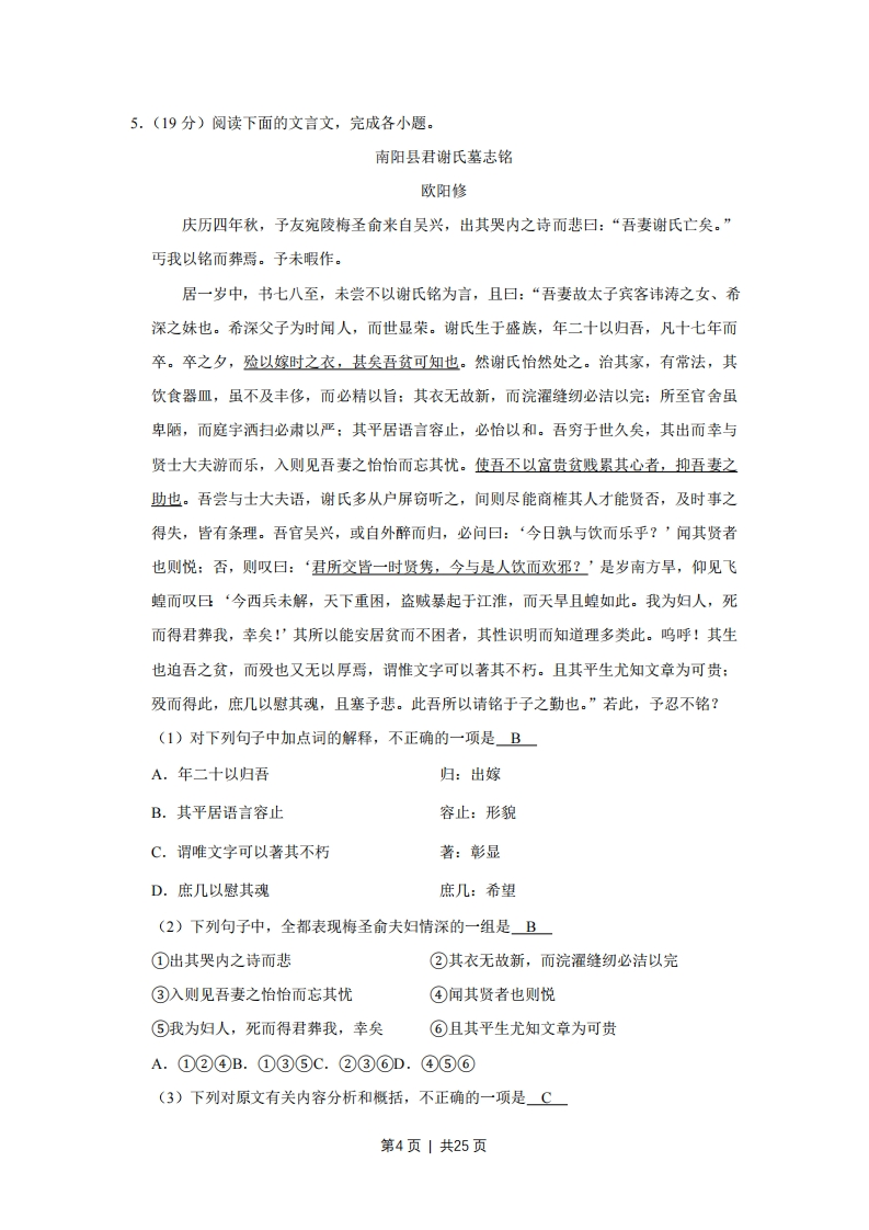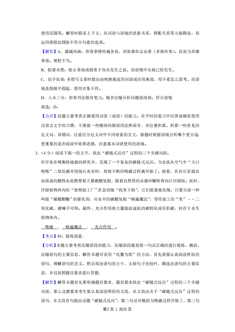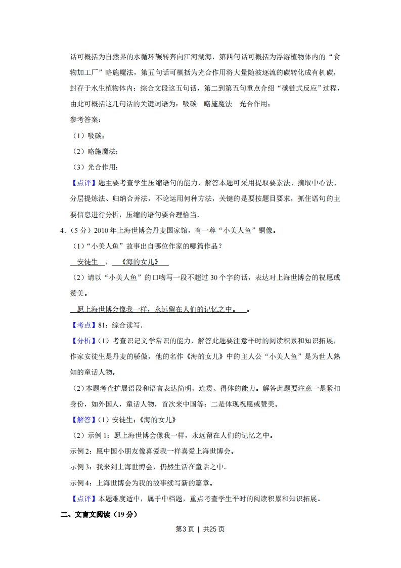 2010年江苏省高考语文试卷解析版事考答案与试题佩析一、语言文字运用(15分)1.(3分)下列加点的字,每对读音都不相同的一组是()A.弹劾/弹丸之地哽咽/狼吞虎因责难/多难兴邦B.鲜活/寡廉鲜耻泊位/淡泊明志叶韵/一叶知秋C.大度/审时度势长进/身无长物解放/浑身解数D.参差/扪参历井披靡/风靡一时畜牧六畜兴旺【考点】11:字音,【分析】此题主要是考查对多音字的读音的辨析,可以根据词性,也可以根据词义来判断【解答】A.tn/danye/yannan/nan:B.xian/xiǎnbo/boxie/ye:C.du/duozhǎng/changiiě/xi论:D.cen/shenm1/m1xd/chù.故选:C。【点评】字音题主要考查学生对多音字、形声字、形近字的辨识,而且是对常用字的易错音考查得比较多.所以,平时一定要注意对一些常用字的不常见读音的识记2.(3分)下列各句中,加点的成语使用恰当的一句是()A.司机张师傅冒着生命的危险解救乘客的事情,一经新闻媒体报道,就被传得满城风雨,感动了无数市民。B.近年来,在种种灾害面前,各级政府防患未然,及时启动应急预案,力争把人民的生命财产损失降到最低限度。C.这些“环保老人”利用晨练的机会,把游客丢弃在景点的垃圾信手拈来,集中带到山下,分类处理。D.“生命的价值在于厚度而不在于长度,在于奉献而不在于获取…”院士的一番话入木三分,让我们深受教育。【考点】18:成语【分析】解答此题的关键是掌握相关成语的意思,正确辨别他们的感情色彩、修饰对象、第1页|共25页使用范围等。解答时联系上下文,从词语与语境的语意关系、搭配关系等方面筛选,再运用排除法排除不符合句意的选项。【解答】A.满城风雨:形容事情传遍各处,到处都在议论着(多指坏事)。此处为英雄事迹。褒贬不当。B.防患未然:防止事故或祸害于尚未发生之前。而语境中灾祸己经发生。C.信手拈来多指写文章时能自由纯熟地选用词语或应用典故,用不着怎么思考。而语境是指随手捡起,使用对象不符。D.入木三分:形容书法极有笔力。现多比喻分析问题很深刻。符合语境故选:D【点评】此题主要考查正确使用词语(成语)的能力。在平时的复习中应养成规范使用汉语言文字的习惯,不要被一些媒体的错误用法所误导,并注重积累。积累一些常见的近义词、易错词,注意区分近义词中不同语素的含义,做题时根据语境分析哪个更合适更重要的是在阅读中培养语感,注意基本词语使用的语境。3.(4分)阅读下面一段文字,找出“碳链式反应”过程的三个关键词语。科学家在喀斯特地貌的研究中,发现了一个复杂的碳链式反应。当水流从空气中“大口吮吸”二氧化碳并侵蚀石灰岩时,持续不断的吸碳过程就开始了。接着,在岩石表面自由流淌的酸性水流携带着大量碳酸氢根,随着自然界的水循环辗转奔向江河湖海。此时,浮游植物体内的“食物加工厂”在急切地“找米下锅”,它们惊喜地发现,只要分泌一种叫做“碳酸酐酶”的催化剂,对水中的碳酸氢根“略施魔法”,等待加工的“米”·-二氧化碳,就唾手可得。最终,光合作用将大量随波逐流的碳转化成有机碳,封存于水生植物体内。吸碳一、略施魔法一、光合作用一。【考点】85:提炼语意.【分析】本题主要考查压缩语段的能力,压缩语段就是将一句话正确的进行提炼、概括、压缩语句的主要信息,解答本题可采用“化繁为简”的方法,首先需要认真阅读所给的语句,理解语句的含义,然后找出语句的主干,去掉句子的枝叶,筛选出语句的主要信息,并且按照题目要求进行答题,【解答】解答本题首先要明确题目要求,题目要求找出“碳链式反应”过程的三个关键词语,那么这就要求考生要认真阅读所给的文段,从文找出关于“碳链式反应”过程的语句,本文段首句提出话题“碳链式反应”,第二句话可概括为吸碳过程开始了,第三句第2页|共25页话可概括为自然界的水循环辗转奔向江河湖海,第四句话可概括为浮游植物体内的“食物加工厂”略施魔法,第五句话可概括为光合作用将大量随波逐流的碳转化成有机碳,封存于水生植物体内:综合文段这五句话,第二到第五句重点介绍“碳链式反应”过程,由此可概括这几句话的关键词语为:吸碳略施魔法光合作用:参考答案:(1)吸碳:(2)略施魔法:(3)光合作用:【点评】题主要考查学生压缩语句的能力,解答本题可采用提取要素法、摘取中心法、分层提炼法、归纳合并法,不论运用何种方法,关键的是要按题目要求,抓住语句的主要信息进行分析,压缩的语句要合理恰当,4.(5分)2010年上海世博会丹麦国家馆,有一尊“小美人鱼”铜像。(1)“小美人鱼”故事出自哪位作家的哪篇作品?安徒生,《海的女儿》(2)请以“小美人鱼”的口吻写一段不超过30个字的话,表达对上海世博会的祝愿或赞美。愿上海世博会像我一样,水远留在人们的记忆之中。。【考点】81:综合读写.【分析】(1)考查识记文学常识的能力,解答此题要注意平时的阅读积累和知识拓展,作家安徒生是丹麦的骄傲,他的名作《海的女儿》中的主人公“小美人鱼”是为世人熟知的童话人物。(2)本题考查扩展语段和语言表达简明、连贯、得体的能力。解答此题要注意一是紧扣身份,如外国人,童话人物,首次来中国等:二是体现祝愿或赞美。【解答】(1)安徒生:《海的女儿》(2)示例1:愿上海世博会像我一样,永远留在人们的记忆之中。示例2:愿中国小朋友像喜爱我一样喜爱上海世博会。示例3:我来到上海