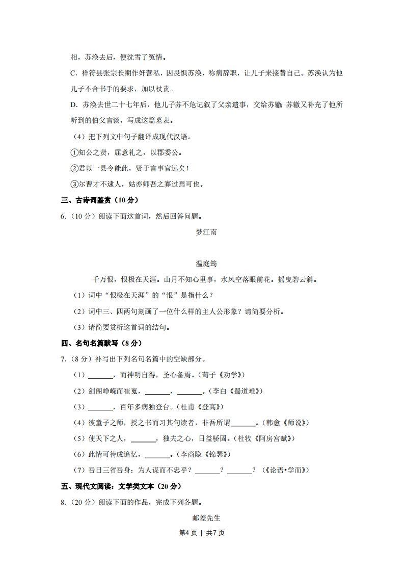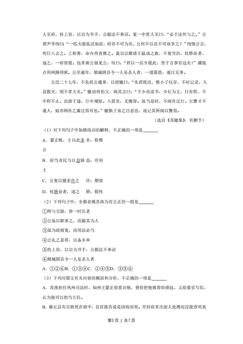 2012年江苏省高考语文试卷一、语言文字运用(15分)1.(3分)下列词语中加横线的字,每对读音都相同的一组是()A.舟楫/编辑道观冠名权灏临/彬彬有礼B.蹒逊/缰瑚嫁接/度假村布皛/并行不樘C.匮服/拍摄昭示/软着陆荒诞/肆无忌惮D.任悔/阡陌储蓄/处方药复壁/刚愎自用2.(3分)在下面一段话括号中依次填入成语,最恰当的一组是()笔名满天下而原名湮没无闻者,事实上等于()人家给咱们介绍一位沈雁冰先生,不如介绍茅盾来得响亮:介绍一位谢婉莹女士,不如介绍冰心来得()等到自己也肯公然承认名叫茅盾或冰心的时候,仍不失为行不更名、坐不改姓的好汉。千秋万岁后,非但真假难辨,而且()A.改名换姓大名鼎鼎弄巧成拙B.移花接木如雷贯耳弄巧成拙C.改名换姓如雷贯耳弄假成真D.移花接木大名鼎鼎弄假成真3.(4分)请以平实的语言表述下面材料中老园艺师一段话的深层含意,不超过25个字。夜幕下,小松树上彩灯闪烁。路过的老园艺师自言自语地感慨:“人睡觉要关灯,整夜灯光照着,非失眠不可。树也一样,那么多的电线缠着,那么强的灯光照着,能活得好吗?夜色是美了,树可是要生病的。人们啊,要听得懂草木的叹息!”4.(5分)阅读漫画,在横线上写出合适的一句话。第1页1共7页好好,爸听你的!我要…这幅漫画形象地提醒人们:二、文言文阅读(19分)5.(19分)阅读下面的文言文,完成下列各题。伯父墓表苏辙公讳涣,始字公群,晚字文父。少颖悟,所与交游,皆一时长老。天圣元年,始就乡试。明年登科,为风翔宝鸡主簿。未几,移凤州司法。王蒙正为风州,以章献太后姻家,怙势骄横。知公之贤,屈意礼之,以郡委公。公虽以职事之,而鄙其为人。蒙正尝荐公于朝,复以书抵要官,论公可用。公喻郡邸吏,屏其奏而藏其私书。未几,蒙正败,士以此多公。以太夫人忧去官。起为开封士曹。雍丘民有狱死者,县畏罪,以疾告。府遣吏治之,阅数人不能究。及公往,遂直其冤。夏人犯边,府当市民马以益骑士,尹以诿公,马尽得而民不扰。通判阆州。虽为政极宽,而用法必当,吏民畏而安之。阀人鲜于侁,少而好学笃行,公礼之甚厚,以备乡举,侁以获仕进。其始为吏,公复以循吏许之,侁仕至谏议大夫,号为名臣。选知祥符。乡书手张宗久为奸利,畏公,托疾满百日去,而引其子为代。公曰日:“书手法用三等人,汝等第二,不可。”宗素事权贵,诉于府。府为符县,公杖之。己而中贵第2页|共7页人至府,传上旨,以宗为书手,公据法不奉诏。复一中贵人至曰:“必于法外与之。”公谓尹李绚日“一匹夫能乱法如此,府亦不可为矣,公何不以县不可故争之?”绚愧公言,明日入言之。上称善,命内侍省推之。盖宗以赂请于温成之族,不复穷治,杖矫命者,逐之,一府皆震。包孝肃公拯见公,叹日:“君以一县令能此,贤于言事官远矣!”擢提点利州路刑狱。公至逾年,劾城固县令一人妄杀人者,一道震恐,遂以无事。公没二十七年,不危状公遗事,以授辙曰:“先君既没,惟小子仅存,不时记录,久益散灭,则不孝大矣。”辙幼侍伯父,闻其言曰:“予少而读书,少长为文,日有程,不中程不止。出游于途,行中规矩。入居室,无惰容。故当是时,不闻有过行。尔曹才不速人,姑亦师语之寡过焉可也。”辙惧子弟之日怠也,故记其所闻以警焉。(选自《苏辙集》,有删节)(1)对下列句子中加横线词的解释,不正确的一项是」A.蒙正败,士以此多多:称赞公B.府当市民马以益骑益:有利士C.公复以循吏许之许:期望D.杖钲命者,逐之矫:假传(2)下列句子中,全都表现苏涣为官公正的一组是」①所与交游,皆一时长老②公虽以职事之,而鄙其为人③虽为政极宽,而用法必当④公礼之甚厚,以备乡举⑤传上旨,以宗为书手,公据法不奉诏⑥劾城固县令一人妄杀人者A.①②⑥B.①③④C.②④⑤D.③⑤⑥(3)下列对原文有关内容的概括和分析,不正确的一项是A.苏涣担任凤州司法时,知州王蒙正很赏识他,曾经把他推荐给朝廷,又给要官写信,认为他可以担当大任。B.雍丘县有百姓死在狱中,县官报告说是因病而死。开封府多次派人处理而没能查明真第3页丨共7页