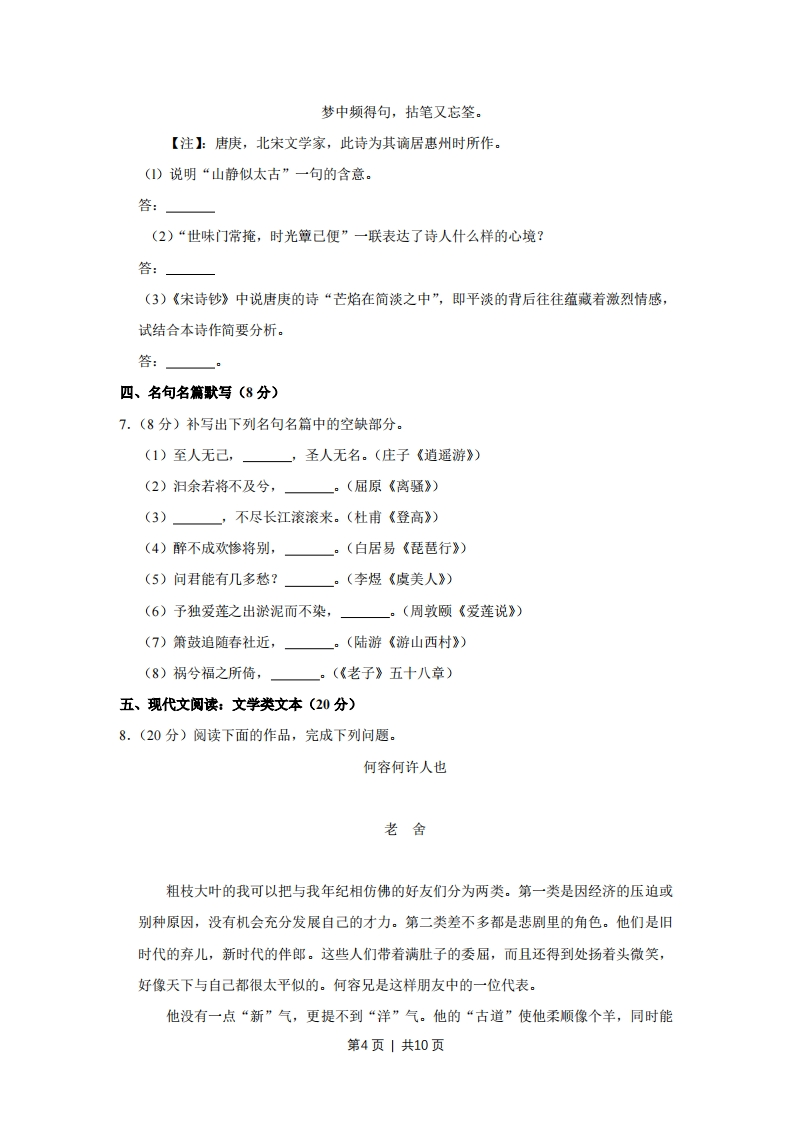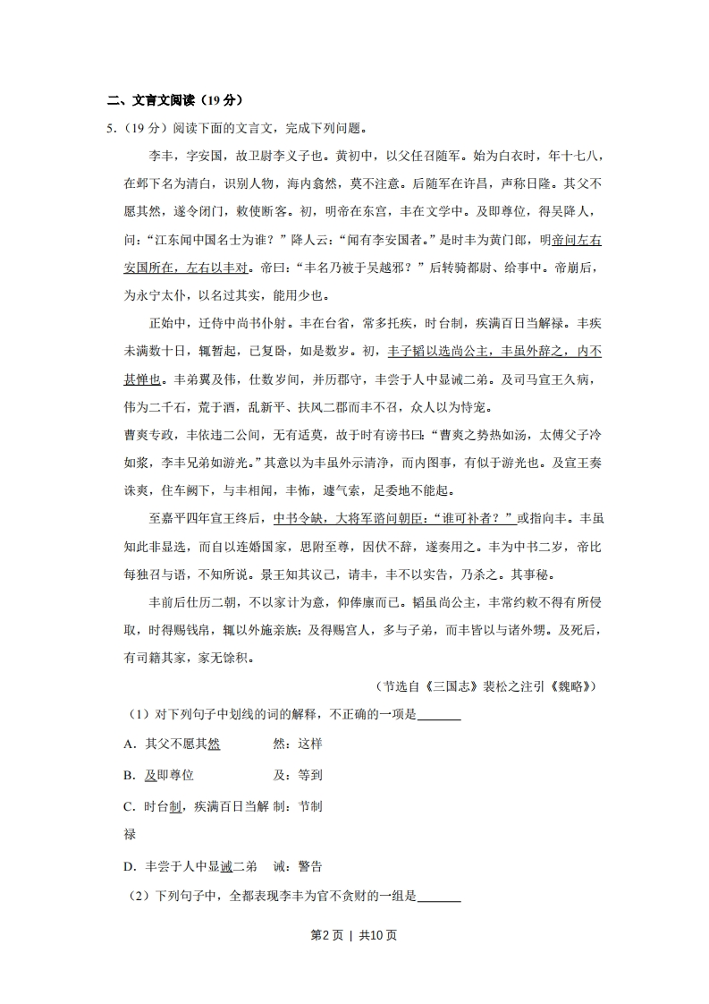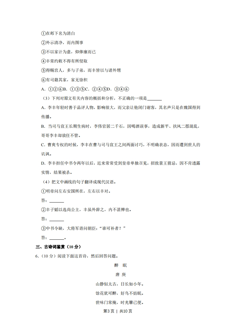 2013年江苏省高考语文试卷一、语言文字运用(15分)1.(3分)下列词语中划线的字,读音全都相同的一组是()A,高立引吭高歌位俪泣瀣一气B.稂莠锒铛入狱闼苑书声琅琅C.孩提骇人听闻尸骸言简意赅D.馈赠功亏一篑匮乏振聋发聩2.(3分)在下列句子的空缺处依次填入成语,最恰当的一组是()(1)读者欣赏作品清新的故事,却忽略了蕴藏的热情,欣赏文字的朴实,却忽略了作品隐伏的悲痛,实际上近于一。(2)中国古代文化是一座巍峨的高峰,不管我们在儒、释、道哪一条路上行走,最终都必然会在山顶上相逢。(3)多年前,集团首席执行官就感觉自己一,在集团迅猛发展、国际市场不断拓展的今天,他的危机感丝毫未减。A.南辕北辙异曲同工如临深渊B.买椟还珠殊途同归如履薄冰C.南辕北辙殊途同归如履薄冰D.买椟还珠异曲同工如临深渊3.(4分)请以平实的语言表述下面材料中画线句子的含意,不超过15个字。有个青年人总是抱怨环境,一位长者对他说:“你想保护自己的脚,穿上一双鞋子比给全世界铺上地毯更容易做到。”答:4.(5分)有研究者对200多位作家从发表处女作和代表作的年龄两个方面进行了统计。比较图表中两组数据,从作家渐至成熟的角度归纳出一个结论。作品20岁前21~2526-3031-3536-4041-45人数岁岁岁岁岁年龄处女作72人95人36人7人代表作8人31人96人50人25人第1页|共10页二、文言文阅读(19分)5.(19分)阅读下面的文言文,完成下列问题。李丰,字安国,故卫尉李义子也。黄初中,以父任召随军。始为白衣时,年十七八,在邺下名为清白,识别人物,海内翕然,莫不注意。后随军在许昌,声称日隆。其父不愿其然,遂令闭门,敕使断客。初,明帝在东宫,丰在文学中。及即尊位,得吴降人,问:“江东闻中国名士为谁?”降人云:“闻有李安国者。”是时丰为黄门郎,明帝问左右安国所在,左右以主对。帝曰:“丰名乃被于吴越邪?”后转骑都尉、给事中。帝崩后,为永宁太仆,以名过其实,能用少也。正始中,迁侍中尚书仆射。丰在台省,常多托疾,时台制,疾满百日当解禄。丰疾未满数十日,辄暂起,己复卧,如是数岁。初,丰子韬以选尚公主,丰虽外辞之,内不甚惮也。丰弟翼及伟,仕数岁间,并历郡守,丰尝于人中显诫二弟。及司马宣王久病,伟为二千石,荒于酒,乱新平、扶风二郡而丰不召,众人以为恃宠。曹爽专政,丰依违二公间,无有适莫,故于时有谤书日“曹爽之势热如汤,太傅父子冷如浆,李丰兄弟如游光。”其意以为丰虽外示清净,而内图事,有似于游光也。及宣王奏诛爽,住车阙下,与丰相闻,丰怖,遽气索,足委地不能起。至嘉平四年宣王终后,中书令缺,大将军谘问朝臣:“谁可补者?”或指向丰。丰虽知此非显选,而自以连婚国家,思附至尊,因伏不辞,遂奏用之。丰为中书二岁,帝比每独召与语,不知所说。景王知其议己,请丰,丰不以实告,乃杀之。其事秘。丰前后仕历二朝,不以家计为意,仰俸廪而己。韬虽尚公主,丰常约敕不得有所侵取,时得赐钱帛,辄以外施亲族:及得赐宫人,多与子弟,而丰皆以与诸外甥。及死后,有司籍其家,家无馀积。(节选自《三国志》裴松之注引《魏略》)(1)对下列句子中划线的词的解释,不正确的一项是」A.其父不愿其然然:这样B.及即尊位及:等到C.时台趔,疾满百日当解制:节制禄D.丰尝于人中显诚二弟诫:警告(2)下列句子中,全都表现李丰为官不贪财的一组是第2页1共10页①在邺下名为清白②外示清净,而内图事③不以家计为意,仰俸廪而己④丰常约敕不得有所侵取⑤得赐宫人,多与子弟,而丰皆以与诸外甥⑥有司籍其家,家无馀积A.①②⑥B.①③⑤C.②④⑤D.③④⑥(3)下列对原文有关内容的概括和分析,不正确的一项是A,李丰年轻时善于品评人物,影响很大,而父亲让他闭门谢客,其名声只是在魏国得到传播。B.当司马宣王长期生病时,李伟官居二千石,因喝酒误事,造成新平、扶风二郡混乱,哥哥李丰却放任不管。C.曹爽专权的时候,李丰在曹与司马宣王之间两面讨巧,不明确表态,因而遭到世人的讥讽。D.李丰担任中书令两年以后,近来常常受到皇帝单独召见,招致景王猜忌,因不肯透露实情,结果被杀。(4)把文中画线的句子翻译成现代汉语。①明帝问左右安国所在,左右以丰对。答:②丰子韬以选尚公主,丰虽外辞之,内不甚惮也。答③中书令缺,大将军谘问朝臣:“谁可补者?”答:三、古诗词鉴赏(10分)6.(10分)阅读下面这首诗,然后回答问题。醉眠唐庚山静似太古,日长如小年。馀花犹可醉,好鸟不妨眠。世味门常掩,时光簟己便。第3页|共10页