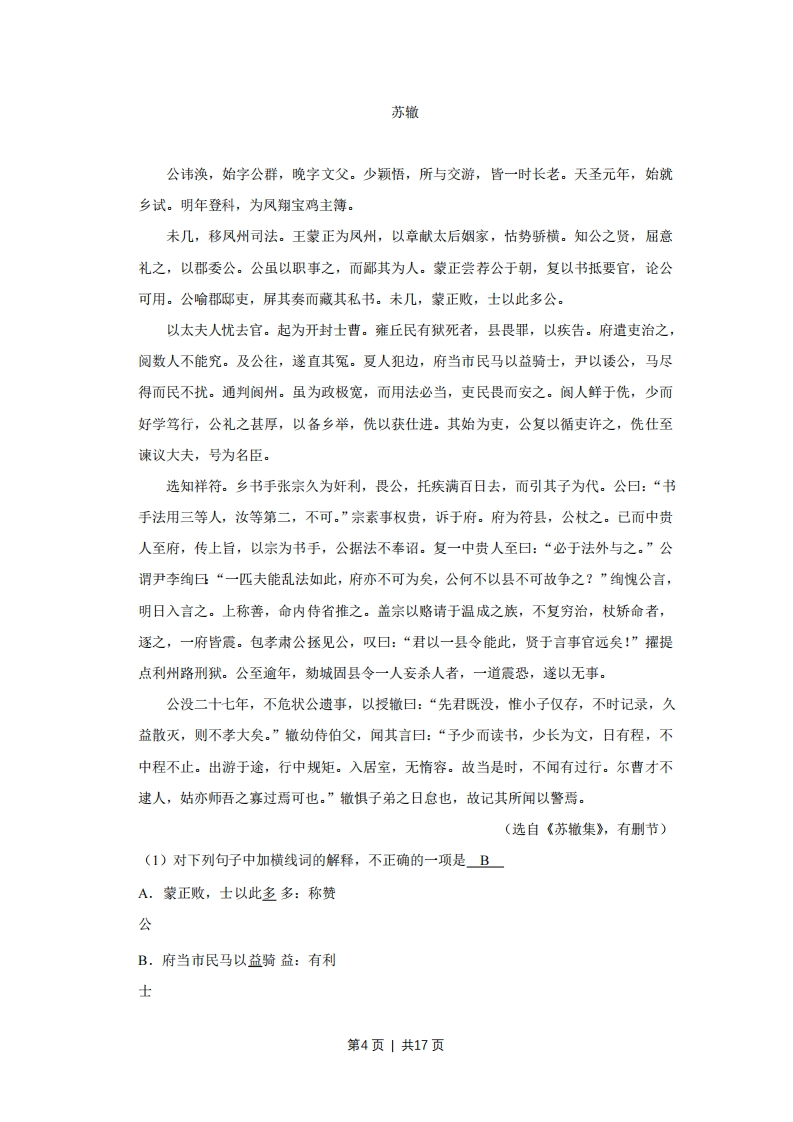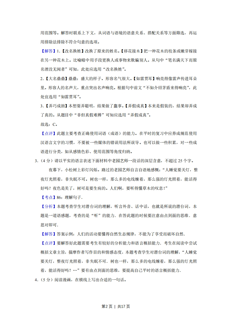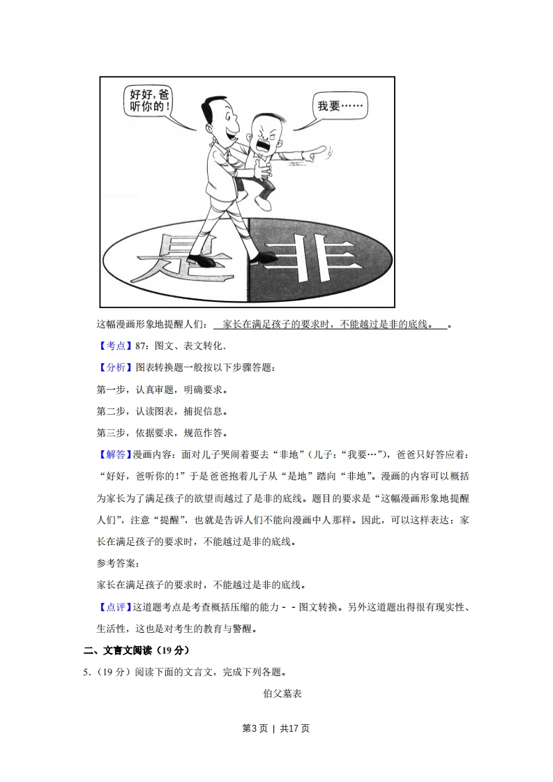 2012年江苏省高考语文试卷解析版事考答案与试题佩折一、语言文字运用(15分)1.(3分)下列词语中加横线的字,每对读音都相同的一组是()A.舟楫/编辑道观冠名权题临/彬彬有礼B.蹒跚/缰瑚嫁接/度假村布晶/并行不悖C.慑服/拍摄照示/软羞陆荒诞/肆无忌惮D.任悔/阡陌储蓄/处方药复辟/刚愎自用【考点】11:字音,【分析】本题主要考查形近字、同音字的读音,解答这种题目要注意出题者设置的陷阱,许多形同的字,音不一定相同,靠平时记忆为主,实在不能辨别的可以用排除法,【解答】A项全部相同j1 guan binB项“帛(bo)”与“悖(bei)”读音不同,其余相同,读shan jiaC项“昭(zhdo)”与“着(zhuo)”读音不同,其余相同,读shedanD项“忏(chdn)”与“阡(qidn)”读音不同,其余相同,读chǔbi故选:A【点评】字音题主要考查学生对多音字、形声字、形近字的辨识,而且是对常用字的易错音考查得比较多.所以,平时一定要注意对一些常用字的不常见读音的识记2.(3分)在下面一段话括号中依次填入成语,最恰当的一组是()笔名满天下而原名湮没无闻者,事实上等于()人家给咱们介绍一位沈雁冰先生,不如介绍茅盾来得响亮:介绍一位谢婉莹女士,不如介绍冰心来得()等到自己也肯公然承认名叫茅盾或冰心的时候,仍不失为行不更名、坐不改姓的好汉。千秋万岁后,非但真假难辨,而且()A.改名换姓大名鼎鼎弄巧成拙B.移花接木如雷贯耳弄巧成拙C.改名换姓如雷贯耳弄假成真D.移花接木大名鼎鼎弄假成真【考点】18:成语【分析】解答此题的关键是掌握成语的意思,正确辨别他们的感情色彩、修饰对象、使第1页1共17页用范围等。解答时联系上下文,从词语与语境的语意关系、搭配关系等方面筛选,再运用排除法排除不符合句意的选项。【解答】1.【改名换姓】改换了原来的姓名。【移花接木】把一种花木的枝条或嫩芽嫁接在另一种花木上。比喻暗中用手段更换人或事物来欺骗别人。从句中“笔名满天下而原名湮没无闻者”可知,此处应选用“改名换姓”。2.【大名鼎鼎】鼎鼎:盛大的样子。形容名气很大。【如雷贯耳】响亮得像雷声传进耳朵里。形容人的名声大,重点突出名声响亮。根据句中前文“不如介绍茅盾来得响亮”,此处宜选用“如雷贯耳”。3.【弄巧成拙】本想耍弄聪明,结果做了蠢事。【弄假成真】本来是假装的,结果却弄成了真的。从题目中“非但真假难辨”可知应选用“弄假成真”。故选:C。【点评】此题主要考查正确使用词语(成语)的能力。在平时的复习中应养成规范使用汉语言文字的习惯,不要被一些媒体的错误用法所误导。也可以做一些积累,对一些成语进行分类,如从感情色彩、使用范围等角度归纳。3.(4分)请以平实的语言表述下面材料中老园艺师一段话的深层含意,不超过25个字。夜幕下,小松树上彩灯闪烁。路过的老园艺师自言自语地感慨:“人睡觉要关灯,整夜灯光照着,非失眠不可。树也一样,那么多的电线缠着,那么强的灯光照着,能活得好吗?夜色是美了,树可是要生病的。人们啊,要听得懂草木的叹息!”【考点】86:理解句子【分析】本题考查学生对潜台词的理解,听言外音、话中话,也就是所说的潜台词,本题是一道语感题,考查的是“听”的能力.在答此题的时候要注意由点到面的思维.意思对即可.【解答】答案示例:人们的活动要懂得自然生态规律,不能为了享受而破坏自然【点评】要解答好此题需要考生有较好的分析能力和语言概括能力.考生在阅读中尝试概括文章主旨,揣摩作者写作目的和情感态度,本题考查学生对潜台词的理解,“人睡觉要关灯,整夜灯光照着,非失眠不可.树也一样,那么多的电线缠着,那么强的灯光照着,能活得好吗?…”要有由点到面的思维,要提高自己平时的语言概括能力4.(5分)阅读漫画,在横线上写出合适的一句话。第2页|共17页好好,爸听你的!我要…这幅漫画形象地提醒人们:家长在满足孩子的要求时,不能越过是非的底线。。【考点】87:图文、表文转化【分析】图表转换题一般按以下步骤答题:第一步,认真审题,明确要求。第二步,认读图表,捕捉信息。第三步,依据要求,规范作答。【解答】漫画内容:面对儿子哭闹着要去“非地”(儿子:“我要…”),爸爸只好答应着:“好好,爸听你的!”于是爸爸抱着儿子从“是地”踏向“非地”。漫画的内容可以概括为家长为了满足孩子的欲望而越过了是非的底线。题目的要求是“这幅漫画形象地提醒人们”,注意“提醒”,也就是告诉人们不能向漫画中人那样。因此,可以这样表达:家长在满足孩子的要求时,不能越过是非的底线。参考答案:家长在满足孩子的要求时,不能越过是非的底线。【点评】这道题考点是考查概括压缩的能力~~图文转换。另外这道题出得很有现实性、生活性,这也是对考生的教育与警醒。二、文言文阅读(19分)5.(19分)阅读下面的文言文,完成下列各题。伯父墓表第3页|共17页