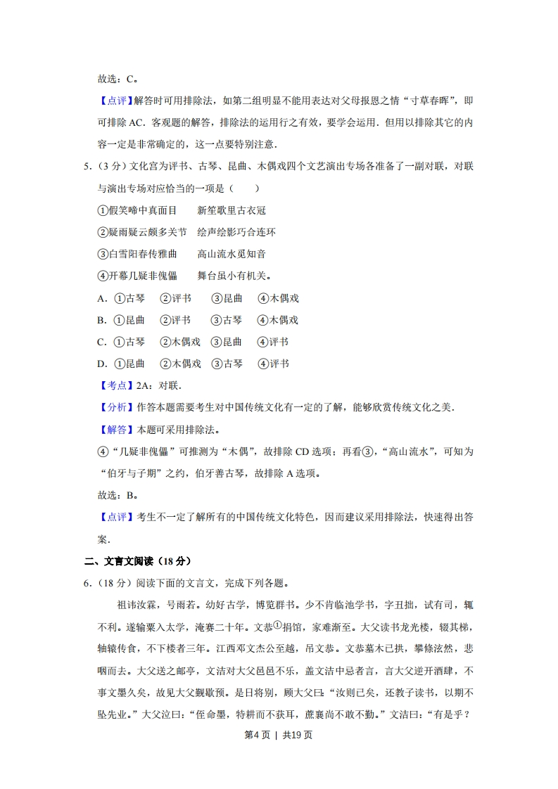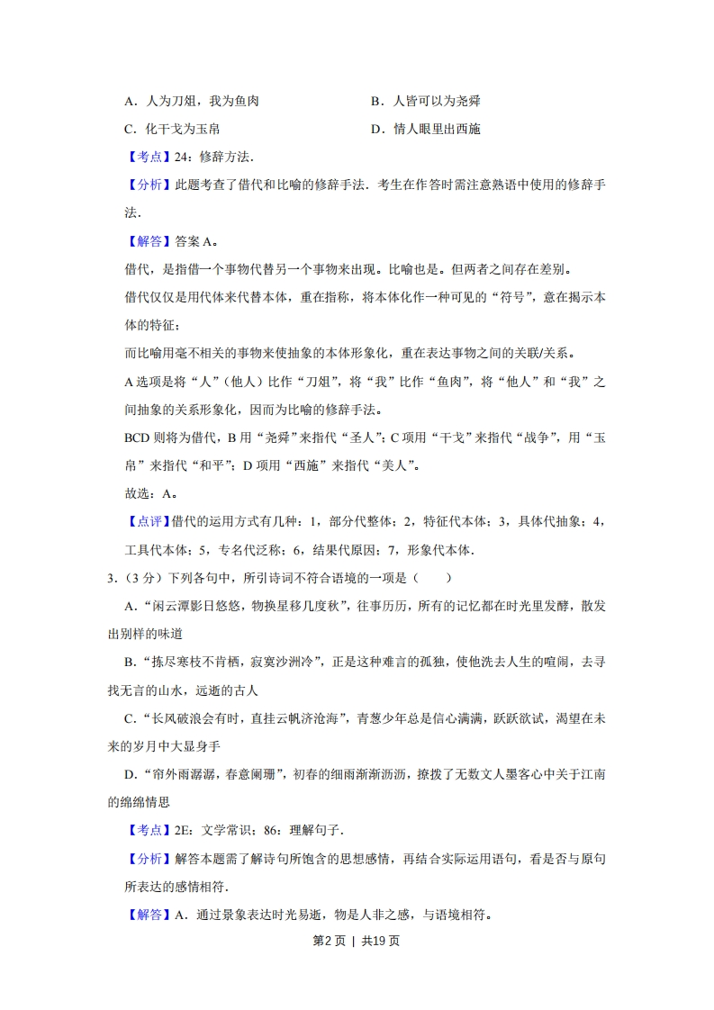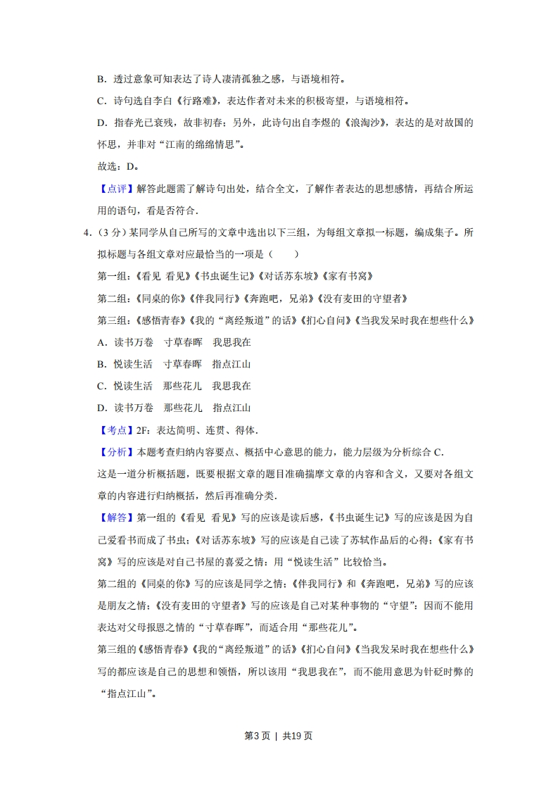 2016年江苏省高考语文试卷解析版事考答案与试题佩析一、语言文字运用(15分)1.(3分)在下面一段话的空缺处依次填入词语,最恰当的一组是()人人都希望自己一,却很少有人能沉静下来用心对待生活。其实生活很你是不是诚心待它,它一眼就能分辨出来。你越,越想得到,距离目标就越远:你努力振作,默默耕耘,惊喜往往就会悄然而至。A.与众不同机敏焦躁B.与众不同敏锐浮躁C.标新立异机敏浮躁D.标新立异敏锐焦躁【考点】13:字义、词义辨析:19:词语(熟语)使用.【分析】本题考查词语的辨析,考生在作答前需在理解词义的基础上结合上下文语意,选择合适的词语.【解答】①与众不同:跟大家不一样:标新立异:提出新奇的主张,表示与众不同。带有贬义色彩。②机敏:强调洞察力,机警敏锐,对情况的变化觉察得快:或形容动作敏捷。敏锐:强调观察者本身,反应灵敏,目光尖锐。③焦躁:指恼怒,焦急而烦躁,一般指情绪。浮躁:指急躁,不沉稳,一般指做事和心态。①强调“与其他人不一样”,并非强调“观点、主张”,不能用带贬义的“标新立异”:②强调观察者本身,形容目光尖锐·-它一眼就能分辨出来,因而为“敏锐”:③强调面对生活心态急躁,没有情感恼怒的意思,因而为“浮躁”。故选:B。【点评】解答词义辨析类的题目,需注意词义适用的对象和含义,这样更容易得出恰当的答案2.(3分)下列熟语中,没有使用借代手法的一项是()第1页|共19页A,人为刀俎,我为鱼肉B.人皆可以为尧舜C.化干戈为玉帛D.情人眼里出西施【考点】24:修辞方法.【分析】此题考查了借代和比喻的修辞手法.考生在作答时需注意熟语中使用的修辞手法。【解答】答案A。借代,是指借一个事物代替另一个事物来出现。比喻也是。但两者之间存在差别。借代仅仅是用代体来代替本体,重在指称,将本体化作一种可见的“符号”,意在揭示本体的特征:而比喻用毫不相关的事物来使抽象的本体形象化,重在表达事物之间的关联/关系。A选项是将“人”(他人)比作“刀俎”,将“我”比作“鱼肉”,将“他人”和“我”之间抽象的关系形象化,因而为比喻的修辞手法。BCD则将为借代,B用“尧舜”来指代“圣人”:C项用“干戈”来指代“战争”,用“玉帛”来指代“和平”:D项用“西施”来指代“美人”。故选:A。【点评】借代的运用方式有几种:1,部分代整体:2,特征代本体:3,具体代抽象:4,工具代本体:5,专名代泛称:6,结果代原因:7,形象代本体.3.(3分)下列各句中,所引诗词不符合语境的一项是()A.“闲云潭影日悠悠,物换星移几度秋”,往事历历,所有的记忆都在时光里发酵,散发出别样的味道B.“拣尽寒枝不肯栖,寂寞沙洲冷”,正是这种难言的孤独,使他洗去人生的喧闹,去寻找无言的山水,远逝的古人C.“长风破浪会有时,直挂云帆济沧海”,青葱少年总是信心满满,跃跃欲试,渴望在未来的岁月中大显身手D.“帘外雨潺潺,春意阑珊”,初春的细雨渐渐沥沥,撩拨了无数文人墨客心中关于江南的绵绵情思【考点】2E:文学常识:86:理解句子.【分析】解答本题需了解诗句所饱含的思想感情,再结合实际运用语句,看是否与原句所表达的感情相符【解答】A.通过景象表达时光易逝,物是人非之感,与语境相符。第2页1共19页B.透过意象可知表达了诗人凄清孤独之感,与语境相符。C.诗句选自李白《行路难》,表达作者对未来的积极寄望,与语境相符。D.指春光己衰残,故非初春:另外,此诗句出自李煜的《浪淘沙》,表达的是对故国的怀思,并非对“江南的绵绵情思”。故选:D。【点评】解答此题需了解诗句出处,结合全文,了解作者表达的思想感情,再结合所运用的语句,看是否符合。4.(3分)某同学从自己所写的文章中选出以下三组,为每组文章拟一标题,编成集子。所拟标题与各组文章对应最恰当的一项是()第一组:《看见看见》《书虫诞生记》《对话苏东坡》《家有书窝》第二组:《同桌的你》《伴我同行》《奔跑吧,兄弟》《没有麦田的守望者》第三组:《感悟青春》《我的“离经叛道”的话》《扪心自问》《当我发呆时我在想些什么》A.读书万卷寸草春晖我思我在B.悦读生活寸草春晖指点江山C.悦读生活那些花儿我思我在D.读书万卷那些花儿指点江山【考点】2F:表达简明、连贯、得体【分析】本题考查归纳内容要点、概括中心意思的能力,能力层级为分析综合C这是一道分析概括题,既要根据文章的题目准确揣摩文章的内容和含义,又要对各组文章的内容进行归纳概括,然后再准确分类。【解答】第一组的《看见看见》写的应该是读后感,《书虫诞生记》写的应该是因为自己爱看书而成了书虫:《对话苏东坡》写的应该是自己读了苏轼作品后的心得:《家有书窝》写的应该是对自己书屋的喜爱之情:用“悦读生活”比较恰当。第二组的《同桌的你》写的应该是同学之情:《伴我同行》和《奔跑吧,兄弟》写的应该是朋友之情:《没有麦田的守望者》写的应该是自己对某种事物的“守望”:因而不能用表达对父母报恩之情的“寸草春晖”,而适合用“那些花儿”。第三组的《感悟青春》《我的“离经叛道”的话》《扪心自问》《当我发呆时我在想些什么》写的都应该是自己的思想和领悟,所以该用“我思我在”,而不能用意思为针砭时弊的“指点江山”。第3页|共19页