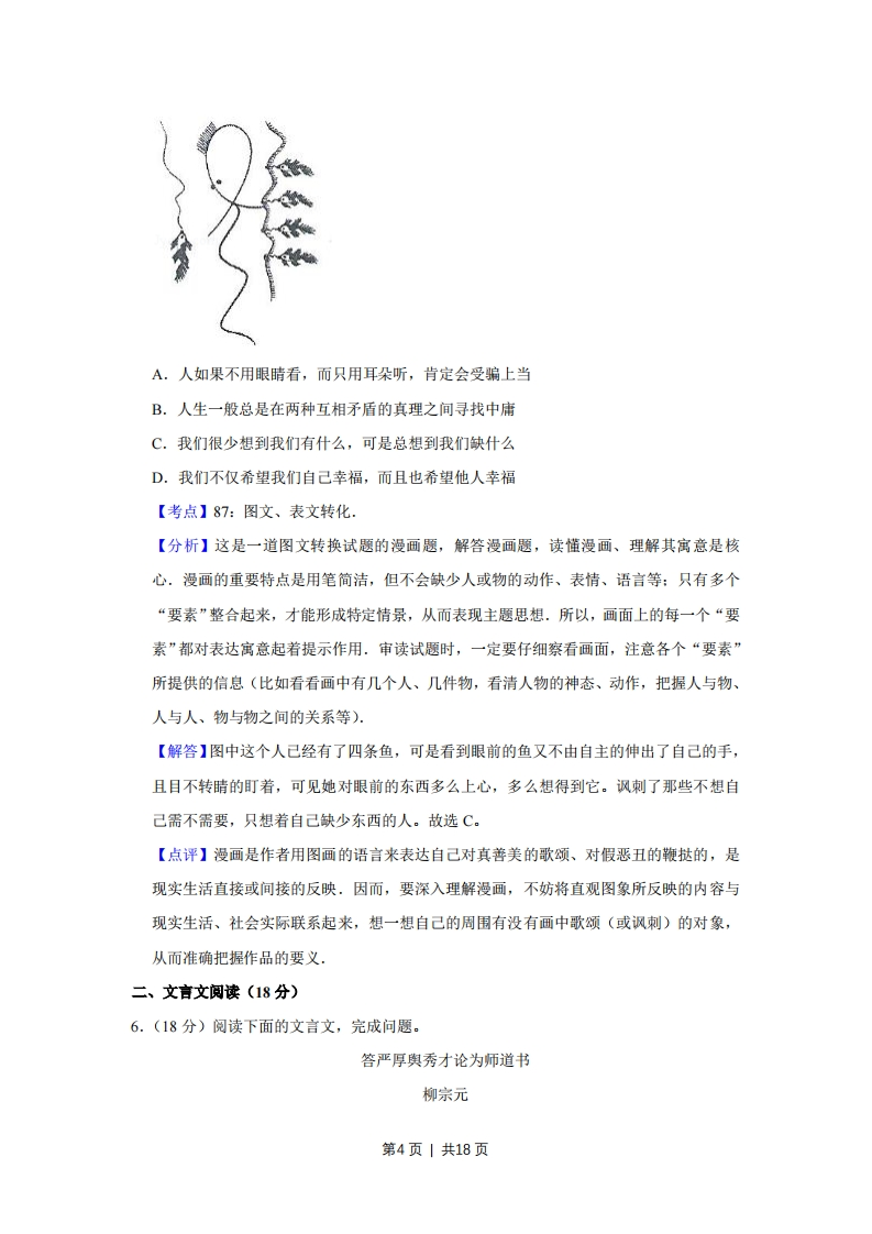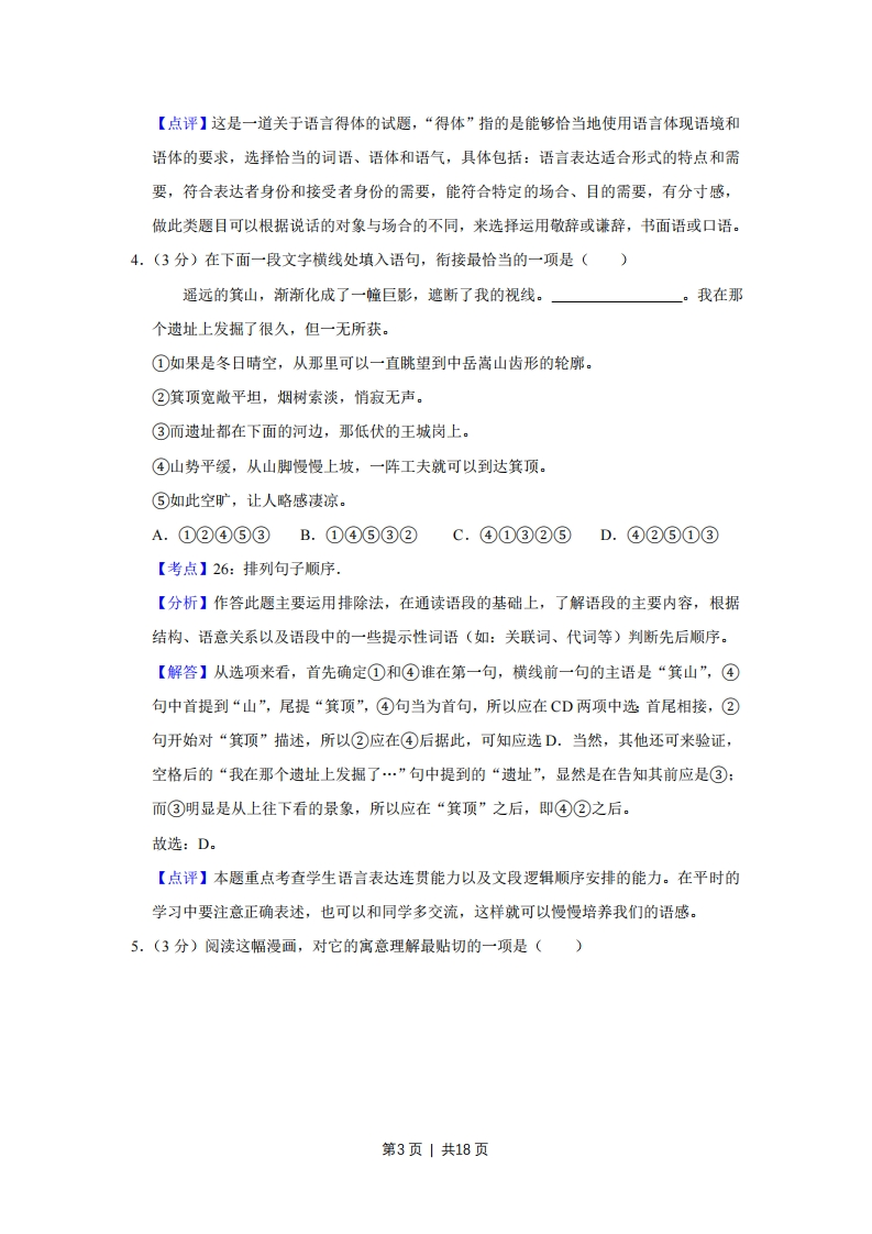 2014年江苏省高考语文试卷解析版事考答案与试题佩折一、语言文字运用(15分)1.(3分)在下面一段话空缺处依次填人词语,最恰当的一组是()最使我艳羡的还是园林艺术家化平淡为神奇的·某些树木当植当伐:某些花卉当疏当密:何处须巧借地形,顺势筑坡:何处又宜少见轩敞,:所有这一切都煞费心血,但又不露惨淡经营的痕迹,正像一帧名作脱稿前画师那奇绝而的点睛之笔。A.用心别树一帜浑成B.匠心别树一帜饱满C.匠心别有洞天浑成D.用心别有洞天饱满【考点】13:字义、词义辨析:19:词语(熟语)使用.【分析】解答此题的关键是掌握相似、相近词语在意思上的细微差别,正确辨别他们的感情色彩、修饰对象、使用范围等。解答时联系上下文,从词语与语境的语意关系、搭配关系等方面筛选,再运用排除法排除不符合句意的选项,【解答】匠心,一指文学艺术上的构思,二指工匠的心思,常指文学艺术方面创造性的构思。用心,指集中注意力:使用心力:专心。别有洞天:洞中另有一个天地。形容风景奇特,引人入胜。也谓尘世之外,另有仙境。别树一帜:比喻另创一家或另创局面。浑成(1)。天然生成。(2)。常形容文学艺术作品等自然,浑然一体,不见雕凿的痕迹。饱满(1)丰满:充实(2)充满感情的。依据语段中的“艺术家”“神奇”“煞费心血”“不露痕迹”“奇绝”等字眼,第一空应选填“匠心”一词,突出“巧”字:“园林”是风景胜地,所以排除“别树一帜”:“点睛之笔”不能用“饱满”一词来修饰,因为“点晴之笔”所用之笔墨少而恰到好处,不是描绘。故选:C。【点评】此题主要考查正确使用词语(成语)的能力,在平时的复习中应养成规范使用汉语言文字的习惯,不要被一些媒体的错误用法所误导,2.(3分)下列诗句与“墙头雨细垂纤草”对仗工整的一项是()A.水面风回聚落花B.数峰无语立斜阳第1页1共18页C.楼上春容带雨来D.蝉曳残声过别枝【考点】2A:对联.【分析】本题是个综合性的考查,既考对联常识,也考了对仗和词性的相关知识,但难度不大.对仗最主要的词性相对,即名词对名词,动词对动词,形容词对形容词等:结构对结构(主谓、动宾、定中等),【解答】例句:“墙头雨细垂纤草”:“墙头”是名词性偏正结构。“雨细”是主谓结构短语,“垂纤草”是动宾结构短语。A.“水面风回聚落花”:“水面”是名词性偏正结构短语,“风回”是主谓结构短语,“聚落花”是动宾结构短语,和例句是一样的结构。B.“数峰无语立斜阳”:“数峰”名词性偏正结构短语,但“数”是数词不能和名词“墙”相对应,“无语”是偏正结构动词短语,“立斜阳”是动宾结构短语。C.“楼上春容带雨来”:“楼上”是名词性偏正结构短语,“春容”是偏正结构名词短语,“带雨来”动宾结构短语。D.“蝉曳残声过别枝”:“蝉曳”是主谓结构短语,“残声”偏正结构名词短语,“过别枝”是动宾结构短语。故选:A。【点评】本体重点考查对联常识以及相关的词性知识.了解句子的基本结构以及相关的词性知识是解决此题的关键,3.(3分)下列交际用语使用不得体的一项是()A.涂鸦之作,不足当先生一晒,如蒙赐正,小子不胜感激!B.欣闻敝校百年校庆,本人泰为校友,因事不能躬临为歉!C.吉日良辰,花好月圆,恭祝一对璧人并蒂同心、白首偕老!D.家母古稀之庆,承蒙各位亲友光临,略备薄酒,敬答厚意!【考点】2F:表达简明、连贯、得体【分析】本题考查语言表达的得体的能力,能力层次为E级(表达运用)。【解答】B、“敝”是谦辞,用于与自己有关的事物,而不能用于他人或相关事物。校友之间称自己的学校,不能说“敝校”,应将“敝校”改为“母校”,但不能改为“贵校”。如果向非校友介绍自己的学校,可用“敝校”,以示谦虚。故选:B。第2页|共18页【点评】这是一道关于语言得体的试题,“得体”指的是能够恰当地使用语言体现语境和语体的要求,选择恰当的词语、语体和语气,具体包括:语言表达适合形式的特点和需要,符合表达者身份和接受者身份的需要,能符合特定的场合、目的需要,有分寸感,做此类题目可以根据说话的对象与场合的不同,来选择运用敬辞或谦辞,书面语或口语。4.(3分)在下面一段文字横线处填入语句,衔接最恰当的一项是()遥远的箕山,渐渐化成了一幢巨影,遮断了我的视线。。我在那个遗址上发掘了很久,但一无所获。①如果是冬日晴空,从那里可以一直眺望到中岳嵩山齿形的轮廓。②箕顶宽敞平坦,烟树索淡,悄寂无声。③而遗址都在下面的河边,那低伏的王城岗上。④山势平缓,从山脚慢慢上坡,一阵工夫就可以到达箕顶。⑤如此空旷,让人略感凄凉。A.①②④⑤③B.①④⑤③②C.④①③②⑤D.④②⑤①③【考点】26:排列句子顺序.【分析】作答此题主要运用排除法,在通读语段的基础上,了解语段的主要内容,根据结构、语意关系以及语段中的一些提示性词语(如:关联词、代词等)判断先后顺序。【解答】从选项来看,首先确定①和④谁在第一句,横线前一句的主语是“箕山”,④句中首提到“山”,尾提“箕顶”,④句当为首句,所以应在CD两项中选首尾相接,②句开始对“箕项”描述,所以②应在④后据此,可知应选D.当然,其他还可来验证,空格后的“我在那个遗址上发掘了…”句中提到的“遗址”,显然是在告知其前应是③:而③明显是从上往下看的景象,所以应在“箕顶”之后,即④②之后。故选:D【