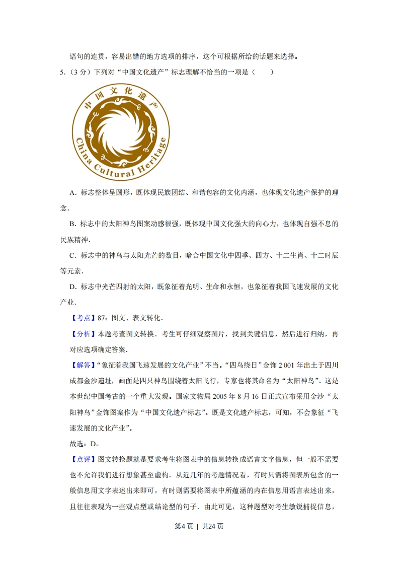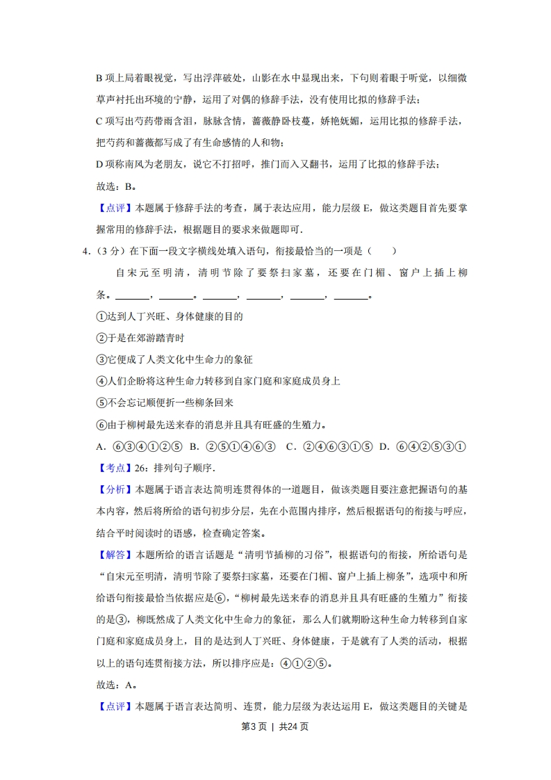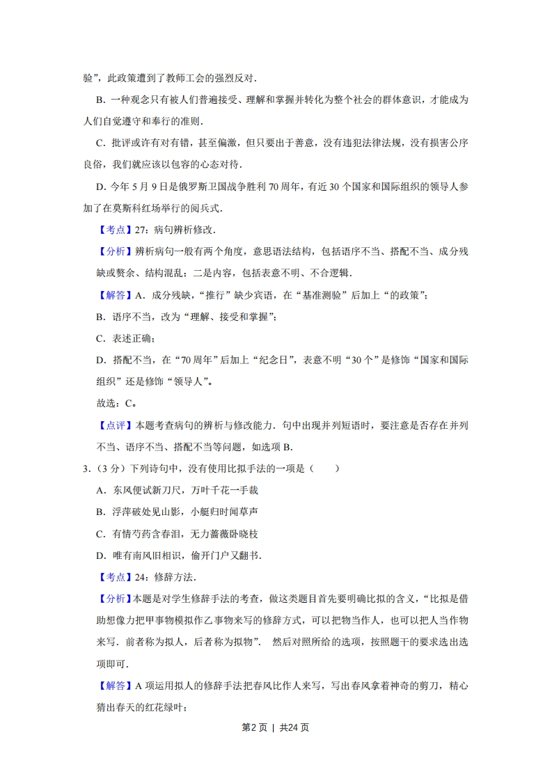 2015年江苏省高考语文试卷事考答案与试题佩析一、语言文字运用(15分)1.(3分)在下面一段话空缺处依次填入词语,最恰当的一组是()书是整个人类的记忆。没有书,也许历史还在混沌未开的蒙味中。读书,让绵延的时光穿越我们的身体,让几千年来的智慧在我们每一个人的血液里汩汩流淌。读书,不仅需要的精神,还需要懂得快慢精粗之分。A.徘徊积聚宵衣旰食B.徘徊积淀废寝忘食C.踟蹰积淀宵衣旰食D.踟蹰积聚废寝忘食【考点】13:字义、词义辨析.【分析】本题一道考查词语辨析的题目,考点定位正确使用词语(包括熟语),能力层级为表达运用E做该题首先要明确词义,近义词的运用是常考点.辨析近义词的基本原则是同中求异,做本题,首先要明确词义,其次辨明区别,然后根据语境要求选择适合词语.徘徊:①在一个地方来回地走:②比喻犹豫不决:③比喻事物在某个范围内来回浮动、起伏.踯躅:心里迟疑,要走不走的样子.积聚:积累.积淀:积累沉淀,多指文化、知识、经验等.宵衣旰食:天不亮就穿衣起来,天黑了才吃饭,形容勤于政务.废寝忘食:顾不得睡觉,忘记了吃饭,形容非常专心努力.【解答】“历史还在混沌未开的蒙味中”如何,显然不是心里迟疑,也不是犹豫不决,而是在“混沌未开的蒙味”这个范围中浮动、起伏,所以第一空处填“徘徊”。“积聚”贝是一个动作,具有即时性而“积淀”具有历史性,正好与“几千年”相应,所以第二空填“积淀”。读书不是“政务”,所以第三空填“废寝忘食”。故选:B。【点评】本题一道考查词语辨析,此类题关键在于词语的积累,辨明同义词、近义词的区别,注意词语运用时具体语境要求的具体对象、范围、轻重,多阅读,培养语感也是提升辨析能力的有效途径。2.(3分)下列各句中,没有语病的一项是()A.英国政府计划从今年9月开始,推行4到5岁幼童将接受语文和算术能力的“基准测第1页|共24页验”,此政策遭到了教师工会的强烈反对.B.一种观念只有被人们普遍接受、理解和掌握并转化为整个社会的群体意识,才能成为人们自觉遵守和奉行的准则.C.批评或许有对有错,甚至偏激,但只要出于善意,没有违犯法律法规,没有损害公序良俗,我们就应该以包容的心态对待】D.今年5月9日是俄罗斯卫国战争胜利70周年,有近30个国家和国际组织的领导人参加了在莫斯科红场举行的阅兵式【考点】27:病句辨析修改【分析】辨析病句一般有两个角度,意思语法结构,包括语序不当、搭配不当、成分残缺或赘余、结构混乱:二是内容,包括表意不明、不合逻辑【解答】A.成分残缺,“推行”缺少宾语,在“基准测验”后加上“的政策”B.语序不当,改为“理解、接受和掌握”:C.表述正确:D.搭配不当,在“70周年”后加上“纪念日”,表意不明“30个”是修饰“国家和国际组织”还是修饰“领导人”。故选:C。【点评】本题考查病句的辨析与修改能力.句中出现并列短语时,要注意是否存在并列不当、语序不当、搭配不当等问题,如选项B,3.(3分)下列诗句中,没有使用比拟手法的一项是()A.东风便试新刀尺,万叶千花一手裁B.浮萍破处见山影,小艇归时闻草声C.有情芍药含春泪,无力蔷薇卧晓枝D.唯有南风旧相识,偷开门户又翻书.【考点】24:修辞方法,【分析】本题是对学生修辞手法的考查,做这类题目首先要明确比拟的含义,“比拟是借助想像力把甲事物模拟作乙事物来写的修辞方式,可以把物当作人,也可以把人当作物来写.前者称为拟人,后者称为拟物”,然后对照所给的选项,按照题干的要求选出选项即可【解答】A项运用拟人的修辞手法把春风比作人来写,写出春风拿着神奇的剪刀,精心猜出春天的红花绿叶:第2页|共24页B项上局着眼视觉,写出浮萍破处,山影在水中显现出来,下句则着眼于听觉,以细微草声衬托出环境的宁静,运用了对偶的修辞手法,没有使用比拟的修辞手法:C项写出芍药带雨含泪,脉脉含情,蔷薇静卧枝蔓,娇艳妩媚,运用比拟的修辞手法,把芍药和蔷薇都写成了有生命感情的人和物:D项称南风为老朋友,说它不打招呼,推门而入又翻书,运用了比拟的修辞手法:故选:B。【点评】本题属于修辞手法的考查,属于表达应用,能力层级E,做这类题目首先要掌握常用的修辞手法,根据题目的要求来做题即可.4.(3分)在下面一段文字横线处填入语句,衔接最恰当的一项是()自宋元至明清,清明节除了要祭扫家墓,还要在门楣、窗户上插上柳条。①达到人丁兴旺、身体健康的目的②于是在郊游踏青时③它便成了人类文化中生命力的象征④人们企盼将这种生命力转移到自家门庭和家庭成员身上⑤不会忘记顺便折一些柳条回来⑥油于柳树最先送来春的消息并且具有旺盛的生殖力。A.⑥③④①②⑤B.②⑤①④⑥③C.②④⑥③①⑤D.⑥④②⑤③①【考点】26:排列句子顺序【分析】本题属于语言表达简明连贯得体的一道题目,做该类题目要注意把握语句的基本内容,然后将所给的语句初步分层,先在小范围内排序,然后根据语句的衔接与呼应,结合平时阅读时的语感,检查确定答案。【解答】本题所给的语言话题是“清明节插柳的习俗”,根据语句的衔接,所给语句是“自宋元至明清,清明节除了要祭扫家墓,还要在门楣、窗户上插上柳条”,选项中和所给语句衔接最恰当依据应是⑥,“柳树最先送来春的消息并且具有旺盛的生殖力”衔接的是③,柳既然成了人类文化中生命力的象征,那么人