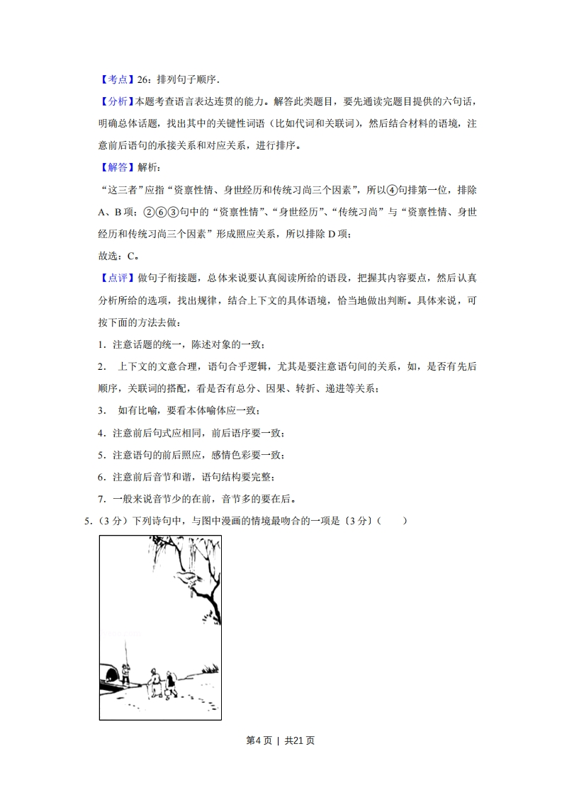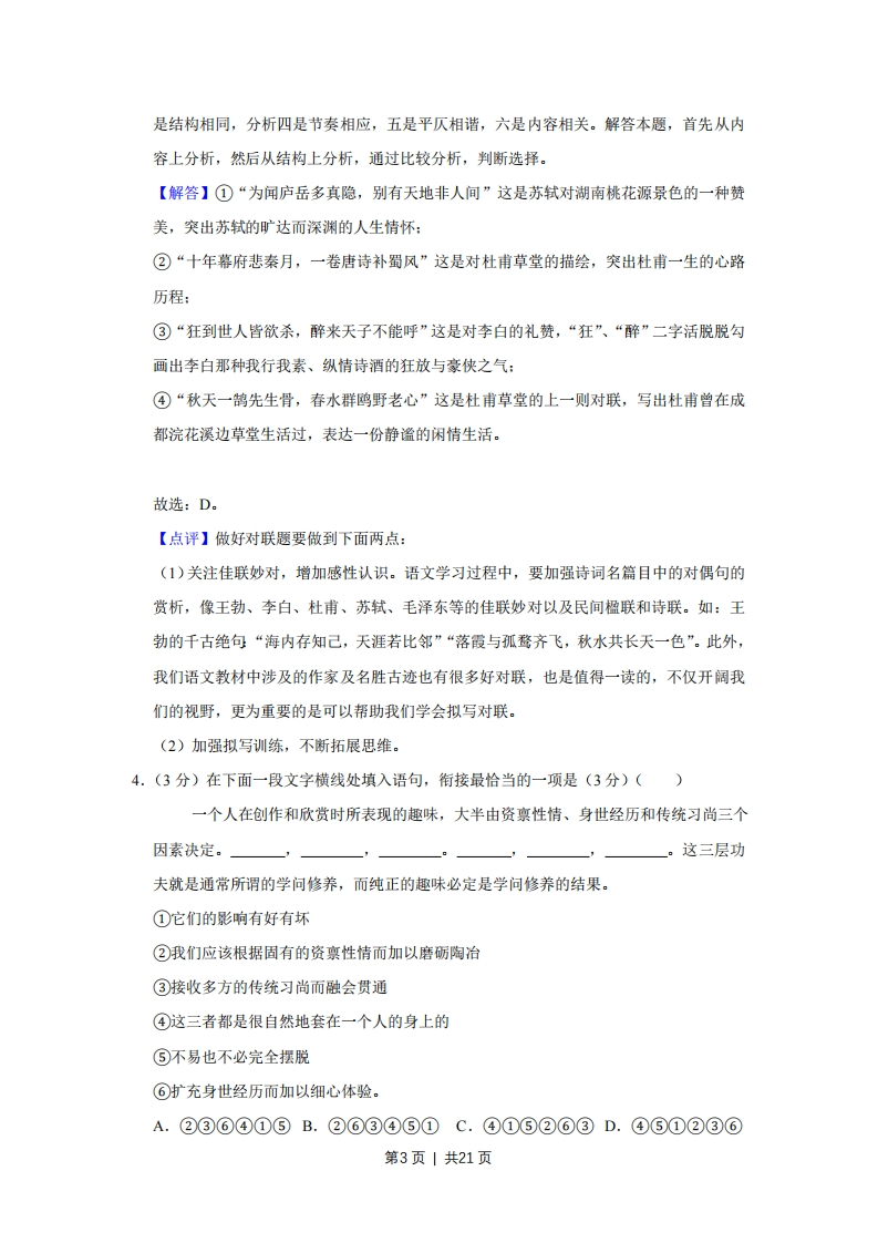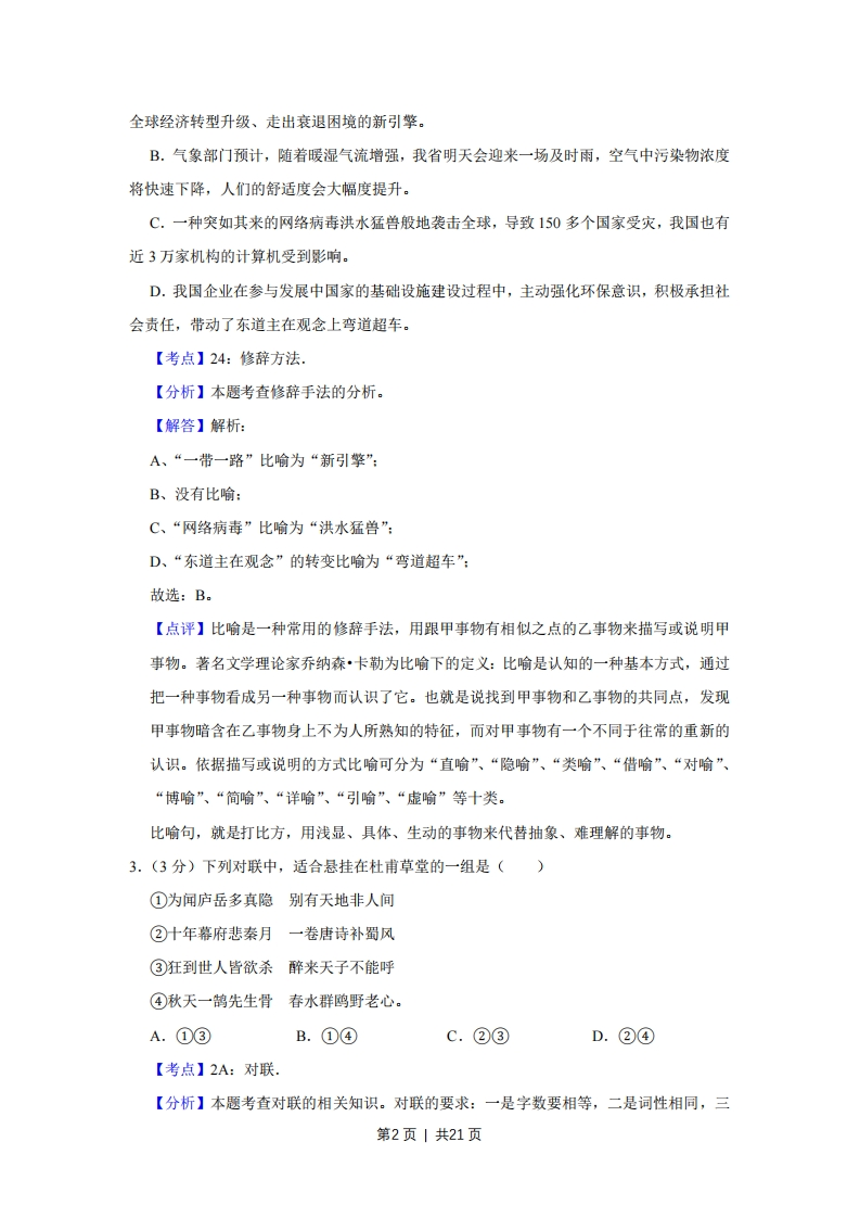 2017年江苏省高考语文试卷解析版事考答案与试题佩析一、语言文字运用(15分)1.(3分)在下面一段话的空缺处依次填入词语,最恰当的一组是〔3分)()刺绣画艺术,就是以绘画为稿本,以针黹、缣帛为绣材的艺术再创作。在其传承与发展过程中,无数绣娘以的工匠精神,创作出令人的作品。它们或如摄影写实,或如油画般立体,或姿态婀娜,或设色古雅,可谓争奇斗艳,A.精益求精耳目一新美不胜收B.励精求治刮目相看美不胜收C.精益求精刮目相看数不胜数D.励精求治耳目一新数不胜数【考点】18:成语.【分析】解答此题的关键是掌握相似、相近词语在意思上的细微差别,正确辨别他们的感情色彩、修饰对象、使用范围等。解答时联系上下文,从词语与语境的语意关系、搭配关系等方面筛选,再运用排除法排除不符合句意的选项。【解答】精益求精:好了还求更好:励精求治:振奋精神,尽力设法治好国家。句中是指艺术创作,应该选用“精益求精”,排除B、D:耳目一新:听到的、看到的跟以前完全不同,使人感到新鲜:刮目相看:指别人己有进步,不能再用老眼光去看他。句中修饰“作品”,指“作品”新,选用“耳目一新”,排除C:美不胜收:美好的东西很多,一时看不过来:数不胜数:数都数不过来。形容数量极多,很难计算。根据句子语境,是说作品美,而不是多。选用“美不胜收”。故选:A【点评】此题主要考查正确使用词语(成语)的能力。在平时的复习中应养成规范使用汉语言文字的习惯,不要被一些媒体的错误用法所误导,并注重积累。积累一些常见的近义词、易错词,注意区分近义词中不同语素的含义,做题时根据语境分析哪个更合适:更重要的是在阅读中培养语感,注意基本词语使用的语境。2.(3分)下列语句中,没有使用比喻手法的一项是〔3分)()A.“一带一路”是我国为推动经济全球化而提出的一项互利共赢的倡议,它己成为推动第1页|共21页全球经济转型升级、走出衰退困境的新引擎。B.气象部门预计,随着暖湿气流增强,我省明天会迎来一场及时雨,空气中污染物浓度将快速下降,人们的舒适度会大幅度提升C.一种突如其来的网络病毒洪水猛兽般地袭击全球,导致150多个国家受灾,我国也有近3万家机构的计算机受到影响。D.我国企业在参与发展中国家的基础设施建设过程中,主动强化环保意识,积极承担社会责任,带动了东道主在观念上弯道超车。【考点】24:修辞方法。【分析】本题考查修辞手法的分析。【解答】解析:A、“一带一路”比喻为“新引擎”:B、没有比喻:C、“网络病毒”比喻为“洪水猛兽”:D、“东道主在观念”的转变比喻为“弯道超车”:故选:B。【点评】比喻是一种常用的修辞手法,用跟甲事物有相似之点的乙事物来描写或说明甲事物。著名文学理论家乔纳森·卡勒为比喻下的定义:比喻是认知的一种基本方式,通过把一种事物看成另一种事物而认识了它。也就是说找到甲事物和乙事物的共同点,发现甲事物暗含在乙事物身上不为人所熟知的特征,而对甲事物有一个不同于往常的重新的认识。依据描写或说明的方式比喻可分为“直喻”、“隐喻”、“类喻”、“借喻”、“对喻”、“博喻”、“简喻”、“详喻”、“引喻”、“虚喻”等十类。比喻句,就是打比方,用浅显、具体、生动的事物来代替抽象、难理解的事物。3.(3分)下列对联中,适合悬挂在杜甫草堂的一组是()①为闻庐岳多真隐别有天地非人间②十年幕府悲秦月一卷唐诗补蜀风③狂到世人皆欲杀醉来天子不能呼④秋天一鹊先生骨春水群鸥野老心。A.①③B.①④C.②③D.②④【考点】2A:对联.【分析】本题考查对联的相关知识。对联的要求:一是字数要相等,二是词性相同,三第2页|共21页是结构相同,分析四是节奏相应,五是平仄相谐,六是内容相关。解答本题,首先从内容上分析,然后从结构上分析,通过比较分析,判断选择。【解答】①“为闻庐岳多真隐,别有天地非人间”这是苏轼对湖南桃花源景色的一种赞美,突出苏轼的旷达而深渊的人生情怀:②“十年幕府悲秦月,一卷唐诗补蜀风”这是对杜甫草堂的描绘,突出杜甫一生的心路历程:③“狂到世人皆欲杀,醉来天子不能呼”这是对李白的礼赞,“狂”、“醉”二字活脱脱勾画出李白那种我行我素、纵情诗酒的狂放与豪侠之气:④“秋天一鹄先生骨,春水群鸥野老心”这是杜甫草堂的上一则对联,写出杜甫曾在成都浣花溪边草堂生活过,表达一份静谧的闲情生活。故选:D【点评】做好对联题要做到下面两点:(1)关注佳联妙对,增加感性认识。语文学习过程中,要加强诗词名篇目中的对偶句的赏析,像王勃、李白、杜甫、苏轼、毛泽东等的佳联妙对以及民间楹联和诗联。如:王勃的千古绝句“海内存知己,天涯若比邻”“落霞与孤鹜齐飞,秋水共长天一色”。此外,我们语文教材中涉及的作家及名胜古迹也有很多好对联,也是值得一读的,不仅开阔我们的视野,更为重要的是可以帮助我们学会拟写对联。(2)加强拟写训练,不断拓展思维。4.(3分)在下面一段文字横线处填入语句,衔接最恰当的一项是(3分)()一个人在创作和欣赏时所表现的趣味,大半由资禀性情、身世经历和传统习尚三个因素决定。一,一。这三层功夫就是通常所谓的学问修养,而纯正的趣味必定是学问修养的结果。①它们的影响有好有坏②我们应该根据固有的资禀性情而加以磨砺陶治③接收多方