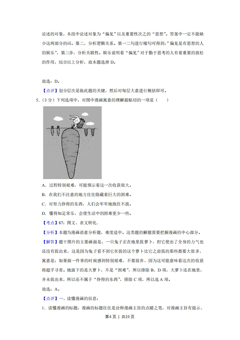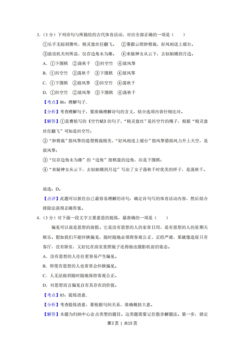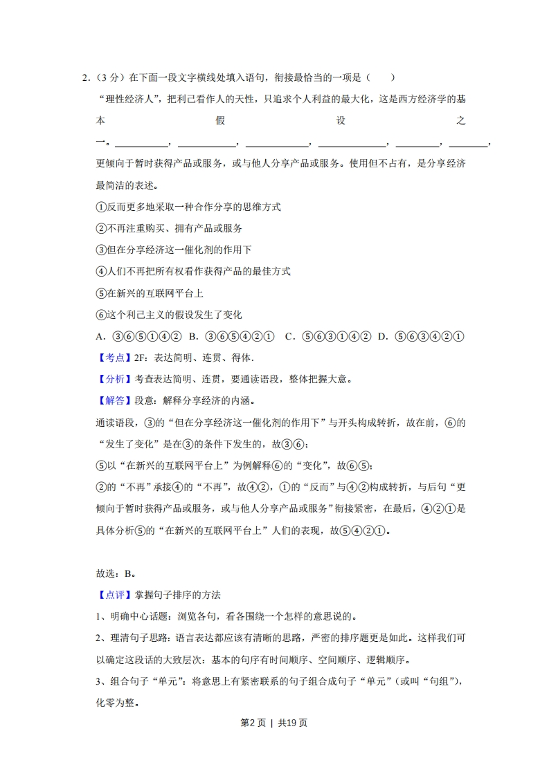 2018年江苏省高考语文试卷解析版事考答案与试题佩折一、语言文字运用(15分)1.(3分)在下面一段话的空缺处依次填入词语,最恰当的一组是()中国古代的儒家经典,莫不是古圣人深思熟虑、的结晶。如果把经典仅仅当作一场的说教,那你永远进不了圣学大门。必得躬亲实践,才能切实圣人的心得,如此我们的修为才能日有所进。A.特立独行耳提面命顿悟B.特立独行耳濡目染领悟C.身体力行耳提面命领悟D.身体力行耳濡目染顿悟【考点】19:词语(熟语)使用【分析】本题主要考查词义辨析,做本题的时可采用“替换法”,首先先阅读语句明确语句的含义,可以根据语句的含义,然后用意思相同的词语替换,其次结合词语的含义、使用方法、适用范围等,选择词语。【解答】特立独行:指有操守、有见识,不随波逐流。一般用来修饰人的品格。身体力行:亲身体验,努力实行。句中修饰的是“结晶”,选用“身体力行”:耳提面命:不但当面教导他,而且提着耳朵叮嘱他。后用以形容对人教诲恳切,要求严格。耳濡目染:经常听到看到,不知不觉地受到影响。注意后文语境“说教”,那就不是“不知不觉地受到影响”,选用“耳提面命”:顿悟:猛然醒悟。领悟:领会:理解。句中是指对古人的心得有所理解,选用“领悟”。故选:C。【点评】本题为近义词辨析题,属于表达运用,能力层级E,做这类题目关键是要辨析近义词的含义,然后结合词语的使用方法,根据具体语句的语言环境做题,切忌望文生义选出错误大答案。第1页1共19页2.(3分)在下面一段文字横线处填入语句,衔接最恰当的一项是()“理性经济人”,把利己看作人的天性,只追求个人利益的最大化,这是西方经济学的基本假设之一。更倾向于暂时获得产品或服务,或与他人分享产品或服务。使用但不占有,是分享经济最简洁的表述。①反而更多地采取一种合作分享的思维方式②不再注重购买、拥有产品或服务③但在分享经济这一催化剂的作用下④人们不再把所有权看作获得产品的最佳方式⑤在新兴的互联网平台上⑥这个利己主义的假设发生了变化A.③⑥⑤①④②B.③⑥⑤④②①C.⑤⑥③①④②D.⑤⑥③④②①【考点】2F:表达简明、连贯、得体【分析】考查表达简明、连贯,要通读语段,整体把握大意。【解答】段意:解释分享经济的内涵。通读语段,③的“但在分享经济这一催化剂的作用下”与开头构成转折,故在前,⑥的“发生了变化”是在③的条件下发生的,故③⑥:⑤以“在新兴的互联网平台上”为例解释⑥的“变化”,故⑥⑤:②的“不再”承接④的“不再”,故④②,①的“反而”与④②构成转折,与后句“更倾向于暂时获得产品或服务,或与他人分享产品或服务”衔接紧密,在最后,④②①是具体分析⑤的“在新兴的互联网平台上”人们的表现,故⑤④②①。故选:B。【点评】掌握句子排序的方法1、明确中心话题:浏览各句,看各围绕一个怎样的意思说的。2、理清句子思路:语言表达都应该有清晰的思路,严密的排序题更是如此。这样我们可以确定这段话的大致层次:基本的句序有时间顺序、空间顺序、逻辑顺序。3、组合句子“单元”:将意思上有紧密联系的句子组合成句子“单元”(或叫“句组”),化零为整。第2页1共19页3.(3分)下列诗句与所描绘的古代体育活动,对应全部正确的一项是()(①乐手无踪洞箫吹,精灵盘丝任翻飞。②雾觳云绡妙剪裁,好风相送上瑶台。③浪设机关何所益,仅存边角未为雄。④来疑神女从云下,去似姮娥到月边。A.①下围棋②荡秋千③抖空竹④放风筝B.①抖空竹②荡秋千③下围棋④放风筝C.①下围棋②放风筝③抖空竹④荡秋千D.①料空竹②放风筝③下围棋④荡秋千【考点】86:理解句子.【分析】考查理解句子,要准确理解诗句的含义,结合选项内容仔细比对。【解答】①是曹植写的《空竹赋》的句子,“精灵盘丝”是抖空竹的绳子,根据“精灵盘丝任翻飞”可知是抖空竹:②“妙剪裁”指风筝的造型剪裁精美,“好风相送上瑶台”指风筝借助风力升上天空,是放风筝:③“仅存边角未为雄”的“边角”指棋盘的边角,应是下围棋:④“来疑神女从云下,去似姮娥到月边”写出了女子荡秋千时优美的样子,是荡秋千。故选:D。【点评】此题可以抓住自己最容易理解的诗句,确定诗句写的体育活动内容,然后结合排除法获得正确答案。4.(3分)对下面一段文字主要意思的提炼,最准确的一项是()偏见可以说是思想的放假。它是没有思想的人的家常日用,是有思想的人的星期天娱乐。假如我们不能怀挟偏见,随时随地必须得客观公正、正经严肃,那就像造屋只有客厅,没有卧室,又好比在浴室里照镜子还得做出摄影机前的姿态。A.没有思想的人往往更容易产生偏见。B.即使有思想的人也常常会怀挟偏见。C.人无法做到随时随地保持客观公正。D.对思想而言偏见自有其存在的价值。【考点】85:提炼语意.【分析】考查提炼语意,要根据句间关系,准确概括大意。【解答】本题为归纳中心论点类型的题目。这类题需要记住散步解题法。第一步,锁定第3页|共19页