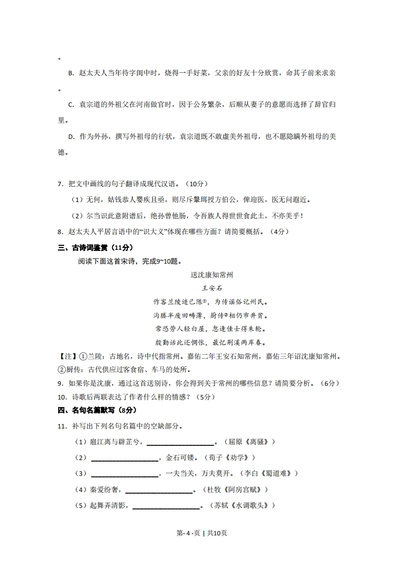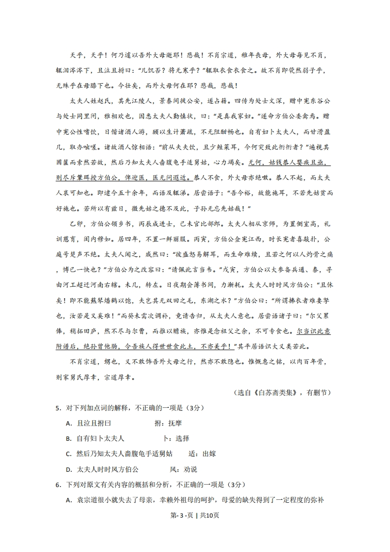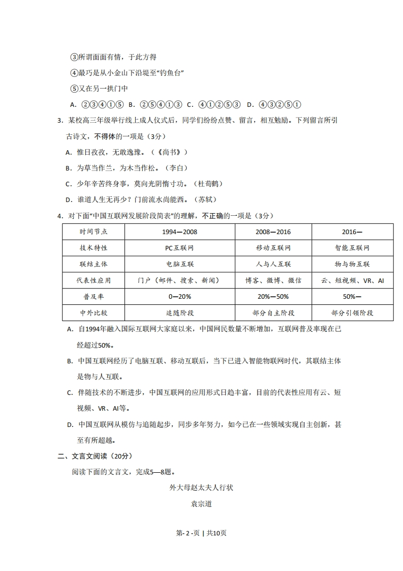 绝密★启用前2020年普通高等学校招生全国统一考试(江苏卷)语文试题注意事项考生在答题前请认真阅读注意事项及各题答题要求1.本试卷共8页,包含选择题(第1题~第6题,第12题,第15题~第16题,第18题~第19题,共11题)、非选择题(第7题~第11题,第13题第14题,第17题,第20题~第21题,共10题)两部分。本卷满分160分,考试时间为150分钟。考试结束后,请将本试卷和答题卡一并交回。2.答题前,请务必将自己的姓名、准考证好用0.5毫米黑色墨水的签字笔填写在试卷及答题卡的规定位置。3.请认真核对监考员在答题卡上所粘贴的条形码上的姓名、准考证号与本人是否相符。4.作答选择题(第1题~第6题,第12题,第15题~第16题,第18题~第19题),必须用2B铅笔将答题卡上对应选项的方框涂满、涂黑:如需改动,请用橡皮擦干净后,再选涂其他答案。作答非选择题,必须用0.5毫米黑色墨水的签字笔在答题卡上的制定位置作答,在其他位置作答一律无效。一、语言文字运用(12分)1.在下面一段话的空缺处依次填入词语,最恰当的一组是(3分)大禹梳理百川,班超投笔从戎,李时珍悬壶济世,林则徐虎门销烟…每当中华民族处于艰难之际,总有一大批志士仁人挺身而出,▲,解民众于水火,挽狂澜于既倒。野火沃土,▲,中华五千年文明史就是一部▲,的奋斗史。A.以身许国多难兴邦不屈不挠B.以身试险多难兴邦不卑不亢C.以身许国一言兴邦不卑不亢D.以身试险一言兴邦不屈不挠2.在下面的一段文字横线处填入语句,衔接最恰当的一项是(3分)瘦西湖的景秒在巧。▲,▲,▲,▲。而雨丝风片,烟波画船,人影衣香,赤栏小桥,游览应以舟行最能体会到其中妙处。①泊塔与五亭桥分占圆拱门内②回视小金山第-1-页1共10页③所谓面面有情,于此方得④最巧是从小金山下沿堤至“钓鱼台”⑤又在另一拱门中A.②③④①⑤B.②⑤④①③C.④①②⑤③D.④③②⑤①3.某校高三年级举行线上成人仪式后,同学们纷纷点赞、留言,相互勉励。下列留言所引古诗文,不得体的一项是(3分)A.惟日孜孜,无敢逸豫。(《尚书》)B.为草当作兰,为木当作松。(李白)C,少年辛苦终身事,莫向光阴惰寸功。(杜荀鹤)D.谁道人生无再少?门前流水尚能西。(苏轼)4.对下面“中国互联网发展阶段简表的理解,不正确的一项是(3分)时间节点1994-20082008-20162016-技术特性PC互联网移动互联网智能互联网联结主体电脑互联人与人互联物与物互联代表性应用门户(邮件、搜索、新闻)博客、微博、微信云、短视频、VR、AI普及率0-20%20%-50%50%中外比较追随阶段部分自主阶段部分引领阶段A.自1994年融入国际互联网大家庭以米,中国网民数量不断增加,互联网普及率现在己经超过50%.B.中国互联网经历了电脑互联、移动互联后,当下己进入智能物联网时代,其联结主体是物与人互联。C.伴随技术的不断进步,中国互联网的应用形式日趋丰富,目前的代表性应用有云、短视频、VR、AI等。D.中国互联网从模仿与追随起步,同步多年努力,如今己在一些领域实现自主创新,甚至有所超越。二、文言文阅读(20分)阅读下面的文言文,完成5一8题。外大母赵太夫人行状袁宗道第-2-页1共10页天乎,天乎!何乃遽以吾外大母逝耶!悲哉!不肖宗道,稚年丧母,外大母每见不肖,辄泪涔涔下,且泣且拊曰:“儿饥否?将无寒乎?”辄取衣食衣食之。故不肖即茕然弱子乎,无殊乎在母膝下也。今壮矣,而外大母何在耶?悲哉,悲哉!太夫人姓赵氏,其先江陵人,景泰间徙公安,遂占籍。四传为处士文深,赠中宪东谷公与处士同里闲,雅相欢也,因悉太夫人勤慎状,曰:“是真我家妇。”遂命方伯公委禽焉。赠中宪公性嗜饮,日偕诸酒人游,顾以生计萧疏,不无阻酣畅也。自有妇卜太夫人,而甘滑盈几,取办咄嗟。诸故酒人惊相语:“前从夫夫饮,且少鲑莱耳,今何突致此衎衎者?”遍视其困箧而索然若故,然后乃知太夫人啬腹龟手适舅姑,心力竭矣。无何,姑钱恭人婴疾且巫,则尽斥蟹珥授方伯公,俾迎医,医无问遐近。恭人不食,外大母亦绝嫩。恭人不起,而太夫人哀可知也。即逮今五十余年,而语及辄涕。居尝语子:“吾今裕,故能施耳,不若先姑贫而好施也。若所以有兹日,微先姑之德不及此,子孙无忘先姑哉!”乙卯,方伯公领乡书,丙辰成进士,己未官比部郎。太夫人相从京师,为置侧室高,礼训慈育,阁内穆如。居四年,不置一鲜丽服。丙寅,方伯公金宪江西,时长宪者喜敲扑,公庭号楚声不绝。太夫人闻之,戚然曰:“彼盛怒易解耳,而生命难续,且若之何以人灼骨之痛,博已一快也?”方伯公为之改容曰:“请佩此言当韦。”戊寅,方伯公以大参备兵通、泰,寻由河工超迁河南右辖。未几,转左。日夜期会簿书间,力渐耗。太夫人时时风方伯公:“且休矣!即不能燕琴燔鹤以饱,夫岂其无双田之毛,东湖之水?”方伯公曰:“所谓拂衣者难妻孥也,汝若是又奚难!”而癸未需次调补,竟请告归,从太夫人意也。居尝语诸子曰:“尔父累俸,稍拓田庐,然不尽与尔曹,而推以赡族,亦惟是念祖父之余,不可专食也。尔当识此意附谱后,绝孙曾他肠,令吾族人得世世食此土,不亦美乎!”其平居语识大义类若此。不肖宗道,甥也,义不敢饰吾外大母之行,然亦不敢隐也。惟慨惠之铭,以肉百年骨,则家舅氏厚幸,宗道厚幸。(选自《白苏斋类集》,有删节)5.对下列加点词的解释,不正确的一项是(3分)A.且泣且拊曰拊:抚摩B.自有妇卜太夫人卜:选择C.然后乃知太夫人啬腹龟手适舅姑适:出嫁D.太夫人时时风