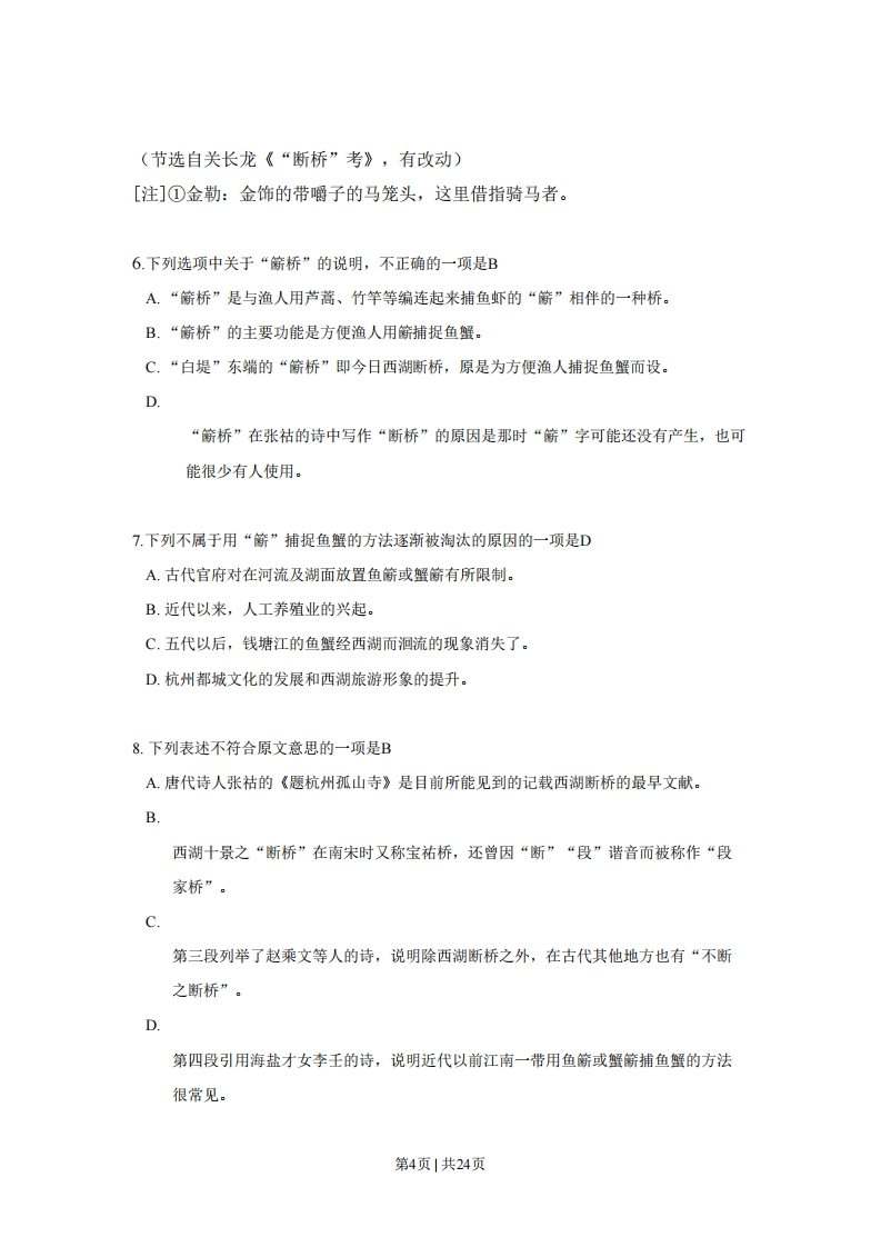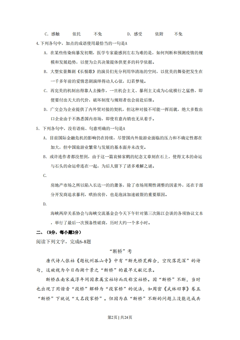 绝密★启用前2009年普通高等学校招生全国统一考试(山东卷)语文本试卷分第I卷(选择题)和第Ⅱ卷(非选择题)两部分。第I卷1至4页,第Ⅱ卷5至9页。考试结束后,将本试卷和答题卡一并交回。第I卷一、(15分,每小题3分)1、下列词语中,字形与加点字的读音全都正确的一组是BA.眷顾伺候(c1)怯生生(que)不揣冒昧(chuǎi)B.糅合愠色(yin)闹别扭(biè)闭目塞听(sè)C.遴选址误(chuǎn)煞风景(sha)飞扬跋启(hù)D.做梗咋舌(zé)处方药(chǔ)唧唧喳喳(cha)2、下列各句中,标点符号使用正确的一句是DA.郝明义认为“没有越界不成阅读,”提出阅读者应走的四步,即:向前一步、往旁一步、随便走几步、在网络与书籍之间跨步。B.从这些关于祖先的事迹中,孩子们在精神上与祖先建立了联系,找到了族群上的归属感,完成了“我是谁?”“我从哪里来?”的原初确认。C.“陆资入台”可以使两岸在更广泛的领域实现优势互补、互利双赢,特别是在当前国际金融危机的形势下,更需要两岸携手、共渡难关。D.德国联邦司法部长表示:“连接德国和中国的不仅是经济合作,政治、文化方面我们在不断靠近。‘德中法制对话’活动有助于达到这一目的。”3、依次填入下列格局中横线处的词,最恰当的一组是C①谈起抗震救灾,温总理」很深。他动情地说:“这次抗震救灾,更加深了我对人民的爱。”②在破解开发型资源城市转型难题的过程中,该市原有资源,以钒钛资源开发为重点,努力打造世界级的产业集群。③作者科尔曼年轻气盛,观点鲜明,但常常论据不足或论证不周,显得犀利有余,老练不够。A.感受依托未免B.感触依附未免第1页|共24页C.感触依托不免D.感受依附不免4.下列各句中,加点的成语使用最恰当的一句是AA.在某些传染病暴发初期,医学专家最感到左右为难的是,如何判断和预测疫情的规模和发展趋势,以便为公共决策提体供更多的科学依据。B.大型实景舞剧《长恨歌》的演员们充分利用华清池的空间,以优美的舞姿把发生在一千多年前的爱情悲剧演绎得动人心弦,幻若梦境。C.再完美的机制出得靠人去操作,一旦机会主义、暴利主义成为心底横行之猛兽,即便要付出天大的代价,破坏制度与规则者也会前赴后继。D.广交会为企业提供了内外贸对接的契机,但这种对接不可能一挥而就,绝大多数出口企业由于不熟悉国内市场,即使有意内销也无从着手。5.下列各句中,没有语病、句意明确的一句是AA.目前国际金融危机的影响仍在持续,尽管国内外旅游业面临的压力和不确定性都在加大,但中国旅游业繁荣与发展的基本面并未改变。B.或许连作者都没想到,由于这一篇哀悼家鹤的纪念文章刻在石上,使得文本的命运与石头的命运牵连在一起,为后人留下了诸多难解之谜。C.房地产市场之所以陷入长达一的的萧条,除了市场周期性调整的因素外,还在于部分开发商追求暴利,哄抬房价,也是泡沫加速破裂的重要原因。D.海峡两岸关系协会与海峡交流基金会今天下午针对第三次陈江会谈的各项协议文本,举行了最后一次预备性磋商,历时大约一个多小时。二、(9分,每小题3分)阅读下列文字,完成6-8题“断桥”考唐代诗人张祜《題杭州孤山寺》中有“断先桥荒藓合,空院落花深”的诗句,这被视为今日西湖十景之“断桥”的最早文献记录。断桥在南宋咸淳年间因隶属宝祜坊而改称宝祜桥。因“断桥”不断,当时也出现了用谐音“段桥”解释为“段家桥”的说法,如周密《武林旧事》卷五“断桥”下就说“又名段家桥”。但因为在“断桥”不断的问题上没能达成共第2页1共24页识,所以后来人们围绕“断桥”的名义问题聚诉纷纭。翻阅典籍,除西湖断桥之外,诗文中说道“不断之‘断桥’”的还有几例。如金赵秉文《墓归》诗云:“行过断桥沙路黑,忽从电影得前村。”明邵经邦《断桥》诗云:“闻到桥名断,从来金勒过。”清顾于观《南楼四咏》诗云:“门前空有断桥在,十日人无款竹扉。”可见“不断之‘断桥’”在古代是比较常见的,并非杭州西湖所独有。然而桥既不断,为什么称为“断桥”呢?据考证,这里的“断桥”实即“簖桥”,而“簖桥”则是与捕鱼蟹之“簖”相伴的一种桥,它主要是用来协助捕鱼蟹的。每年秋冬之交,螃蟹会进行生殖洄游,到江海交界的浅滩中繁殖后代,渔人便利用螃蟹的这种生活习性加以捕捉。他们把芦蒿、竹竿等编连起来的“簖”插在江河之中,挡住螃蟹向下游行进的路,然后螃蟹必沿“簖”爬上来,以求越过下行,而渔人就在“簖”侧的桥上捕捉它们(当然也有划船前往捕蟹或收笼的)。这种捕蟹方法在江南一带尤为常见,陆游《稽山行》有“村村作蟹椴,处处起鱼梁”(“椴”亦可作“簖”)之语。清藩衍桐《两浙輶轩续录》载海盐才女李壬《由武原至梅里》诗云:“沿塘两岸遍桑麻,画舫朝移日又斜。望见簖桥心便喜,急收帆脚到侬家。”这里的“簖桥”就是指与放置鱼簖、蟹簖有关的桥,这种说法在部分地区至今还有。但因放置鱼簖或蟹簖过多对河流及湖面的水流影响较大,古代官府就已有所限制。近代以来,这种捕鱼蟹的方法,随着人工养殖业的兴起而逐渐被淘汰。杭州西湖为钱塘江的泄湖,在中唐以前,钱塘江与西湖的水域连成一片,湖中水流因孤山分流,携带的泥沙逐渐形成了“白提”。流经孤山的两股水流在宝石山东南端合流而出,“白提”也便成为一道天然“鱼梁”。渔人在“白提