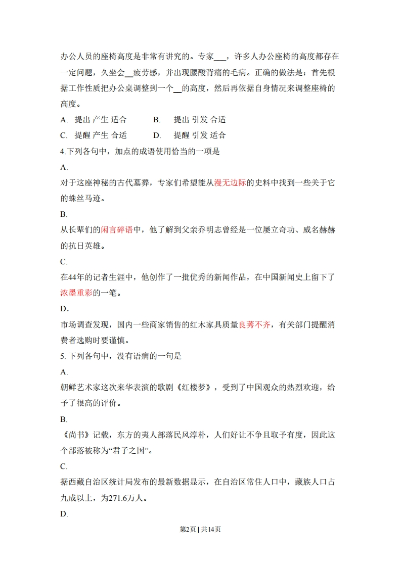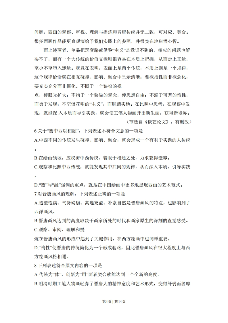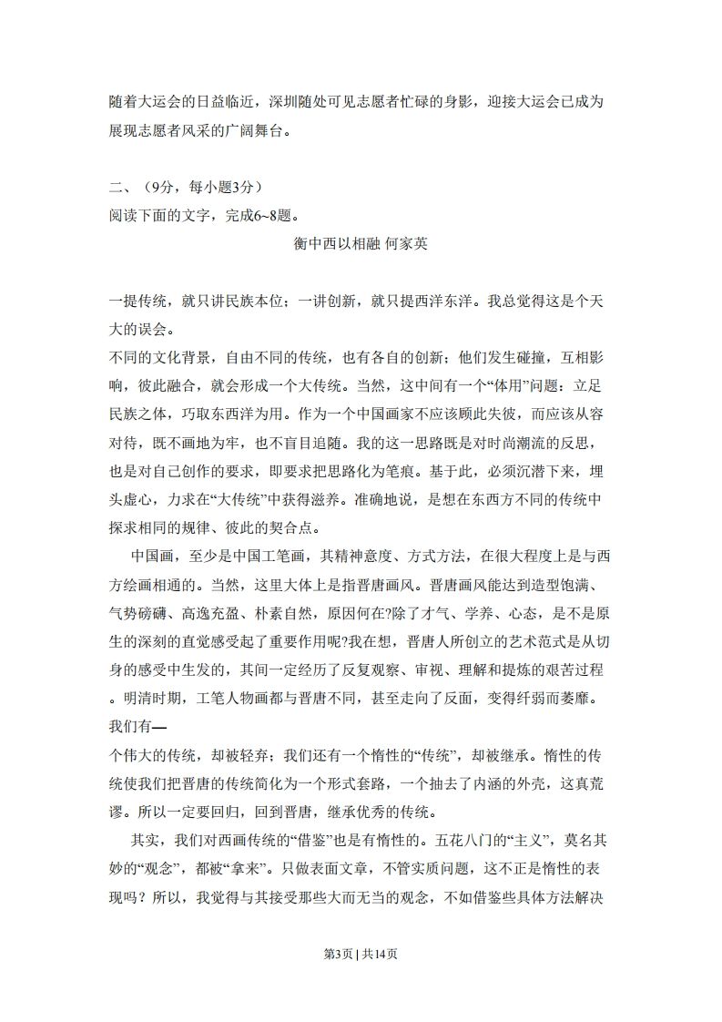 2011年普通高等学校招生全国统一考试(山东卷)语文本试卷分第I卷和第Ⅱ卷两部分,共8页。满分150分.考试用时150分钟。考试结束后,将本试卷和答题卡一并交回。注意事项:1.答题前,考生务必用0.5毫米黑色签字笔将自己的姓名、座号、准考证号、县区和科类填写在答题卡和试卷规定的位置上。2.第I卷每小题选出答案后,用2B铅笔把答题卡上对应题目的答案标号涂黑,如需改动,用橡皮擦干净后,在选涂其他答案标号。答案不能答在试卷上。3.第Ⅱ卷必须用0.5毫米黑色签字笔作答,答案必须写在答题卡各题目指定区域内相应的位置,不能写在试卷上:如需改动,先划掉原来的答案,然后再写上新的答案:不能使用涂改液、胶带纸、修正带。不按以上要求作答的答案无效。4.第Ⅱ卷第六题为选做题,考生须从所给(一)(二)两题中任选一题作答,不能全选。第1卷(共36分)一、(15分,每小题3分)1.下列词语中加点的字,每对读音都不相同的一组是A.磅秤磅礴仿佛/佛手瓜刨除刨根问底B.钥匙/汤匙漩涡/涡轮机调节/调虎离山C.驻扎/实亲事/亲家母伎俩/仁瓜俩枣D.果脯/胸脯胳臂/长臂猿倔强/强颜欢笑2.下列词语中,没有错别字的一组是A.签署发贴子雍容华贵万事俱备,只欠东风B.端详螺丝钉额手称庆兵来将挡,水来土掩C.惊诧震慑力眼花瞭乱一言既出,驷马难追D.延袭扫描仪不屈不饶知己知彼,百战不殆3.依次填入下列横线处的词语,最恰当的一组是第1页1共14页办公人员的座椅高度是非常有讲究的。专家,许多人办公座椅的高度都存在一定问题,久坐会疲劳感,并出现腰酸背痛的毛病。正确的做法是:首先根据工作性质把办公桌调整到一个的高度,然后再依据自身情况来调整座椅的高度。A.提出产生适合B提出引发合适C.提醒产生合适D.提醒引发适合4.下列各句中,加点的成语使用恰当的一项是A对于这座神秘的古代墓葬,专家们希望能从漫无边际的史料中找到一些关于它的蛛丝马迹。B从长辈们的闲言碎语中,他了解到父亲乔明志曾经是一位屡立奇功、威名赫赫的抗日英雄。C在44年的记者生涯中,他创作了一批优秀的新闻作品,在中国新闻史上留下了浓墨重彩的一笔。D.市场调查发现,国内一些商家销售的红木家具质量良莠不齐,有关部门提醒消费者选购时要谨慎。5.下列各句中,没有语病的一句是A朝鲜艺术家这次来华表演的歌剧《红楼梦》,受到了中国观众的热烈欢迎,给予了很高的评价。B《尚书》记载,东方的夷人部落民风淳朴,人们好让不争且取予有度,因此这个部落被称为“君子之国”。C据西藏自治区统计局发布的最新数据显示,在自治区常住人口中,藏族人口占九成以上,为271.6万人。D第2页1共14页随着大运会的日益临近,深圳随处可见志愿者忙碌的身影,迎接大运会已成为展现志愿者风采的广阔舞台。二、(9分,每小题3分)阅读下面的文字,完成6~8题。衡中西以相融何家英一提传统,就只讲民族本位:一讲创新,就只提西洋东洋。我总觉得这是个天大的误会。不同的文化背景,自由不同的传统,也有各自的创新:他们发生碰撞,互相影响,彼此融合,就会形成一个大传统。当然,这中间有一个“体用”问题:立足民族之体,巧取东西洋为用。作为一个中国画家不应该顾此失彼,而应该从容对待,既不画地为牢,也不盲目追随。我的这一思路既是对时尚潮流的反思,也是对自己创作的要求,即要求把思路化为笔痕。基于此,必须沉潜下来,埋头虚心,力求在“大传统中获得滋养。准确地说,是想在东西方不同的传统中探求相同的规律、彼此的契合点。中国画,至少是中国工笔画,其精神意度、方式方法,在很大程度上是与西方绘画相通的。当然,这里大体上是指晋唐画风。晋唐画风能达到造型饱满、气势磅礴、高逸充盈、朴素自然,原因何在?除了才气、学养、心态,是不是原生的深刻的直觉感受起了重要作用呢?我在想,晋唐人所创立的艺术范式是从切身的感受中生发的,其间一定经历了反复观察、审视、理解和提炼的艰苦过程。明清时期,工笔人物画都与晋唐不同,甚至走向了反面,变得纤弱而萎靡。我们有一个伟大的传统,却被轻弃:我们还有一个惰性的“传统”,却被继承。惰性的传统使我们把晋唐的传统简化为一个形式套路,一个抽去了内涵的外壳,这真荒谬。所以一定要回归,回到晋唐,继承优秀的传统。其实,我们对西画传统的“借鉴”也是有惰性的。五花八门的“主义”,莫名其妙的“观念”,都被“拿来”。只做表面文章,不管实质问题,这不正是惰性的表现吗?所以,我觉得与其接受那些大而无当的观念,不如借鉴些具体方法解决第3页|共14页