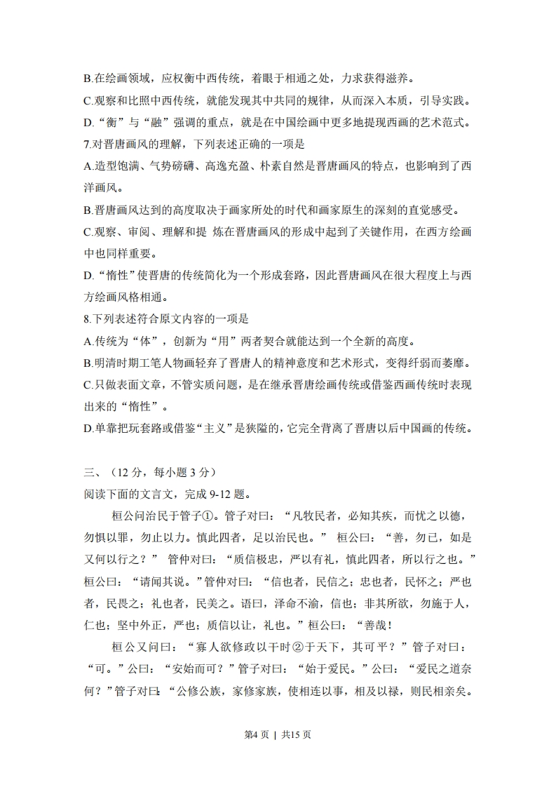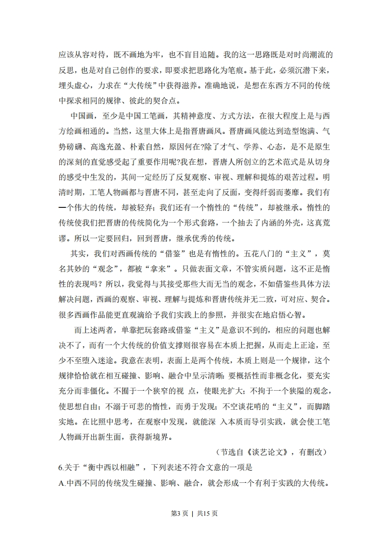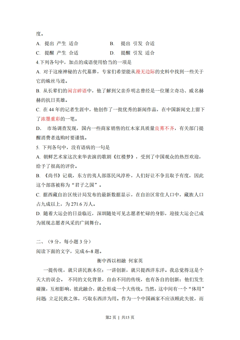 2011年普通高等学校招生全国统一考试(山东卷)语文本试卷分第I卷和第Ⅱ卷两部分,共8页。满分150分。考试用时150分钟。考试结束后,将本试卷和答题卡一并交回。注意事项:1.答题前,考生务必用0.5毫米黑色签字笔将自己的姓名、座号、准考证号、县区和科类填写在答题卡和试卷规定的位置上。2.第I卷每小题选出答案后,用2B铅笔把答题卡上对应题目的答案标号涂黑,如需改动,用橡皮擦干净后,在选涂其他答案标号。答案不能答在试卷上。3.第Ⅱ卷必须用0.5毫米黑色签字笔作答,答案必须写在答题卡各题目指定区域内相应的位置,不能写在试卷上:如需改动,先划掉原来的答案,然后再写上新的答案不能使用涂改液、胶带纸、修正带。不按以上要求作答的答案无效。4.第Ⅱ卷第六题为选做题,考生须从所给(一)(二)两题中任选一题作答,不能全选。第I卷(共36分)一、(15分,每小题3分)1.下列词语中加点的字,每对读音都不相同的一组是A.磅秤磅礴仿佛/佛手瓜刨除刨根问底B.钥匙/汤匙漩涡/涡轮机调节/调虎离山C.驻扎/扎实亲事/亲家母伎俩/仁瓜俩枣D.果脯胸脯胳臂/长臂猿倔强/强颜欢笑2.下列词语中,没有错别字的一组是A.签署发贴子雍容华贵万事俱备,只欠东风B.端详螺丝钉额手称庆兵来将挡,水来土掩C.惊诧震慑力眼花瞭乱一言既出,驷马难追D.延袭扫描仪不屈不饶知己知彼,百战不殆3.依次填入下列横线处的词语,最恰当的一组是办公人员的座椅高度是非常有讲究的。专家一,许多人办公座椅的高度都存在一定问题,久坐会疲劳感,并出现腰酸背痛的毛病。正确的做法是首先根据工作性质把办公桌调整到一个的高度,然后再依据自身情况来调整座椅的高第1页|共15页度。A.提出产生适合B.提出引发合适C.提醒产生合适D.提醒引发适合4.下列各句中,加点的成语使用恰当的一项是A.对于这座神秘的古代墓葬,专家们希望能从漫无边际的史料中找到一些关于它的蛛丝马迹。B.从长辈们的闲言碎语中,他了解到父亲乔明志曾经是一位屡立奇功、威名赫赫的抗日英雄。C.在44年的记者生涯中,他创作了一批优秀的新闻作品,在中国新闻史上留下了浓墨重彩的一笔。D.市场调查发现,国内一些商家销售的红木家具质量良莠不齐,有关部门提醒消费者选购时要谨慎。5.下列各句中,没有语病的一句是A.朝鲜艺术家这次来华表演的歌剧《红楼梦》,受到了中国观众的热烈欢迎,给予了很高的评价。B.《尚书》记载,东方的夷人部落民风淳朴,人们好让不争且取予有度,因此这个部落被称为“君子之国”。C.据西藏自治区统计局发布的最新数据显示,在自治区常住人口中,藏族人口占九成以上,为271.6万人。D.随着大运会的日益临近,深圳随处可见志愿者忙碌的身影,迎接大运会已成为展现志愿者风采的广阔舞台。二、(9分,每小题3分)阅读下面的文字,完成6-8题。衡中西以相融何家英一提传统,就只讲民族本位:一讲创新,就只提西洋东洋。我总觉得这是个天大的误会。不同的文化背景,自由不同的传统,也有各自的创新:他们发生碰撞,互相影响,彼此融合,就会形成一个大传统。当然,这中间有一个“体用”问题立足民族之体,巧取东西洋为用。作为一个中国画家不应该顾此失彼,而第2页|共15页应该从容对待,既不画地为牢,也不盲目追随。我的这一思路既是对时尚潮流的反思,也是对自己创作的要求,即要求把思路化为笔痕。基于此,必须沉潜下来,埋头虚心,力求在“大传统”中获得滋养。准确地说,是想在东西方不同的传统中探求相同的规律、彼此的契合点。中国画,至少是中国工笔画,其精神意度、方式方法,在很大程度上是与西方绘画相通的。当然,这里大体上是指晋唐画风。晋唐画风能达到造型饱满、气势磅礴、高逸充盈、朴素自然,原因何在?除了才气、学养、心态,是不是原生的深刻的直觉感受起了重要作用呢?我在想,晋唐人所创立的艺术范式是从切身的感受中生发的,其间一定经历了反复观察、审视、理解和提炼的艰苦过程。明清时期,工笔人物画都与晋唐不同,甚至走向了反面,变得纤弱而萎靡。我们有一个伟大的传统,却被轻弃:我们还有一个惰性的“传统”,却被继承。惰性的传统使我们把晋唐的传统简化为一个形式套路,一个抽去了内涵的外壳,这真荒谬。所以一定要回归,回到晋唐,继承优秀的传统。其实,我们对西画传统的“借鉴”也是有惰性的。五花八门的“主义”,莫名其妙的“观念”,都被“拿来”。只做表面文章,不管实质问题,这不正是惰性的表现吗?所以,我觉得与其接受那些大而无当的观念,不如借鉴些具体方法解决问题,西画的观察、审视、理解与提炼和晋唐传统并无二致,可对应、契合。很多西画作品能更直观滴给予我们实践上的参照,并很实在地启悟心智。而上述两者,单靠把玩套路或借鉴“主义”是意识不到的,相应的问题也解决不了,而有一个大传统的价值支撑则很容易在本质上把握,从而走上正途,少不至堕入迷途。我意在表明,表面上是两个传统,本质上则是一个规律,这个规律恰恰就在相互碰撞、影响、融合中呈示清晰:要概括性而非概念化,要充实充分而非僵化。不囿于一个狭窄的视点,使眼光扩大:不拘于一个狭隘的观念,使思想自由:不溺于可悲的惰性,而勇于发现:不空谈花哨的“主义”,而脚踏实地。在比照中思考,在观察中发现,就能深入本质而导引实践,就会使工笔人物