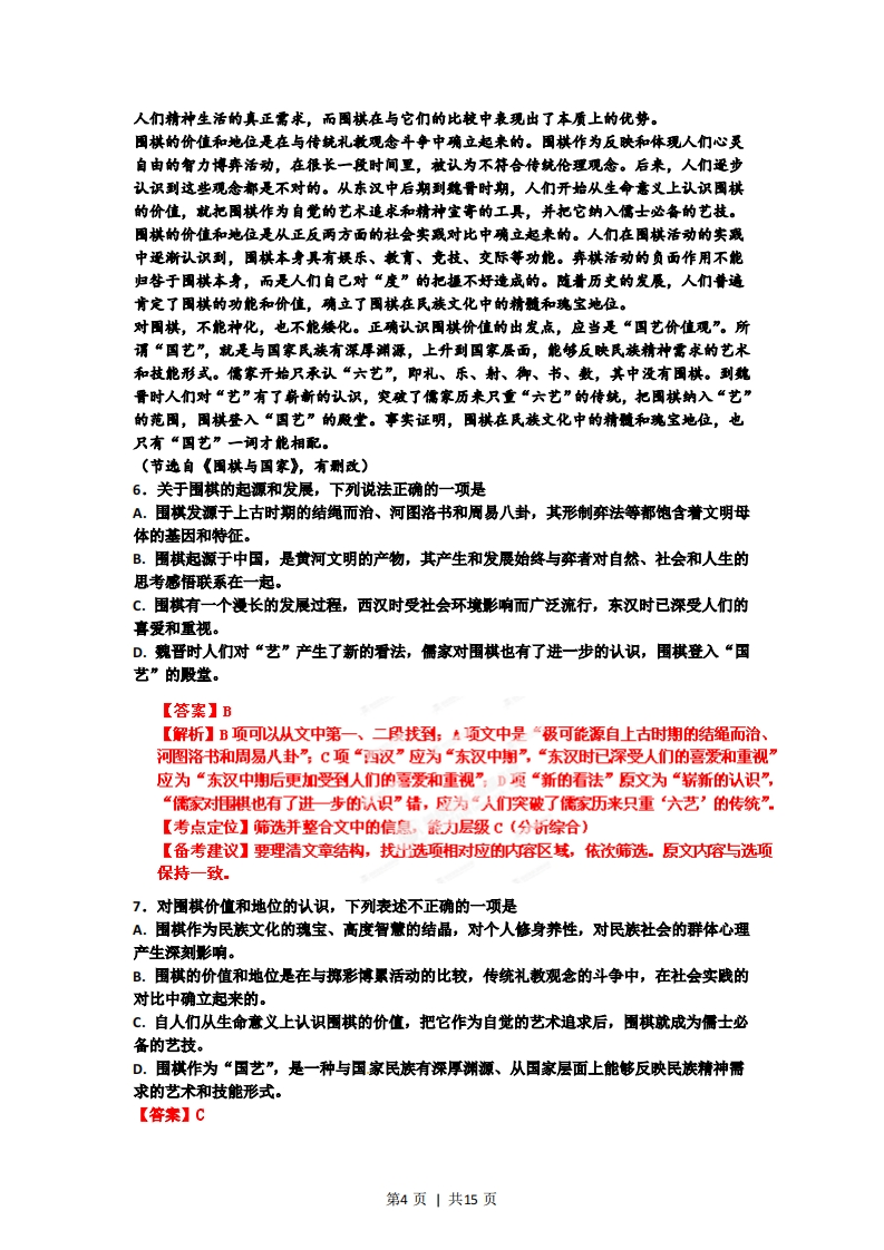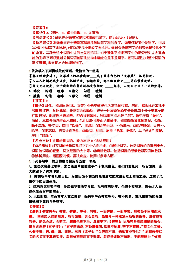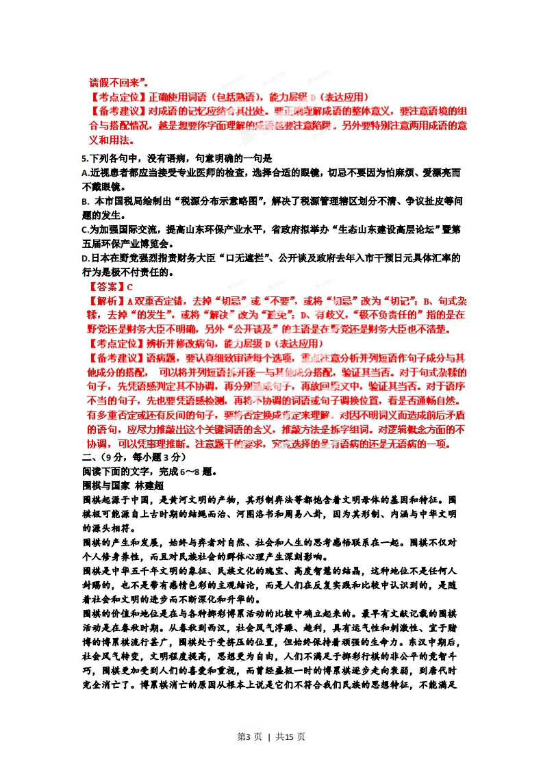 【总评】题目难度不大,题滩閔以及题星等方面看与往年保持相对稳定,与往年相比,试题在保持时代特色、地方特色、生活特色的后时,更注重了内容的典型性与实用性,考点的设置清明确,不刁不钻,更加贴近考生实际,考查学生基础素养。自己感觉实用类文本比文学类文本容易作答。2012年普通高等学校招生全国统一考试(山东卷)语文本试卷分第I卷和第Ⅱ卷两部分,共8页。满分150分。考试用时150分钟。考试结束后,将本卷和答题卡一并交回。注意事项:1.答题前,考试务必用0.5毫米黑色签字笔将自己的姓名、座号、考生号、县区和科类填写在答题卡和试卷规定的位置上。2.第I卷年小题选出答案后,用2B铅笔把答题卡上对应题目的答案标号涂黑如需改动,用橡皮擦干净后,再选涂其他答案标号,答案不能答在试卷上。3.第Ⅱ卷必须用0.5毫米黑色签字笔作答,答案必须写在答题卡各题目指定区域内相应的位置,不能写在试卷上;如需改动,先划掉原来的答案,然后再写上新的答案;不能使用涂改液、胶带纸、像正带。不按以上要求作答的答案无效。4.第Ⅱ卷第六题为选做题,考生须从所给(一)(二)两题中任选一题作答,不能全选。第I卷(共36分)一。(15分,每小题3分)1.下列词语中加点的字,每对读音都相同的一组是A.星宿/乳臭搭讪/喻养费粗犷/旷日持久B.着实/斟的砾石/沥青路鞭挞/纷至沓来C.鸣咽/奖液膜目/撑门面诘难/弹精竭虑D.畜养/体恤锁钥/管弦乐进发/屏气凝神【答案】B【解t折】A、xid;shimn;gudng/kuing;B、zhui;li;to;C、ye;chem/cheg:jie;D、xu;yue;beng/bing【考点定位】识记现代汉语普通话常用字的字音,能力层级A(识记)。【备考建议】本题主要考同音字和多音字,注意常见多音字、形似字的读音,侧重两个方面:是容易读错的字,包括形近而音不同的字和声旁已不代表读音的字,二是多音多义字,音椭义移。对多音字的把握,警提“音随意转”的原侧,一要注意从词语含义上区别,二要注意从词性上区别,如“畜”,三要注意通过书面语与口头语的不同记忆,四要注意记少不记多,五要记住一些常考的字音。吃不准的情况下,可多考滤从词语具体意义以及问语的词性的角度入手解向题。善用除法和认定法.,2.下列词语中,没有特别字的一组是A.镶嵌精萃休闲装轻描淡写B。跟荒耶薄遨请赛赔理道状C.怃然琵琶和稀泥玲珑则透D.推辞观摩元霄节伶牙俐齿第1页|共15页【答案】c【解析】A、精粹,B、赔礼道款,D、元宵节【考点定位】)识记并正确书写现代常用规范汉字,能力层级盘(识记).【备考建议】本题重点在于新别容易混淆的同音字和形近字.如果怀疑某个是别字,可以写出几个同音字来比校,可以写出几个形似字来此较.通过分析形声字的形旁来推导这个字的含意,再放到这个词语中去判定是否相符。对于独体字或形声字中的形旁已失去表意功能的形声字可以通过分析词语的语法签构来确症它是不是别字,还可以通过对整个问语的意义理解,来寻找不合语境的别字3.依次填入下列横线处的词语,最恰当的一组是①春天的脚步近了,大草原上的冰雪淅淅成了朵朵白色的“大蘑菇”,然是壮观。②人与人之间要减少误会,化解矛盾,和请相处,那么加强彼此是非常重要的。③每天天还没亮,位于城郊的农贸市场批发市场就起来,人们又开始了一天的劳作。A.溶化沟通喧哗B.溶化勾通唯闹C.融化勾通喧哗D.融化沟通喧闹【答案】D【解析】融化:指固种如冰、雪待)受热变常或化为流体的过程。溶化:指固体在液体中溶解的过程,具体地说,是指因态物质,在另一种浪态物质中分散成单个分子或离子的扩散过程。此过程不需加热,但必须有液体,以用三点水旁“溶”.题中应选“融化”.沟通:本指开沟以使两水相通。后用以泛指使两方相通连;也指疏通彼此的意见。勾通:暗中串通,贬义词。应用“沟通”.宣闹①喧哗闲:一的集市;②宣哗吵闹:大声心.宣哗:①形溶问,声音大而杂乱;②动问:自魔.侧重“热闹、闹”,与“起来”搭(,应用“宣闹”.【考点定位】正确使用问语,能力层级D(表达应用)【备考建议】对实问的辨折应从以下几个方面考虑:①就析词义.包括问语的语意侧重点、词语的词意的轻重、词义范用的大小等。②浙析色彩。包括问语的感情色彩跟语体色彩.③游折用法.括搭配习惯、语法功能、使用象等方而4.下列各句中,加点的成语使用恰当的一项是A.在这次演讲比赛中,来自基层单位的选手个个表现出色,他们口若悬河,巧舌如簧,给大家留下了深刻印象。B.陶渊明早年曾几度出仕,后来因为不满当时黑暗腐败的政治而走上归隐之路,过起了瓜田李下的田园生活。C.抗洪救灾形势严峻,各级领导都坚守岗位,没有撞高职守,久假不归现象,确保了人民群众生命财产的安全。D.五四时期,革命青年为救亡图存、振兴中华而弃走呼号,奋不顾身,表现出高尚的爱国情操和不屈的斗争精神。【答案】D【解析】奔走呼号:奔走,奔跑。呼号,叫减。一面奔跑,一面呼唤。形容处于困境而求援。指引起人们的注意。巧舌如簧:舌头灵巧,象養片一样能发出动听的乐音。形容花言巧语,能说会道。含贬义,感情色彩不当。瓜田李下:【解释】:比喻容易引起嫌疑的场合,出自古乐府《君子行》:“君子防未然,不处嫌疑间,瓜田不纳履,李下不整冠。”望文生义错。久假不归:假,借:归,归还。出自《孟子》:“久假而不归,恶知其非有也?”原指假借仁