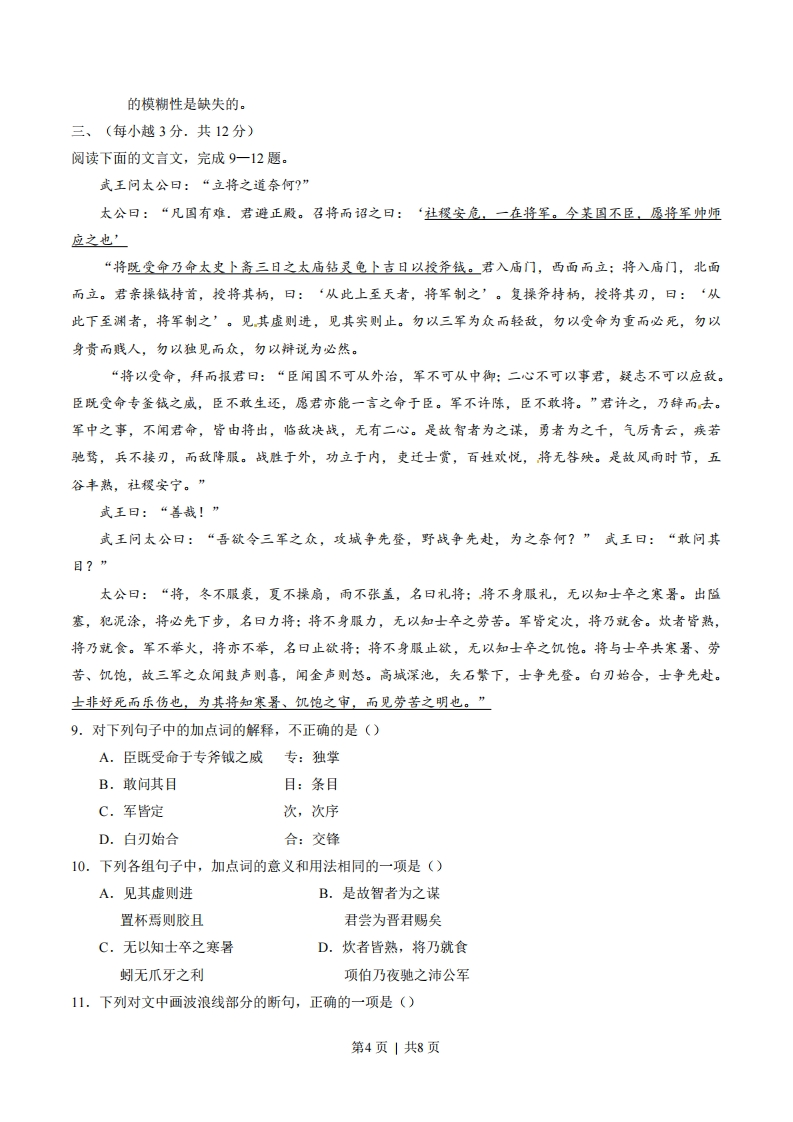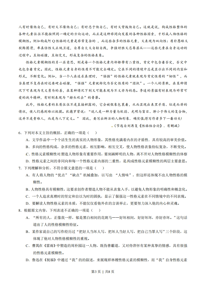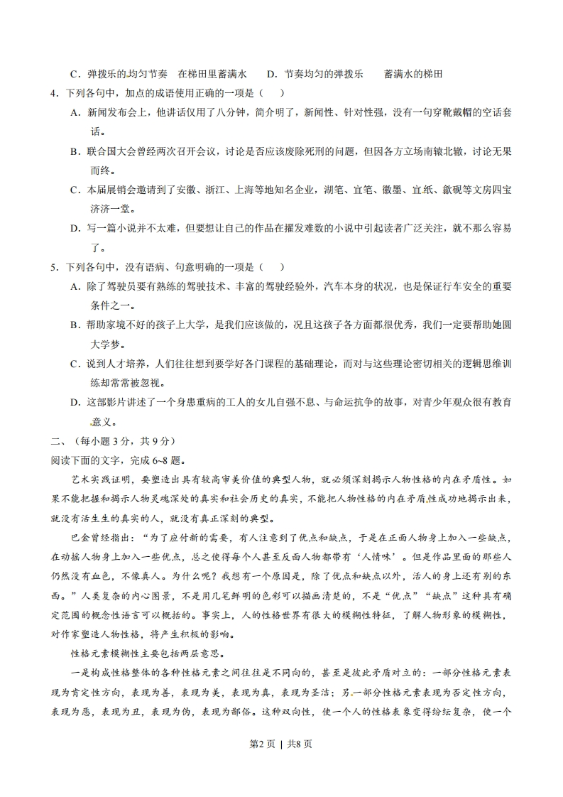 绝密★启用前2015年普通高等学校招生全国统一考试(山东卷)学网语文本试卷分第I卷和第Ⅱ卷两部分,共8页。满分150分。考试用时150分钟。考试结束后,将将本试卷和答题卡一并交回。注意事项:1.答卷前,考生务必用0.5毫米黑色签字笔将自己的姓名、座号、考生号县区和科类填写在答题卡和试卷规定的位置上。2.第I卷每小题选出答案后,用2B铅笔把答题卡上对应题目的答案标号涂黑:如需改动,用橡皮擦干净后,在选涂其他答案标号。答案卸载试卷上无效。3.第Ⅱ卷必须用0.5毫米黑色签字笔作答,答案必须写在答题卡各题目指定区域内相应的位置,不能写在试卷上:如需改动,先划掉原来的答案,然后再写上新的答案:不能使用涂改液、胶带纸、修正带。不按以上要求作答的答案无效。第1卷(共36分)一、(每小题3分,共15分)阅读小面一段文字,完成13题。浙江云和梯田,虽然不及云南元阳梯田、广西龙胜梯田那般规模(洪大/宏大),气势雄伟,但却玲珑纤巧,别有特色。群山速迤,阳光扑面而来,俯瞰山中梯田,好似面对着一座宽大的露天体育馆。无论冬夏,太阳每天都(沿/攀)着湿淋淋(银闪闪/亮堂堂)、绿油油或金灿灿的梯子,从山间的水田里爬出来,正是清明时节,梯田已开始灌水,咕嘟咕嘟的流水声犹如。每块田池的边缘都留有缺口,一哇注满,便自动流入下一层里。一,一哇哇平展展,好似神灵于半夜在山上放置的无数面镜子。天亮之后,整个山谷成了镜子创意博览会一孤形椭圆形拱形牛角形薇箕形…无数面镜子顺着山坡层层叠叠地铺展开去。1.中文加点的词语,有错别字的一项是()A.玲珑群山逶迤B.俯瞰金灿灿C.边缘层层叠叠D.椭圆博览会2.依次选用文中括号里的词语,最恰当的一项是A.宏大沿亮堂堂B.宏大攀银闪闪C.洪大沿银闪闪D.洪大攀亮堂堂3.在文中两处横线上依次填入语句,衔接最恰当的一项是()A.节奏均匀的弹拨乐在梯田里蓄满水B.弹拨乐的均匀节奏蓄满水的梯田第1页|共8页C.弹拨乐的均匀节奏在梯田里蓄满水D.节奏均匀的弹拨乐蓄满水的梯田4.下列各句中,加点的成语使用正确的一项是()A.新闻发布会上,他讲话仅用了八分钟,简介明了,新闻性、针对性强,没有一句穿靴戴帽的空话套话。B.联合国大会曾经两次召开会议,讨论是否应该废除死刑的问题,但因各方立场南辕北辙,讨论无果而终。C.本届展销会邀请到了安徽、浙江、上海等地知名企业,湖笔、宜笔、徽墨、宜纸、歙砚等文房四宝济济一堂。D.写一篇小说并不太难,但要想让自己的作品在擢发难数的小说中引起读者广泛关注,就不那么容易了。5.下列各句中,没有语病、句意明确的一项是()A.除了驾驶员要有熟练的驾驶技术、丰富的驾驶经验外,汽车本身的状况,也是保证行车安全的重要条件之一B.帮助家境不好的孩子上大学,是我们应该做的,况且这孩子各方面都很优秀,我们一定要帮助她圆大学梦。C.说到人才培养,人们往往想到要学好各门课程的基础理论,而对与这些理论密切相关的逻辑思维训练却常常被忽视。D.这部影片讲述了一个身患重病的工人的女儿自强不息、与命运抗争的故事,对青少年观众很有教育意义。二、(每小题3分,共9分)阅读下面的文字,完成6~8题。艺术实践证明,要塑造出具有较高审美价值的典型人物,就必须深刻揭示人物性格的内在矛盾性。如果不能把提和揭示人物灵魂深处的真实和社会历史的真实,不能把人物性格的内在矛盾性成功地揭示出来,就没有活生生的真实的人,就没有真正深刻的典型。巴金曾经指出:“为了应付新的需要,有人注意到了优点和缺点,于是在正面人物身上加入一些缺点,在动摇人物身上加入一些优点,总之使得每个人甚至反面人物都带有‘人情味’。但是作品里面的那些人仍然没有血色,不像真人。为什么呢?我想有一个原因是,除了优点和缺点以外,活人的身上还有别的东西。”人类复杂的内心图景,不是用几笔鲜明的色彩可以描画清楚的,不是“优点”“缺点”这种具有确定范围的概念性语言可以概括的。事实上,人的性格世界有很大的模糊性特征,了解人物形象的模糊性,对作家塑造人物性格,将产生积极的影响。性格元素模糊性主要包括两层意思。一是构成性格整体的各种性格元素之间往往是不同向的,甚至是彼此矛盾对立的:一部分性格元素表现为肯定性方向,表现为善,表现为美,表现为真,表现为圣洁:另一部分性格元素表现为否定性方向,表现为恶,表现为丑,表现为伪,表现为鄙俗。这种双向性,使一个人的性格表象变得纷纭复杂,使一个第2页」共8页人有时像他自己,有时又不像他自己:有时忠于他自己,有时又背叛他自己。这就是说,构成性格整体的各种元素往往不能按照同一确定的方向运动,而正是这种非同向发展的各种性格因索,才形成人物性格的模糊性。例如构成阿Q性格的元素是非常复杂的,而这些杂多的性格元素,叉表现为双向性:质朴愚昧又狡黠圆滑,率真任性又正统卫道,自尊自大又自轻自践,争强好胜又忍辱屈从…这些元素在自身运动的过程中。互相碰撞,互相交叉,形成复杂的性格表象。性格元素模糊性的另一层意思,则是每一个性格元素内部都带有二重性,肯定中包含着否定,否定中也包含着肯定。因此,性格元素自身的性质不可能完全确定。它在不同的情境中总是显示出不同的内容和形式,不断变化。例如,当一个人在追求真理时,“倔强”的性格元素