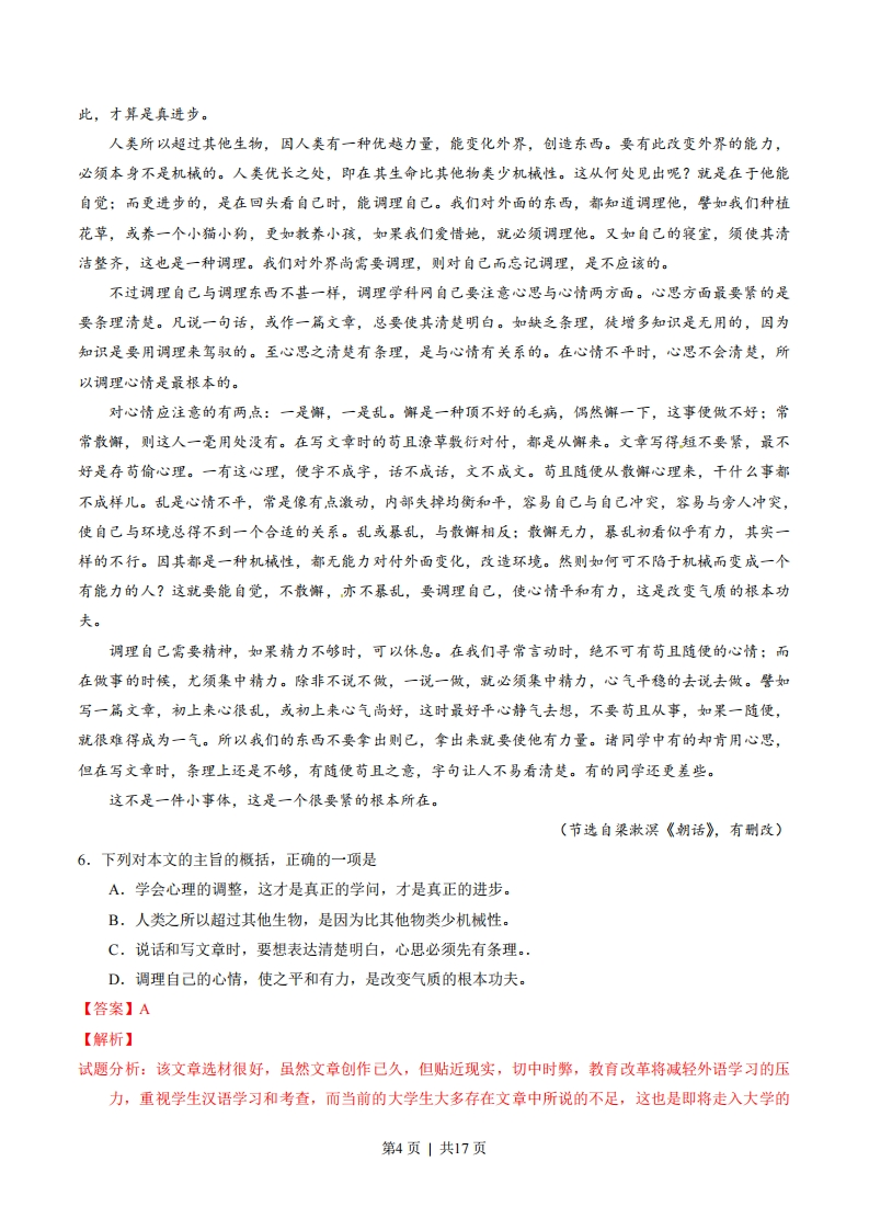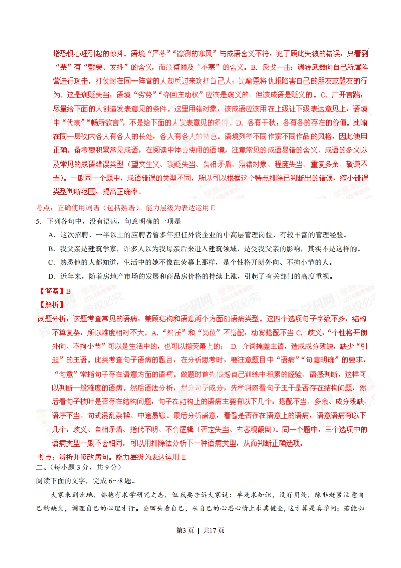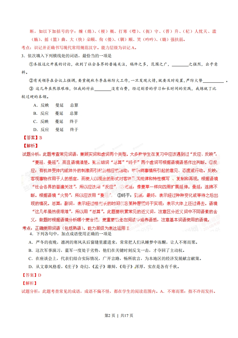 2014年普通高等学校招生全国充一考试(山东卷)语文试题1.下列词语中加点的字,每对读音都不相同的一项是A.湛蓝/斟酌崛起/倔脾气堤防/醍醐灌顶B.跻身/椅角女红/彩虹桥沟壑/豁然开朗C.毛坯/胚芽蒜薹跆拳道拙劣/咄咄逼人D.劲敌/浸渍咆哮/酵母菌着陆/着手成春【答案】A【解析】试题分析:此题出题意图是考查常见词语的易混读音,没有偏字、冷字,在此题上,应该说出题人没有太为难考生。题意要求选择读音不同的一项,所以做题时找出读音相同的,用排除法选择符合题意的选项。此题出题规律和备考策略:平时词语积累要注警多苦子、形近字、形声字的准确读音,说话时留心读音的正误。高考出题的一个出发点就是贴近生活,学科网词语的考查必然是从生活中选择来考查,所以只有在实际交流中正确运用才能真正好此题。A.h加2 hen jue jue di/ti B.ji/ji gong hong he hud C.pi pei to.toizhio duo D.jing jin xioo jido zhud/zhu6考点:识记现代汉语普通话常用字的字音。能力层级为识记A,2.下列词语中,没有错别字的一项是A.缠绵梗概打寒噤震聋发聩B.扼守晋升伏卧撑杞人忧天C.滥觞脉博摇篮曲大快朵颐D.佝偻驯顺笑吟吟锄强扶弱【答案】D【解析】试题分析:此题错误改正如下:A.震聋发需一一振产发聩;B.伏卧撑一一府卧撑C.脉博一一脉搏。此题考查兼顾两字、三字、四字的词语,文雅通俗、口语书而语、俗语成语都有所涉及,体现对汉语丰富词汇的全面考查。此题规律是考三常见的词语中易混字,这些词语中几乎都有易错字,所以备考中要积累音近字、形近字,记忆时不要机减重复,而是,高同语中每个字(尤其是易错字)的在这个词语中的含义,通过含义明白为何用这个字,而不是其他的字,因为汉字是表意文字,只有明白含义才能从根本上正确运用这些文字,能正确书写。另外有一些技巧可以帮助记忆,①很多联绵词的两个字偏旁一样,该题考查的“缠绵”“佝倭”,其他如怜俐、荟¥、精粹、憔悴。②含有同形字、形近字的词语归类积累,如:(振)聋发聩、(振幅、(振振)有词、《震)撼、(腰)慑、(震)耳欲聋、(震)古烁今;突如(其)来、出(其)不意、两全(其)美、出(奇)制胜:(厉)行节约、雷(厉)风行、(厉)兵秣马、再接再(厉)、(励)精图治:欢呼(雀)跃、门可罗(雀)、鸦(雀)无声、鸠占(鹊)巢、声名(鹊)起。该题中其他正确的词语也都有易错字,这些干扰基础不扎实的同学作出正确的判第1页|共17页断,如以下加括号的字:缠(绵)、(梗)概、打寒(噤)、(扼)守、(晋)升、(杞)人忧天、滥(觞)、摇(篮)曲、大(快)朵顾、佝(偻)、(驯)顺、笑(吟吟)、(锄)强扶弱。考点:识记并正确书写现代常用规范汉字。能力层级为识记A。3.依次填入下列横线处的词语,最恰当的一项是①本报这次开展的讨论,收到了社会各界的普遍关注,稿件之多,范围之广,之强烈,出乎意料。②有关领导在会议上强调,要重视秋冬季森林防火工作,一旦发现火情,就要及时处置,严防火势③这几年虽然很艰难,但我的付出没有白费,经过刻苦的学习和长时间的实践,我练就了比较过硬的本领。A.反映曼延总算B.反应蔓延总算C.反映蔓延终于D.反应曼延终于【答案】B【解析】试题分析:此题考查常见词语,兼顾实词和虚词两个类型。大多学生在复习中应该遇到过“反应、反映”,“蔓延、曼延”,而且语境清楚。第三组词“总算”“终于”两个虚词可根据语境语感作出判断。①反应:有机体受体内或体外的刺激而引起的相应的动:学网事情所引起的意见、态度或行动。反映:客观事物作用于人的感官,而使人以观念的形式对客体及其规律和特性模写、复制和再现。根据语境“社会各界的普遍关注”,所以应该用“反应”②延:像蔓草一样向四周扩展延伸。曼延:连绵不断。根据语境“火势”,所以应该用“蔓延”③终于:底,最终,表示经过种种变化或等待之后出现的情况。总算:副词,表示经过相当长的时间以后某种愿终于实现:表示大体上还过得去。语境“这几年虽然很艰难”,所以用“总算”。此题要积累常见的近义词,注意区分近义词中不同语素的含义,做题时根据语境分析哪个更合透,更重要的是在阅该中培养语感,注意基本词语使用的语境。考点:正确使用词语(包括熟语)。能力层级为表达运用E04.下列各句中,加点成语使用正确的一项是A,严冬的夜晚,凛冽的寒风从后窗缝里灌进来,常常把人们从睡梦中冻醒,让人不寒而栗。B.这次军事演习,蓝军一度处于劣势,他们在关键时刻反戈一击,才夺回了主动权。C.在座谈会上,代表们结合实际情况,广开言路,畅所欲言,为本地区的经济发展献言献策。D.从文章风格看,《庄子》奇幻,《孟子》雄辩,《荀子》浑厚,实在是各有千秋。【答案】D【解析】试题分析:此题考查常见的成语,成语不偏不怪,都在学生的阅读范围内。A.不寒而栗:指不冷而发抖。第2页|共17页指恐惧心理引起的惊料。语境“严客”“凛洌的寒风”与成语含义不符,犯了顾此失彼的错误,只看到“栗”有“颤栗、发抖”的含义,而没有顾及“不寒”的台义。B.反戈一击:调转武器向自己所属阵营进行攻击,打仗时在同一阵营的人却辰过来攻打自己人,比喻恩将仇报陷害自己的朋友或盟友的行为。这是褒贬失当,语境“劣势”“夺回主动权”应该是褒义的,但该成语是贬义的。C.广开言路:尽量给下面的人创造发表意见的条件,这里用错对象,该成语应该用在上级让下
