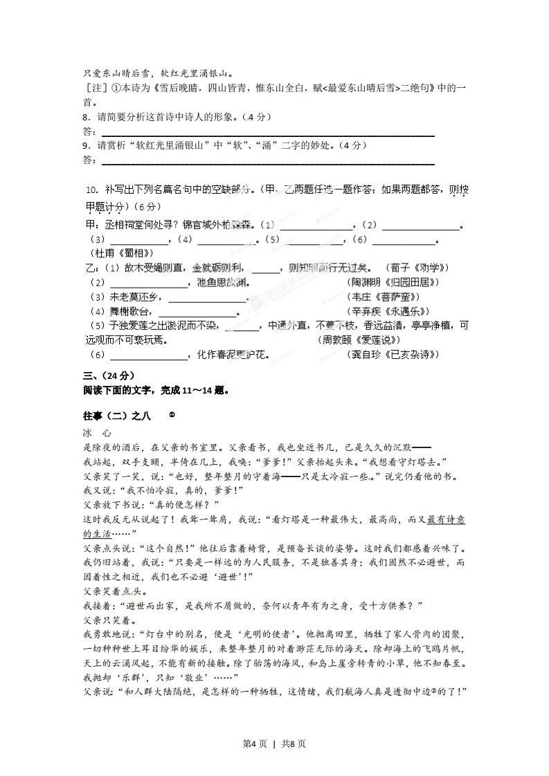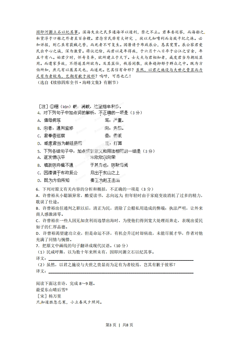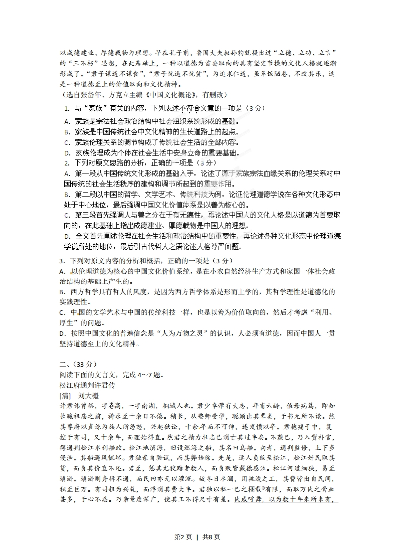2012年普通高等学校招生全国统一考试(安徽卷)语文本试卷分第I卷(阅读题)和第Ⅱ卷(表达题)两部分,第I卷第1页至第6页,第Ⅱ卷第7页至第8页。全卷满分150分,考试时间150分钟。考生注意事项:1.答卷前,务必在试题卷、答题卡规定的地方填写自己的姓名、座位号,并认真核对答题卡上所粘贴的条形码中姓名、座位号与本人姓名、座位号是否一致。务必在答题卡背面规定的地方填写姓名和座位号后两位。2.答选择题(第I卷1~6题,和第Ⅱ卷15~17题时,每小题选出答案后,用2B铅笔把答题卡上对应题目的答案标号涂黑。如需改动,用橡皮擦干净后,再涂其他答案标号。3.答是非题(第I卷7~14题,第Ⅱ卷18~21题时,必修使用0.5毫米的黑色墨水签字笔在答题卡上书写,要求字体工整、笔迹清晰。作图题可先用铅笔在答题卡规定的位置绘出,确认后再用0.5毫米的黑色墨水签字笔描清楚。必须在题号所指示的答题区域作答,超出答题区域书写的答案无效,在试题卷、草稿纸上答题无效。4.考试结束,务必将试题卷和答题卡一并上交。第I卷(阅读题共66分)一、(9分)阅读下面的文字,完成1~3题。中国传统文化的形成有两个重要的基础:一是小农自然经济的生产方式;二是家国一体,即由家及国的宗法社会政治结构。在此基础上产生的必然是以伦理道德为核心的文化价值系统。因为家族宗法血缘关系本质上是一种人伦关系,这种关系的扩展就形成了社会伦理关系。家族本位的特,点,一方面使得家族化理关系的调节成为社会生活的基本课题,家族伦理成为个体安身立命的重要基础;另一方面,在家国一体社会改治结构中,整个社会的组织系统是家族一村落一国家,文化特神的生长路向是家淡一案族一民族。家族的中心地位使得伦理在社会生活秩序的建构和调节中具有至关董要的惑义。在传统社会中,人们的社会生活是严格按照伦埋的秩序进行的,服式举上,酒扫应对,人际交往,都限制在“礼”的范围内,否则便是对“伦理”的懵越。这种伦理秩序的扩充,便上升为中国封建社会政治体制的基础一一家长制。家长制的实质就是用家族伦理的机制来进行政治统治,是一种伦理政治。与此相适应,伦理道德学说在各种文化形态中便处于中心地位。中国哲学是伦理型的,哲学体系的核心是伦理道德学说,字宙的本体是伦理道德的形而上的实体,哲学的理性是道德化的实践理性。因此人们才说,西方哲学家具有哲人的风度,中国哲学家则具有贤人的风度。中国的文学艺术也是以善为价值取向的。“文以载道”,美善合一,是中国文化审美性格的特征。即使在科学技术中,伦理道德也是首要的价值取向。中国传统科技的价值观是以“正德”即有利于德性的提升为第一目标,然后才考虑“利用、厚生”的问题。因此,中国文化价值系统的特点是强调真、善、美统一,而以善为核心。中国文化的普遍信念是“人为万物之灵”。而人之所以能为“万物之灵”,就是因为有道德,因而中国文化特别重视人与人之间的“道”,以及遵循这种“道”而形成的“德”。老子曾从本体论的高度说明“万物莫不尊道而贵德”的道理。“尊道贵德”的基本精神,就是强调人兽之分,以德性作为人兽区分的根本,突显人格尊严。孔子说:“富与责,是人之所欲也:不以其道得之,不处也。贫与贱,是人之所恶也:不以其道得之,不去也。”因而中国人都第1页1共8页以成德建业、厚德载物为理想。早在孔子前,鲁国大夫叔孙豹就提出过“立德、立功、立言”的“三不朽”思想,在此基础上,一种以道德为首要取向的具有坚定节操的文化人格就逐渐形成了。“君子谋道不谋食”,“君子忧道不忧贫”,为追求仁道,虽箪饭陋巷,不改其乐,这是一种道德至上的价值取向和文化精神。(选自张岱年、方克立主编《中国文化概论》,有删改)1.与“家族”有关的内容,下列表述不符合文意的一项是(3分)A.家族是宗法社会政治结构中社会姐织系统形成的基础。B.家族是中国传统社会中文化精神的生长道路上的起点.C.家族伦理关系的调节构成了传统社会生活的全部内容。D,家族伦理成为个体在社会生活中安身立命的重要基础。2.下列对原文思路的分析,正确的一项是(3分)A,第一段从中国传统文化形成的基础入手,论述了源于家族宗法血缘关系的伦理关系对中国传统的社会生活秩序的建构和调节所起到的重要作用.B.第二段以中国的哲学、文学艺术、传统科技为例,论证伦理道德学说在各种文化形态中处于中心地位,最后强调中国文化价值体系是以善为核心的。C,第三段首先强调人与兽之分在于有无德性,再论述中国人的文化人格是以道德为首要取向的,在此基础上指出成德建业、厚德载物是中国人的理想。D.全文首先阐述伦理在社会生活和玖治结构中的重要性,再论述各种文化形态中伦理道德学说所处的地位,最后引古代哲人之语论述人格尊严问题.3.下列对原文内容的分析和概括,正确的一项是(3分)A.以伦理道德为核心的中国文化价值系统,是在小农自然经济生产方式和家国一体社会政治结构的基础上产生的。B.西方哲学具有哲人的风度,是因为西方哲学体系是形而上学的,其哲学理性是道德化的实践理性。C.中国的文学艺术与中国的传统科技一样,也是以善为价值取向的,然后才考虑“利用、厚生”的问题。D.按照中国文化的普遍信念是“人为万物之灵”的认识,人必须
