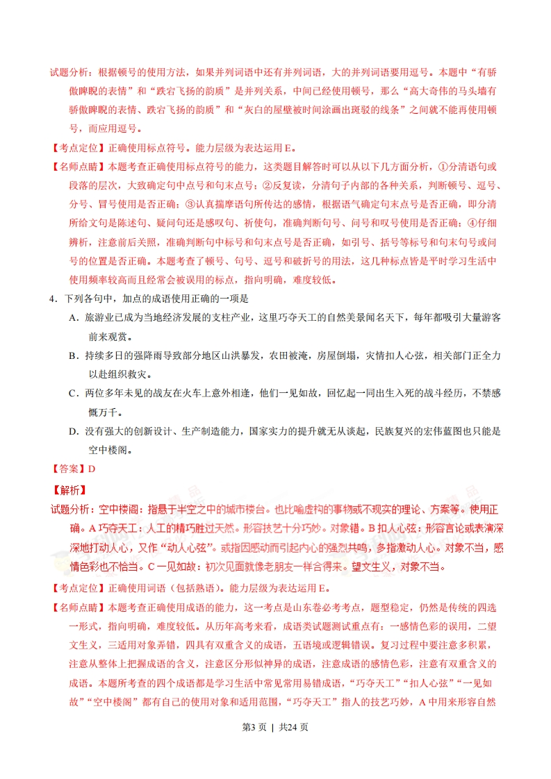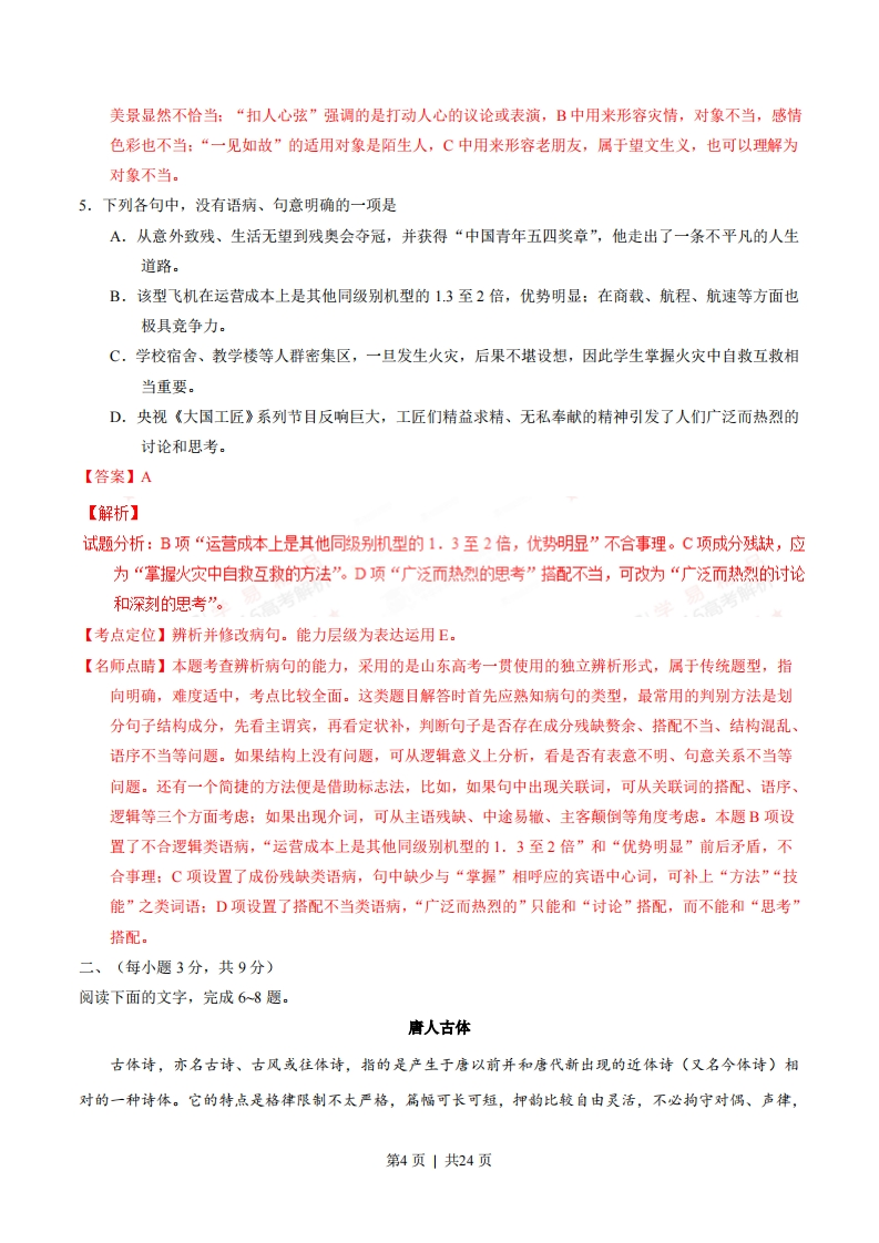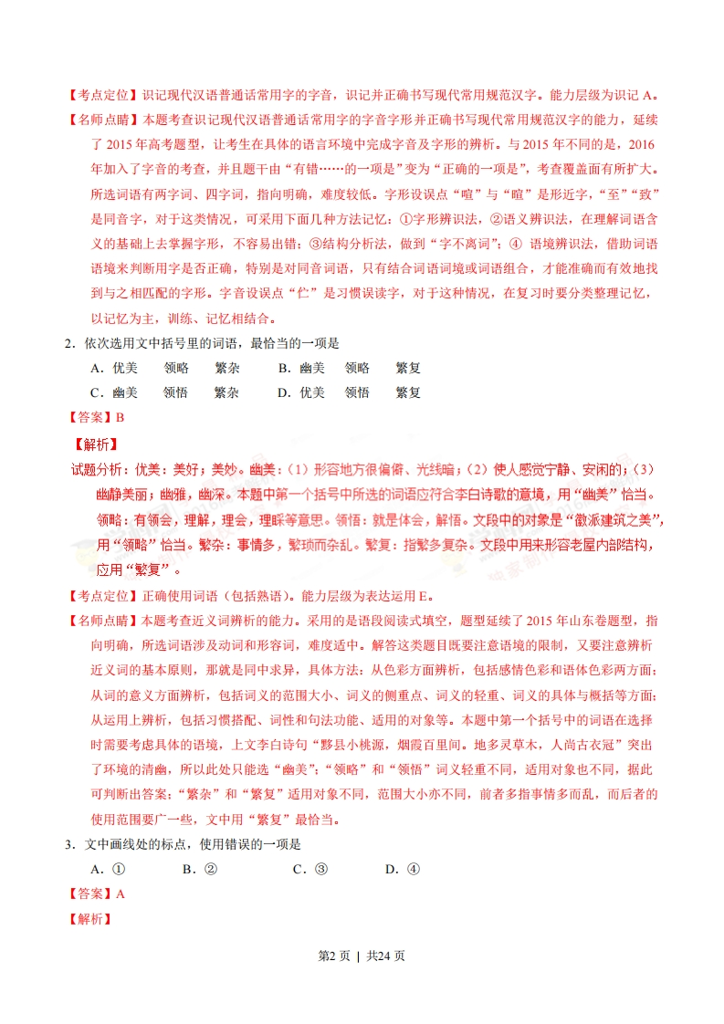 绝密★启用前2016年普通高等学校招生全国统一考试(山东卷)语文本试卷分第I卷和第Ⅱ卷两部分,共8页。满分150分。考试用时150分钟。考试结束后,将本试卷和答题卡一并交回。注意事项:1.答卷前,考生务必用0.5毫米黑色签字笔将自己的姓名、座号、考生号、县区和科类填写在答题卡和试卷规定的位置上。2.第I卷每小题选出答案后,用2B铅笔把答题卡上对应题目的答案标号涂黑:如需改动,用橡皮擦干净后,再选涂其他答案标号。答案写在试卷上无效。3.第Ⅱ卷必须用0.5毫米黑色签字笔作答,答案必须写在答题卡各题目指定区域内相应的位置,不能写在试卷上:如需改动,先划掉原来的答案,然后再写上新的答案:不能使用涂改液、胶带纸、修正带。不按以上要求作答的答案无效。第1卷(共36分)一、(每小题3分,共15分)黟县的西递和宏村,拥有蜚声海内外的徽派建筑群。两村背依青山,清流抱村穿户。数百幢明清时期的民居静静仁立。高大奇伟的马头墙有骄傲啤脱的表情、跌宕飞扬的韵质、①灰白的屋壁被时间涂画出斑驳的线条。李白的“黟县小桃源,烟霞百里间。地多灵草木,人尚古衣冠”,道出了这里山水风物的(优美/幽美)、民风人情的淳厚从容。要真正(领略/领悟)徽派建筑之美,该是在西递村。②在都市的睑哗之外,西递向我们呈现了一种宁静质朴的民间生活。从远处望去,西递是一片线条简洁的黑瓦铺成的屋顶和高大的白墙,黑白相间,③错落有致。迈入老屋你会发现,这些老屋内部的(繁杂/繁复)精致与外部的简洁纯粹形成鲜明的对照,徽派建筑中著名的三雕一④木雕、砖雕、石雕在这里体现得淋漓尽至。1.文中加点的字的注音和加点词语的字形,都正确的一项是A.蜚(fěi)喧哗B.幢(zhuang)宁静质朴C.色(chù)纯粹D.淳(chin)淋漓尽至【答案】B【解析】试题分析:A“喧哗”应为“喧哗”,形容声音大而杂乱。C“仁(cù)”应为“仁(zhù)”,仁立:长时间地站立,没有动作:也泛指站立。D“淋漓尽至”应为“淋漓尽致”,形容文章或说话表达得非常充分、透彻,或非常痛快。第1页|共24页【考点定位】识记现代汉语普通话常用字的字音,识记并正确书写现代常用规范汉字。能力层级为识记A【名师点睛】本题考查识记现代汉语普通话常用字的字音字形并正确书写现代常用规范汉字的能力,延续了2015年高考题型,让考生在具体的语言环境中完成字音及字形的辨析。与2015年不同的是,2016年加入了字音的考查,并且题干由“有错…的一项是”变为“正确的一项是”,考查覆盖面有所扩大。所选词语有两字词、四字词,指向明确,难度较低。字形设误点“喧”与“喧”是形近字,“至”“致”是同音字,对于这类情况,可采用下面几种方法记忆:①字形辨识法,②语义辨识法,在理解词语含义的基础上去掌握字形,不容易出错:③结构分析法,做到“字不离词”:④语境辨识法,借助词语语境来判断用字是否正确,特别是对同音词语,只有结合词语词境或词语组合,才能准确而有效地找到与之相匹配的字形。字音设误点“仁”是习惯误读字,对于这种情况,在复习时要分类整理记忆,以记忆为主,训练、记忆相结合。2.依次选用文中括号里的词语,最恰当的一项是A.优美领略繁杂B.幽美领略繁复C.幽美领悟繁杂D.优美领悟繁复【答案】B【解析】试题分析:优美:美好;美妙。幽美:(1)形容地方很偏僻、光暗;(2)使人感觉宁静、安闲的;(3)丝静美丽;幽雅,幽深。本题中第一个括号中所选的词语应符合李白诗歌的意境,用“幽美”恰当。领略:有领会,理解,理会,理睬等意思。领悟:就是体会,解悟。文段中的对象是“徽派建筑之美”,用“领略”恰当。繁杂:事情多,繁琐而杂乱。繁复:指繁多复杂。文段中用来形容老屋内结构,应用“繁复”。【考点定位】正确使用词语(包括熟语)。能力层级为表达运用E。【名师点睛】本题考查近义词辨析的能力。采用的是语段阅读式填空,题型延续了2015年山东卷题型,指向明确,所选词语涉及动词和形容词,难度适中。解答这类题目既要注意语境的限制,又要注意辨析近义词的基本原则,那就是同中求异,具体方法:从色彩方面辨析,包括感情色彩和语体色彩两方面:从词的意义方面辨析,包括词义的范围大小、词义的侧重点、词义的轻重、词义的具体与概括等方面:从运用上辨析,包括习惯搭配、词性和句法功能、适用的对象等。本题中第一个括号中的词语在选择时需要考虑具体的语境,上文李白诗句“黟县小桃源,烟霞百里间。地多灵草木,人尚古衣冠”突出了环境的清幽,所以此处只能选“幽美”:“领略”和“领悟”词义轻重不同,适用对象也不同,据此可判断出答案:“繁杂”和“繁复”适用对象不同,范围大小亦不同,前者多指事情多而乱,而后者的使用范围要广一些,文中用“繁复”最恰当。3.文中画线处的标点,使用错误的一项是A.①B.②C.③D.④【答案】A【解析】第2页|共24页试题分析:根据顿号的使用方法,如果并列词语中还有并列词语,大的并列词语要用逗号。本题中“有骄傲脾睨的表情”和“跌宕飞扬的韵质”是并列关系,中间己经使用顿号,那么“高大奇伟的马头墙有骄傲脾睨的表情、跌宕飞扬的韵质”和“灰白的屋壁被时间涂画出斑驳的线条”之间就不能再使用顿号,而应用逗号。【考点定位】正确使用标点符号。能力层级为表达运用E。【名师点睛】本题考查正确使用标