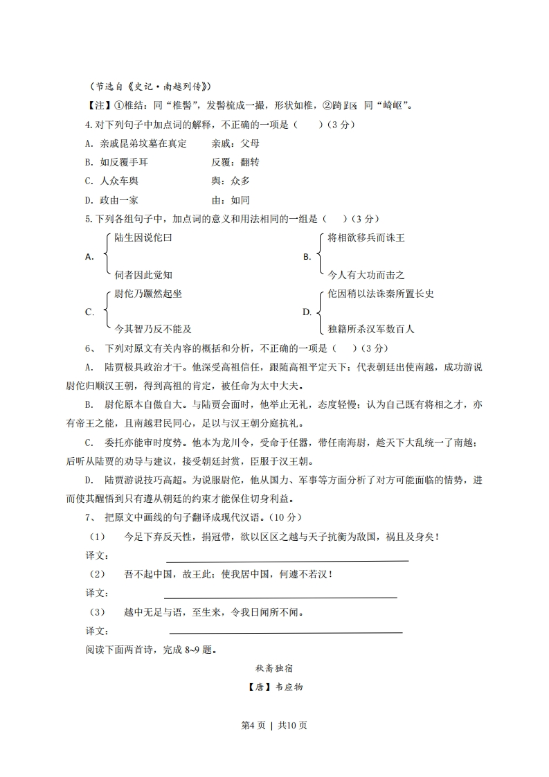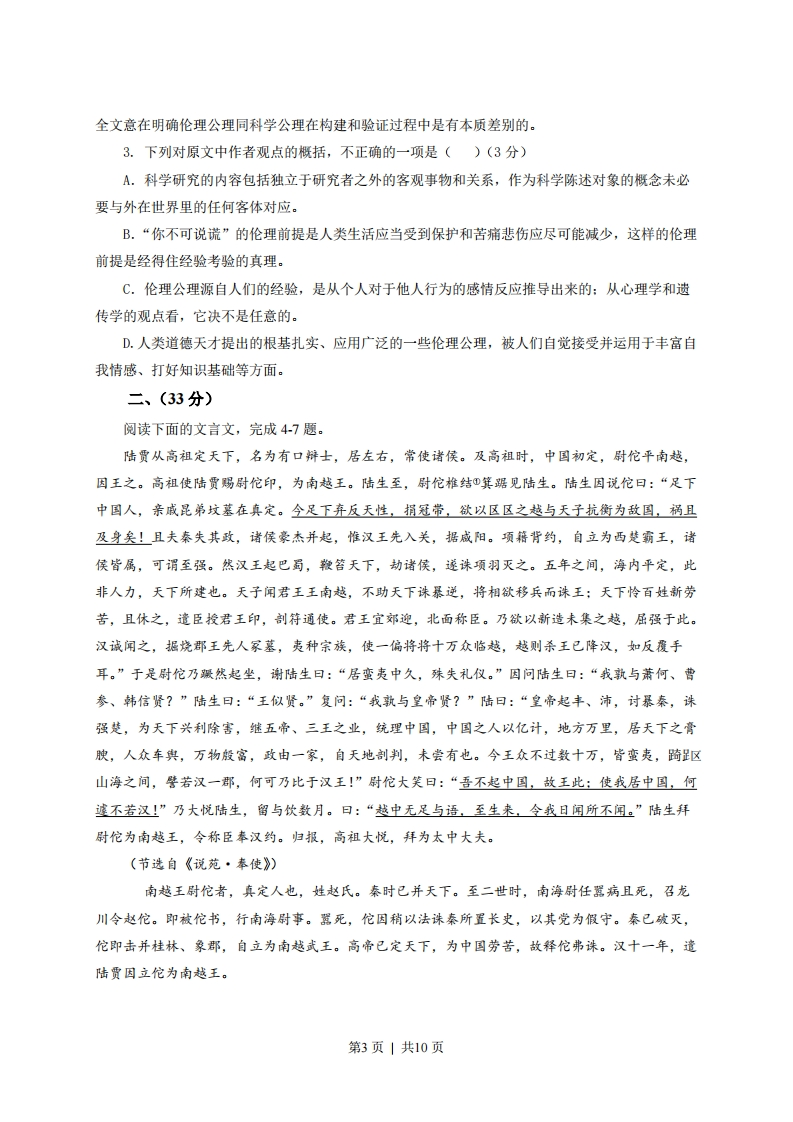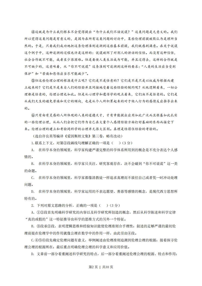 2013年高考安徽卷语文原卷(精编版)本试卷分为第I卷(阅读题)和第Ⅱ卷(表达题)。全卷满分150分,考试时间150分钟.考生注煮事项:1.答题前,务必在试题卷、答题卡规定的地方填写自己的姓名、座位号,并认真核对答题卡上所粘贴的条形码中的姓名、座位号与本人姓名、座位号是否一致。务必在答题卡背面规定的地方填写姓名和座位号后两位。2.答选择题(第I卷1~6题,第Ⅱ卷15~17题)时,每小题选出答案后,用2B铅笔把答题卡上所对应题目的答案标号涂黑。如需改动,用橡皮擦干净后,再选涂其他答案标号。3.答非选择题(第I卷7~14题,第Ⅱ卷18~21题)必须使用0.5毫米的黑色墨水签字笔在答题卡上书写,要求字体工整、笔迹清晰。作图题可先用铅笔在答题卡的规定的位置绘出,确认后再用0.5毫米的黑色墨水签字笔描清楚。必须在题号所指示的答题区域作答,超出答题区域书写的答案无效,在试题卷、草稿纸上答题无效。4.考试结束后,务必将试题卷和答题卡一并上交。第I卷(阅读题,共66分)一、(9分)阅读下面的文字,完成1~3题。①科学所研究的是那些被认为是独立于研究者个人而存在的关系。这也适用于把人本身作为研究对象的科学。料学陈述的对象还可以是我们自己创造出来的概念,像在数学中就是那样。我们不一定要假设这种概念是同外在世界里的任何客体相对应的。但是,一切科学陈述和科学定律都有一个共同的特征:它们是“真的或者假的”(适当的或者不适当的)。粗略地说来,我们对它们的反应是“是”或者是“否”。②科学的思维方式还有另一个特征。它为建立它的贯彻一致的体系所用到的概念用是不表达什么感情的。对于科学家,只有“存在”.而没有什么愿望,没有什么价值,没有善。没有恶:也没什么目标。只要我们逗留在科学本身的领域里,我们就绝不会碰到像“你不可以说谎”这样的句子。追求真理的科学家,他内心受到像清教徒一样的那种约束:他不能任性或感情用事。附带地说,这个特点是慢慢发展起来的,而且是现代西方思想所特有的。③由此看来,好像逻辑思维同伦理毫不相干。关于事实和关系的科学陈述,固然不能产生伦理的准则,但是逻辑思维和经验知识却能够使伦理准则合乎理性,并且联贯一致。如果我们能对某些基本的伦理命题取得一致,那么,只要最初的前提叙述得足够严谨,别的伦理命题就都能由它们推导出来。这样的伦理前提在伦理学中的作用,正像公理在数学中的作用一样。第1页|共10页④这就是为什么我们根本不会觉得提出“为什么我们不该说谎?”这类问题是无意义的。我们所以觉得这类问题是有意义的,是因为在所有这类问题的讨论中,某些伦理前提被默认为是理所当然的。于是,只要我们成功地把这条伦理准则追溯到这些基本前提,我们就感到满意。在关于说谎这个例子中,这种追溯的过程也许是这样的:说谎破坏了对别人的讲话的信任。而没有这种信任,社会合作就不可能,成者至少很困难。但是要使人类生活成为可能,并且过得去,这样的合作就是不可缺少的,这意味着,从“你不可说谎”这条准则可追溯到这样的要求:“人类的生活应当受到保护”和“苦痛和悲伤应当尽可能减少”。⑤但这些伦理公理的根源是什么呢?它们是不是任意的?它们是不是只是以权威为根据而建立起来的?它们是不是来自人们的经验并且间接地受着这些经验的制约呢?从纯逻辑看来,一切公理都是任意的,伦理公理也如此。但是从心理学和遗传学的观点看来,它们决不是任意的。它们是从我们天生的避免苦痛和灭亡的倾向,也是从个人所积累起来的对于他人行为的感情反应推导出来的。⑥只有由有灵感的人所体现的人类的道德天才,才有幸能提出应用如此广泛而且根基如此扎实的一些伦理公理,从而人们会把它们作为自己在大量个人感情经验方面打好基础的东西而接受下来。伦理公理的建立和考验同科学的公理并无很大区别。真理是经得住经验的考验的。(选自许良英等编译《爱因斯坦文集》第三卷,略有改动)1.联系上下文,对第②段画线句理解正确的一项是()(3分)A.在科学本身的领域里,科学家构建严谨完整的科学体系所用到的概念是不充分表达个人感情的。B.在科学本身的领域里,科学家只关注、研究客观存在,决不会碰到“你不可说谎”这一类的命题。C.在科学本身的领域里,科学家都像清教徒一样追求真理而不放任自己或者凭一时冲动处理问题。D.在科学本身的领域里,科学家运用的不表达愿望、善恶等感情的概念,是现代西方思想所特有的。2.下列对原文思路的分析,正确的一项是()(3分)A.①②段首先明确科学研究的内容以及科学研究所创造的概念,然后从科学陈述和科学定律“真的或假的”这一特征推导出科学的思维方式的另外一个特征。B.③段承②段,表明逻辑思维和经验知识能使伦理准则合乎理性:叙述的足够严谨的最初伦理前提在伦理学中的作用就像公理在数学中的作用一样,由此引出④段。C.④⑤©段先确定伦理问题有意义,举例阐述由伦理准则追溯到伦理公理的根源:接着探寻伦理公理的根源所在:最后重点明确伦理公理的科学意义和应用价值。D.文章前一部分着重阐述科学研究的特点,后一部分着重阐述伦理公理的根源、特点和作用:第2页|共10页全文意在明确伦理公理同科学公理在构建和验证过程中是有本质差别的。3.下列对