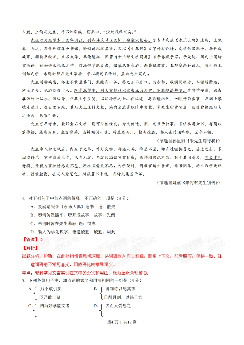 绝密★启用前2014年普通高等学校招生全国统一考试(安徽卷)语文本试卷分为第I卷(阅读题)和第Ⅱ卷(表达题)两部分,第I卷第1页至6页,第Ⅱ卷第7页至8页.全卷满分150分,考试时间150分钟.考生注意事项:1.答题前,务必在试题卷、答题卡规定的地方填写自己的姓名、座位号,并认真核对答题卡上所粘贴的条形码中的姓名、座位号与本人姓名、座位号是否一致。务必在答题卡背面规定的地方填写姓名和座位号后两位。2.答选择题(第I卷1~6题,第Ⅱ卷15~17题)时,每小题选出答案后,用2B铅笔把答题卡上所对应题目的答案标号涂黑。如需改动,用橡皮擦干净后,再选涂其他答案标号。3.答非选择题(第I卷7~14题,第Ⅱ卷18~21题)必须使用0.5毫米的黑色墨水签字笔在答题卡上书写,要求字体工整、笔迹清晰。作图题可先用铅笔在答题卡的规定的位置绘出,确认后再用0.5毫米的黑色墨水签字笔描清楚。必须在题号所指示的答题区域作答,超出答题区域书写的答案无效,在试题卷、草稿纸上答题无效。4.考试结束后,务必将试题卷和答题卡一并上交。第I卷(阅读题,共66分)一、(9分)阅读下面的文字,完成1~3题。①当今的艺术仿佛在兴致勃勃地享受一场技术的盛宴。戏曲舞台上眼花缭乱的灯光照射,3D电影院里上下左右晃动的座椅,魔术师利用各种光学仪器制造观众的视觉误差,摄影师借助计算机将一张平庸的面容修饰得貌若天仙…总之,从声光电的全面介入到各种闻所未闻的机械设备,技术的发展速度令人吃惊。然而,有多少人思考过这个问题:技术到底赋予了艺术什么?关于世界,关于历史,关于神秘莫测的人心一技术增添了哪些发现?在许多贪大求奢的文化工程、文艺演出中,我们不难看到技术崇拜正在形成。②技术是艺术生产的组成部分,艺术的创作与传播从来没有离开技术的支持。但即便如此,技术也从未扮演过艺术的主人。《史记》、《窦娥冤》、《红楼梦》…这些之所以成为经典,是因为它们的思想光芒与艺术魅力,而不是因为书写于竹简,上演于舞台,或者印刷在书本里。然而,在现代社会,技术的日新月异造就了人们对技术的盲目崇拜,以至于许多人没有察觉艺术生产正在出现一个颠倒:许多时候,技术植入艺术的真正原因其实是工业社会的技术消费,而不是艺术演变的内在冲动。换言之,这时的技术无形中晋升为领跑者,艺术更像是技术发明力图开拓的市场。③中国艺术的“简约”传统隐含了对于“炫技”的不屑。古代思想家认为,繁杂的技术具有炫目的迷惑性,目迷五色可能干扰人们对于“道”的持续注视。他们众口一词地告诚“文胜质”可能导致的危险,这第1页|共17页是古代思想家的人文情怀。当然,这并非号召艺术拒绝技术,而是敦促文化生产审慎地考虑技术的意义:如果不存在震撼人心的主题,繁杂的技术只能沦为虚有其表的形式。④这种虚有其表的形式在当下并不少见,光怪陆离的外观往往掩盖了内容的苍白。譬如众多文艺晚会和其他娱乐节目。大颜资金慷慨赞助,大牌演员频频现身,大众传蝶提供各种空间…形形色色的文艺晚会如此密集,以至于人们不得不怀疑:这个社会真的需要那么多奢华呈现吗?除了晚会还是晚会,如此贫乏的文化想象通常预示了主题的贫乏一这种贫乏多半与技术制造的华丽风格形成了鲜明的对比。此时的技术业已游离了艺术的初衷,众多的娱乐节目一而不是艺术一充当了技术的受惠者。⑤技术是一个中性的东西,是一种工具,关键在于怎么使用。对于技术的盲目崇拜无异于对于工具的盲目崇拜,这种崇拜的实质,是重技而轻道,重物而轻人。如果任由其泛滥,容易遮蔽掉技术背后真正关键的东西一使用技术的人的作用与良知。前一段诸多社会事件引起典论大哗的时候,并没有多少人将这些社会事件与技术联系起来。从瘦肉精饲料、三聚氘胺奶粉、毒胶囊的制作到利用电话、互联网精心设计的钱财欺诈,典论同声谴责的是无良企业、利欲熏心的商家、心狠手辣的骗子以及失职的监管机构,而技术研发者的责任似乎被轻轻放过,人们没有看到参与这些社会事件的技术人员出面道歉,这个环节成为盲点因而遭到遗忘一文化领域的事情也似乎常常如此。社会的进步、文化的繁荣,需要让技术与道德的关系重回人们的视野之中,如此我们方可避免陷入技术盲目常拜的陷阱与误区。(选自《新华文摘》2013年第23期,有删改)1.下列关于“技术崇拜”的表述,符合原文意思的一项是(3分)A.从现象看,技术崇拜就是大型文艺晚会中声光电的全面介入和各种闻所未闻的机械设备等诸多技术手段的过度应用。B.从原因看,技术崇拜过分强调日新月异的现代技术对艺术创作和传播的作用,许多时候源于艺术生产中的技术消费。C.从结果看,技术崇拜所形成的华丽风格,弥补了娱乐节目艺术主题的不足,从而让娱乐节目成为技术使用的受惠者。D.从实质看,技术崇拜无异于工具崇拜,重技而轻道,重物而轻人,忽视了艺术演变的内在冲动在艺术生产中的作用。【答案】D0双必究201【解析】试题分析:A不只是大型文艺晚会,应包活文化工程、文艺演出等,B应为“源于工业社会的技术消费”;C“弥补了娱乐节目艺术主题的不足”着,原文是“光任陆离的外观往往掩盖了内容的苍白”。注意李代桃僵错误,认真核对原文。找出文中相对应的释,与选项逐字逐句对照、比较。分析原因和结果的关