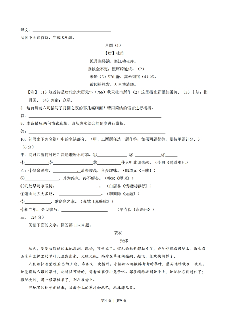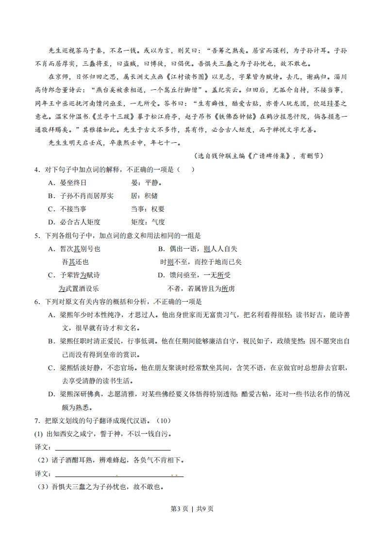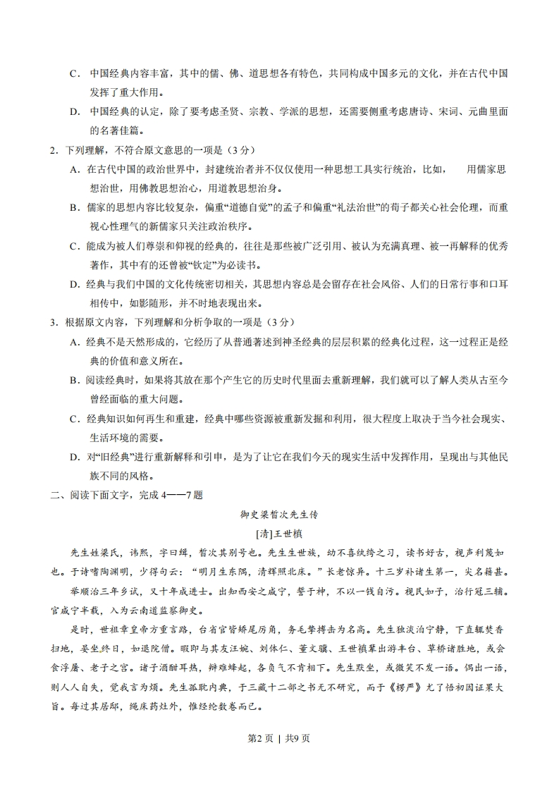 2015年高考语文安徽卷一、阅读下面的文字,完成1-3题。有人说到“经”,便有意无意地把它等同于“经典”,而提起“中国经典”,就转换成“儒家经典”。这种观念有些偏狭。中国经典绝不是儒家一家经典可以独占的,也应当包括其他经典,就像中国传统是“复数的”传统一样。首先,中国经典应当包括佛教经典,也应当包括道教经典。要知道,“三教合一”实在是东方的中国与西方的欧洲在文化领域中最不同的地方之一,也是古代中国政治世界的一大特色,即使是古代中国的皇帝,不仅知道“王霸道杂之”,也知道要“儒家治世,佛教治心,道教治身”,绝不只用一种武器。因此,回顾中国文化传统时,仅仅关注儒家的思想和经典,恐怕是过于狭窄了。即使是儒家,也包含了相当复杂的内容,有偏重“道德自觉”的孟子和偏重“礼法治世”的荀子,有重视宇宙天地秩序的早期儒家和重视心性理气的新儒家。应当说,在中国古代,关注政治统治秩序和社会伦理的儒家,关注超越世界和精神救赎的佛教,关注生命永恒和幸福健康的道教,分到承担着传统中国的不同责任,共同构成中国复数的文化。其次,中国经典不必限于圣贤、宗教和学派的思想著作,它是否可以包括得更广泛些?比如历史著作《史记》《资治通鉴》、比如文字学著作《说文解字》,甚至唐诗、宋词、元曲里面的那些名著佳篇。经典并非天然就是经典,他们都经历了从普通著述变成神圣经典的过程,这在学术史上叫“经典化”。没有哪部著作是事先照着经典的尺寸和样式量身定做的,只是因为它写的好,被(2页上部分)引用得多,被人觉着充满真理,又被反复解释,有的还被“钦定”为必读书,于是,就在历史中渐浙成了被尊崇、被仰视的经典。因此,如今我们重新阅读经典,又需要你把它放回产生它的时代里面,重新去理解,经典的价值和意义,也是层层积累的,对那些经典里传达的思想,原则甚至知识,未必需要亦步亦趋“照办不走样”,倒是要审时度势,活学活用,要进行“创造性的转化”。阅读经典可以使人民了解从古至今“人类究竟面临哪些重大问题”,但古代经典并不是不可以违逆的圣经,毕竞历史已经翻过了几千年。因此,对于古代经典,就不必因为他不负传统望而视为累赘包被,也不必因为他象征着传统而视为金科玉律,我的看法是:第一,经典在和口耳相传里面,他总会借尸还魂,第二,历史上的经典只是一个巨大的资源库,你不打开它,资源不会为你所用,而今天的社会现实和生活环境,是刺激经典知识是否以及如何再生和重建的背景,经典中的什么资源被重新发据出来,很大程度上取决于:“背景”召唤什么样的“历史记忆”,第三,经典在今天,是需要重新“解释”的,只有经过解释和引申,“旧经典”才能成为在我们今天的生活世界中继续起作用的,呈现出与其他名族不同风格的“新经典”。1.下列关于“中国经典”的表述,符合原文意思的一项是()A.中国经典一般意义上与“经”应该是一致的,将其转换成“儒家经典”的观念在作者看来则有些狭隘。B.中国经典的核心思想是“三教合一”,而“三教合一”正是中国与欧洲在文化领域中最为不同的地方之一。第1页|共9页C.中国经典内容丰富,其中的儒、佛、道思想各有特色,共同构成中国多元的文化,并在古代中国发挥了重大作用。D.中国经典的认定,除了要考虑圣贤、宗教、学派的思想,还需要侧重考虑唐诗、宋词、元曲里面的名著佳篇。2.下列理解,不符合原文意思的一项是(3分)A.在古代中国的政治世界中,封建统治者并不仅仅使用一种思想工具实行统治,比如,用儒家思想治世,用佛教思想治心,用道教思想治身。B.儒家的思想内容比较复杂,偏重“道德自觉”的孟子和偏重“礼法治世”的荀子都关心社会伦理,而重视心性理气的新儒家只关注政治秩序。C.能成为被人们尊崇和仰视的经典的,往往是那些被广泛引用、被认为充满真理、被一再解释的优秀著作,其中有的还曾被“钦定”为必读书。D.经典与我们中国的文化传统密切相关,其思想内容总是会留存在社会风俗、人们的日常行事和口耳相传中,如影随形,并不时地表现出来。3.根据原文内容,下列理解和分析争取的一项是(3分)A.经典不是天然形成的,它经历了从普通著述到神圣经典的层层积累的经典化过程,这一过程正是经典的价值和意义所在。B.阅读经典时,如果将其放在那个产生它的历史时代里面去重新理解,我们就可以了解人类从古至今曾经面临的重大问题。C.经典知识如何再生和重建,经典中哪些资源被重新发掘和利用,很大程度上取决于当今社会现实、生活环境的需要。D.对“旧经典”进行重新解释和引申,是为了让它在我们今天的现实生活中发挥作用,呈现出与其他民族不同的风格。二、阅读下面文字,完成4一一7题御史梁皙次先生传[清]王世慎先生姓莱氏,讳熙,字曰缉,皙次其别号也。先生生世族,幼不喜纨绔之习,读书好古,视声利蔑如也。于诗嗜陶渊明,少得句云:“明月生东隅,清辉照北床。”长老惊异。十三岁补诸生第一,尖名籍甚。举顺治三年乡试,又十年成进士。出知西安之威宁,誓于神,不以一钱自污。视民如子,治行冠三辅。官威宁半载,入为云南道监察御史。是时,世祖章皇帝方重言路,台省官皆矫尾厉角,务毛挚搏击为名高。先生独淡泊宁静,下直辄焚香扫地,晏坐终日,如退院僧。暇即与其友汪婉、刘