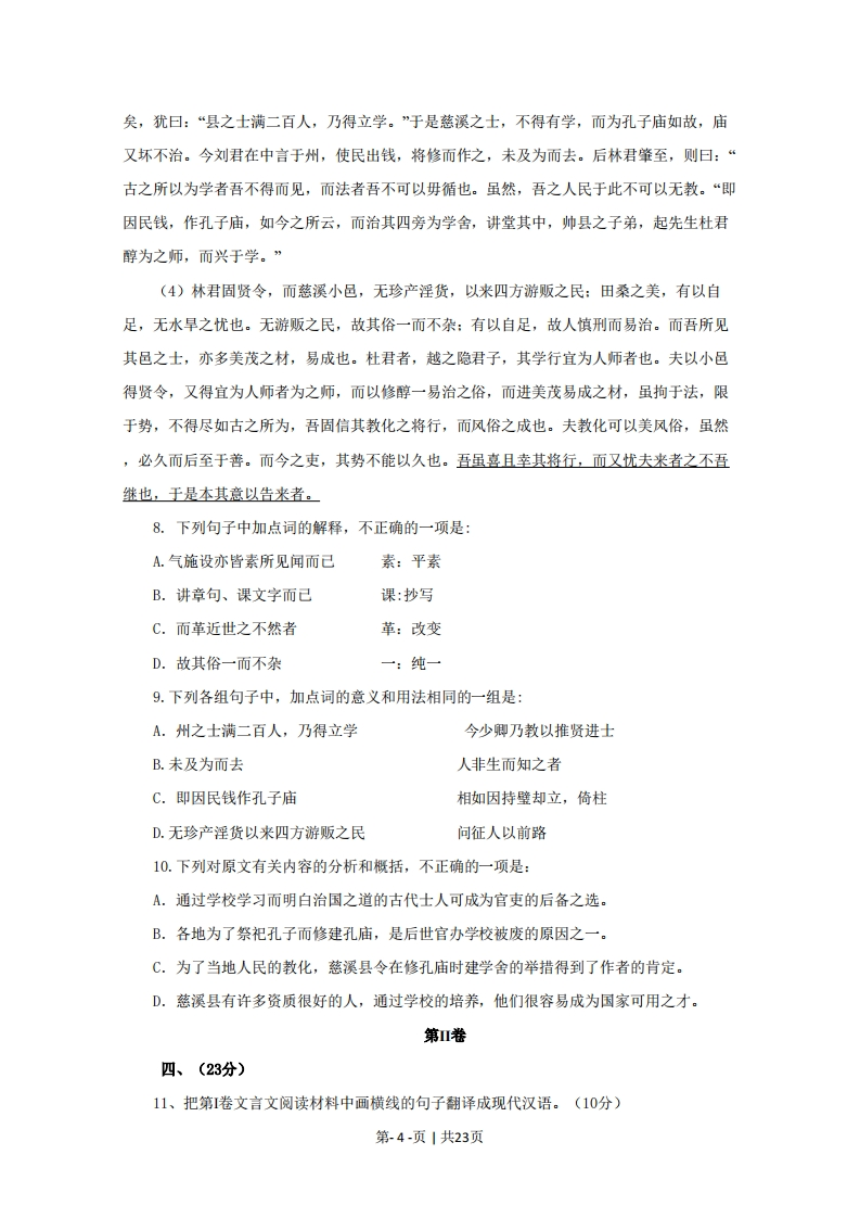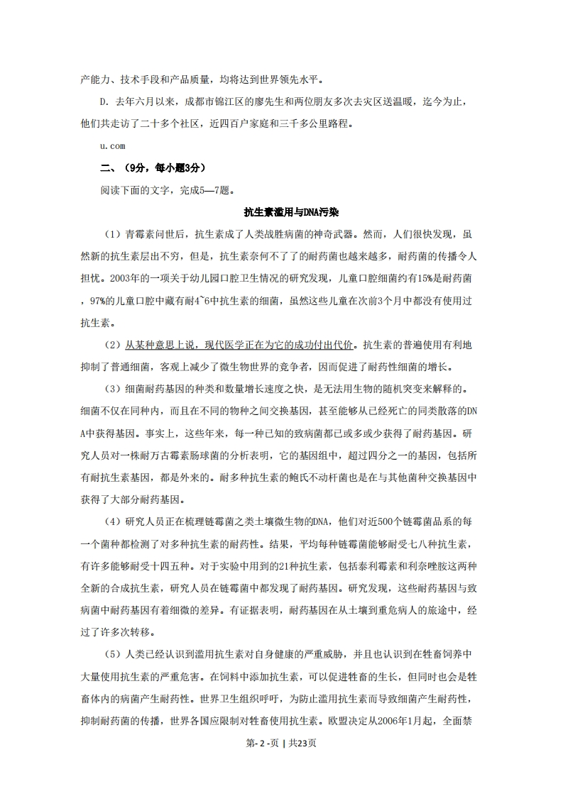 2009年普通高等学校招生全国统一考试(四川卷)解析语文第I卷一、选择题1.下列词语中加点的字,每对的读音完全相同的一组是A.遮蔽/弊端图圄/聆听不屈不挠饶有情趣B.隽永/眷念惊蛰/桎梏喟然长叹/功亏一篑C.侍候/吞噬吉祥/捷径溯流而上/夙兴夜寐D.瓦砾/隶书矗立/抽搐锲而不舍/提纲挈领2.下列词语中没有错别字的一组是A.倍增录像机拾人牙慧纷至踏来B.备至照像机招聘启示自作自受C.赡养钓鱼竿意气用事沧海一粟D.观瞻电线杆黔驴计穷姹紫嫣红3.下列各句中,加点词语使用正确的一项是A.这位大学毕业生虽然工作经验欠缺,实践能力不足,但在国家相关政策的扶持下,他们决心自主创业,牛刀小试,开创一番新事业。B.阳春三月的一天早晨,宜宾合江门广场迎来了越来越多的游客,一位年逾花甲的老人在广场上表演太极拳,引来无数行人侧目观看。C.2009年5月9日,我国著名相声演员李文华老人溘然长逝,这让他的老搭档姜昆深感失之交臂,沉侵在极度的悲痛之中。D.林和靖“梅妻鹤子”,隐居杭州孤山,固然很清高,但也要写出“疏影横斜水清浅,暗香浮动月黄昏”的绝唱,才能成为名人。4.下列各词中,没有语病的一句是A.这位曾经驰骋乒坛的名将己经回到了祖国,现就任于北京大学医学部教授,从事运动医学的教学与研究,为国家的体育事业贡献他的力量。B.参加研制神舟七号飞船的全体科技工作者,在相关部门大力支持下,在全国人民的热切关注中,经过不懈努力,神舟七号飞船终于成功发射。C.西班牙将投资8.2亿欧元,在我省建立世界上最大并最具竞争力的硅金属工厂,其生第-1-页1共23页产能力、技术手段和产品质量,均将达到世界领先水平。D.去年六月以来,成都市锦江区的廖先生和两位朋友多次去灾区送温暖,迄今为止,他们共走访了二十多个社区,近四百户家庭和三千多公里路程。u.com二、(9分,每小题3分)阅读下面的文字,完成5一7题。抗生素滥用与DNA污染(1)青霉素问世后,抗生素成了人类战胜病菌的神奇武器。然而,人们很快发现,虽然新的抗生素层出不穷,但是,抗生素奈何不了了的耐药菌也越来越多,耐药菌的传播令人担忧。2003年的一项关于幼儿园口腔卫生情况的研究发现,儿童口腔细菌约有15%是耐药菌,97%的儿童口腔中藏有耐46中抗生素的细菌,虽然这些儿童在次前3个月中都没有使用过抗生素。(2)丛某种意思上说,现代医学正在为它的成功付出代价。抗生素的普遍使用有利地抑制了普通细菌,客观上减少了微生物世界的竞争者,因而促进了耐药性细菌的增长。(3)细菌耐药基因的种类和数量增长速度之快,是无法用生物的随机突变来解释的。细菌不仅在同种内,而且在不同的物种之间交换基因,甚至能够从己经死亡的同类散落的DNA中获得基因。事实上,这些年来,每一种己知的致病菌都已或多或少获得了耐药基因。研究人员对一株耐万古霉素肠球菌的分析表明,它的基因组中,超过四分之一的基因,包括所有耐抗生素基因,都是外来的。耐多种抗生素的鲍氏不动杆菌也是在与其他菌种交换基因中获得了大部分耐药基因。(4)研究人员正在梳理链霉菌之类土壤微生物的DNA,他们对近500个链霉菌品系的每一个菌种都检测了对多种抗生素的耐药性。结果,平均每种链霉菌能够耐受七八种抗生素,有许多能够耐受十四五种。对于实验中用到的21种抗生素,包括泰利霉素和利奈唑胺这两种全新的合成抗生素,研究人员在链霉菌中都发现了耐药基因。研究发现,这些耐药基因与致病菌中耐药基因有着细微的差异。有证据表明,耐药基因在从土壤到重危病人的旅途中,经过了许多次转移。(5)人类己经认识到滥用抗生素对自身健康的严重威胁,并且也认识到在牲畜饲养中大量使用抗生素的严重危害。在饲料中添加抗生素,可以促进牲畜的生长,但同时也会是牲畜体内的病菌产生耐药性。世界卫生组织呼吁,为防止滥用抗生素而导致细菌产生耐药性,抑制耐药菌的传播,世界各国应限制对牲畜使用抗生素。欧盟决定从2006年1月起,全面禁第-2-页1共23页止将抗生素作为牲畜生长促进剂。(6)人畜粪便如果流入河道,或是作为饲料的一部分被撒入农田,其中的细菌就更加容易繁殖和传播其耐药基因。目前,研究人员正在调查,人畜粪便是如何在耐抗生素基因的蔓延中起作用的。(7)抗生素滥用造成的DNA污染威胁着人类的健康。5.对上文划线句子中“付出代价”的理解,不正确的一项是A各种耐药菌的快速传播现状令人担忧。B现在抗生素无法对付的细菌越来越多。C细菌耐药基因的种类和数量增长速度很快。D细菌能从死亡同类散落的DNA中获得基因。6.以下理解符合原文意思的一项是A耐万古霉素肠球菌的耐药基因是可以从其体外获得的。B土壤中链霉菌品系的每一个菌种对抗生素都有耐药性。C只要彻底杀死各种细菌就可阻断耐药基因的传播途径。D欧盟己经全面禁止在牲畜饲养过程中使用各种抗生素。7根据原文提供的信息,以下推断正确的一项是A人类需要不断开发各种新型抗生素来战胜各种不通的耐抗生素病菌。B土壤中的耐药基因经过多次转移,传播给人后其耐药性会逐步下降。C检测牲畜排泄物中有无耐药基因即可判定其饲料是否添加了抗生素。D只要科学、合理地使用抗生素,人们就不会感染各种耐抗生素病菌。三、(9分,每小题3分)阅读下面的文言文,完成8-10题(1)天下不可一日而无政教,故学不可