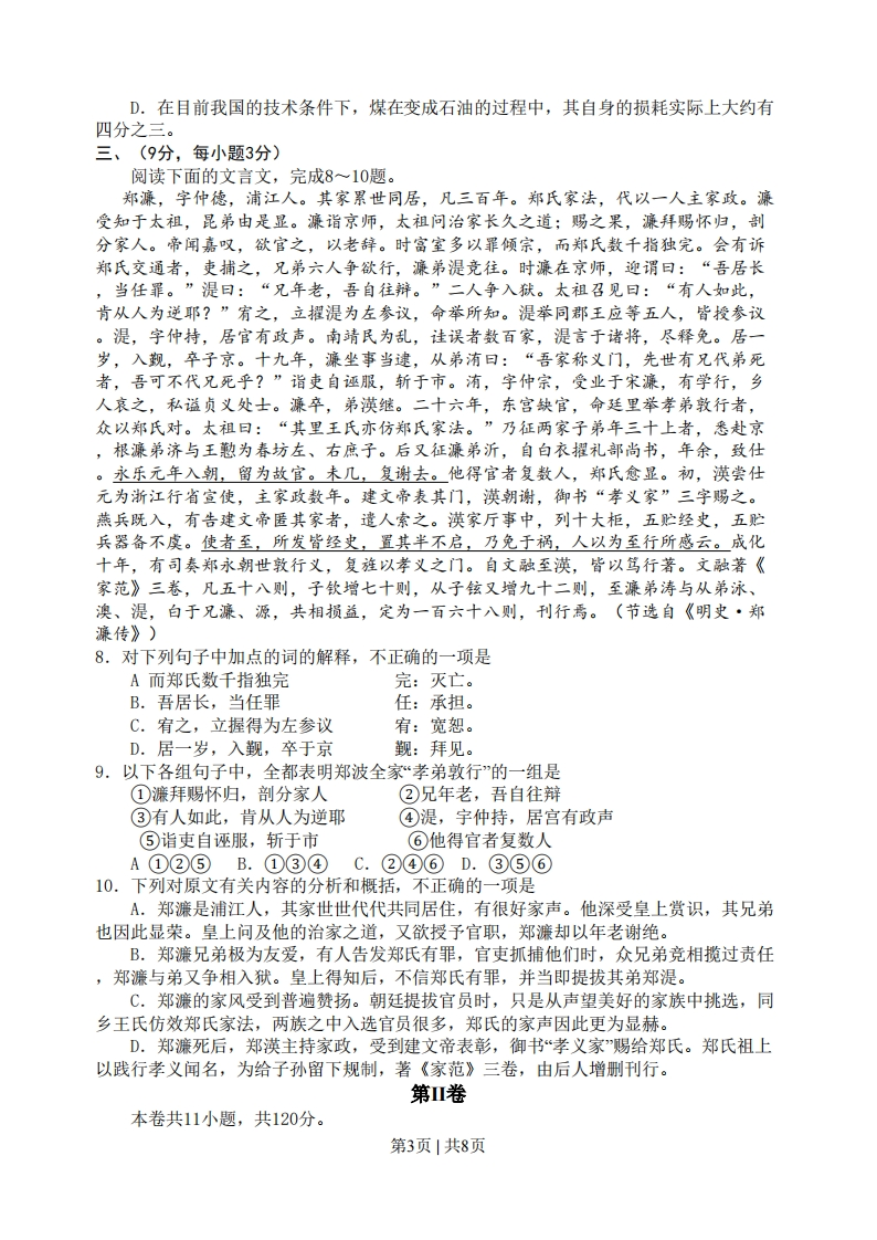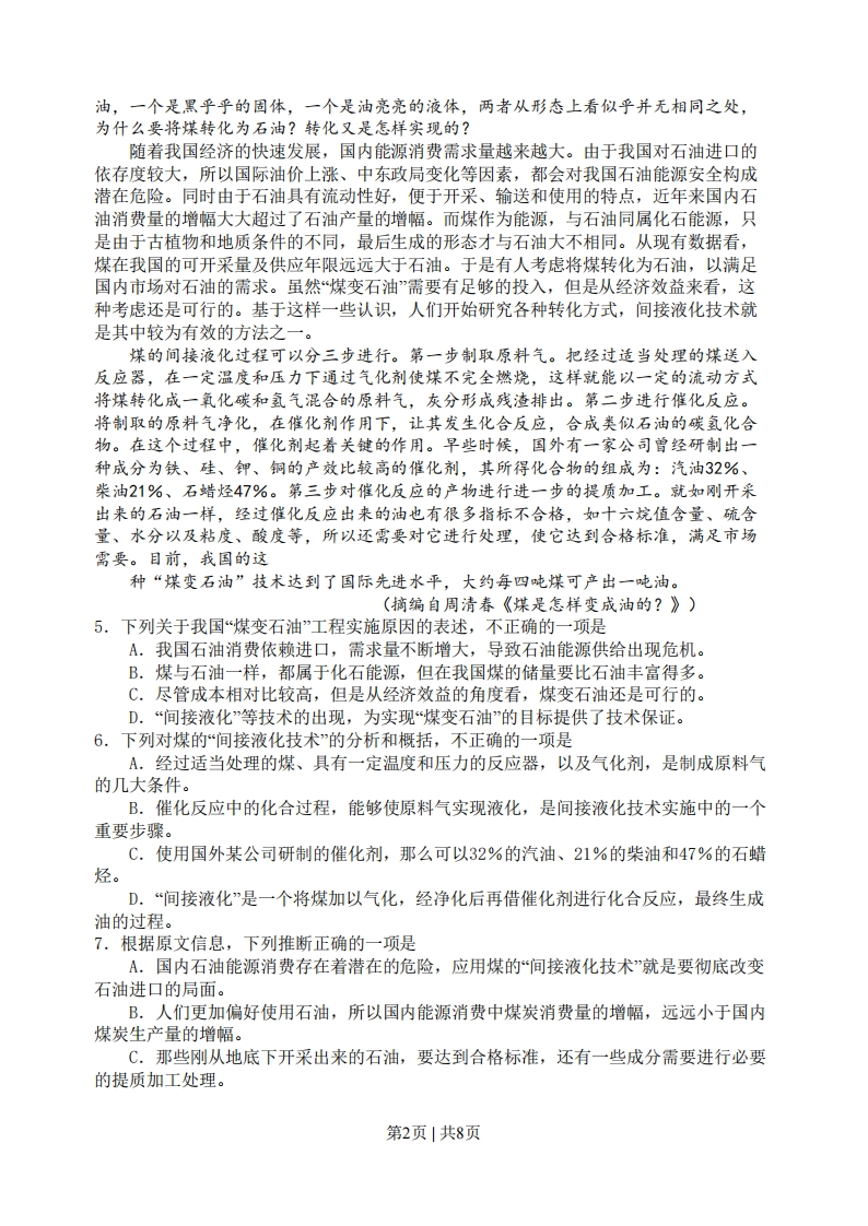 2008年普通高等学校招生全国统一考试(四川卷)语文第I卷本卷共10小题,每小题3分,共30分。在每小题给出的四个选项中。只有一项符合题目要求。一、(12分,每小题3分)1.下列词语中加点的字,每对读音都相同的一组是A.中肯/中意穿着/歪打正着得心应手/应接不暇B.创伤/重创桂冠/弹冠相庆好大喜功/乐善好施C.供稿/供应涤纶/羽扇纶巾厚古薄今/日薄西山D.解数/解读寒舍/退避三舍曲径通幽/曲尽其妙2.下列各句中,加点的成语使用不恰当的一句是A.有的父母习惯在饭桌上表扬或批评孩子,一边吃饭,一边轻描淡写地说几句,显得不够重视,孩子也没听进去,效果自然会差一些。B.“迎奥运文明礼仪之光北京欢迎您”展览,以漫画和歌谣这些人民大众喜闻乐见的艺术形式为载体,展现了北京的名胜古迹、市容新貌。C.微笑像和煦的春风,微笑像温暖的阳光,它蕴涵着一种神奇的力量,可以使人世间所有的烦恼都涣然冰释。D.今天我们提倡的创新,并不是要抛开先哲时贤的成果另起炉灶,而是要站在前辈的肩膀上一步一个脚印地前进,并努力超越前人。3.下列各句中,没有语病的一句是A,从调查的结果来看,该校学生的课余活动主要有班级野炊、年级文体比赛、校际联欢会等,内容丰富,形式多样。B,教育在综合国力的形成中处于基础地位,国力的强弱越来越多地取决于劳动者素质的提高,取决于各类人才培养的质量与数量。C,市政府决定配合奥运项目的实施,重点抓好地铁建设、危旧房改造、污水处理等工程工作,加快现代化大都市建设的进程。D.学习方法可能因人而异,但勤奋、努力等良好的学习态度和合理的时间安排却是每个想取得成功的学生所必须具备的。4.依次填入下面横线处的语句,衔接最恰当的一组是人格」①它要求一个人应有高尚的道德追求②勇于承担对他人、对社会的道德义务③是做人的尊严、价值和品质的总和④正确处理个人与他人、个人与社会的关系⑤是指人与动物相区别的内在规定性⑥做到自尊、自爱、自强、自律A.③⑥①④⑤②B.③⑤①②③④C.⑤②①6④③D.⑤③①②4⑥二、(9分,每小题3分)阅读下面的文字,完成5~7题。目前,我国“煤变石油”的产业化进程正在有序进行之中。也许有人会问,煤和石第1页|共8页油,一个是黑乎乎的固体,一个是油亮亮的液体,两者从形态上看似乎并无相同之处,为什么要将煤转化为石油?转化又是怎样实现的?随着我国经济的快速发展,国内能源消费需求量越来越大。由于我国对石油进口的依存度较大,所以国际油价上涨、中东政局变化等因素,都会对我国石油能源安全构成潜在危险。同时由于石油具有流动性好,便于开采、输送和使用的特点,近年来国内石油消费量的增幅大大超过了石油产量的增幅。而煤作为能源,与石油同属化石能源,只是由于古植物和地质条件的不同,最后生成的形态才与石油大不相同。从现有数据看,煤在我国的可开采量及供应年限远远大于石油。于是有人考虑将煤转化为石油,以满足国内市场对石油的需求。虽然“煤变石油”需要有足够的投入,但是从经济效益来看,这种考虑还是可行的。基于这样一些认识,人们开始研究各种转化方式,间接液化技术就是其中较为有效的方法之一。煤的间接液化过程可以分三步进行。第一步制取原料气。把经过适当处理的煤送入反应器,在一定温度和压力下通过气化剂使煤不完全燃烧,这样就能以一定的流动方式将煤转化成一氧化碳和氢气混合的原料气,灰分形成残渣排出。第二步进行催化反应。将制取的原料气净化,在催化剂作用下,让其发生化合反应,合成类似石油的碳氢化合物。在这个过程中,催化剂起着关键的作用。早些时候,国外有一家公司曾经研制出一种成分为铁、硅、钾、铜的产效比较高的催化剂,其所得化合物的组成为:汽油32%、柴油21%、石蜡烃47%。第三步对催化反应的产物进行进一步的提质加工。就如刚开采出来的石油一样,经过催化反应出来的油也有很多指标不合格,如十六烷值含量、疏含量、水分以及粘度、酸度等,所以还需要对它进行处理,使它达到合格标准,满足市场需要。目前,我国的这种“煤变石油”技术达到了国际先进水平,大约每四吨煤可产出一吨油。(摘编自周清春《煤是怎样变成油的?》)5.下列关于我国“煤变石油”工程实施原因的表述,不正确的一项是A.我国石油消费依赖进口,需求量不断增大,导致石油能源供给出现危机。B.煤与石油一样,都属于化石能源,但在我国煤的储量要比石油丰富得多。C,尽管成本相对比较高,但是从经济效益的角度看,煤变石油还是可行的。D.“间接液化等技术的出现,为实现“煤变石油”的目标提供了技术保证。6.下列对煤的间接液化技术”的分析和概括,不正确的一项是A.经过适当处理的煤、具有一定温度和压力的反应器,以及气化剂,是制成原料气的几大条件。B.催化反应中的化合过程,能够使原料气实现液化,是间接液化技术实施中的一个重要步骤。C.使用国外某公司研制的催化剂,那么可以32%的汽油、21%的柴油和47%的石蜡烃。D.“间接液化”是一个将煤加以气化,经净化后再借催化剂进行化合反应,最终生成油的过程。7.根据原文信息,下列推断正确的一项是A.国内石油能源消费存在着潜在的危险,应用煤的“间接液化技术”就是要彻底改变石油进口的局面。B.人们更加偏好使用石油,所以国内能源