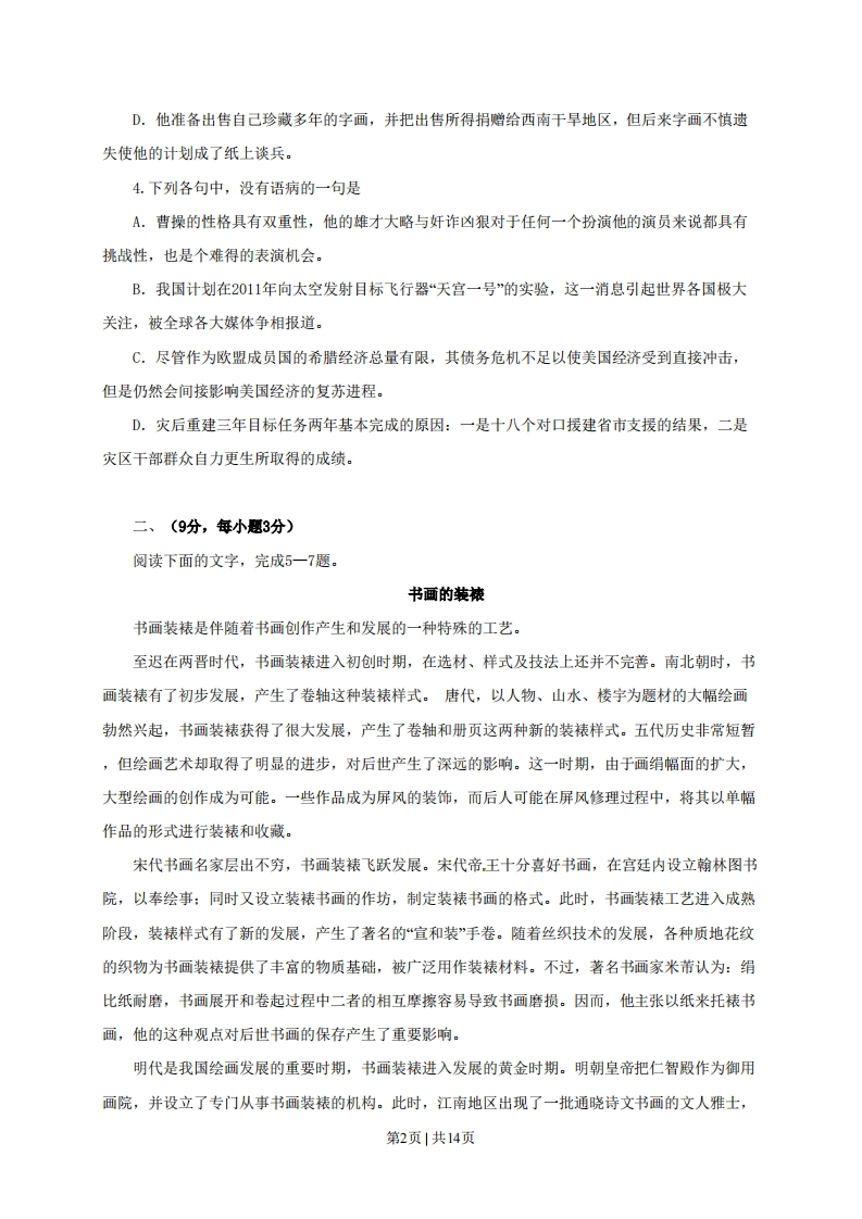 2010年普通高等学校招生全国统一考试试题解析语文(四川卷)本试卷分第I卷(选择题)和第Ⅱ卷(非选择题)两部分,第I卷第1页至第4页,第Ⅱ卷第5页至第11页。满分150分,考试时间150分钟。考试结束后,将本试卷和答题卡一并交回。第虹卷注意事项:1.答第I卷,考生务必将自己的姓名、准考证号、考试科目涂写在答题卡上。2.每小题选出答案后,用铅笔把答题卡上对应题目的答题标号涂黑。如需改动,用橡皮擦干净后,再选涂其他答案标号。不能答在试卷上。[来源:学科网]3.本卷共10小题,每小题3分,共30分。在每小题给出的四个选项中,只有一项符合题目本意一、(12分,每小题3分)1.下列词语中加点的字,每对的读音完全相同的一组是()A.皱纹/骤然杀戮/山麓琼楼玉宇/群龙无首B.挟持/偕同竹笋/损失柳暗花明/扭转乾坤C.肋骨/擂台嗟叹/街道追根溯源/素昧平生D.游泳/踊跃祝贺/豁达倾家荡产/轻装简从2.下列词语中没有错别字的一组是()A.驰援万户侯明察秋毫急风劲草B.规矩流线形歪风邪气通宵达旦C.催眠及时雨寸草春辉防患未然D.签订护身符·屈指可数语无伦次3.下列各句中,加点词语使用恰当的一句是A.传统的“严父慈母”在一些三口之家中逐渐演变为“慈父严母”。以前严厉的父亲如今在这些家庭中扮演着唱红脸的角色。B.该县有关部门决定在今后两年内斥资对这位名人的故里进行修复,把它们打造成精品,以吸引外地游客,使当地旅游人气更旺。C.经过多年的深入研究,该课题组撰写了专题报告,对我国票据法的特色及其立法决策中的几个问题进行了分析论述。第1页1共14页D.他准备出售自己珍藏多年的字画,并把出售所得捐赠给西南干旱地区,但后来字画不慎遗失使他的计划成了纸上谈兵。4.下列各句中,没有语病的一句是A.曹操的性格具有双重性,他的雄才大略与奸诈凶狠对于任何一个扮演他的演员来说都具有挑战性,也是个难得的表演机会。B.我国计划在2011年向太空发射目标飞行器“天宫一号”的实验,这一消息引起世界各国极大关注,被全球各大媒体争相报道。C.尽管作为欧盟成员国的希腊经济总量有限,其债务危机不足以使美国经济受到直接冲击,但是仍然会间接影响美国经济的复苏进程。D.灾后重建三年目标任务两年基本完成的原因:一是十八个对口援建省市支援的结果,二是灾区干部群众自力更生所取得的成绩。二、(9分,每小题3分)阅读下面的文字,完成5一7题。书画的装辣书画装裱是伴随着书画创作产生和发展的一种特殊的工艺。至迟在两晋时代,书画装裱进入初创时期,在选材、样式及技法上还并不完善。南北朝时,书画装裱有了初步发展,产生了卷轴这种装裱样式。唐代,以人物、山水、楼宇为题材的大幅绘画勃然兴起,书画装裱获得了很大发展,产生了卷轴和册页这两种新的装裱样式。五代历史非常短暂,但绘画艺术却取得了明显的进步,对后世产生了深远的影响。这一时期,由于画绢幅面的扩大,大型绘画的创作成为可能。一些作品成为屏风的装饰,而后人可能在屏风修理过程中,将其以单幅作品的形式进行装裱和收藏。宋代书画名家层出不穷,书画装裱飞跃发展。宋代帝王十分喜好书画,在宫廷内设立翰林图书院,以奉绘事:同时又设立装裱书画的作坊,制定装裱书画的格式。此时,书画装裱工艺进入成熟阶段,装裱样式有了新的发展,产生了著名的“宣和装”手卷。随着丝织技术的发展,各种质地花纹的织物为书画装裱提供了丰富的物质基础,被广泛用作装裱材料。不过,著名书画家米芾认为:绢比纸耐磨,书画展开和卷起过程中二者的相互摩擦容易导致书画磨损。因而,他主张以纸来托裱书画,他的这种观点对后世书画的保存产生了重要影响。明代是我国绘画发展的重要时期,书画装裱进入发展的黄金时期。明朝皇帝把仁智殿作为御用画院,并设立了专门从事书画装裱的机构。此时,江南地区出现了一批通晓诗文书画的文人雅士,第2页共14页文人画有了很大的发展。在这种背景下,以苏州为发祥地的“苏裱”开始兴起并广受推崇,书画装裱出现了“普天之下独逊吴中”的景象。在书画装裱样式方面,原有的手卷、册页等在装裱样式上更加完备,挂轴画己经基本定型并开始普及,万历年间在挂轴的基础上,产生了对联这种新的装裱样式。在装裱理论方面,周嘉胄所著的《装潢志》成为中国历史上第一部专门的书画装裱理论著作。书画装裱因为所在的地区以及使用的工具、材料的不同,加上装裱格调、工艺的差异,形成了不同的流派和风格。清代出现的“京裱”与“苏裱”并称为中国书画装裱的两个主要流派。“京裱”古朴庄重,讲求防燥、防裂:“苏裱”工艺精湛,用料考究,讲求防霉、防蛀,直至今日,这两个流派仍然影响着中国的书画装裱。书画装裱能够更好地表现书画的艺术魅力,使书画得以长期保存,对繁荣传统文化发挥着独特作用。《五牛图》《清明上河图》等珍贵名画能够幸存至今,很大程度上是经过装裱与修复的缘故5、下列关于“书画装裱”的理解,不符合原文意思的一项是A、书画装裱选材、样式及技法的不完善使书画装裱发展迟缓B、各种质地花纹的织物使书画装裱材料有了更大的选择空间[来源:学科网ZXXK]C、书画创作的繁荣能促进书画装裱工艺的不断发展和成熟D、统治者的重视促进了宋明两代书画装裱工艺的不新发展。6、下列表述,符合原文意