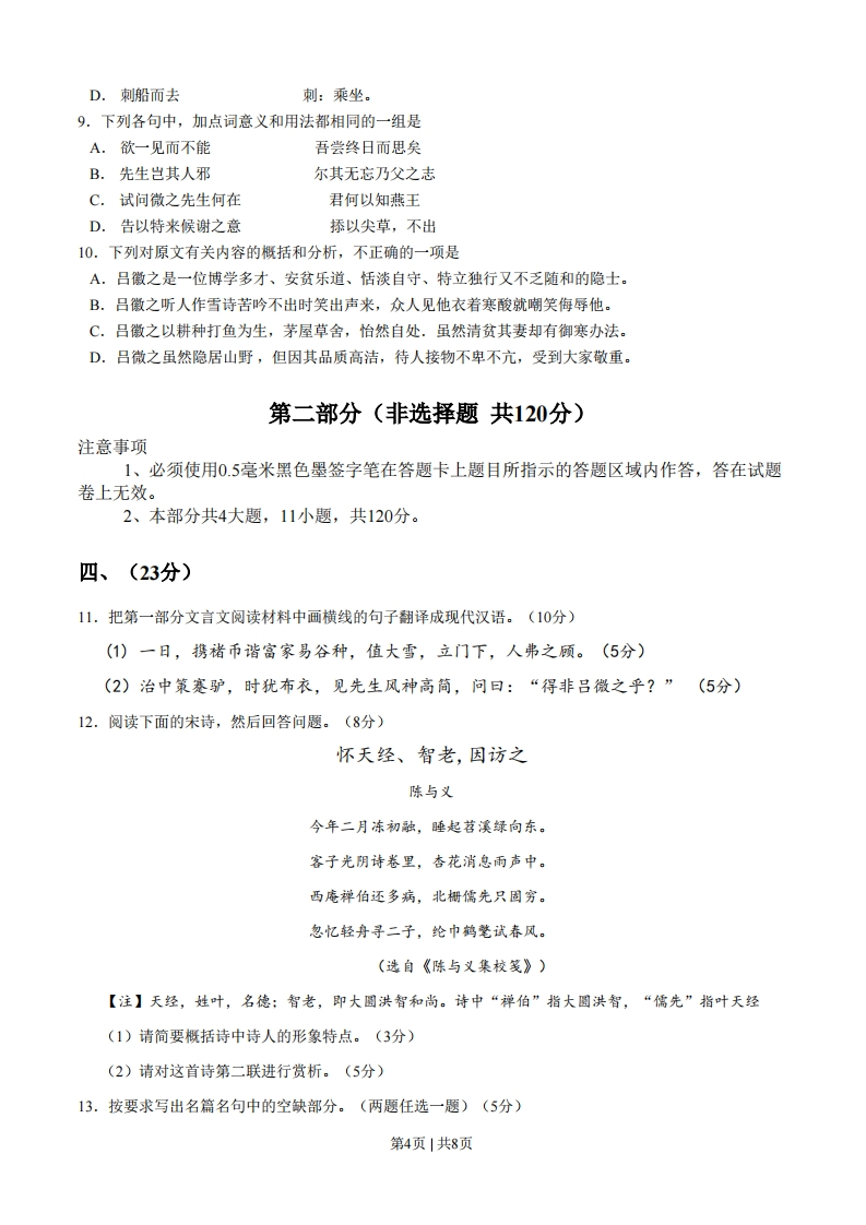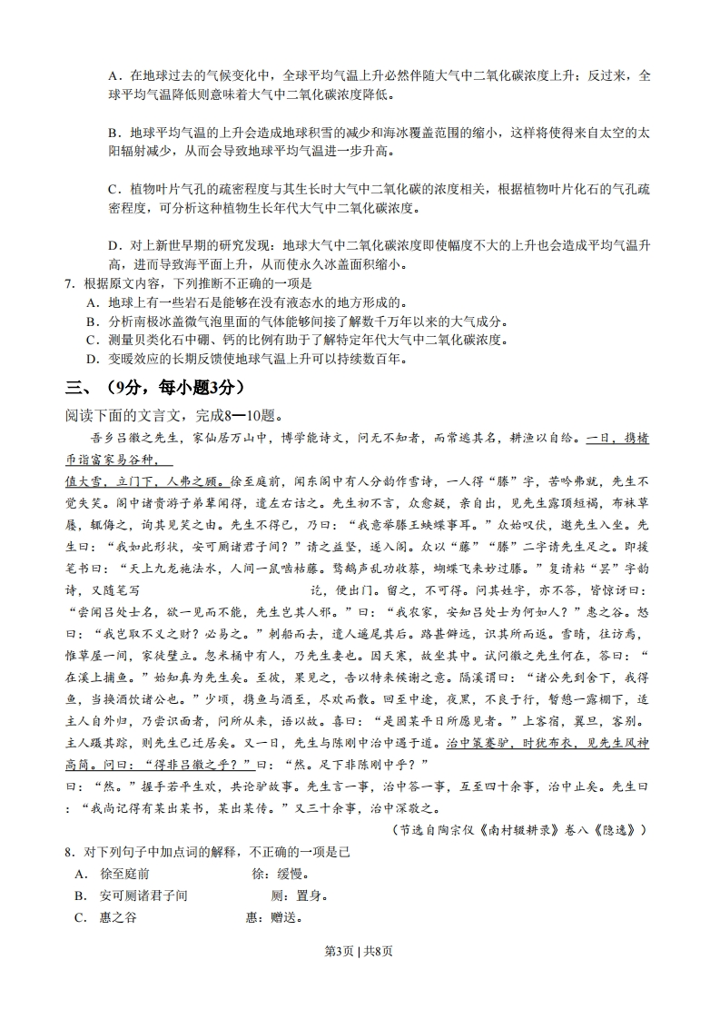 语文第一部分(选择题共30分)一、(12分,每小题3分)1、下列词语中加点的字,读音全都正确的一组是A、吉祥(j1)棱角(11ng)狡黠(xid)长吁短叹(x)B、浸润(jin)毫然(md)腈纶(q1ng)残碑断碣(jié)C、喟叹(kui)愤慨(ki)盥洗(gudn)呱瓜坠地(gu0)D、阻挠(no)女娲(wa)咯血(kǎ)戛然而止(j)2、下列词语中,没有错别字的一组是A、胳膊挖墙脚墨守成规卑躬屈膝B、骨骼莫须有囤积居奇以逸代劳C、彗星座右铭鸠占雀巢在所不惜D、慧眼吓马威星罗棋布面面俱到3、下列各句中,加点词语使用恰当的一句是A、我刊以介绍自然风光、名胜古迹为主,内容丰官,图文并茂,融知识性、趣味性、可读性于一炉,欢迎广大读者到各地邮局征订本刊。B、官府的横暴和百姓的苦难,深深刺激着杜甫的心,他以悲天悯人的情怀写下的“三吏”、“三别”至今仍能引起人们的情感共鸣。C、在岗位技术培训之后,小李成为了生产明星,2010年,他完成的全年工作量超过规定指标的百分之四十,获得了所在企业的嘉奖。D、九寨沟之奇,奇在水,奇在云,奇在雾,奇在乍晴乍雨,波光云影,色彩斑斓,如梦如幻,不由得不让人惊叹大自然的巧夺天工。4、下列各句中,没有语病的一句是A、今年暑假,我市将举办第12届中学生运动会,我校参加这届运动会的20名男运动员和14名女运动员,均是由班级和年级层层选拔出来的优秀选手组成,B、2010年4月10日,第8颗北斗导航卫星的发射进入倒计时,西昌卫星发射中心各个岗位的工作人员对火箭起飞前进行了最后的检查,满怀信心等待着发射时刻的到来。C、现代高新技术在图书馆领域的广泛应用,引发了图书馆运行机制的变革,其结果将会出现一全套的信息交流系统,从而对图书馆的发展产生重大影响。D、为增强全体员工的文明服务意识,进一步提高职业道德素质,我省某商业银行将采取强有力的措施,在本系统内广泛推行文明服务用语和服务忌语。第1页|共8页二、(9分,每小题3分)阅读下面的文字,完成5一7题古气候研究敲响气候变暖警钟过去5亿年里,地球高温期一般与大气中二氧化碳浓度较高的时期相吻合,反之亦然。目前,科学家正研究地球历史上的气侯变迁,以预测今后大气中二氧化碳浓度上升时地球气侯会发生怎样的变化,而不仅仅依靠计算机模型的预测。研究地球历史上的气候变迁可利用各种各样的线索。岩石可以揭示它们形成时期的环境信息,如许多岩石只能在有液态水的地方才会形成。测量南极冰盖中微气泡里的二氧化碳含量,能了解过去大气中二氧化碳的浓度,但可回溯的时间并不长。要了解更久远时期大气中二氧化碳浓度,必须用间接方法,如建立模型来研究各种长期影响大气中二氧化碳水平的因素。这些模型能显示数千万年来大气中二氧化碳平均含量的变化,但是无法提供短期波动的信息。测量植物叶片化石的气孔密度,也可以了解过去大气中二氧化碳的浓度。另外,还可以测量浅海贝类化石中硼、钙的比例,因为这个比例和这些贝类生长时的海洋酸度有关,而海洋酸度又与大气中二氧化碳水平相关联。研究过去的气侯变化能够更好地了解地球的气侯敏感性。气侯敏感性,是指当大气中二氧化碳浓度增加一倍时的辐射强迫所产生的全球平均温度变化。根据相关研究,如果其他条件保持不变,大气中二氧化碳含量每增加一倍,地球平均气温将上升1摄氏度。但是,当地球气侯变暖时,很多因素都会跟着一起变化。例如,气候变暖使大气中包含更多水蒸气,而水蒸气是一种强力的大气保温气体:气候变暖还会减少积雪和缩小海冰的覆盖范围,这将导致被反射回太空的太阳辐射减少,从而导致气温进一步升高。联合国有关机构最近预测:在考虑了这些反馈效应之后。计算机模型得出的气候敏感性在2~4.5摄氏度之间,最佳估计值为3撮氏度。其实,计算机模型只考虑了对变暖效应的快速反馈,而那些几十年或几百年之后才会显现的反馈,例如陆地冰原范围的变化则被忽略了。因此,真正的气候敏感性可能比计算机模型预测的更高。由于现有的气候模型无法考虑长期反馈的影响,要获得更确切的气侯敏感性.唯一的途径是研究过去大气中二氧化碳浓度增加对地球气候的影响。为了使结果更准确,科学家研究了和现在相似的上新世早期(约450万年前),当时大气中二氧化碳浓度约为400ppm(1ppmF百万分之一),仅比现在高一点,但当时的地球平均气温却比现在高3摄氏度,海平面比现在高25米。而永久冰盖面积也比现在小。对上新世的研究发现,当时的气候敏感性为二氧化碳浓度每增加一倍,平均气温升高4.5撮氏度。如果现在大气中二氧化碳浓度增加一倍,那么可以预见,短期内地球平均气温会升高3摄氏度左右,而且在接下去的几百年里,气温还将持续攀升,被全球气侯变暖困扰的人类将面临更大的危机。5.下列关于“气候敏感性”的理解.不正确的一项是A.在大气中二氧化碳浓度增加一倍的条件下,气候敏感性越高表明地球平均气温上升幅度越大。B.要获得更确切的气候敏感性,目前只能够研究过去大气中二氧化碳浓度的增加对气候的影响。C.联合国有关机构用计算机模型预测气候敏感性时,充分考虑了随着气候变暖而变化的各种因素。D.不同时期气候敏感性不完全相同,研究上新世早期气候敏感性对认识今天气候变暖顿有价值。6.下列理解,符合原文意思的一项是第2页|共8页A,在地球过去的气候变化中,全球平均气