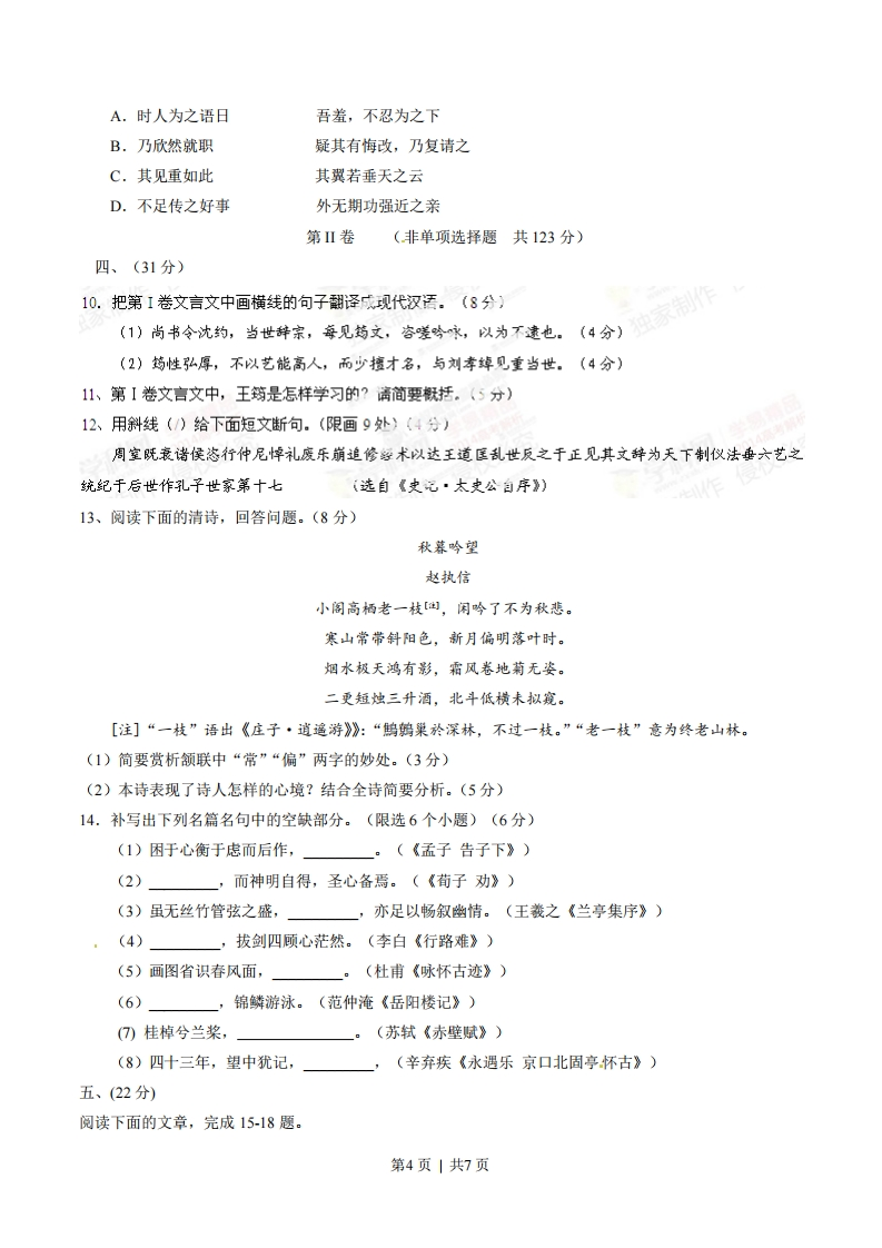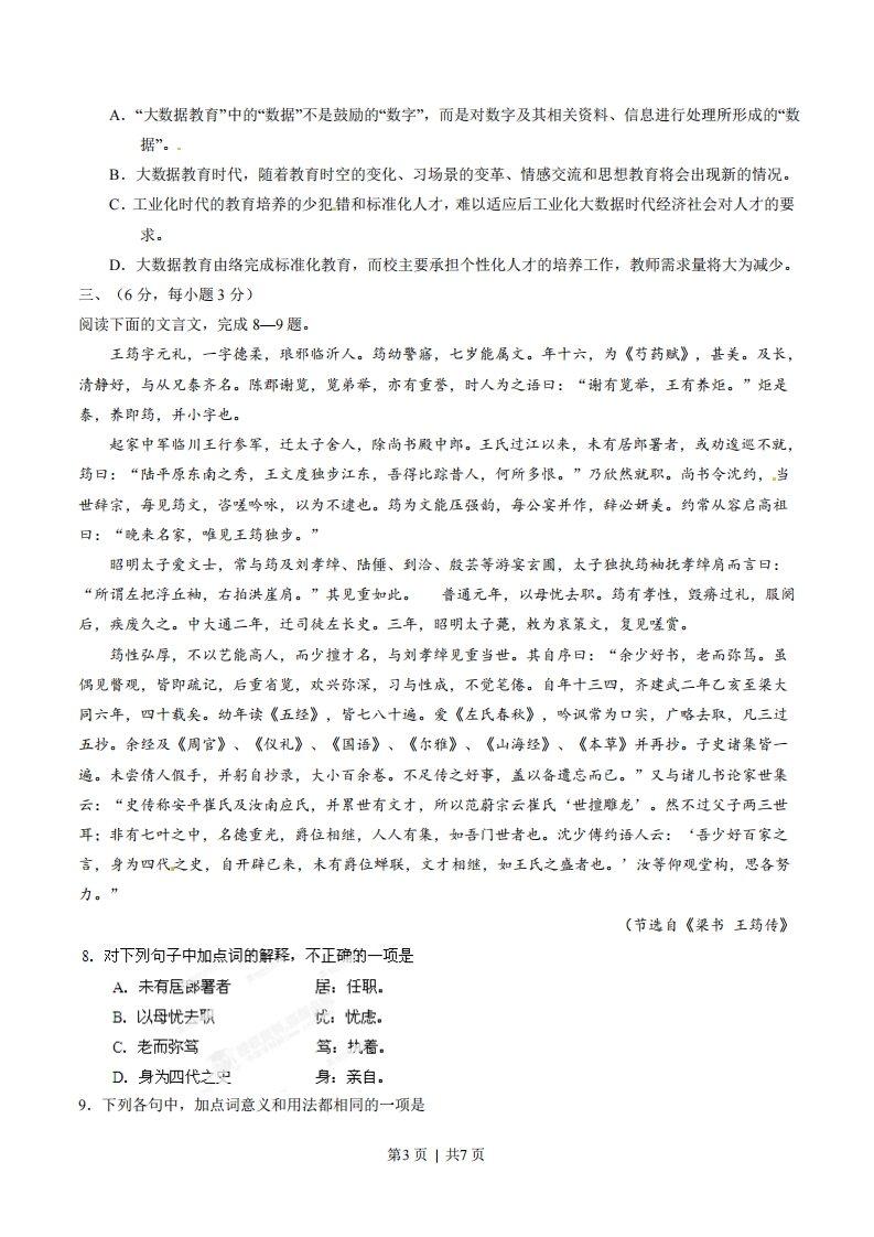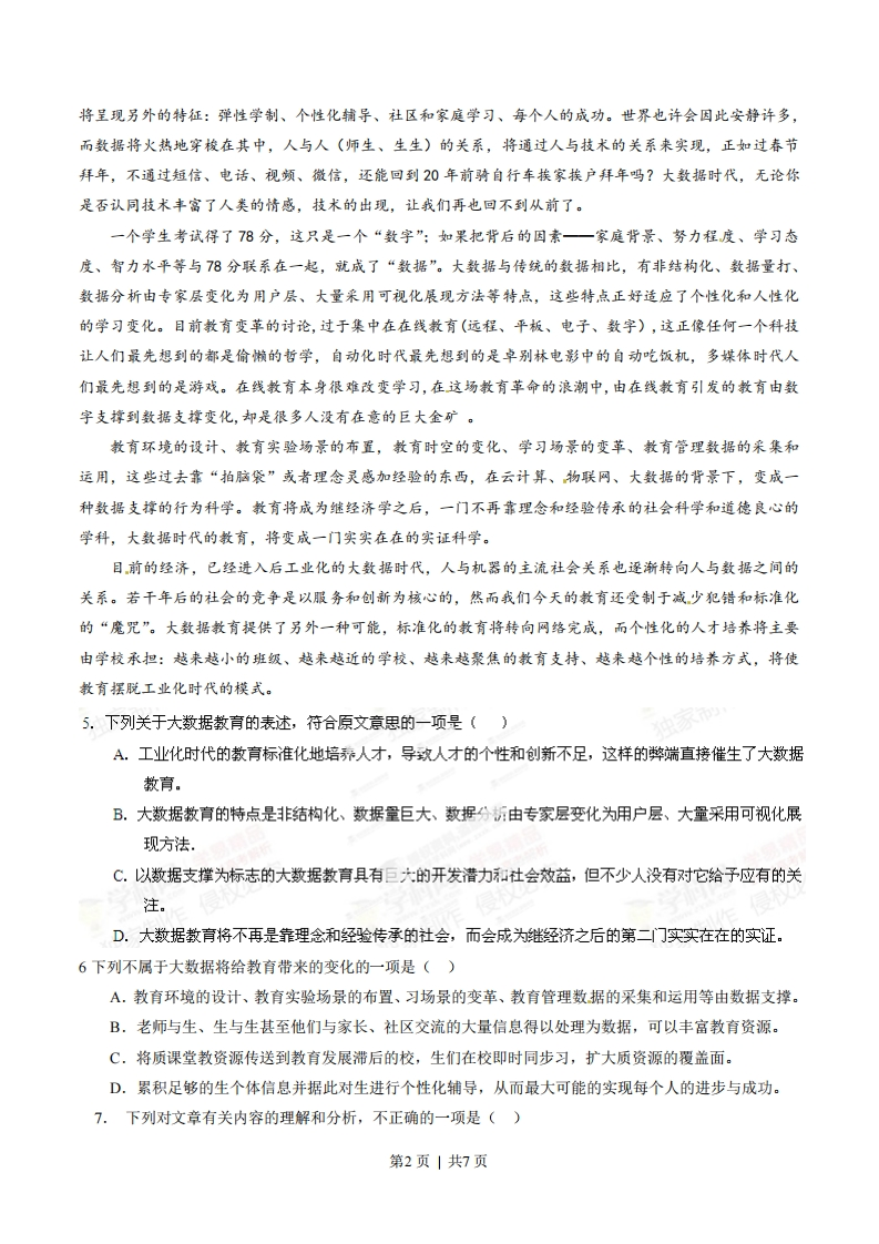 2014年普通高等学校招生全国统一考试(四川卷)语文第I卷(单项选择题共27分)一、(12分,每小题3分)1、下列词语中加点的字,读音全部都正确的一项是()A.眼睑(jin)哺育(bǜ扎辫子(za)亘古未有(gn)B.嫩绿(nen)铲除(chn)紧箍咒kǖ).一蹴而就(cd)C.抽噎(ye)迸裂(beng)户口簿(bd)不屈不挠lao)D.愤懑(men)要挟(xia)绊脚石(ban)恃才傲物(shi)2、下列词语中没有错别字的一项是()A.打蜡顷刻生死攸关口干舌噪B.飙升印证贻养天年扶摇直上C.巨壁清彻历久弥新所向披靡D.皱褶荧屏风生水起精简机构3.下列各句中,加点词语使用恰当的一项是A.李人偏爱用四川方言写作,这和他从小生活在成都分不开,他爱到茶馆听评书吗,评书一人生动幽默的话语,就成了他今后文章中的语言。B.生态走廊如果建立得当,能够在不影响人类居住区域的前提下将隔离的栖息地连接起来,从而将大大提升野生动物种群的稳定性。C.熊猫饮水,颇似酒徒贪杯,他总是喝的肚皮隆起,而后安之若素地拖着笨拙的身躯,一摇一摆地香远处的箭竹林走去。D.随着技的进步和社会的发展,弹棉花、补锅钉碗等许多曾与人们生活息息相关的老行业逐渐从我们的视线中消失。4.下列各句中,没有语病的一项是A.城镇建设要充分体现天人合一的理念,提高优秀传统文化特色,构建生态与文化保护体系,实现城镇与自然和谐发展。B.金沙遗址博物馆的“太阳神鸟”金箔,是古蜀国黄金工艺辉煌成就的典型代表,以其精致和神秘展示了古蜀人的智慧和魅力。C.全国规模最大的两栖爬行动物标本馆,已经以藏了10万号标本,这些标本几乎覆盖了所有中国的两栖爬行动物种类。D.音乐剧是19世纪末诞生的,它具有极富时1代感的艺术形式和强烈的娱乐性,使它成为很多国家的观众都喜欢的表演艺术。二、(9分,每小题3分)阅读下面的文字,完成57题。工业化时代,学校教育映射了工业化集中物流的经济批量模式:铃声、班级、标准化的课堂、统一的教材、按照时间编排的流水线场景,这种教育为工业时代标准化地“制造”了可用的人才。而大数据教育第1页|共7页将呈现另外的特征:弹性学制、个性化辅导、社区和家庭学习、每个人的成功。世界也许会因此安静许多,而数据将火热地穿梭在其中,人与人(师生、生生)的关系,将通过人与技术的关系来实现,正如过春节拜年,不通过短信、电话、视频、微信,还能回到20年前骑自行车挨家挨户拜年吗?大数据时代,无论你是否认同技术丰富了人类的情感,技术的出现,让我们再也回不到从前了。一个学生考试得了78分,这只是一个“数字”:如果把背后的因素一家庭背景、努力程度、学习态度、智力水平等与78分联系在一起,就成了“数据”。大数据与传统的数据相比,有非结构化、数据量打、数据分析由专家层变化为用户层、大量采用可视化展现方法等特点,这些特点正好适应了个性化和人性化的学习变化。目前教育变革的讨论,过于集中在在线教育(远程、平板、电子、数字),这正像任何一个科技让人们最先想到的都是偷懒的哲学,自动化时代最先想到的是卓别林电影中的自动吃饭机,多蝶体时代人们最先想到的是游戏。在线教育本身很难改变学习,在这场教育革命的浪潮中,由在线教育引发的教育由数字支撑到数据支撑变化,却是很多人没有在意的巨大金矿。教育环境的设计、教育实验场景的布置,教育时空的变化、学习场景的变革、教育管理数据的采集和运用,这些过去靠“拍脑袋”或者理念灵感加经验的东西,在云计算、物联网、大数据的背景下,变成一种数据支撑的行为科学。教育将成为继经济学之后,一门不再靠理念和经验传承的社会科学和道德良心的学科,大数据时代的教育,将变成一门实实在在的实证科学。目前的经济,已经进入后工业化的大数据时代,人与机器的主流社会关系也逐渐转向人与数据之间的关系。若干年后的社会的竞争是以服务和创新为核心的,然而我们今天的教育还受制于减少犯错和标准化的“魔咒”。大数据教育提供了另外一种可能,标准化的教育将转向网络完成,而个性化的人才培养将主要由学校承担:越来越小的班级、越来越近的学校、越来越聚焦的教育支持、越来越个性的培养方式,将使教育摆脱工业化时代的模式。5.下列关于大数据教育的表述,符合原文意思的一项是()A.工业化时代的教育标准化地培赤人才,导玖人才的个性和创新不足,这样的弊端直接催生了大数据教育。B.大数据教育的特点是非结构化、数据量巨大、数据分析由专家层变化为用户层、大量采用可视化展现方法C,以数据支撑为标志的大数据教育具有巨六的开发潜力和社会放益,但不少人没有对它给予应有的关注。D.大数据教育将不再是靠理念和经验传承的社会,而会成为继经济之后的第二门实实在在的实证。6下列不属于大数据将给教育带来的变化的一项是()A.教育环境的设计、教育实验场景的布置、习场景的变革、教育管理数据的采集和运用等由数据支撑。B.老师与生、生与生甚至他们与家长、社区交流的大量信息得以处理为数据,可以丰富教育资源。C.将质课堂教资源传送到教育发展滞后的校,生们在校即时同步习,扩大质资源的覆盖面。D.累积足够的生个体信息并据此对生进行个性化辅导,从而最大可能的实现每个人的进步与成功。7.下列对文章有关内容的理解和分析,不正确的一项是()第2页|共7页A.“大数